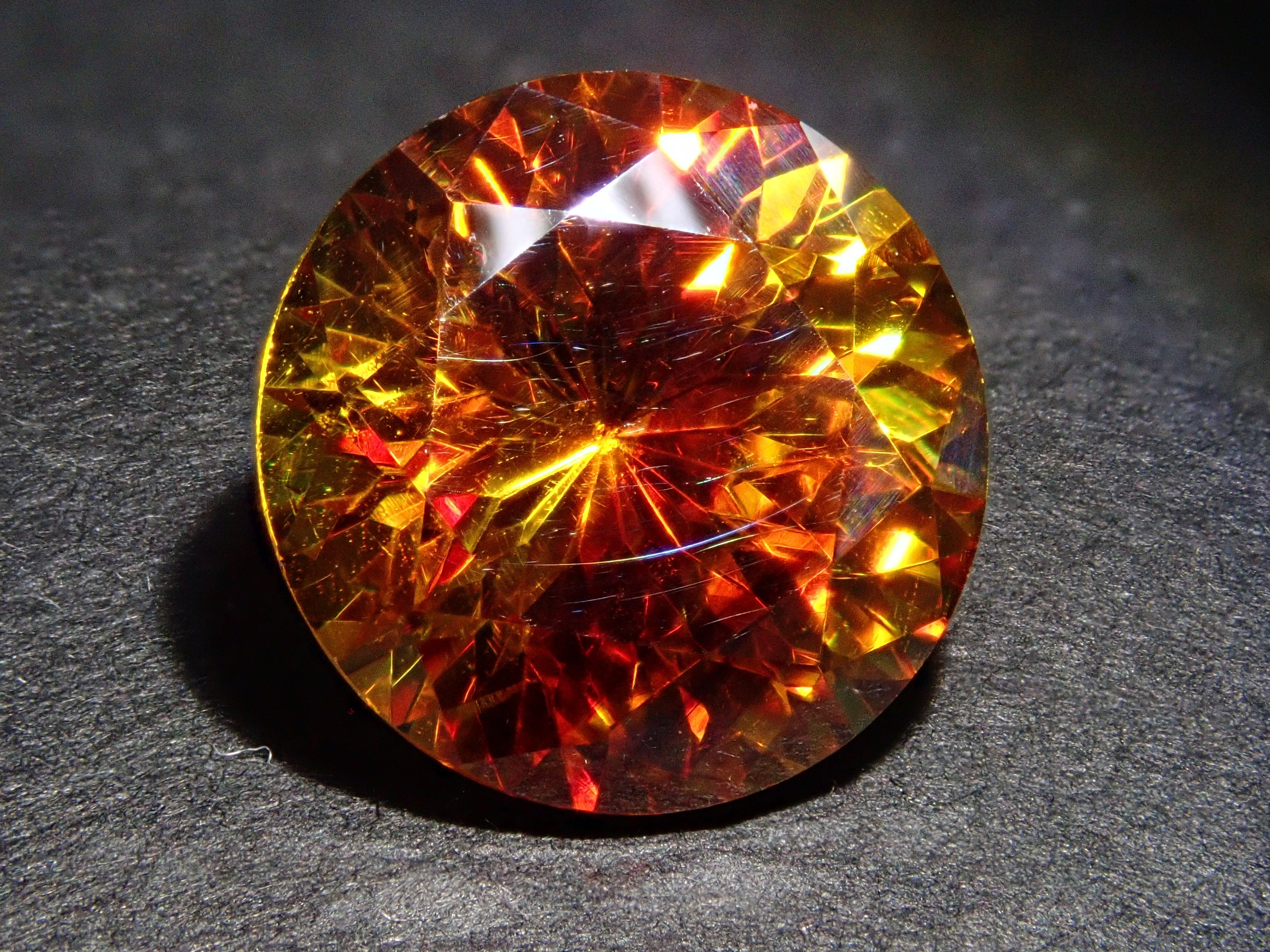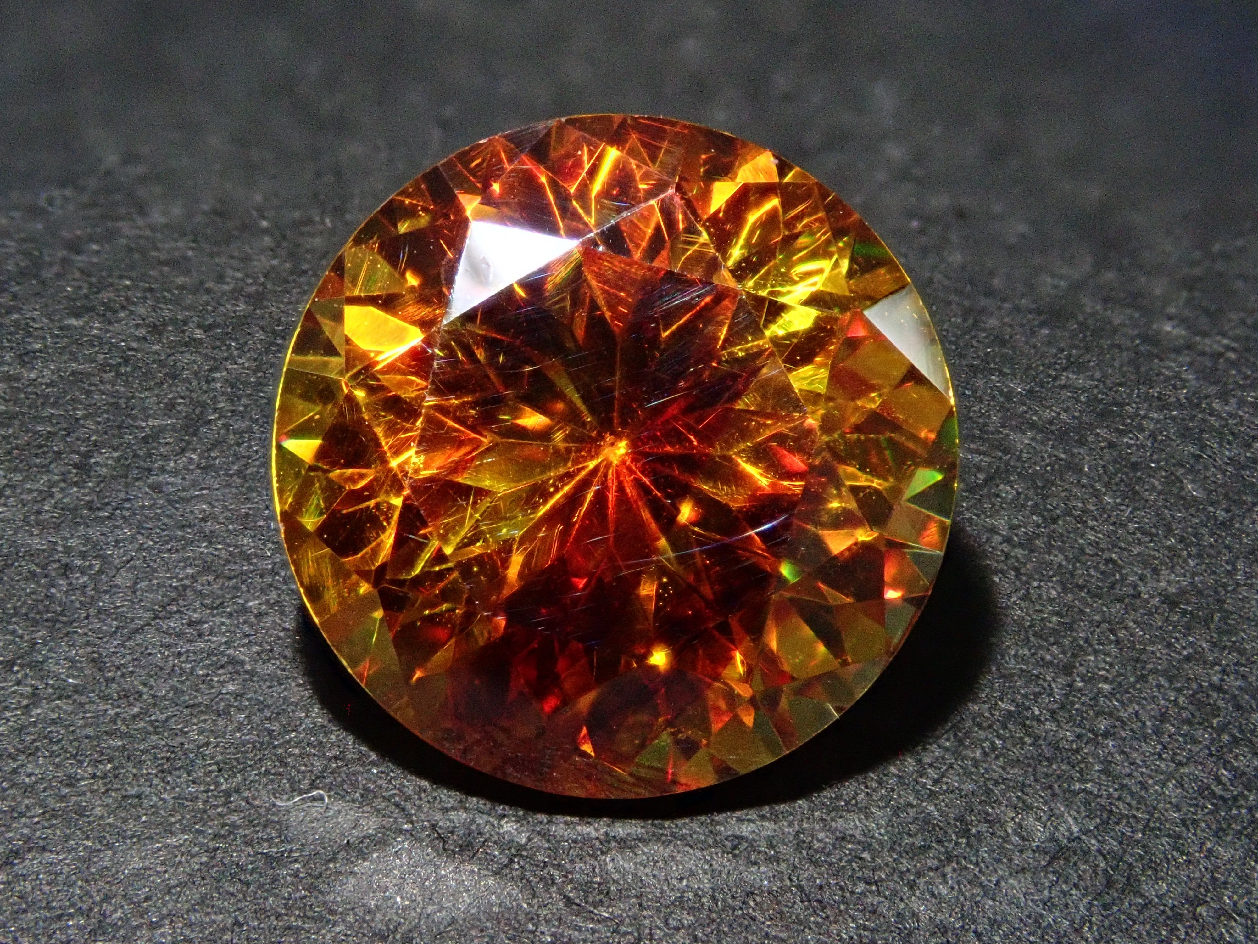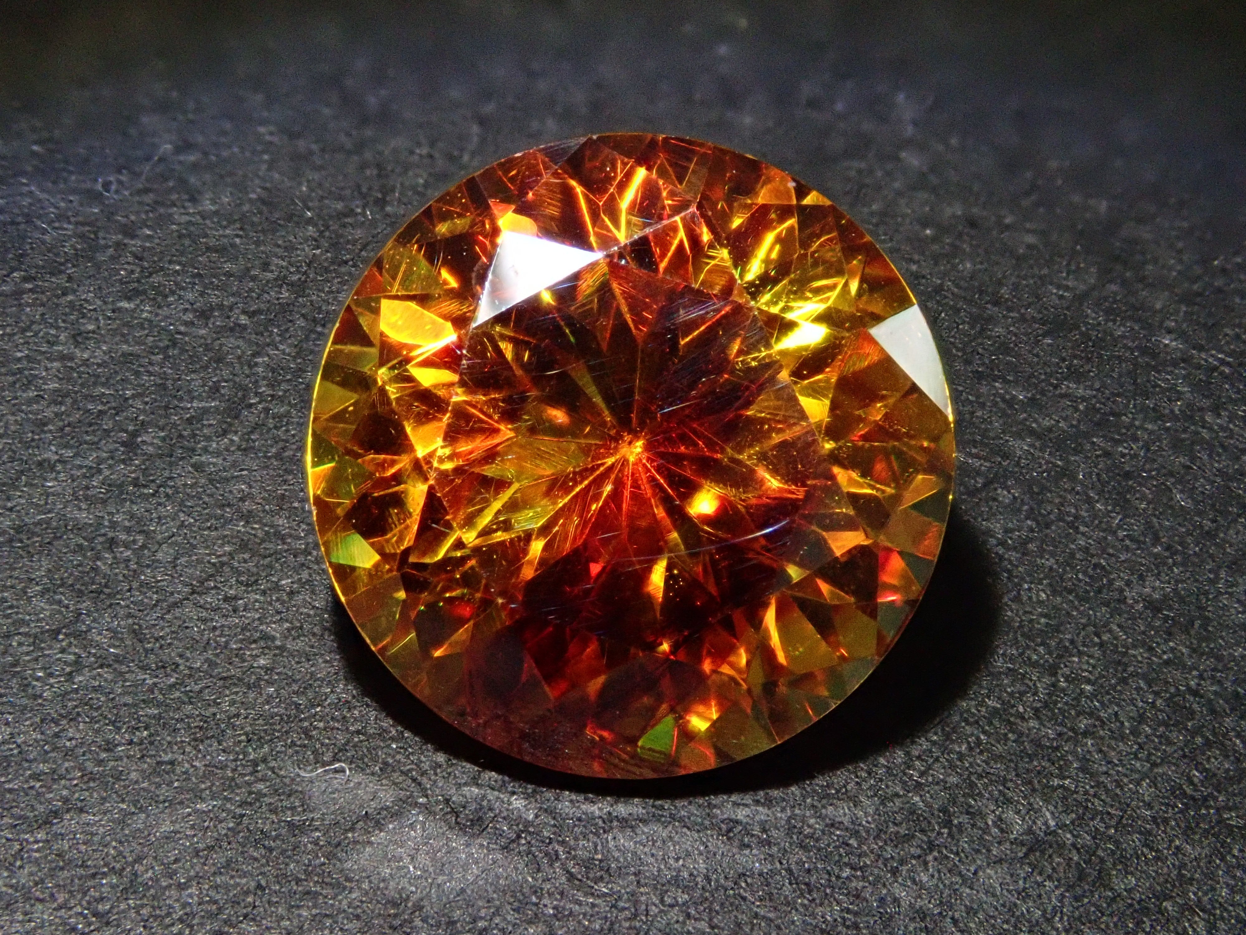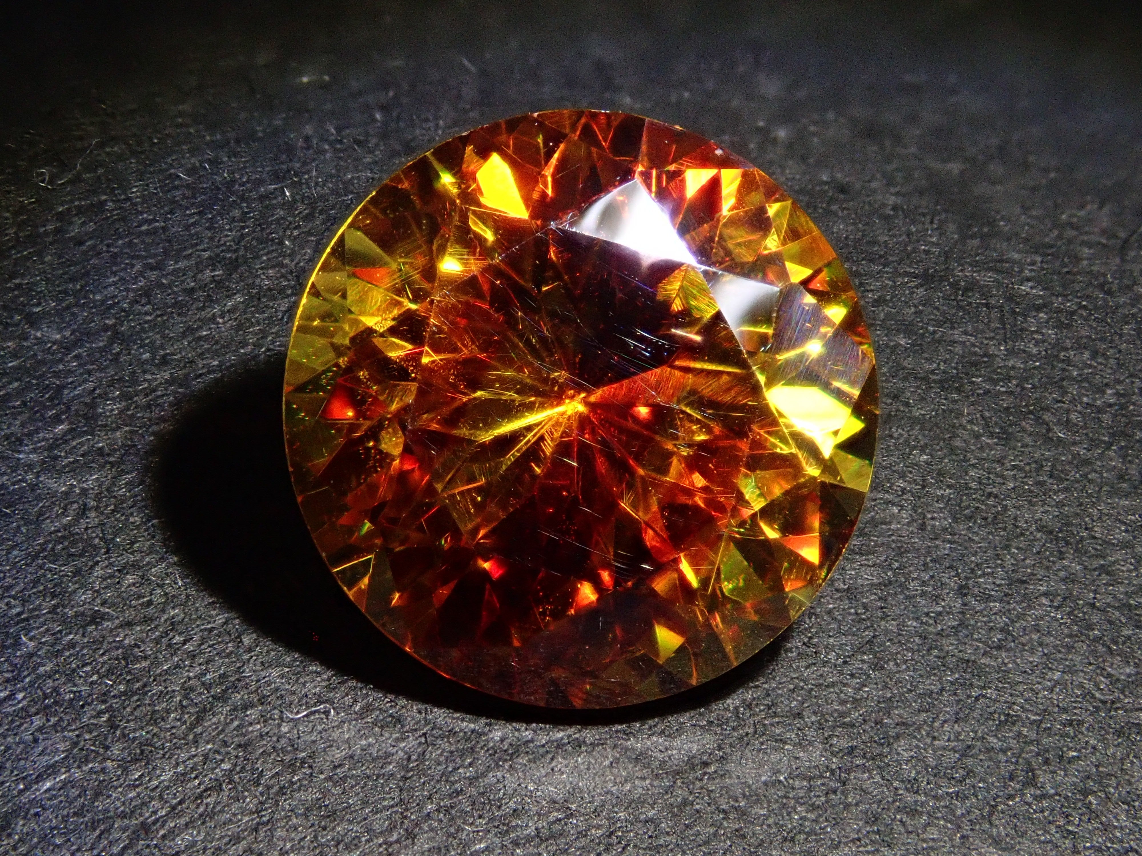 閃鋅礦的色散率接近鑽石的四倍,並呈現出絢麗的火彩。據說是流通量很小、市場上數量不多的稀有寶石之一。底色有黃、橙、綠等,在火中可以欣賞到黃、棕、橙、紅、綠等各種顏色。這是雙色閃鋅礦。圓形切割 9.8 毫米。