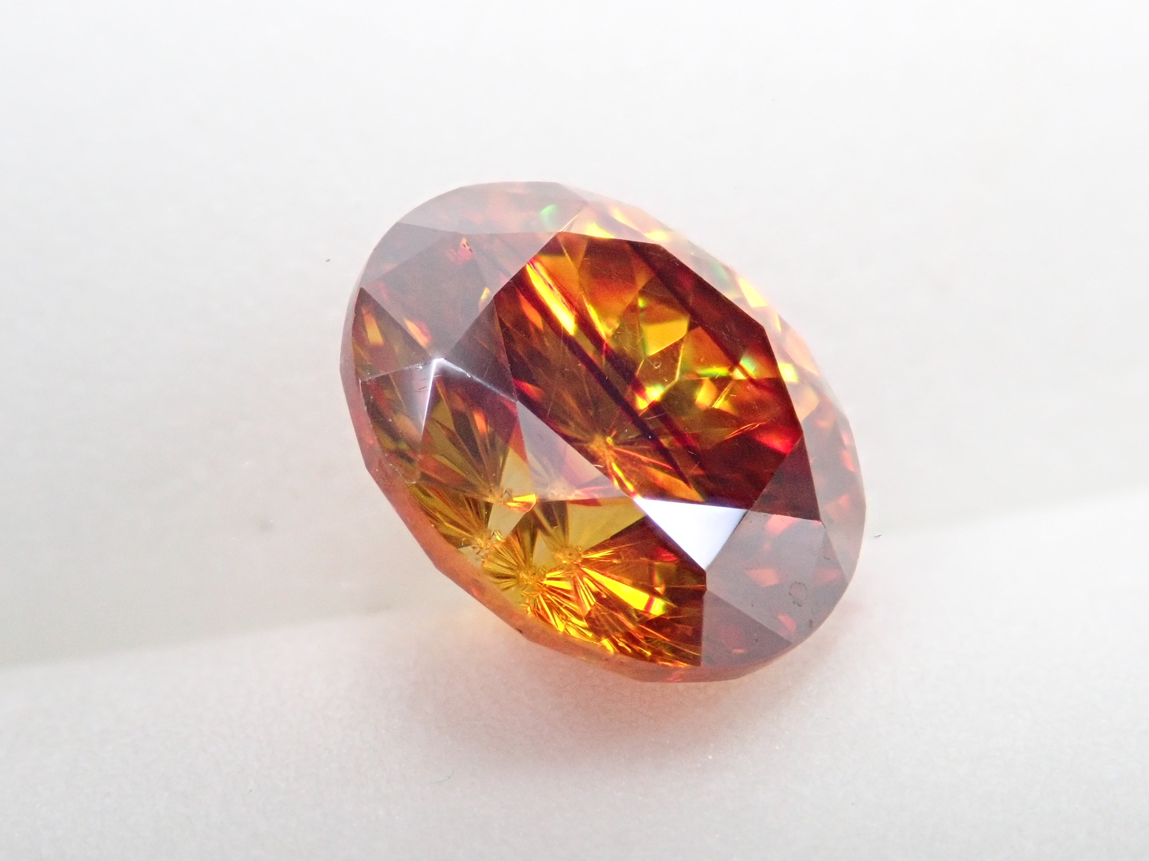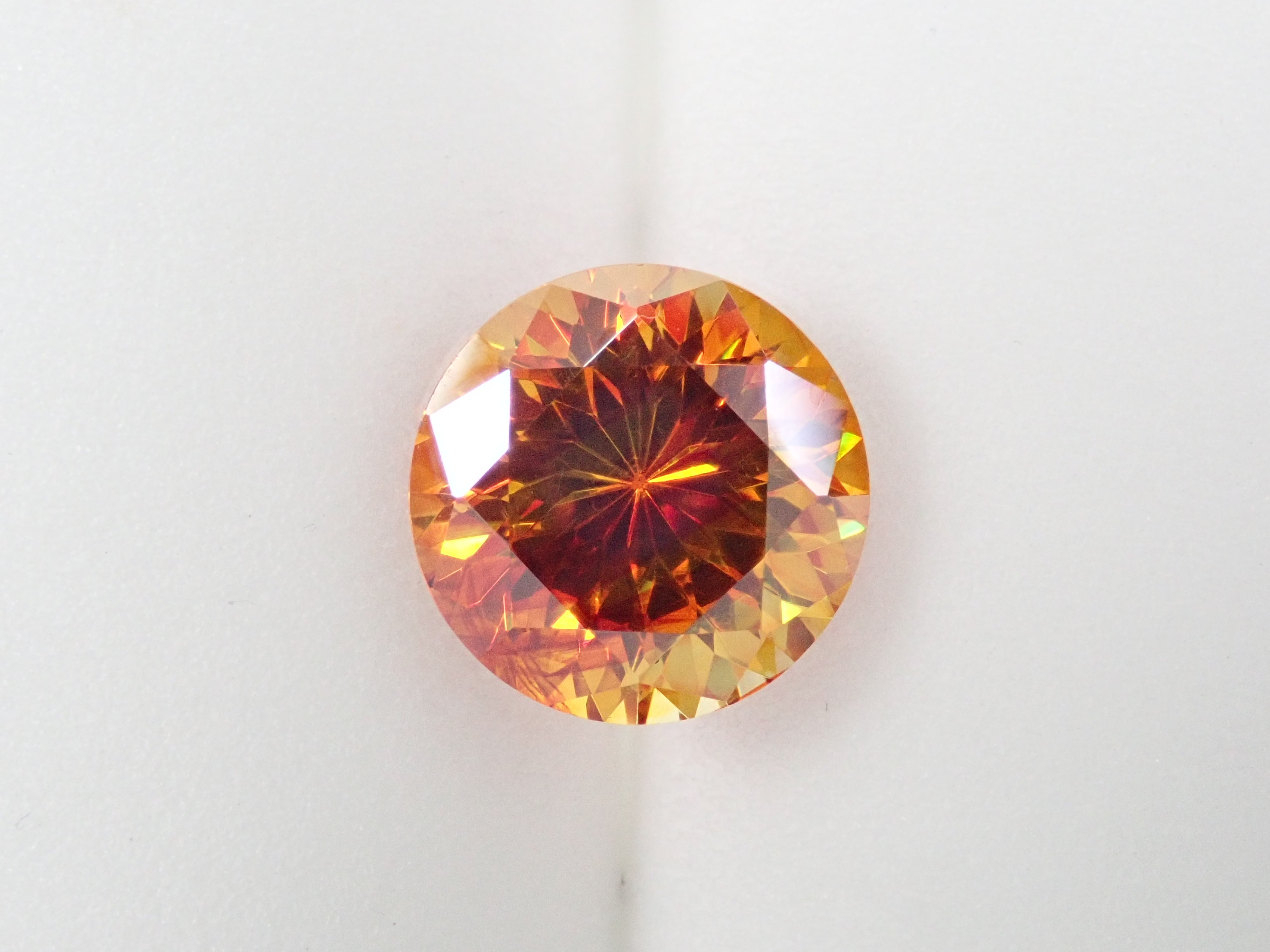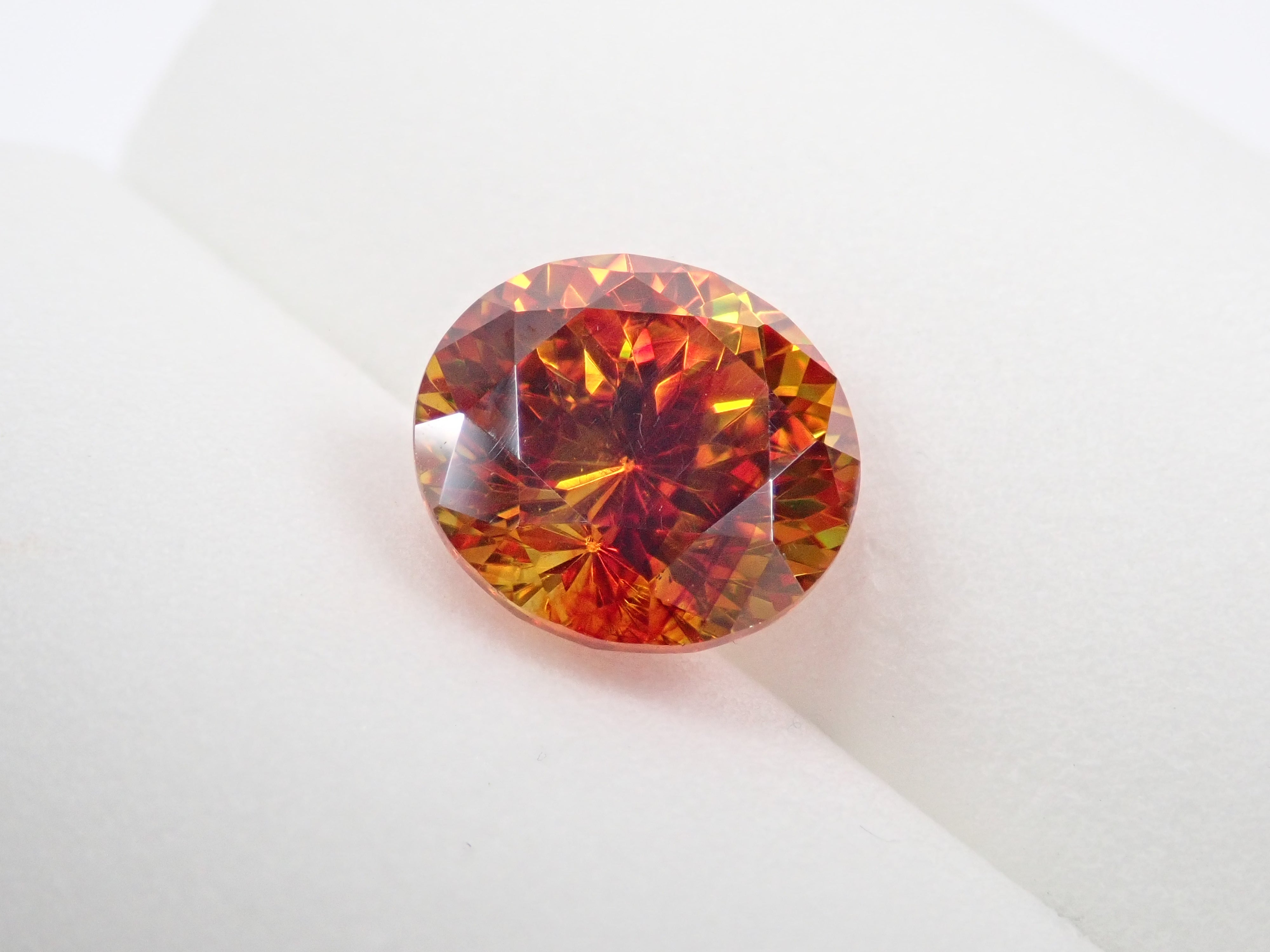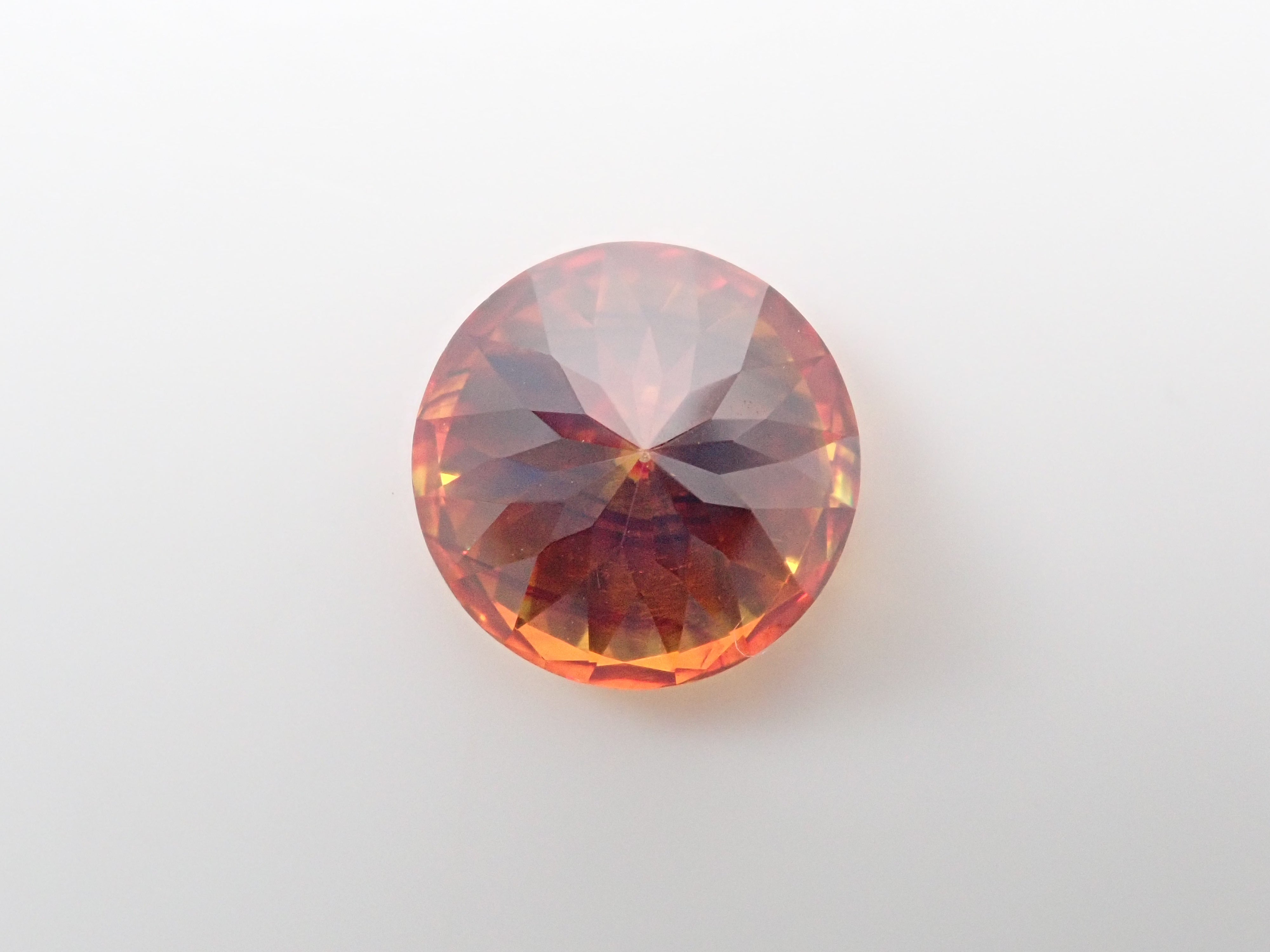 閃鋅礦的色散率接近鑽石的四倍,並呈現出絢麗的火彩。據說是流通量很小、市場上數量不多的稀有寶石之一。底色有黃、橙、綠等,在火中可以欣賞到黃、棕、橙、紅、綠等各種顏色。這是雙色閃鋅礦。圓形切割 9.8 毫米。