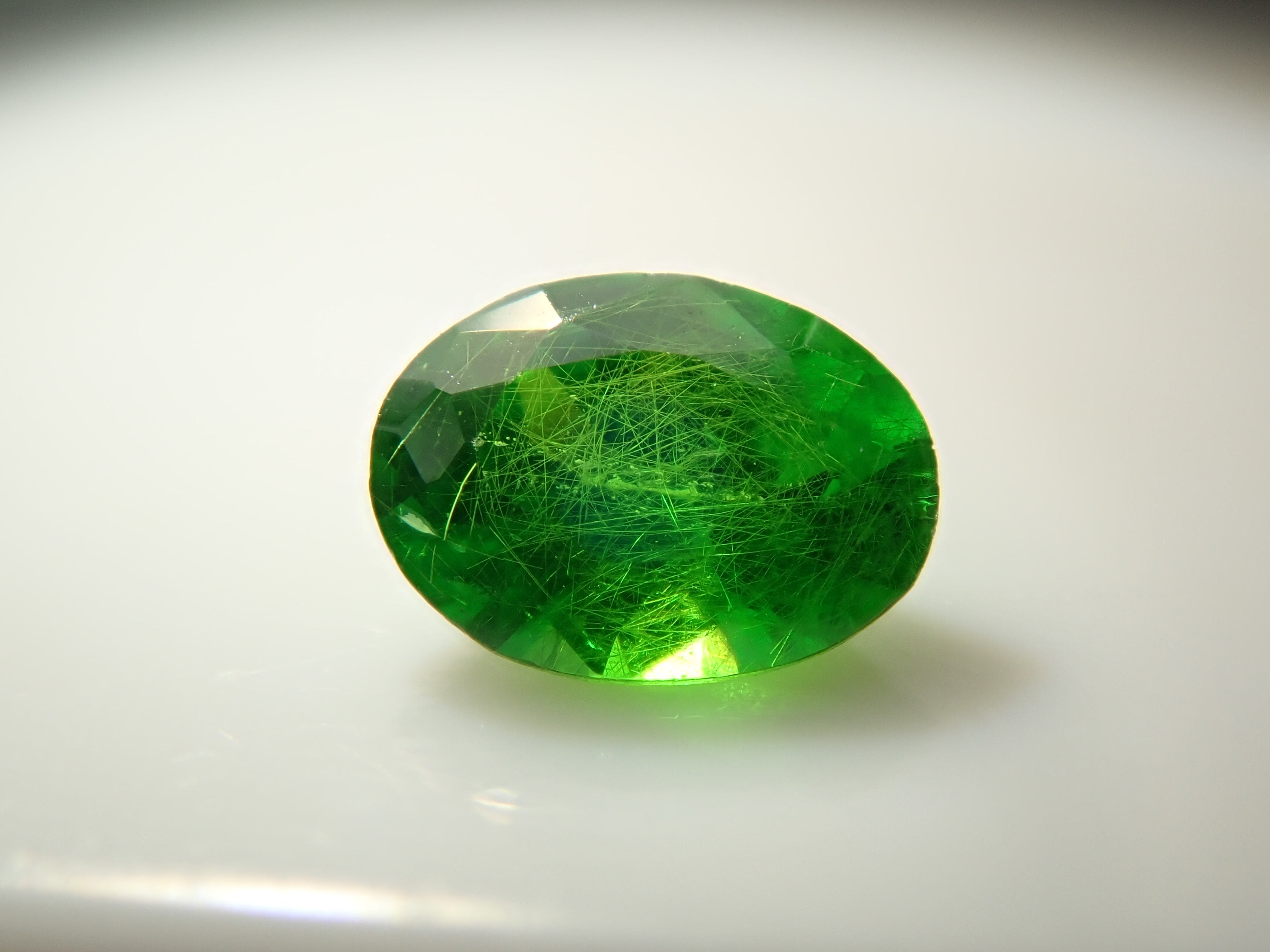 石榴石具有強烈的光色散和強烈的閃光。其中,這顆綠色的「濃綠榴石」是一種特別美麗且稀有的石榴石。這種類型稱為“馬尾”,內含物看起來像馬尾。馬尾的存在或不存在已透過顯微鏡檢查來確認。這是來自俄羅斯的稀有產品。