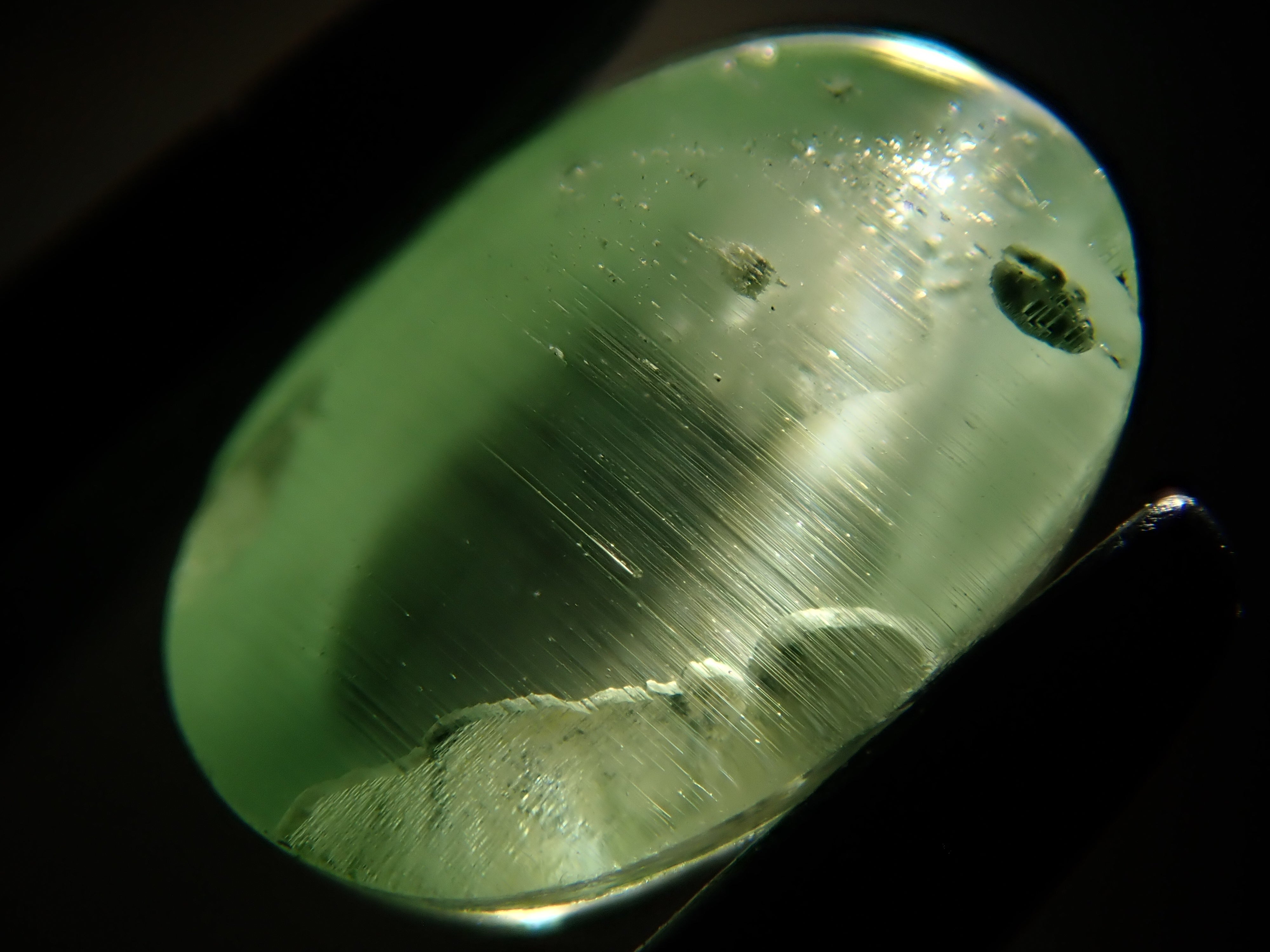 山茱萸因其多色性而引人注目,這使得從不同角度觀看時呈現出不同的顏色。它是稀有寶石之一。有些會神奇地改變顏色,從藍色變成紫色,變成綠色,再變成透明。這種類型具有罕見的貓眼效應。筆燈用於攝影。石頭的背面基本上是未拋光的。