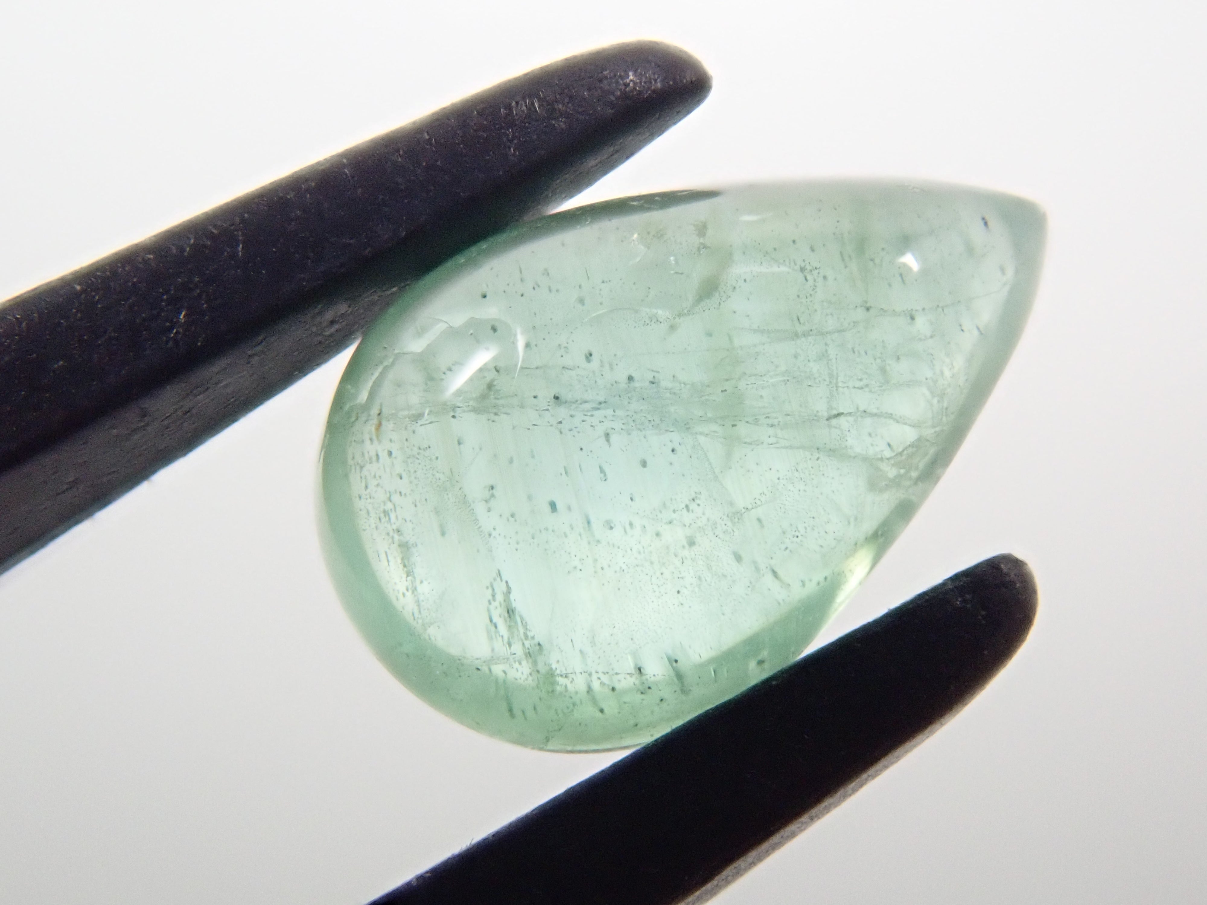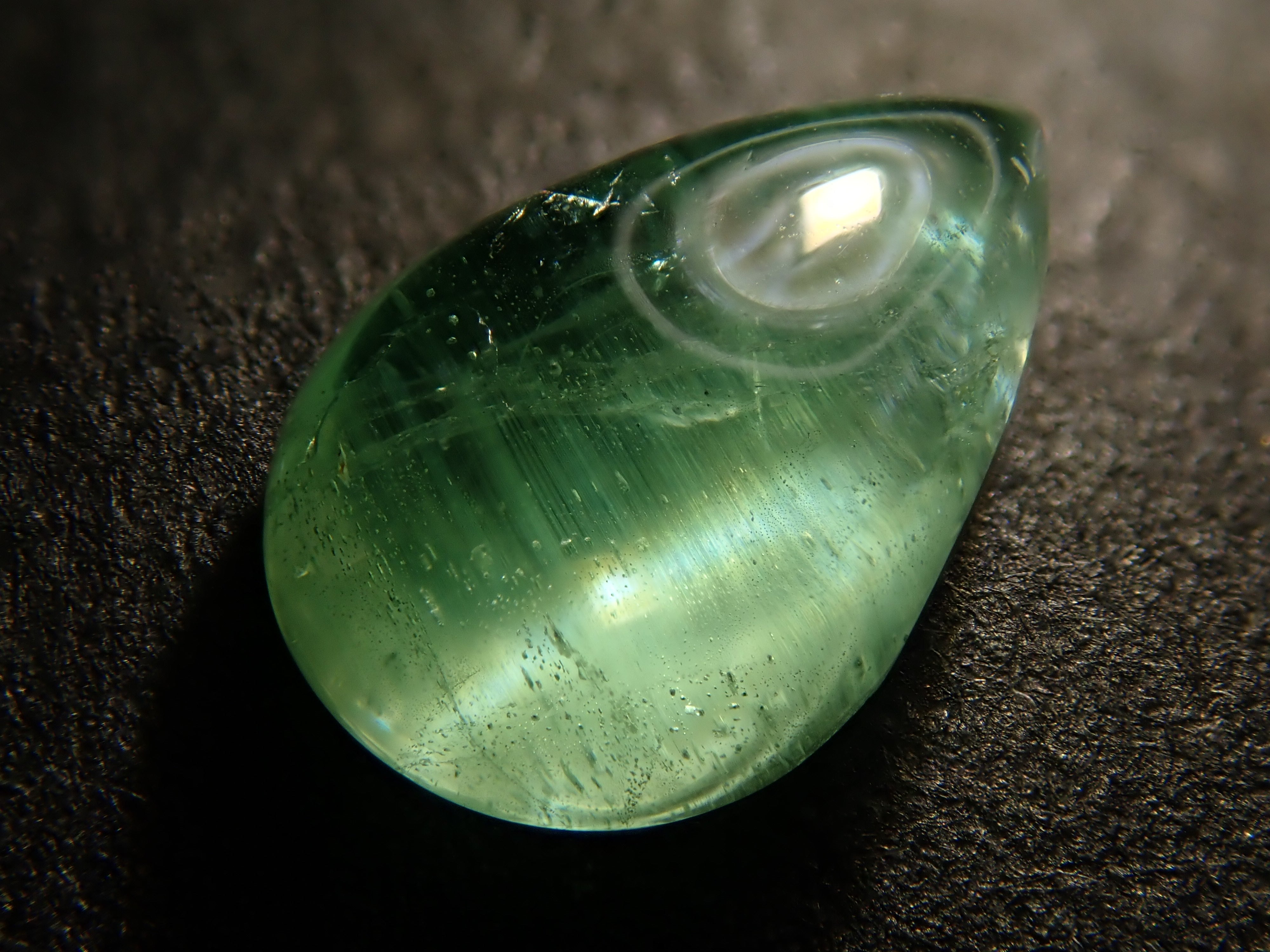 山茱萸因其多色性而引人注目,這使得從不同角度觀看時呈現出不同的顏色。它是稀有寶石之一。有些會神奇地改變顏色,從藍色變成紫色,變成綠色,再變成透明。這種類型具有罕見的貓眼效應。筆燈用於攝影。石頭的背面基本上是未拋光的。