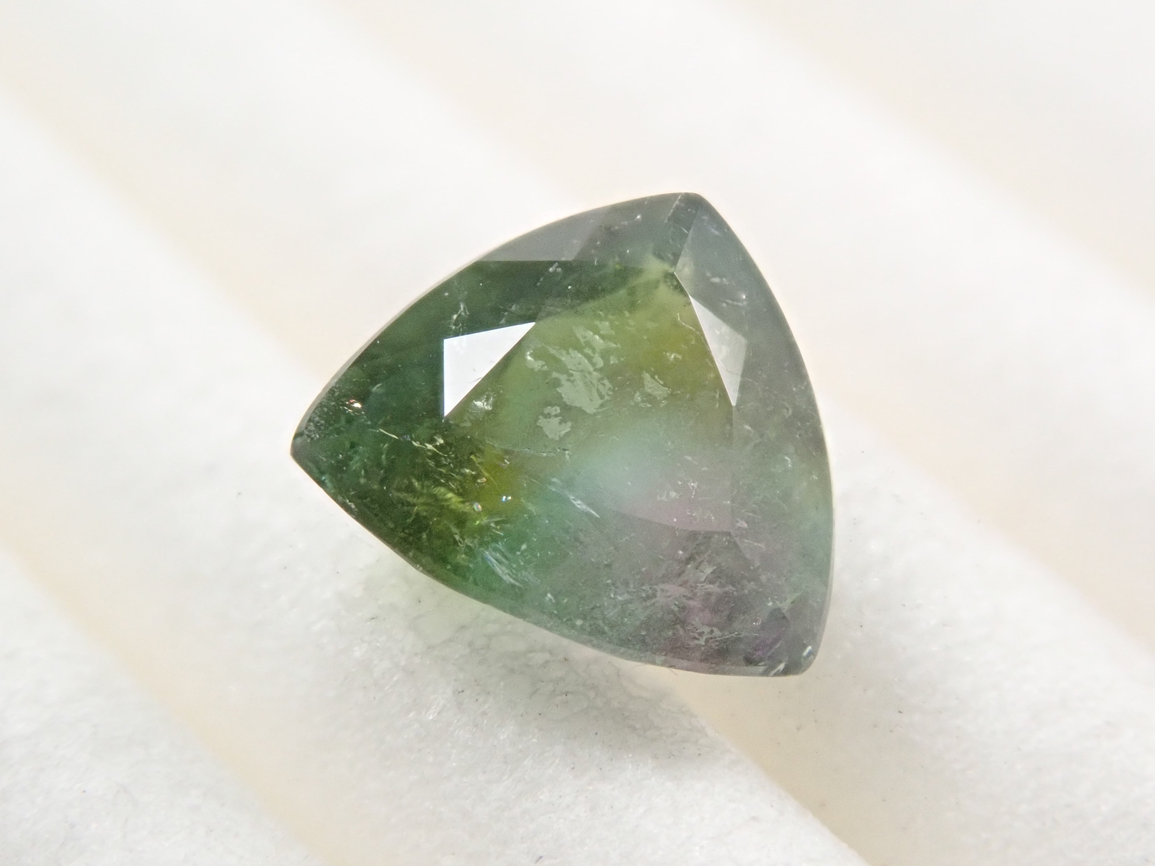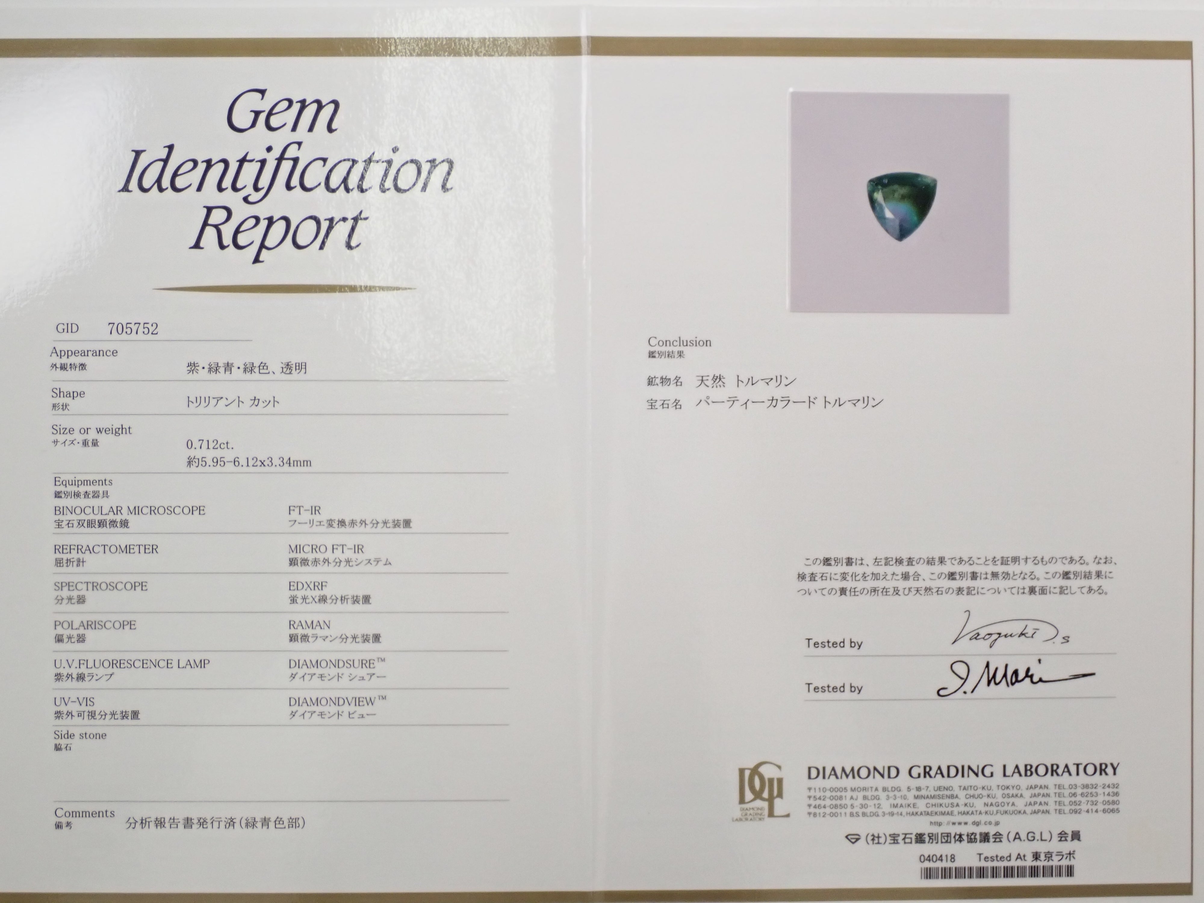帕拉伊巴碧璽有著不同於大海的藍色或天空的藍色的精緻色彩。它在日本的定義是“含有銅的藍色到綠色碧璽(無論產地)。”如果在這些條件下有不只一種顏色,則稱為雙色或雜色。這是一顆帕拉伊巴碧璽,可讓您享受三色色調。隨附 DGL 真品證書。