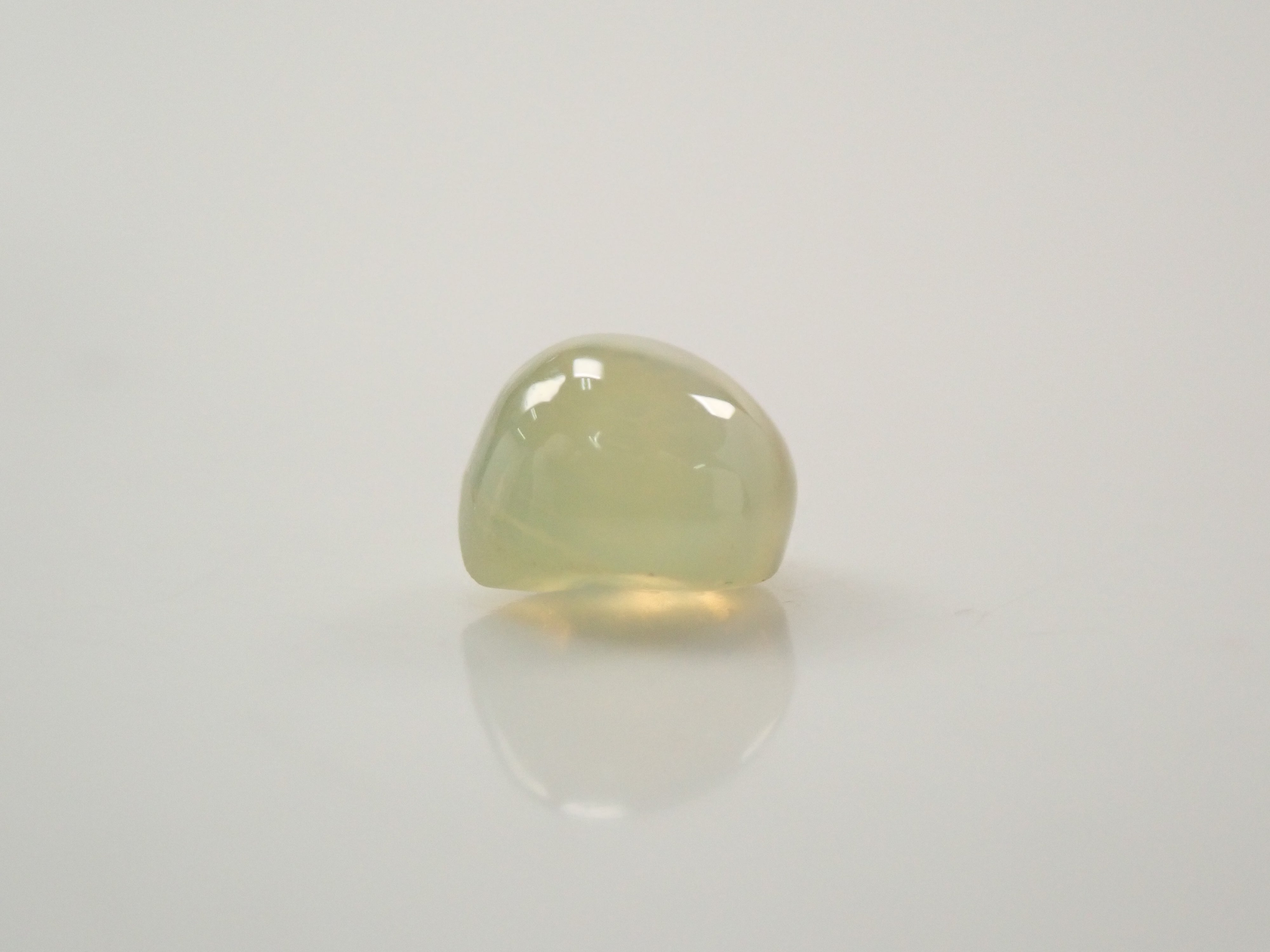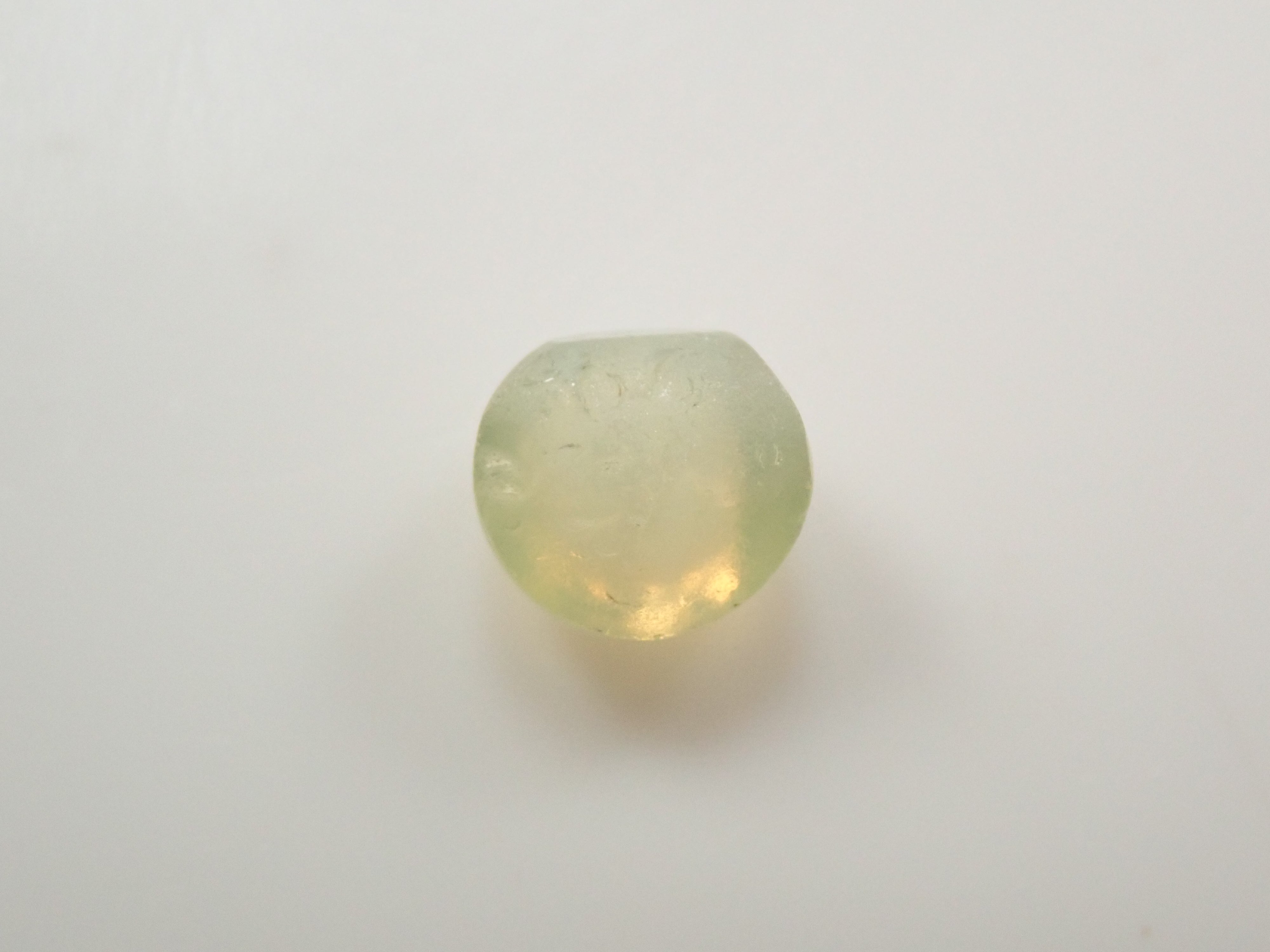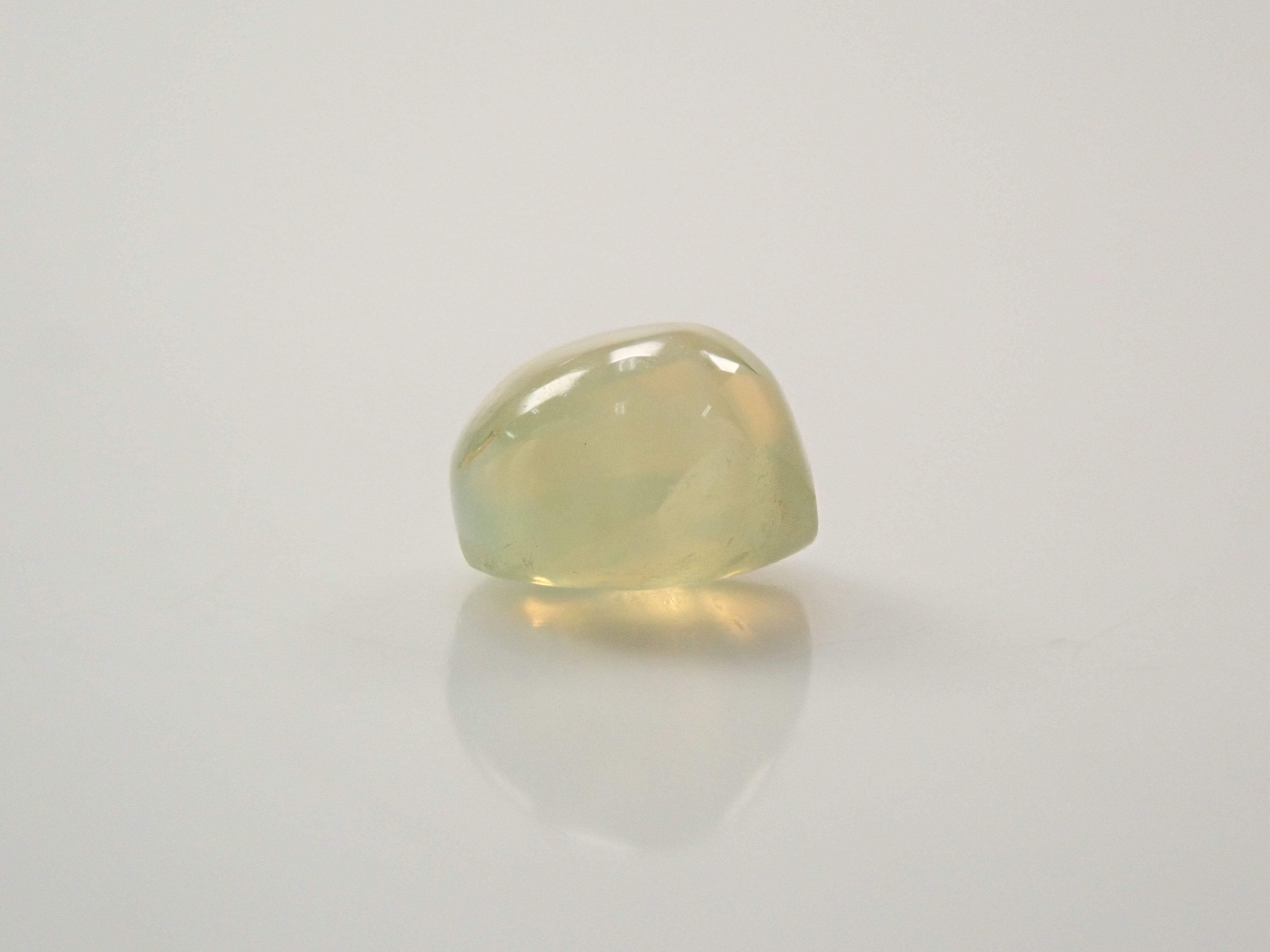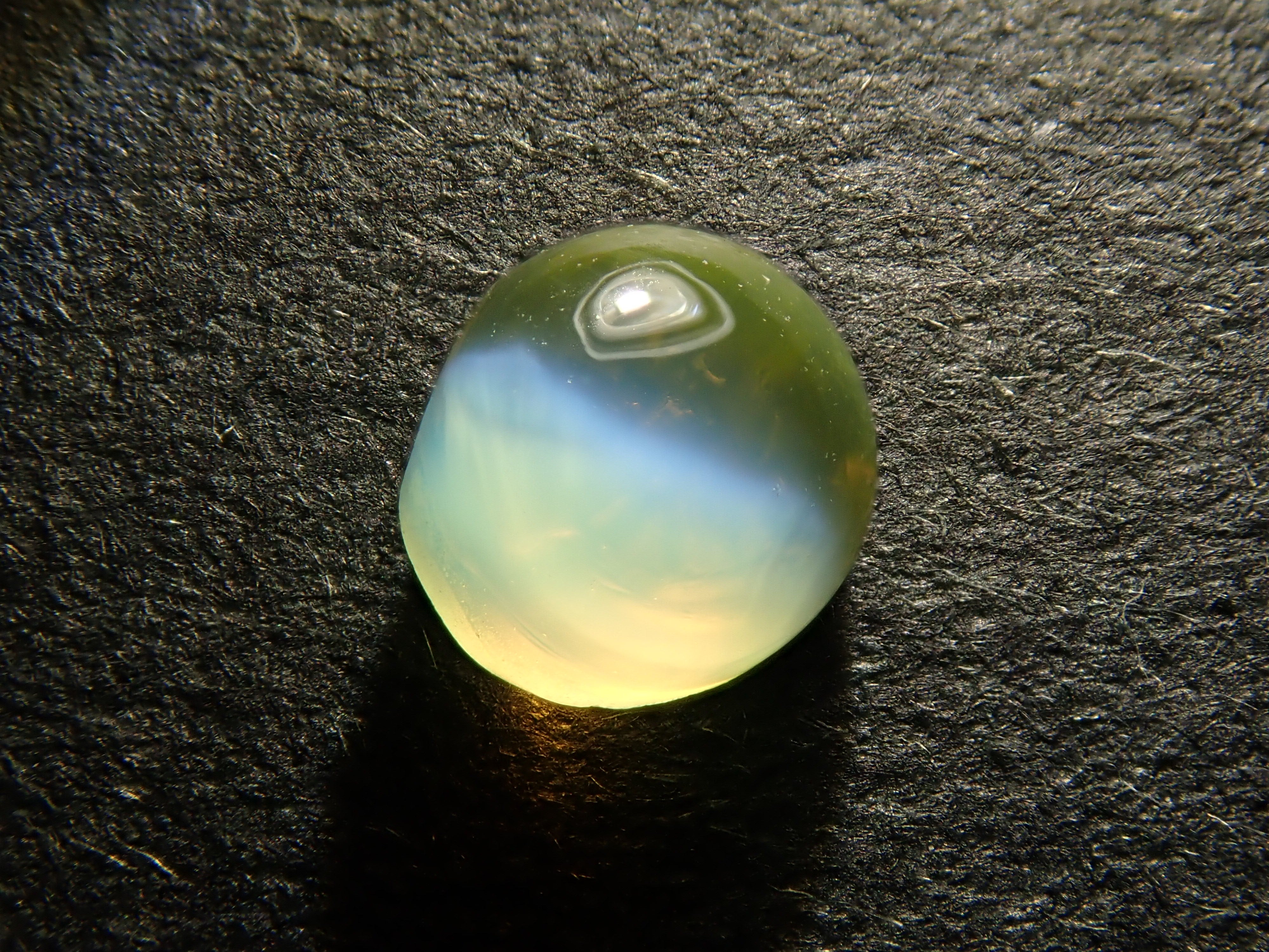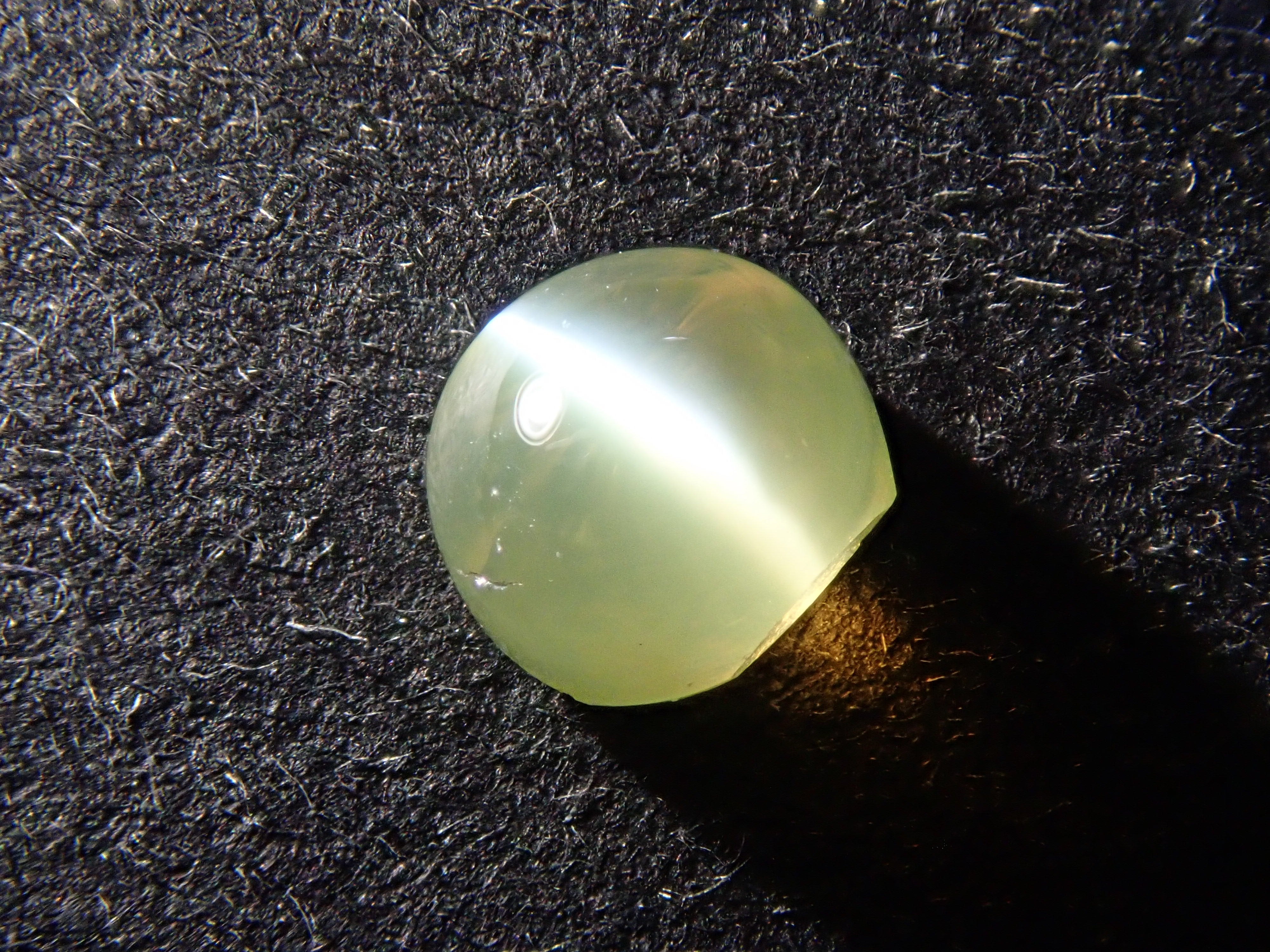金綠玉的顏色多種多樣,從淺黃色到綠色再到深棕色。它是一種堅硬耐用的寶石。這顆寶石呈現貓眼效果,照片是用筆型手電筒拍攝的。寶石背面通常未經拋光。