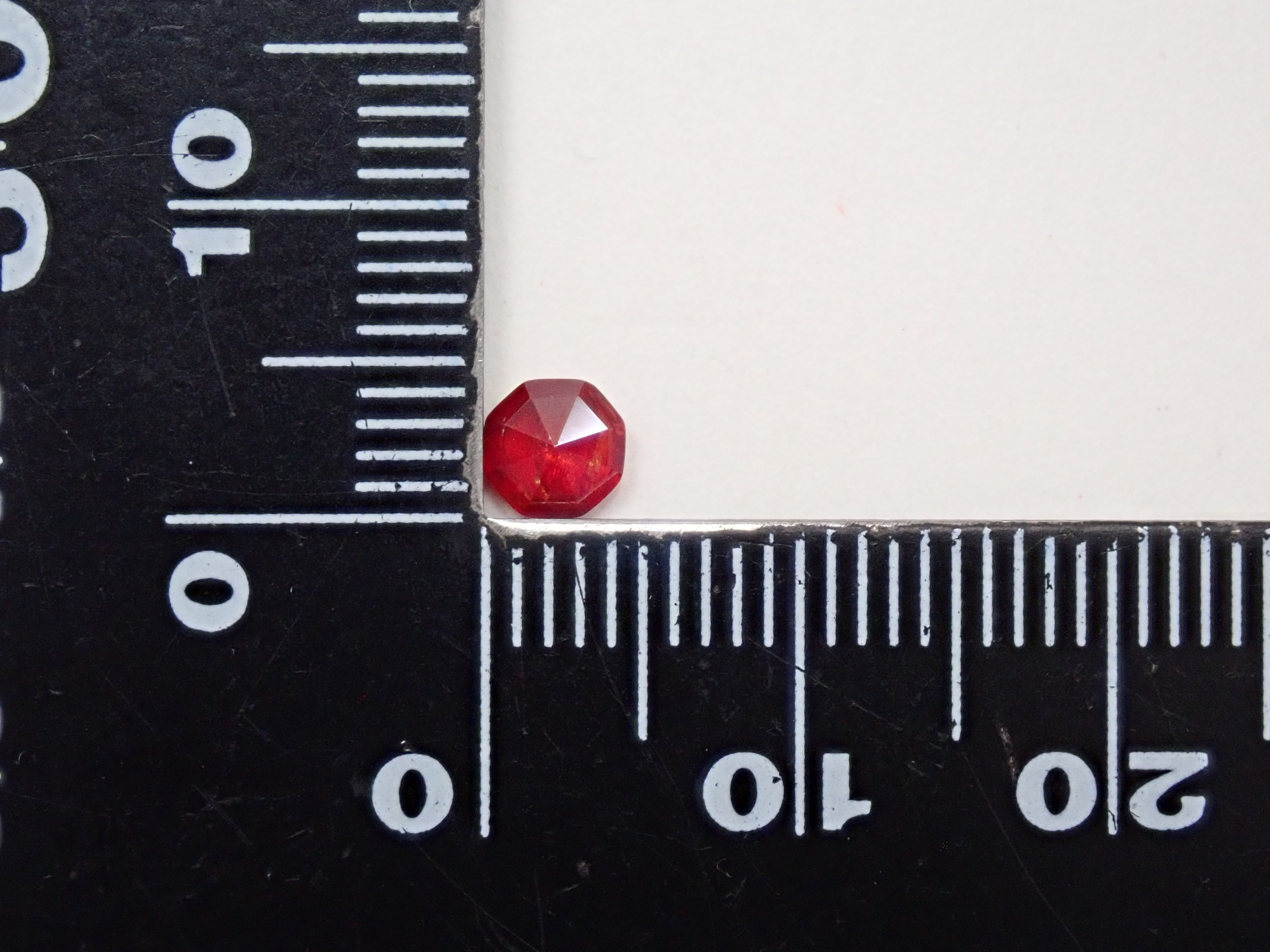 顧名思義,它是一種含有稀有元素鉭的礦物。這是錳鉭鐵礦,含有錳。據說這種錳就是美麗的紅色的原因。這是一顆 0.736 克拉的鬆散錳鉭鐵礦,透明度高。附有日德寶石研究所頒發的鑑定證書。