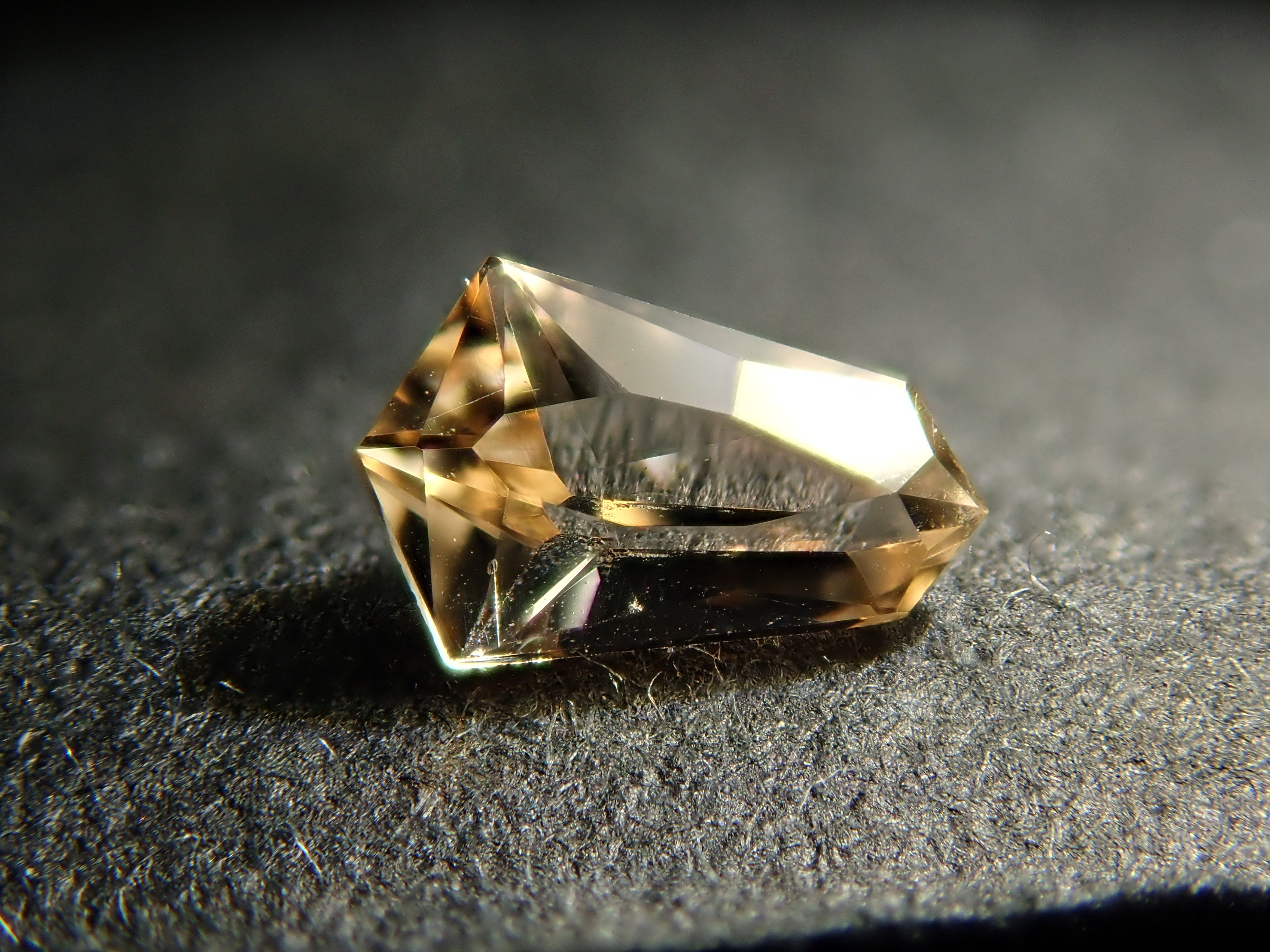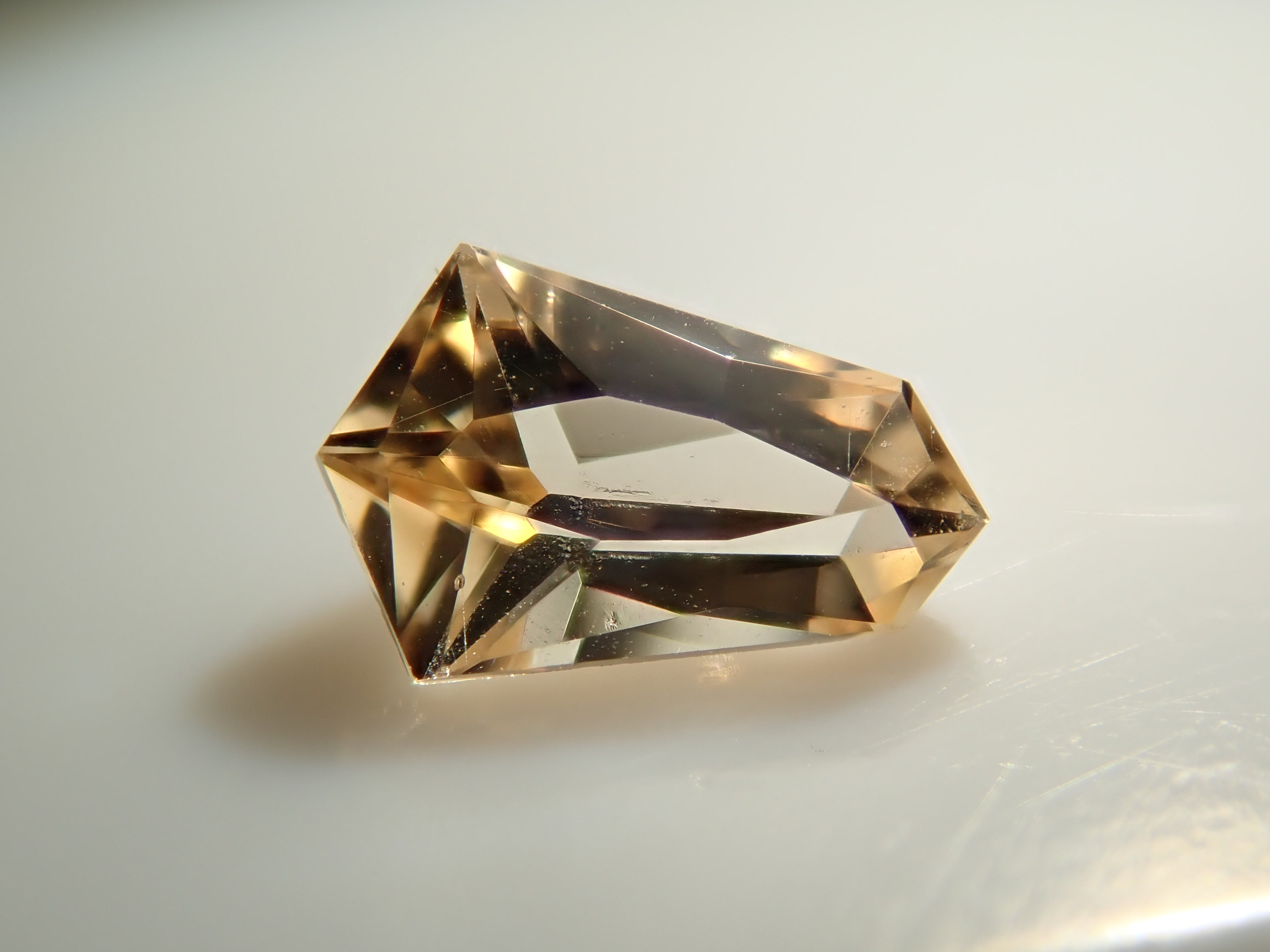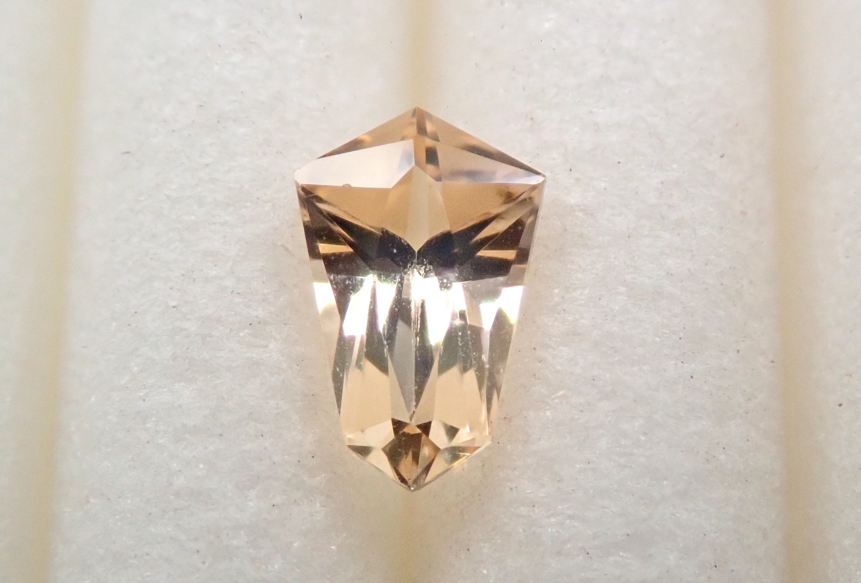 帝王托帕石被高度評價為最高品質的托帕石。黃玉分為兩種:含有氟的「F型」和含有羥基的「OH型」黃玉是OH型黃玉。顏色有金黃色、橘色、粉紅色、紅色等多種。享受無愧於帝國之名的優雅光芒。來自巴西的客製化切割、高度透明的帝王拓帕石。