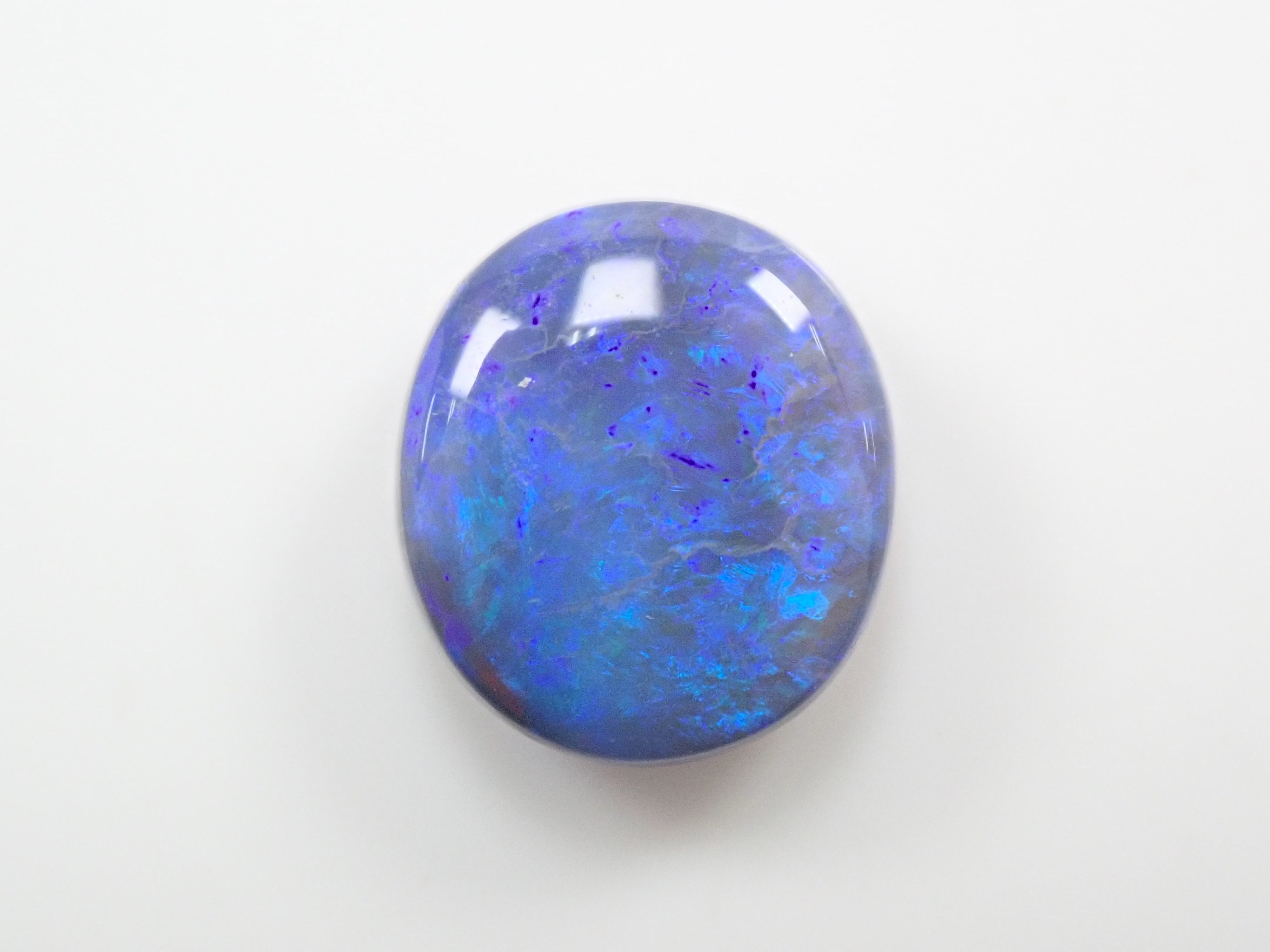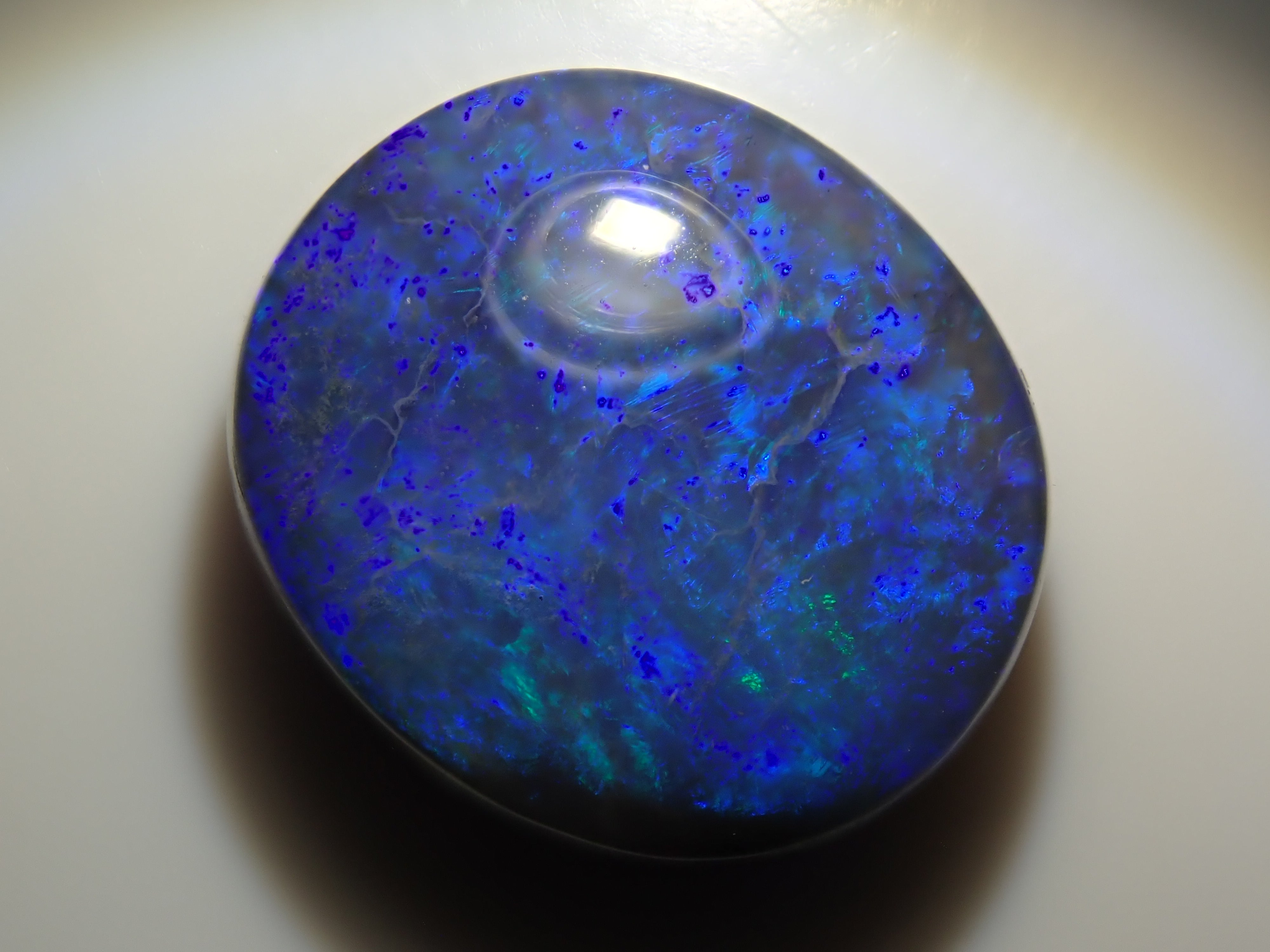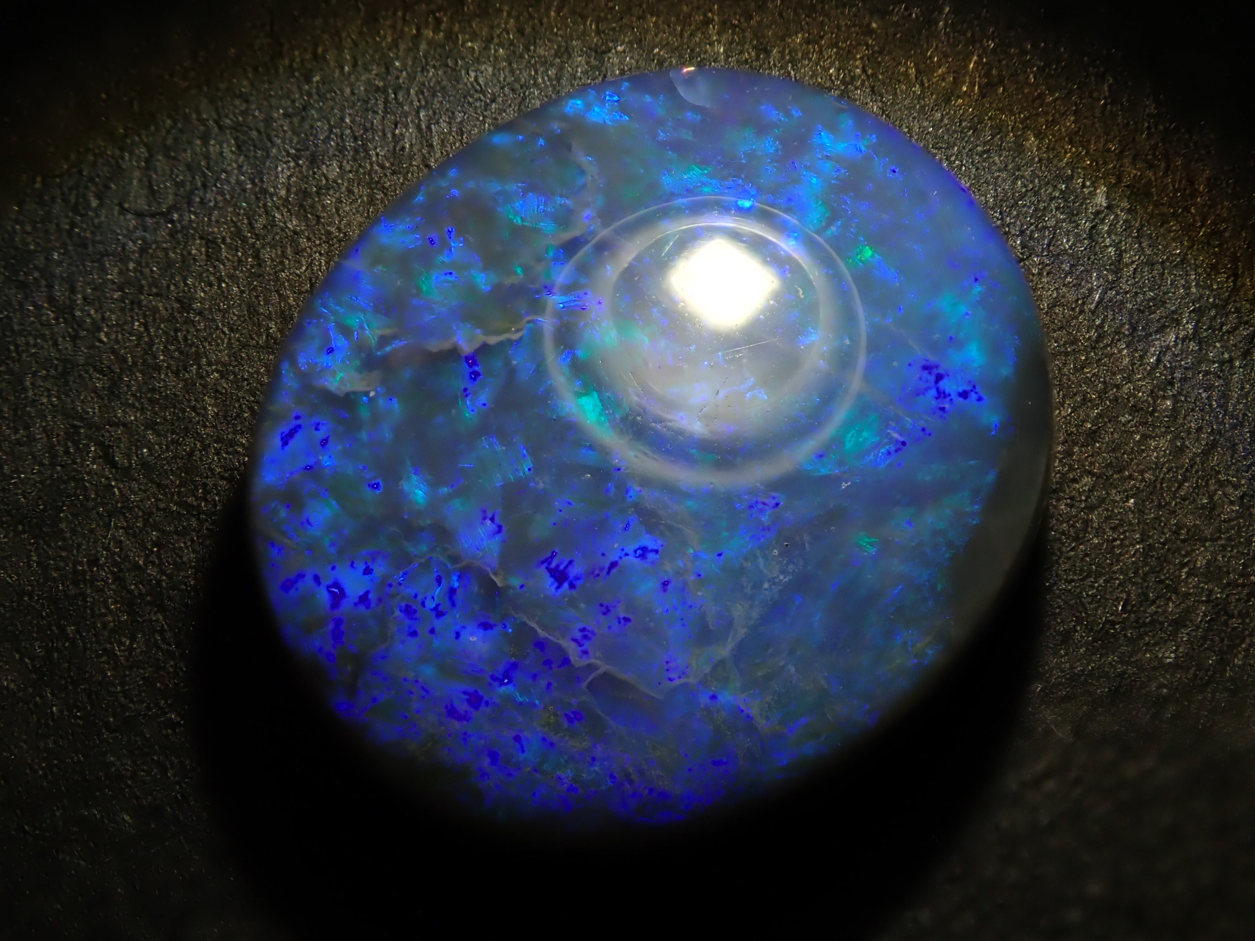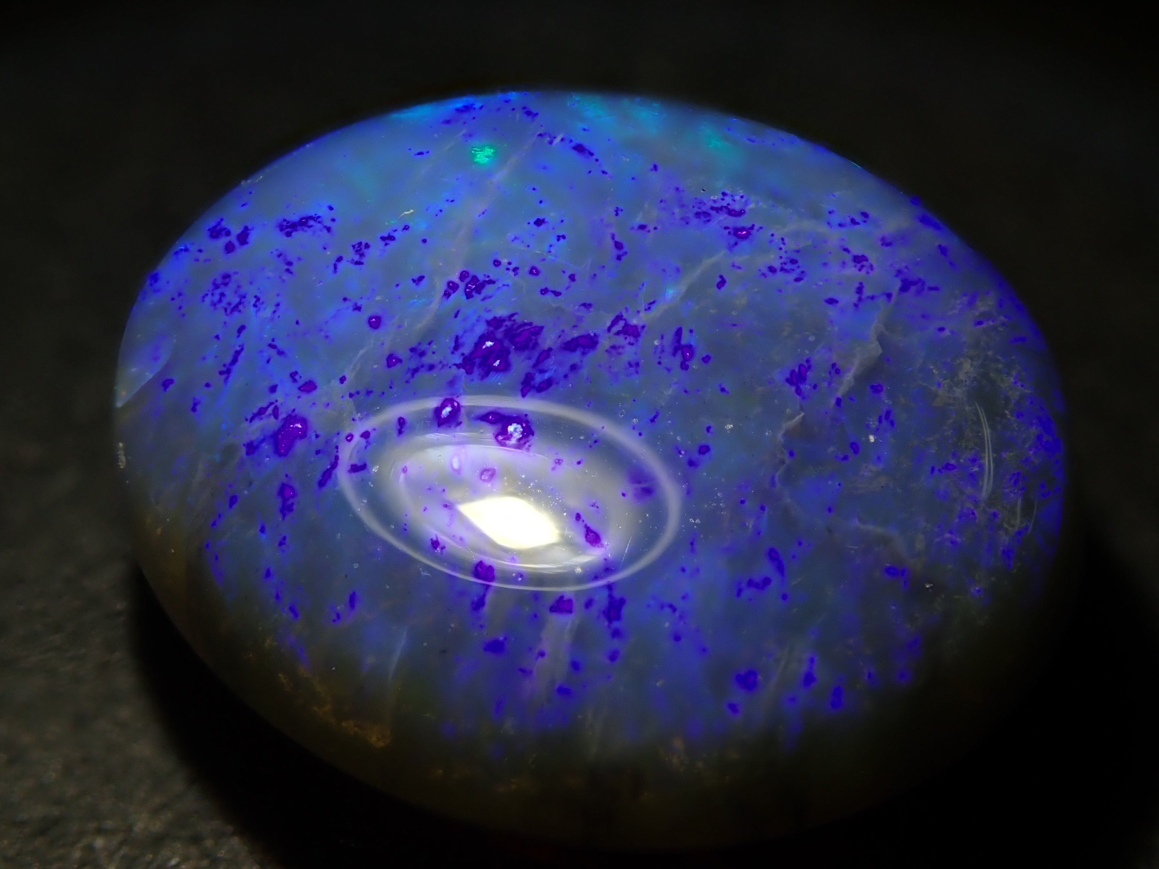 蛋白石是一種閃爍著彩虹色光芒的寶石。蛋白石有好幾種類型,但其中,黑蛋白石漆黑的黑暗中搖曳的紅色火焰美得讓人無法移開目光。底色包括黑色、藍色和灰色。照片是使用筆燈拍攝的。
