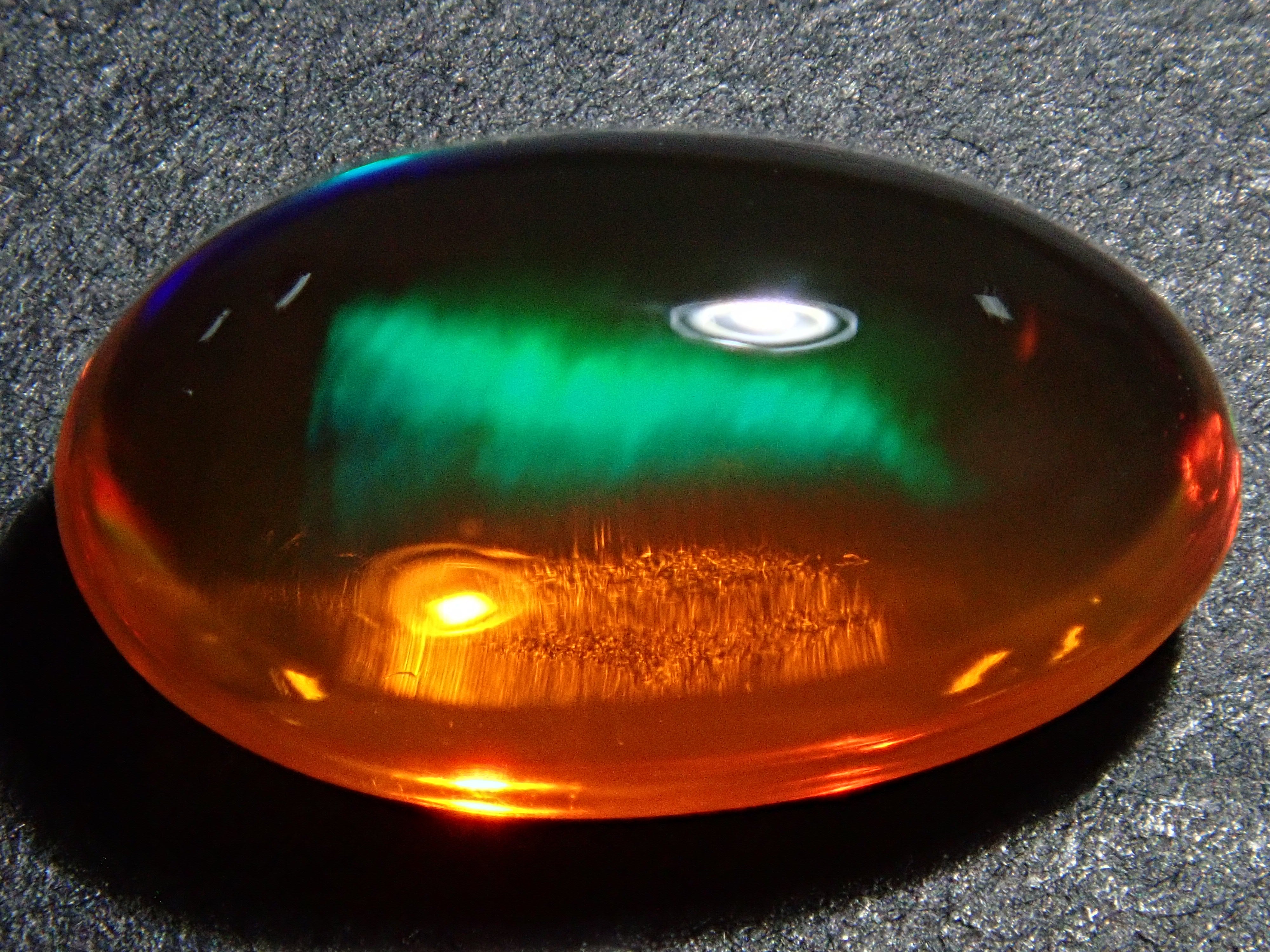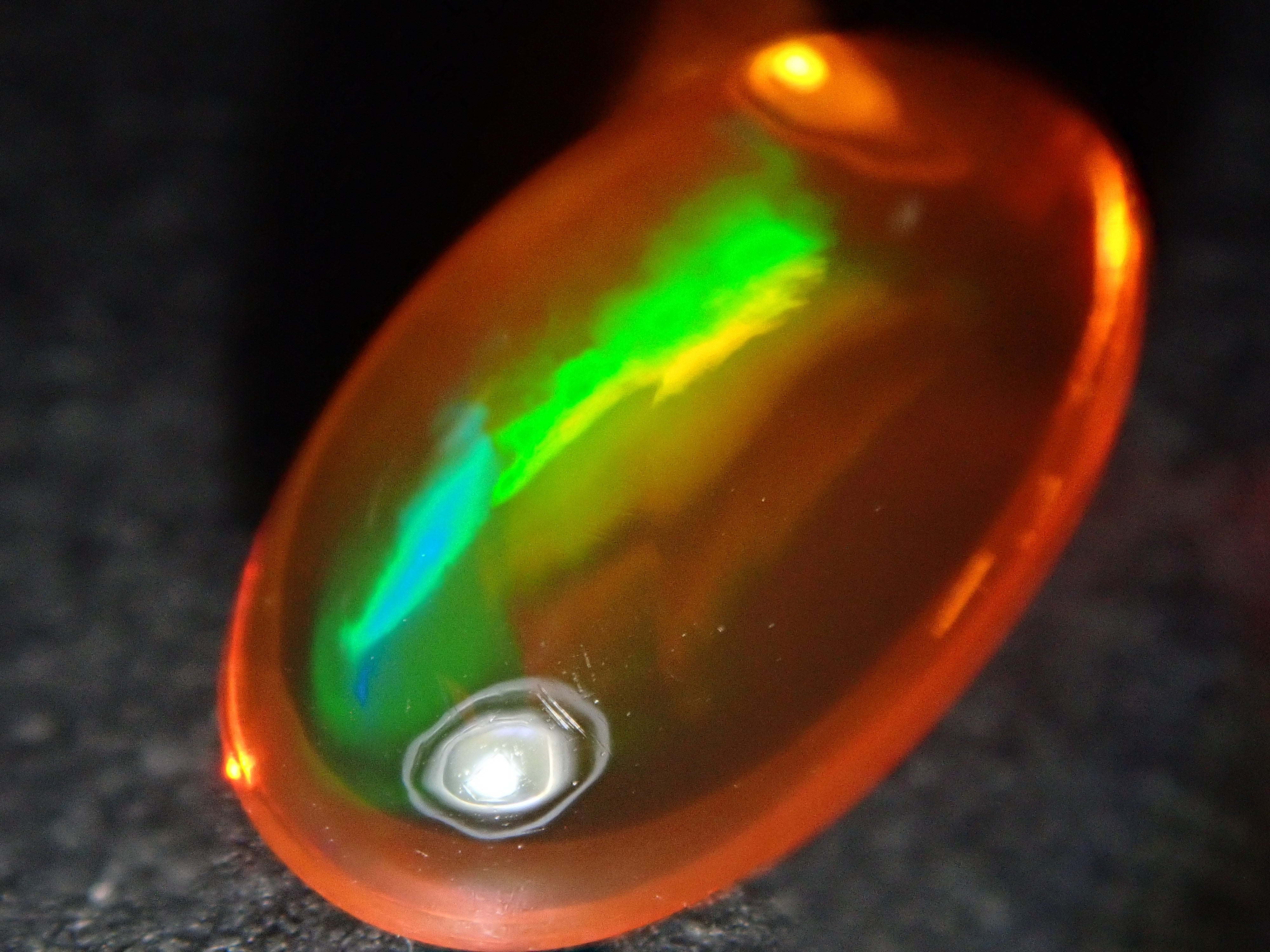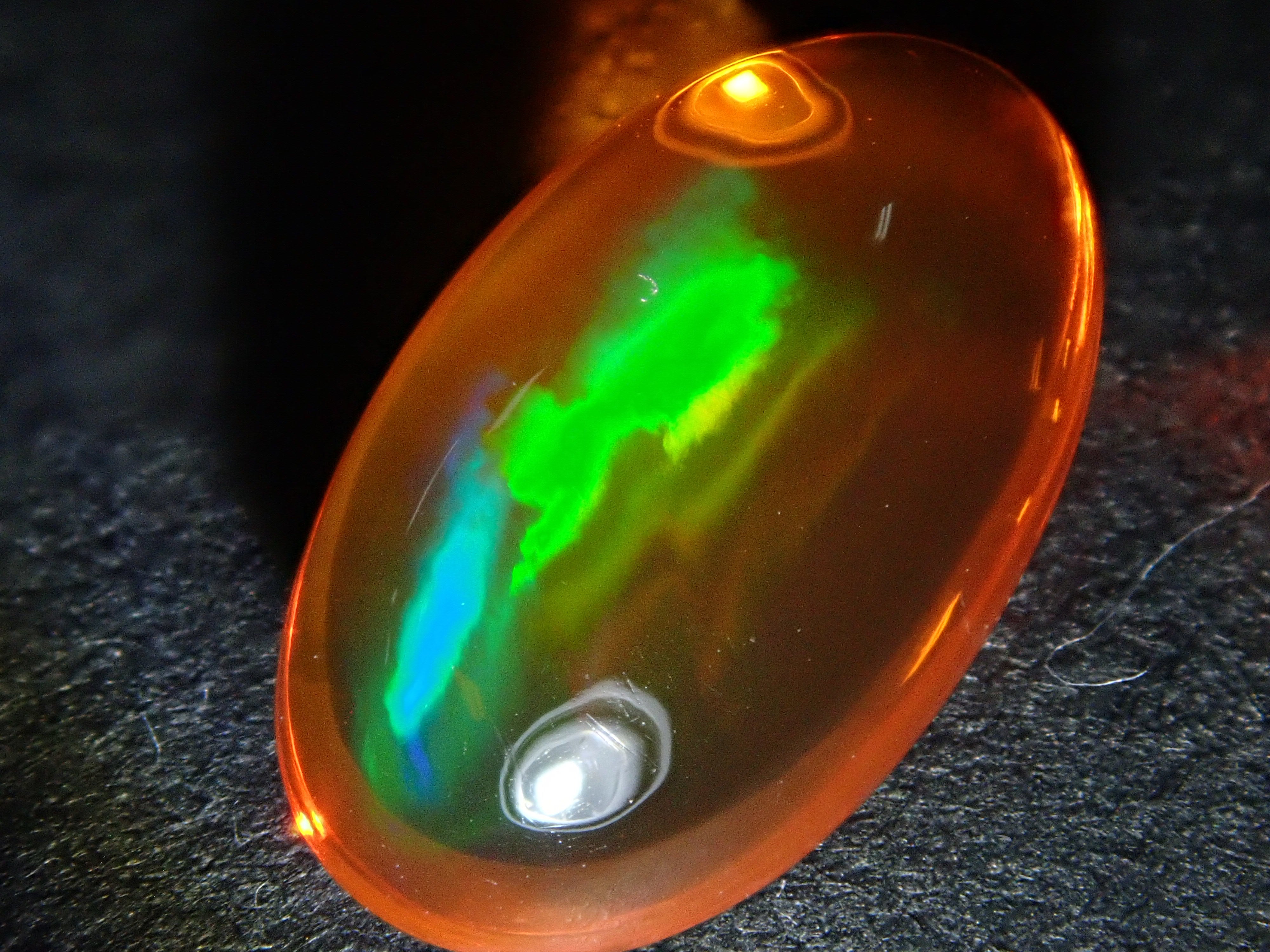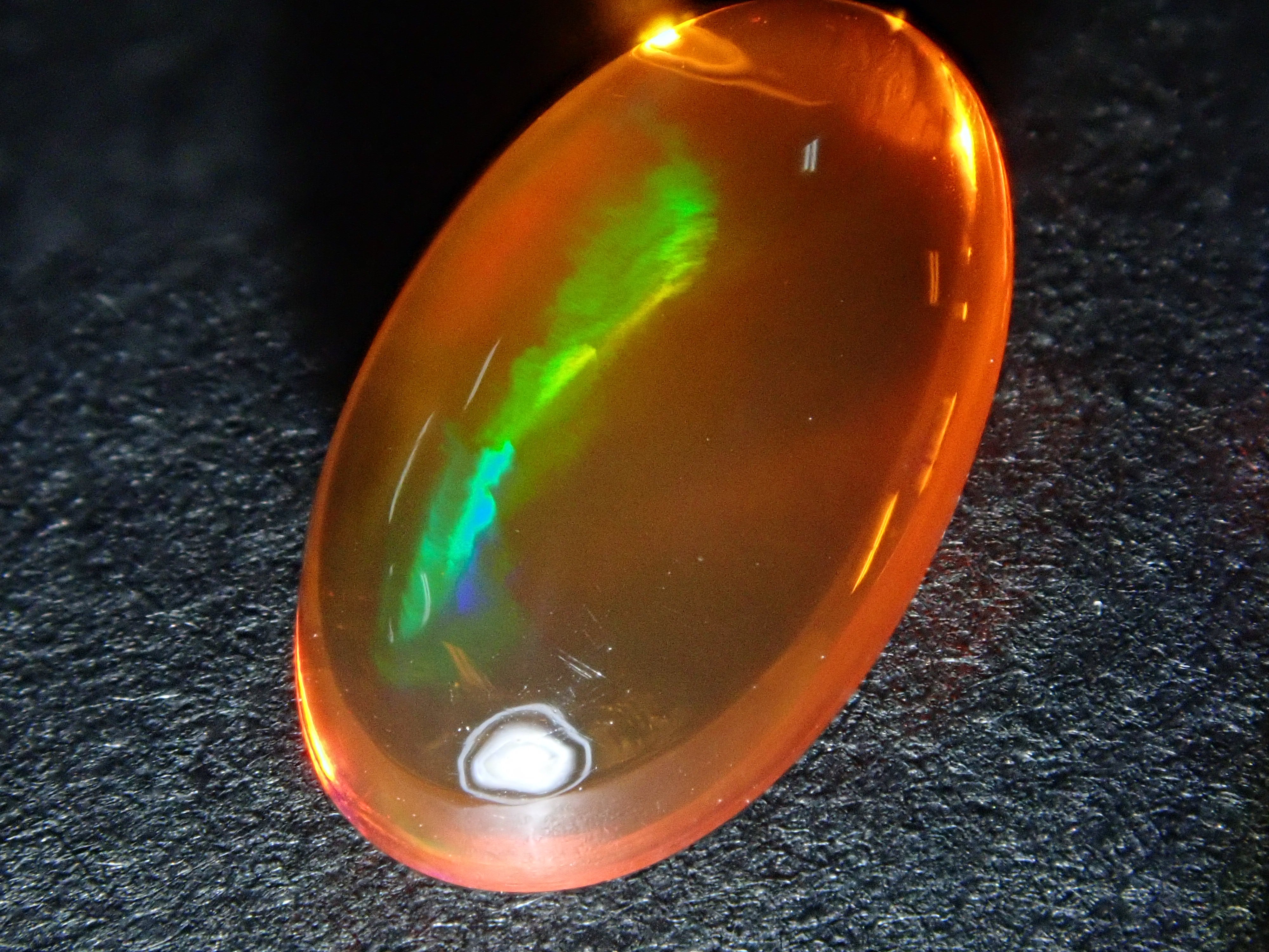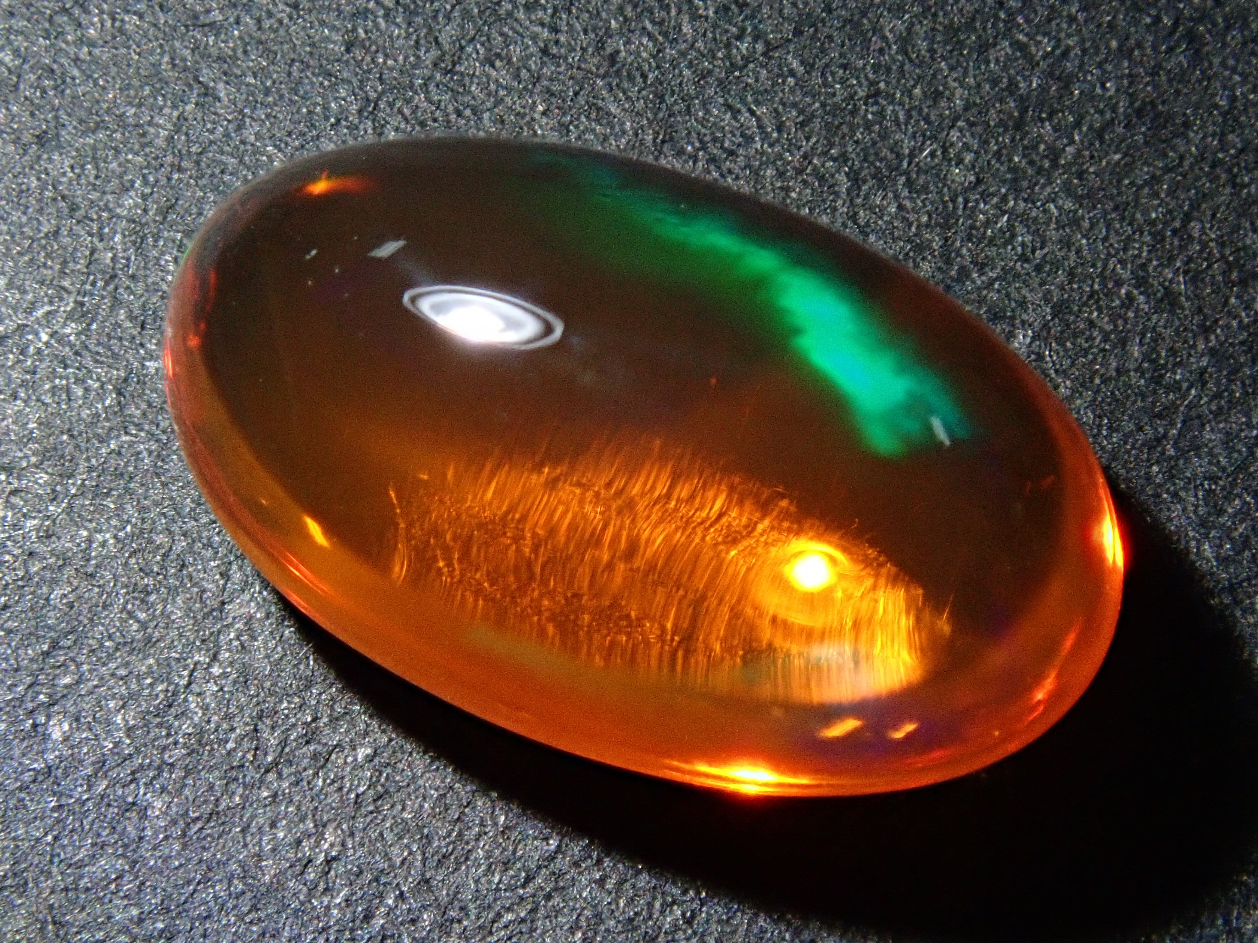 蛋白石自古羅馬時代以來就很受歡迎。火蛋白石是指底色從紅色到橘色,給人火的印象的蛋白石。照片是使用筆燈拍攝的。墨西哥火蛋白石,具有類似貓眼的垂直遊彩。