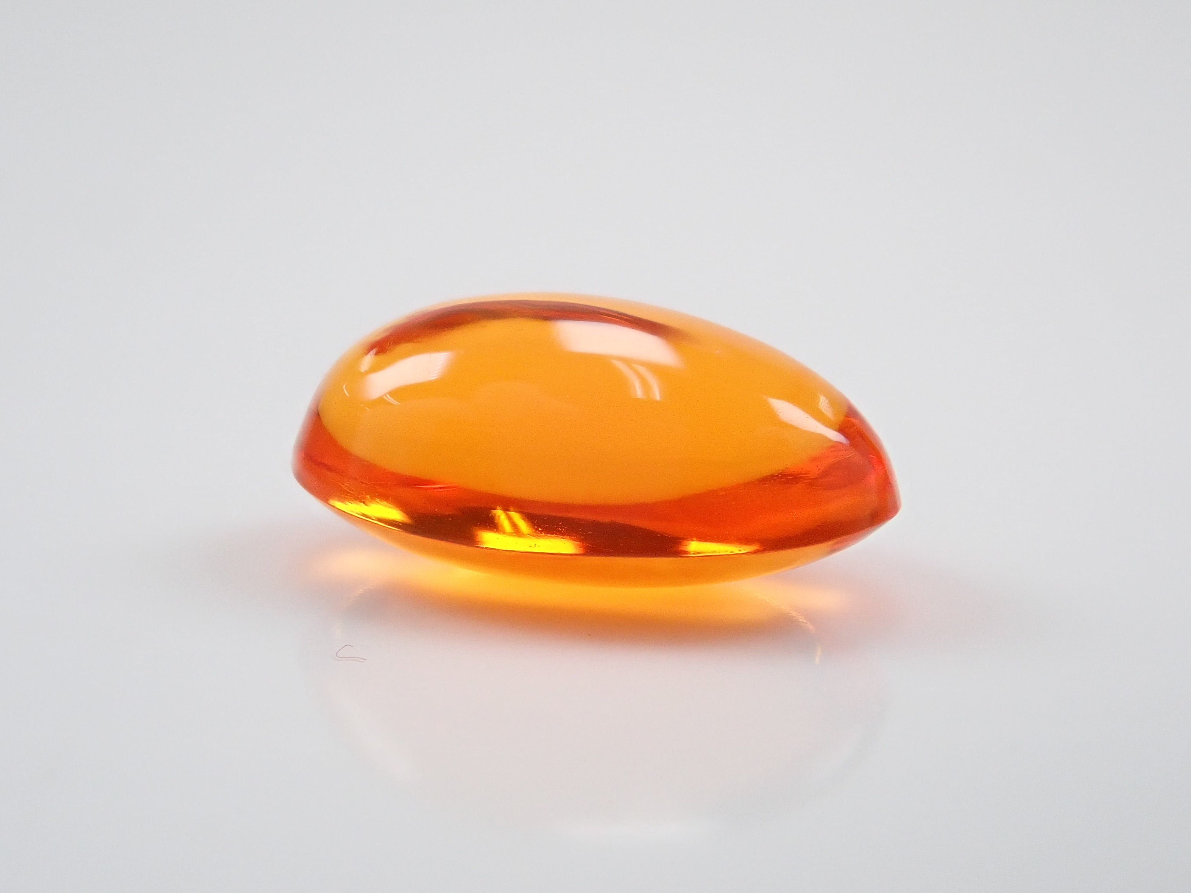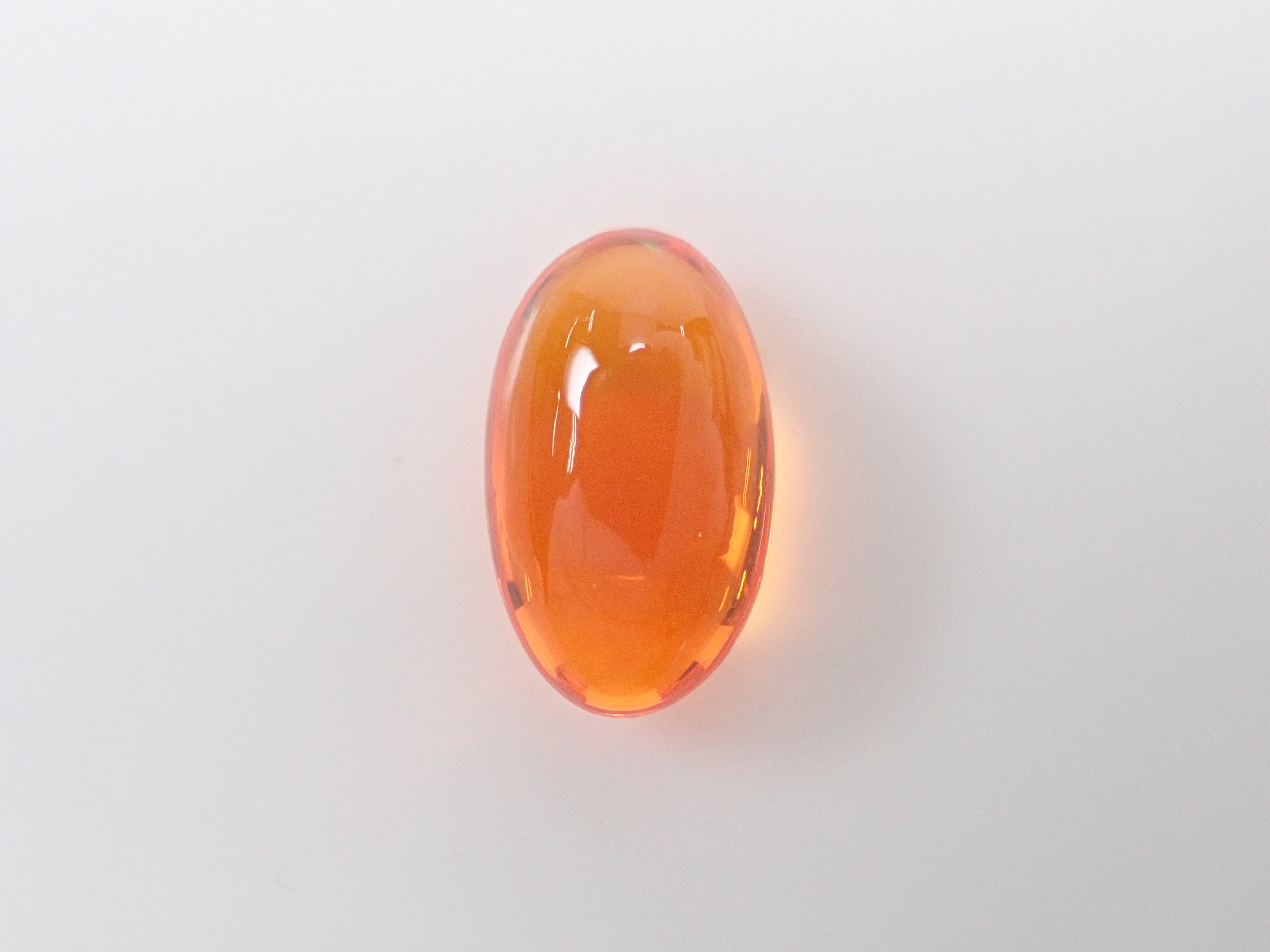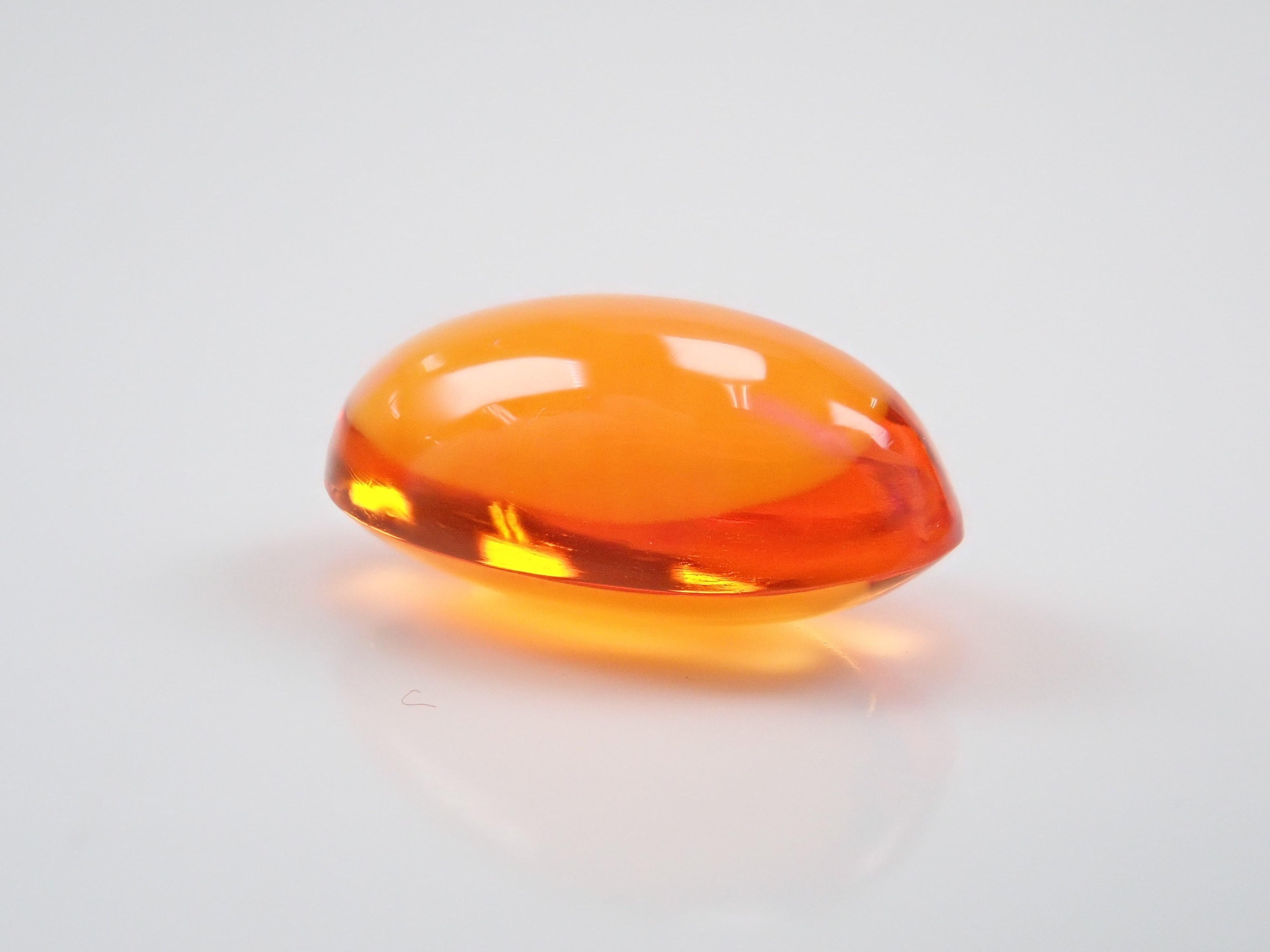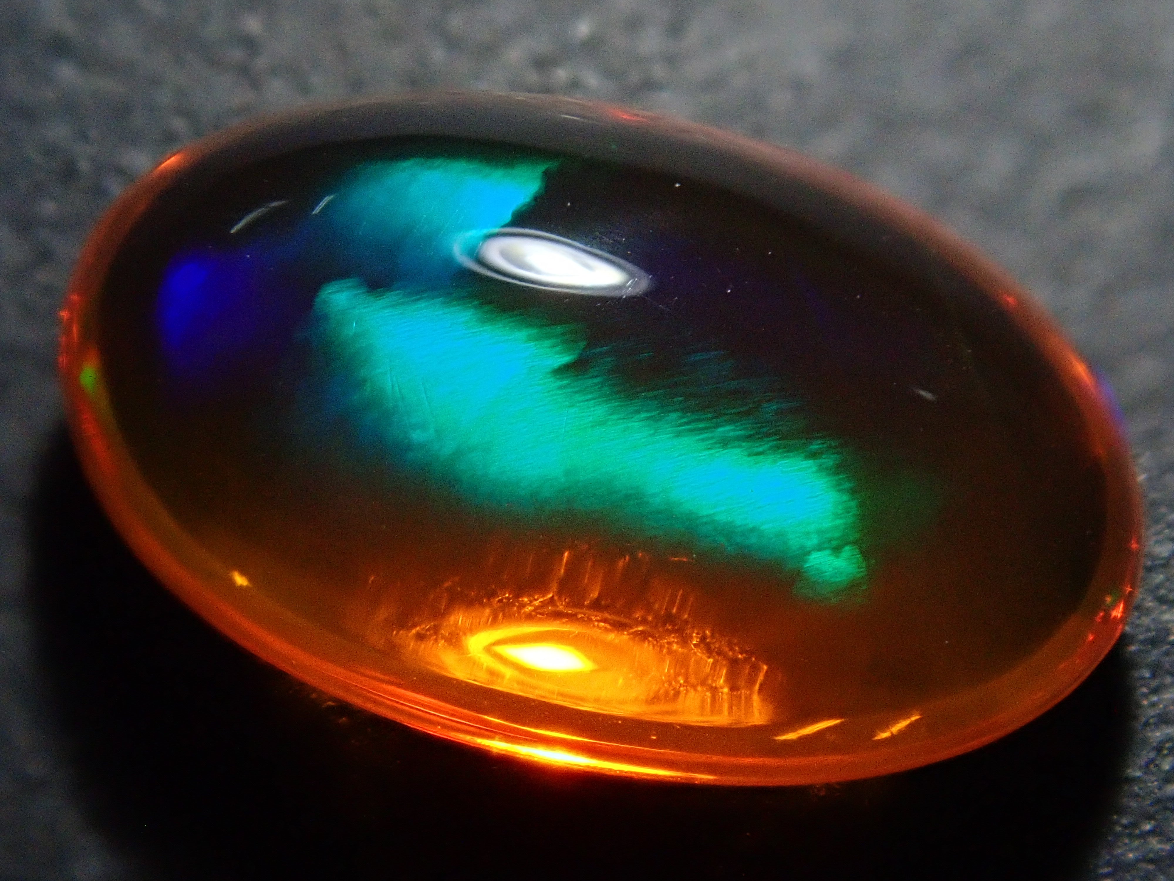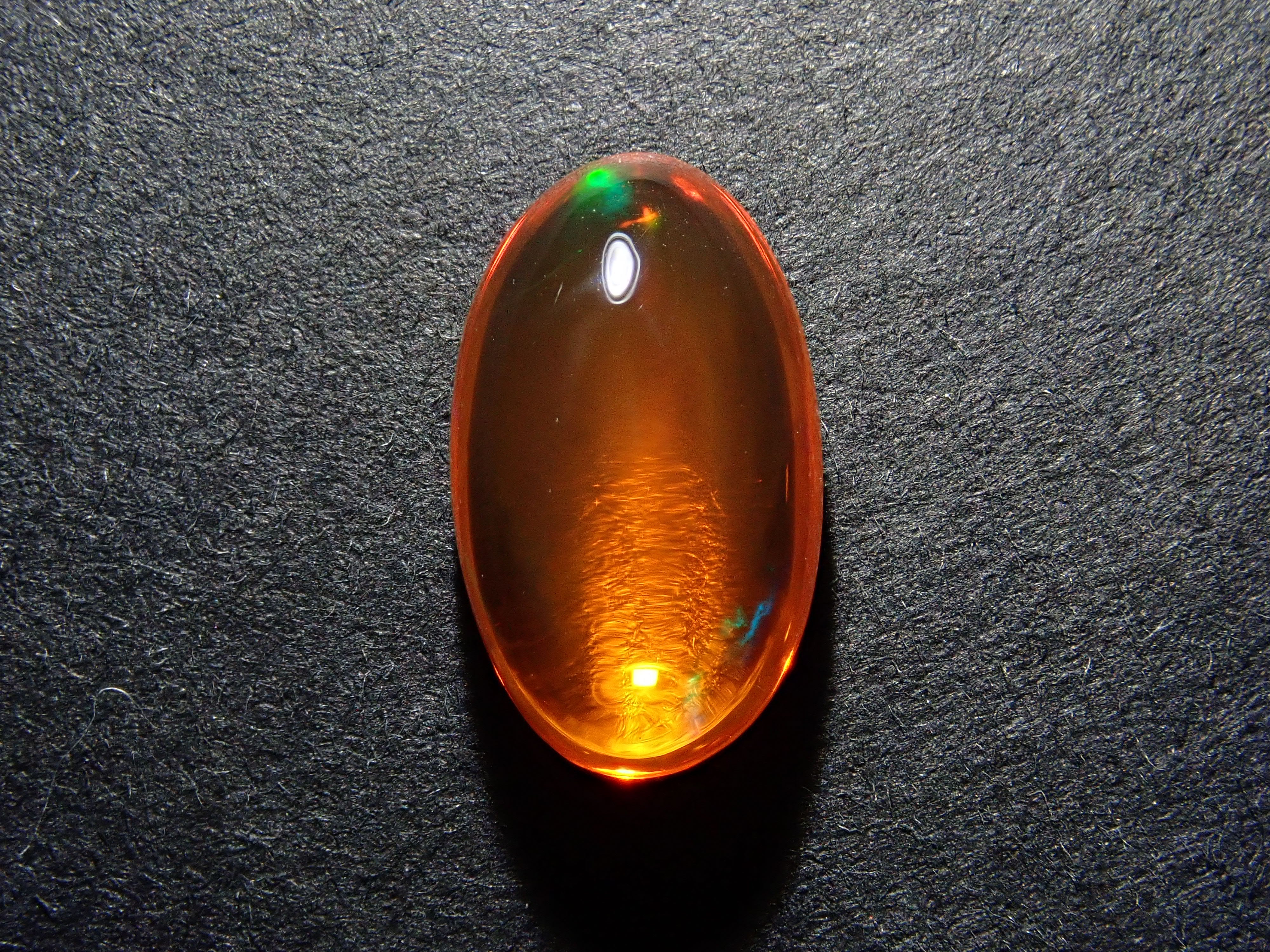 蛋白石自古羅馬時代以來就很受歡迎。火蛋白石是指底色從紅色到橘色,給人火的印象的蛋白石。照片是使用筆燈拍攝的。墨西哥火蛋白石,具有類似貓眼的垂直遊彩。