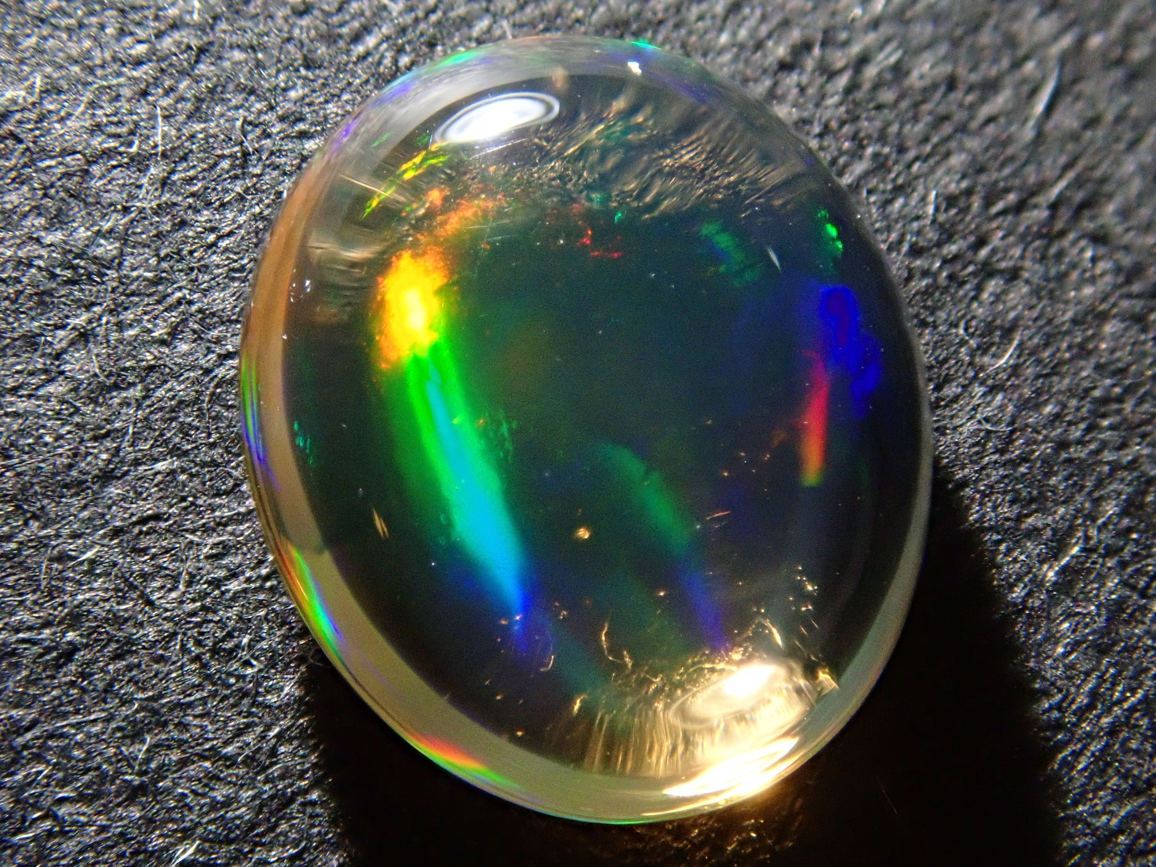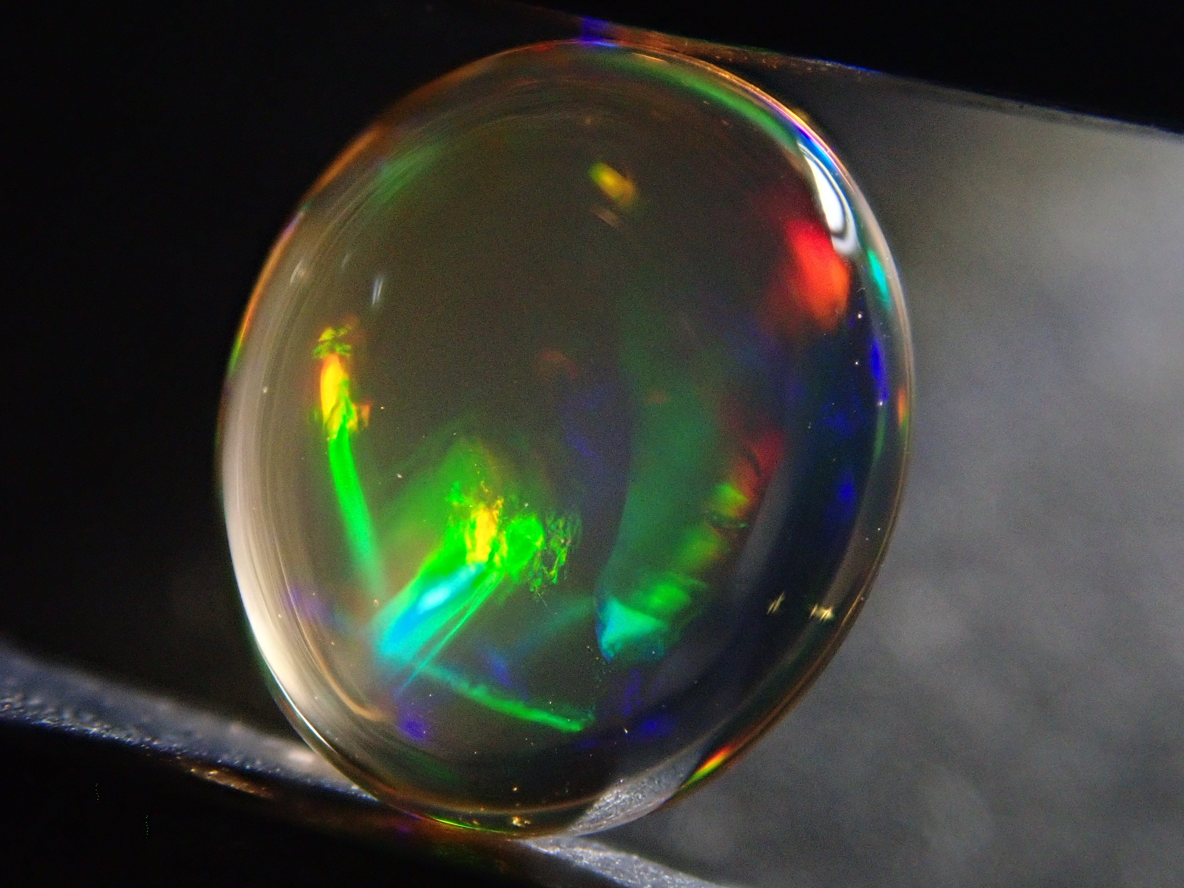 蛋白石自古羅馬時代以來就很受歡迎。火蛋白石是指底色從紅色到橘色,給人火的印象的蛋白石。照片是使用筆燈拍攝的。來自墨西哥的高度透明的火蛋白石。