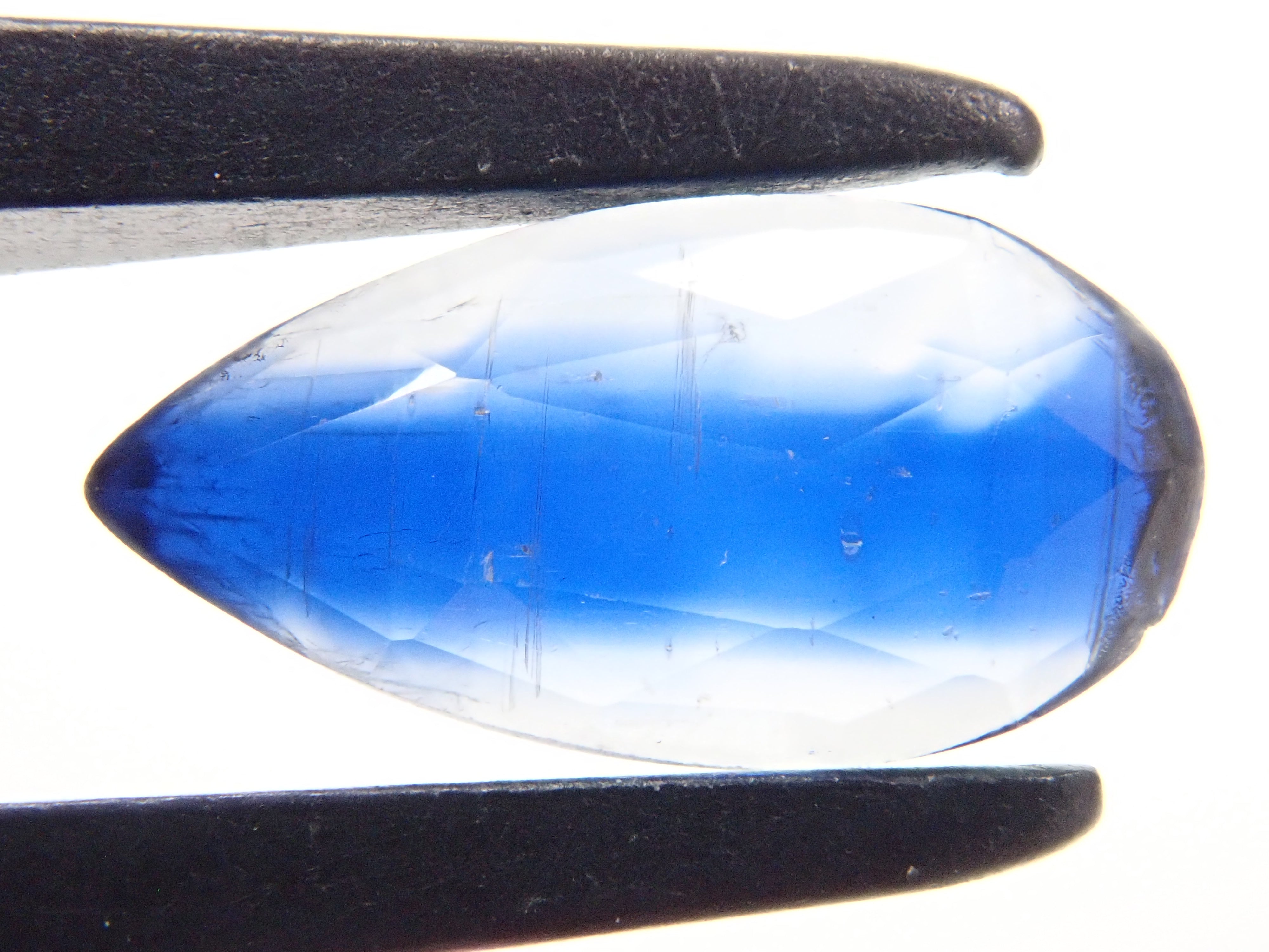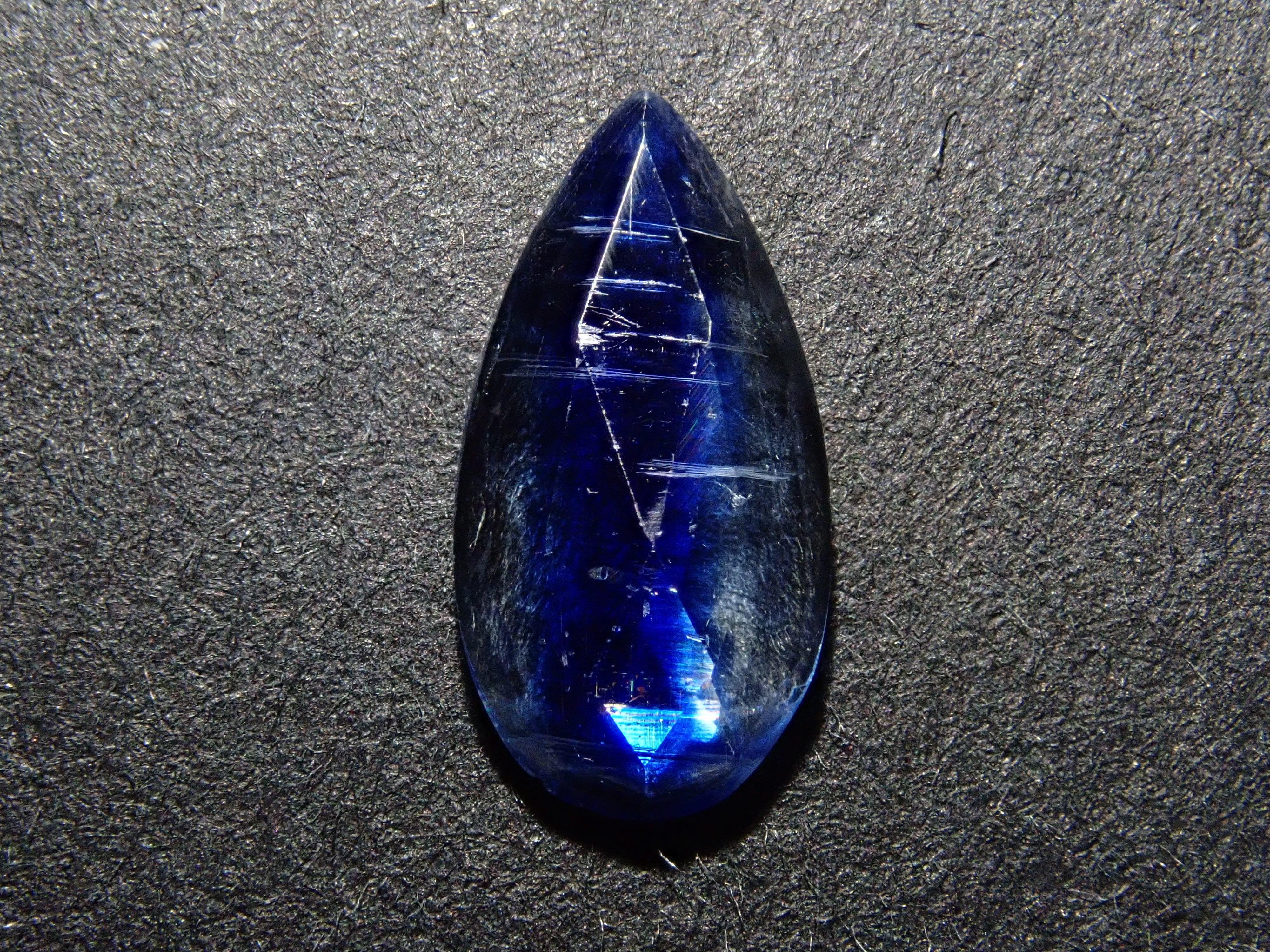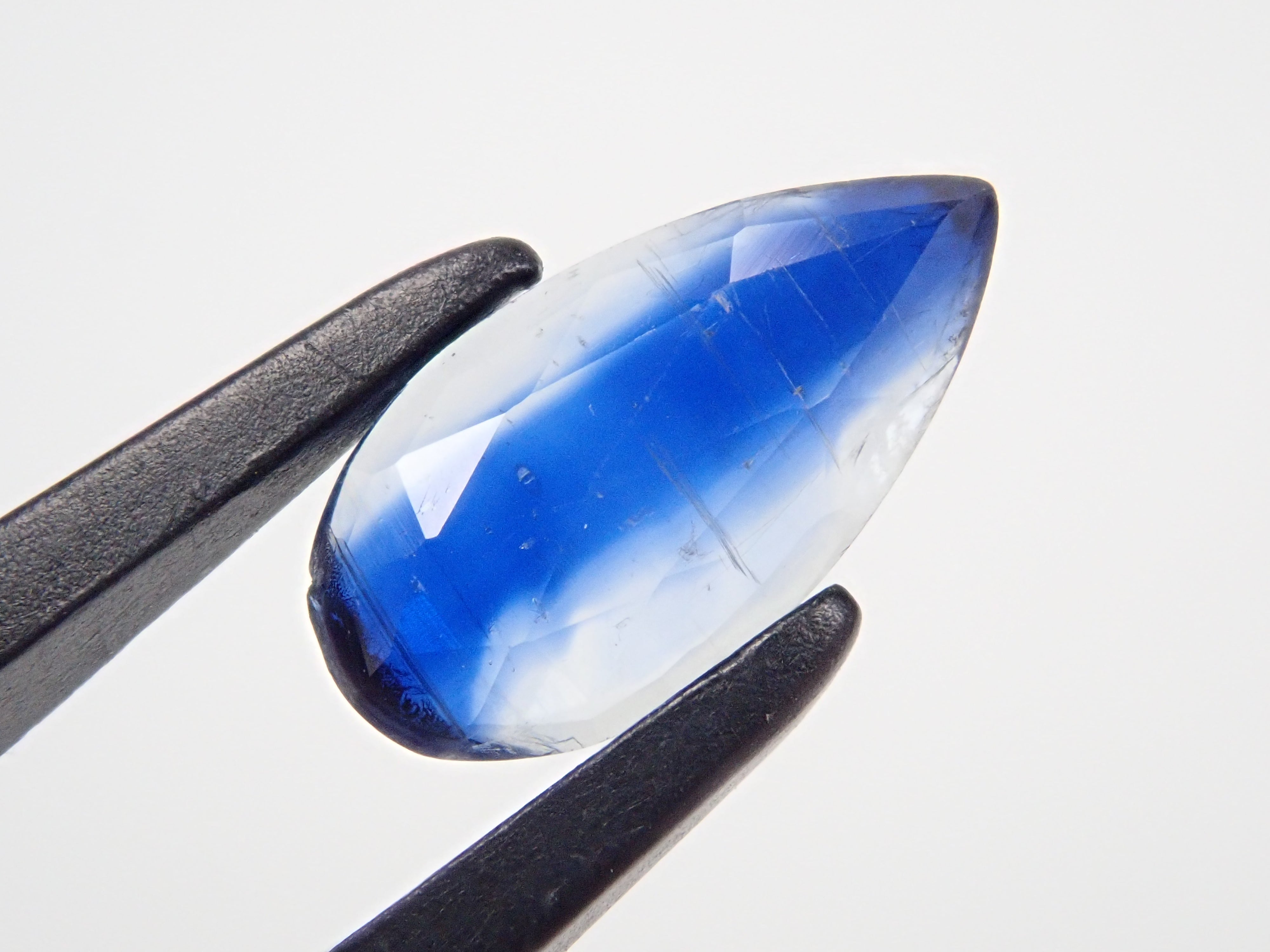 藍晶石具有耀眼的深藍色。深藍色讓人聯想到地球、太空或深海,它的日文名稱是“藍水晶”,意思是“靛藍水晶”。這是一顆玫瑰切割雙色藍晶石。
