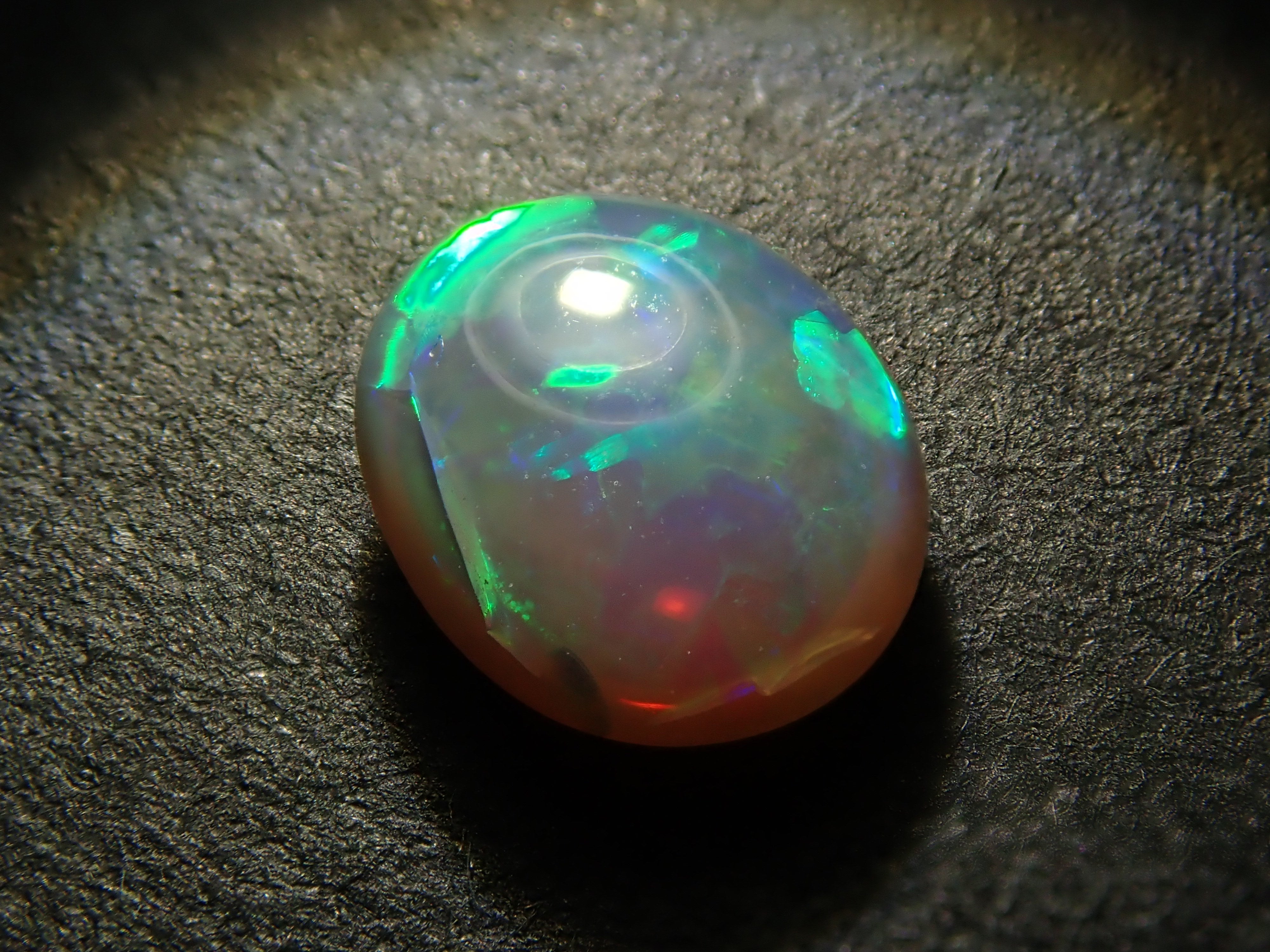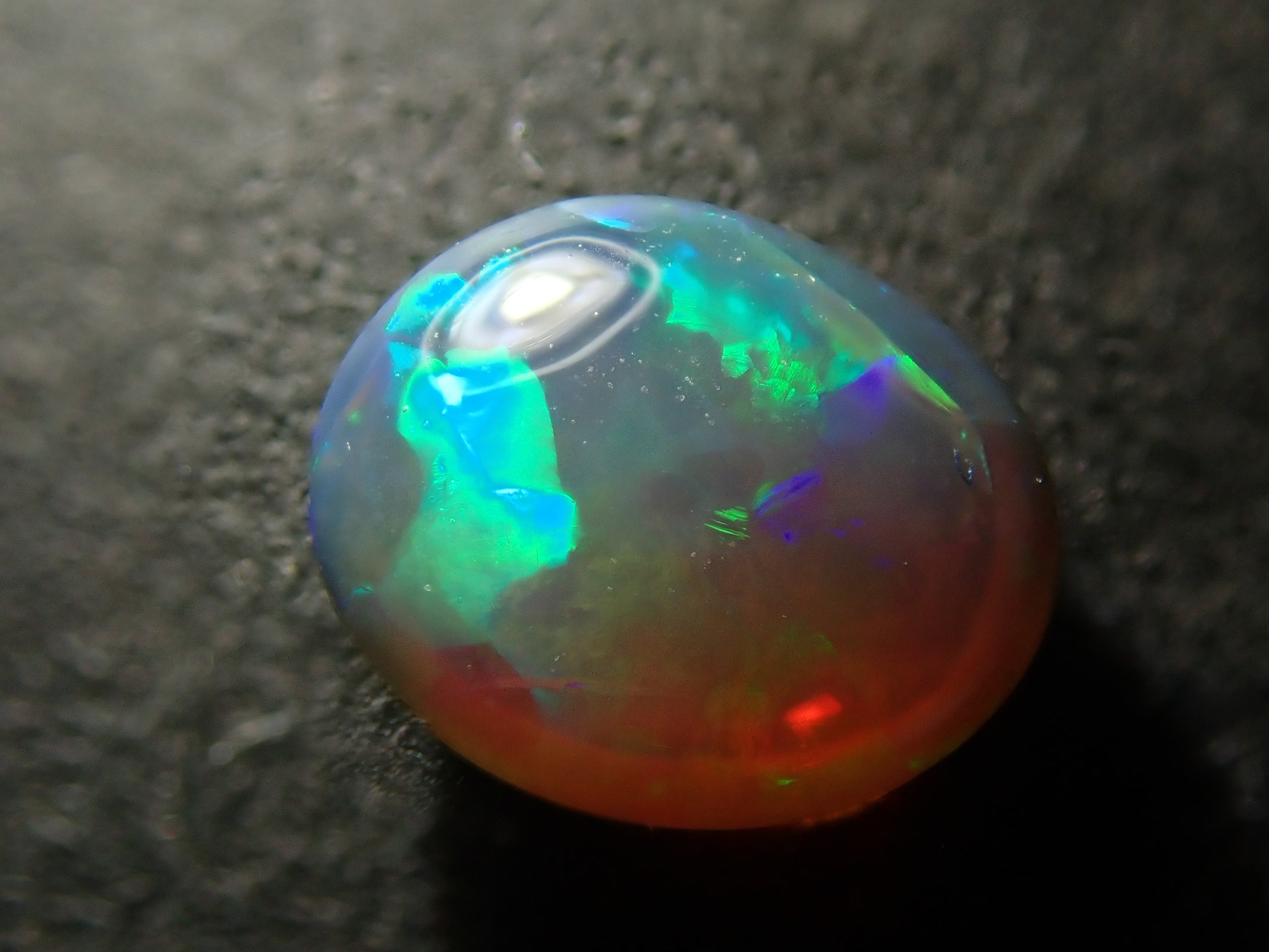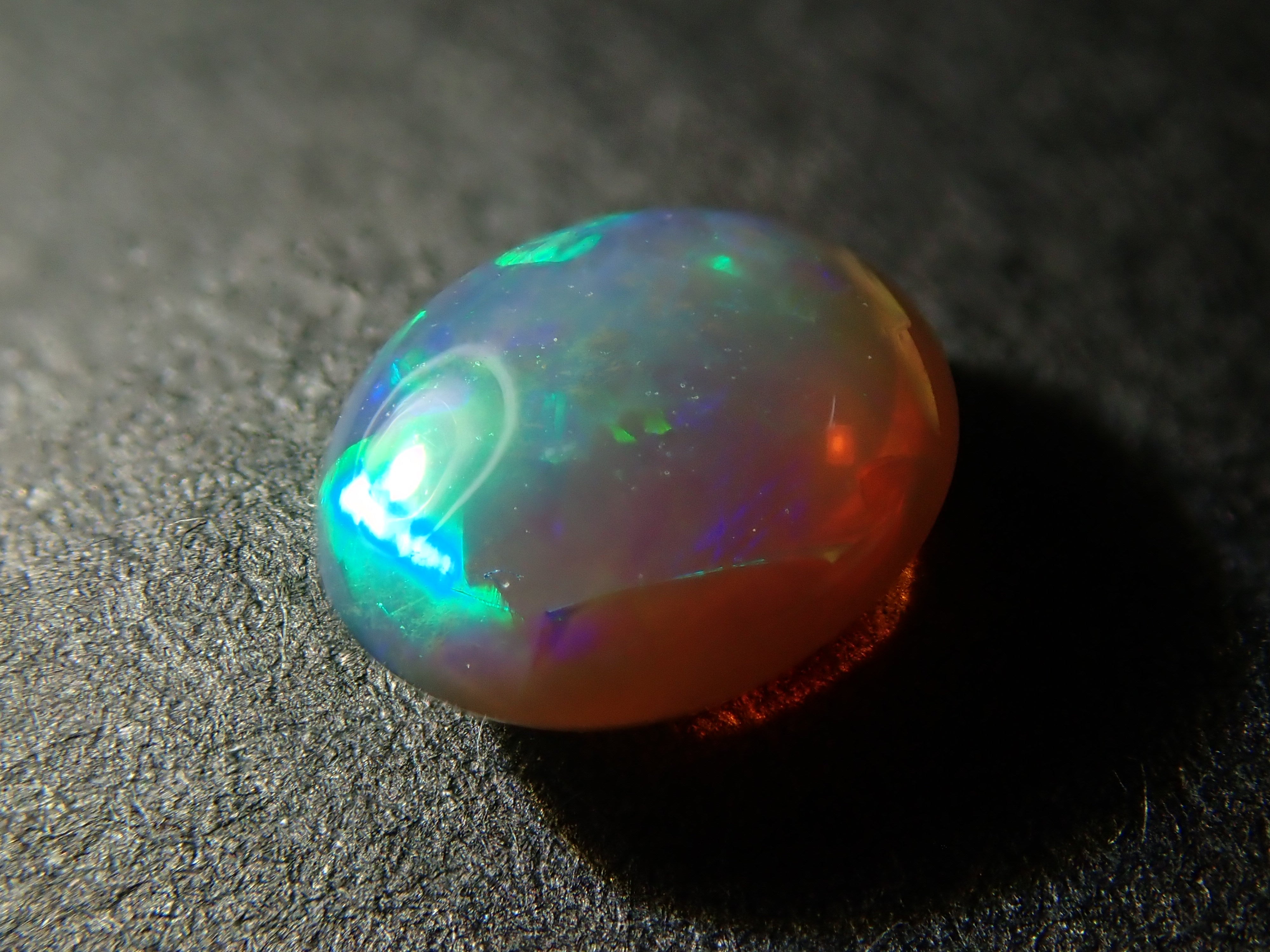 蛋白石是一種閃爍著彩虹色光芒的寶石。蛋白石有好幾種類型,但其中,黑蛋白石漆黑的黑暗中搖曳的紅色火焰美得讓人無法移開目光。底色包括黑色、藍色和灰色。照片是使用筆燈拍攝的。產自澳洲閃電嶺的 0.407 克拉黑蛋白石。