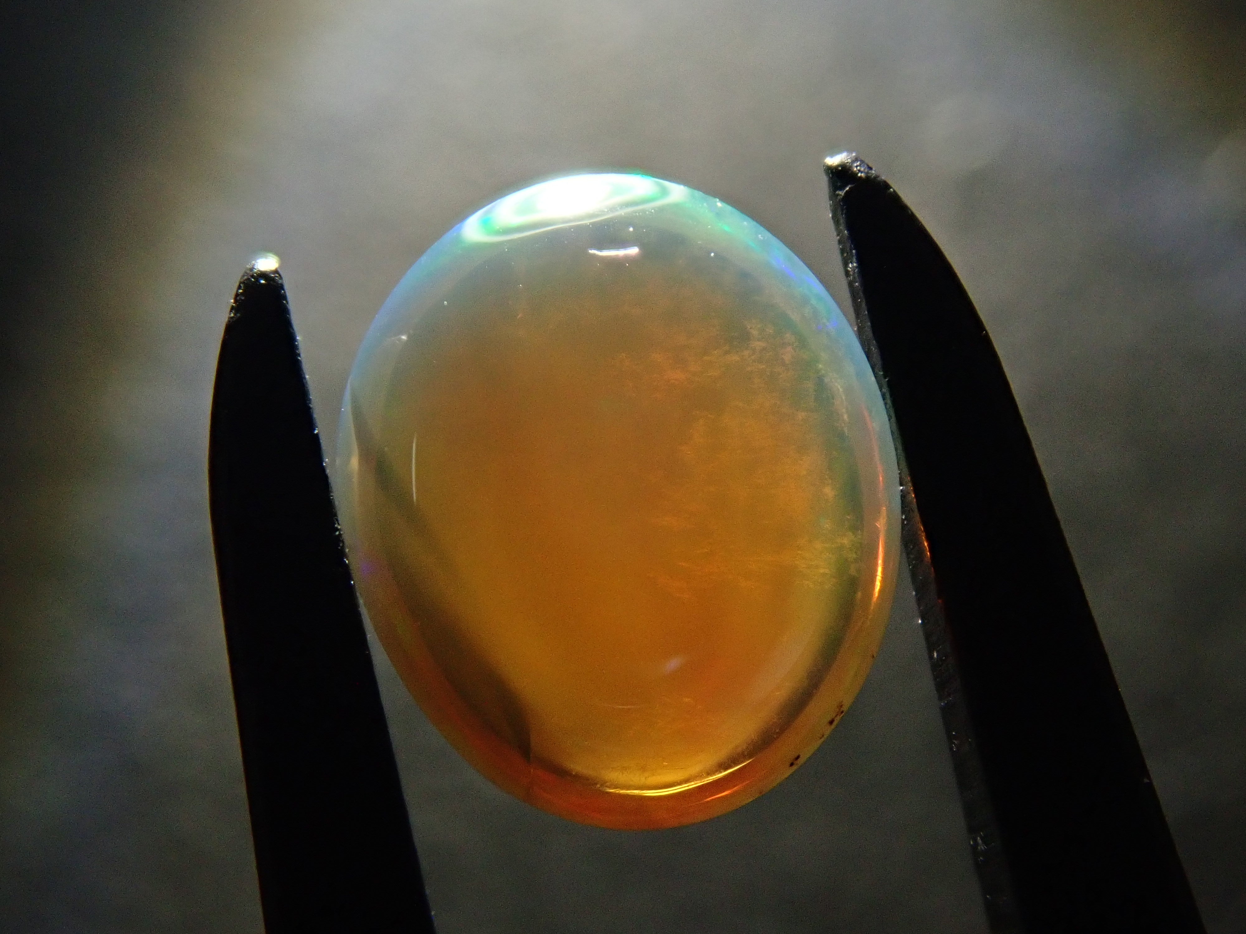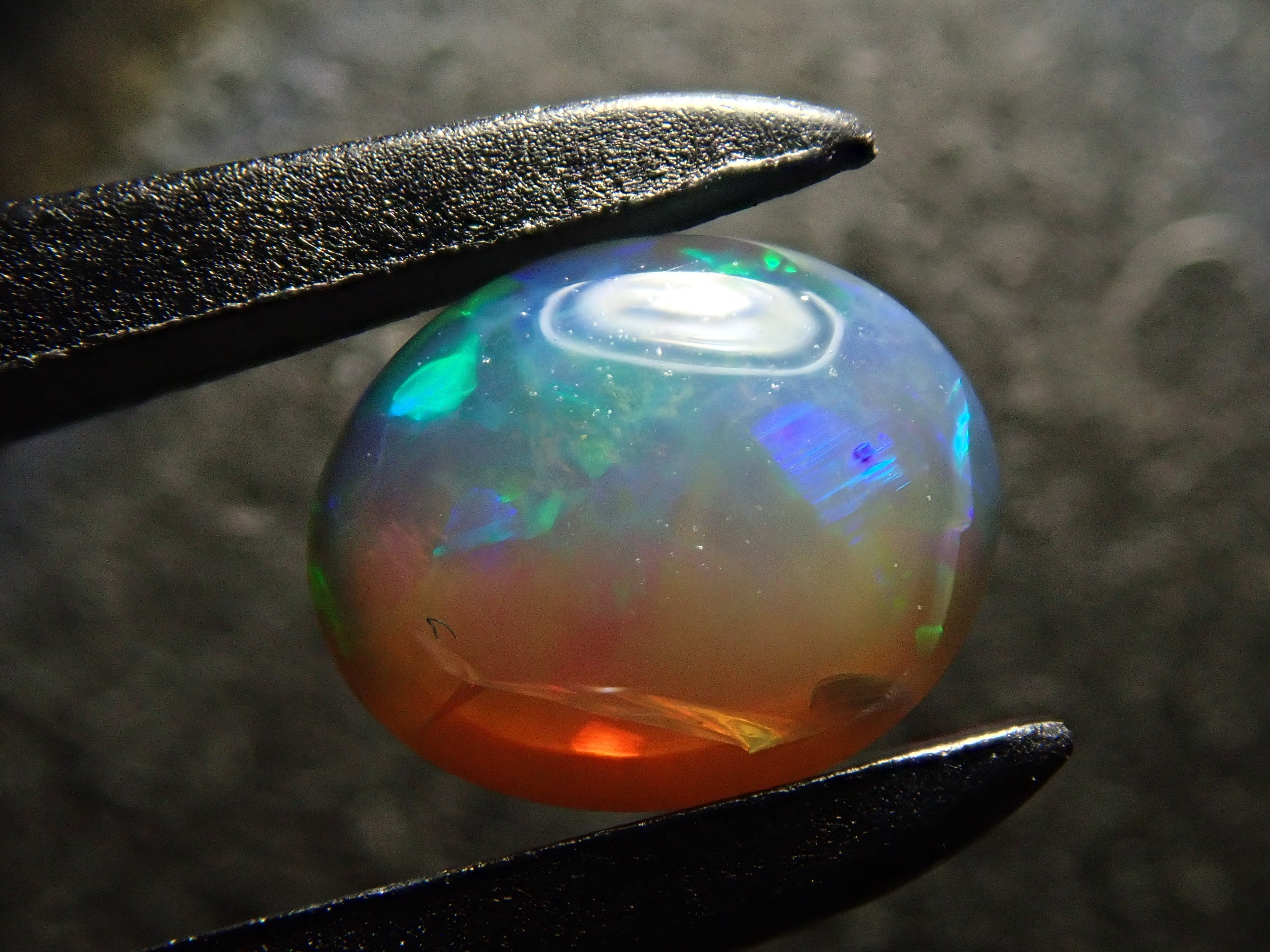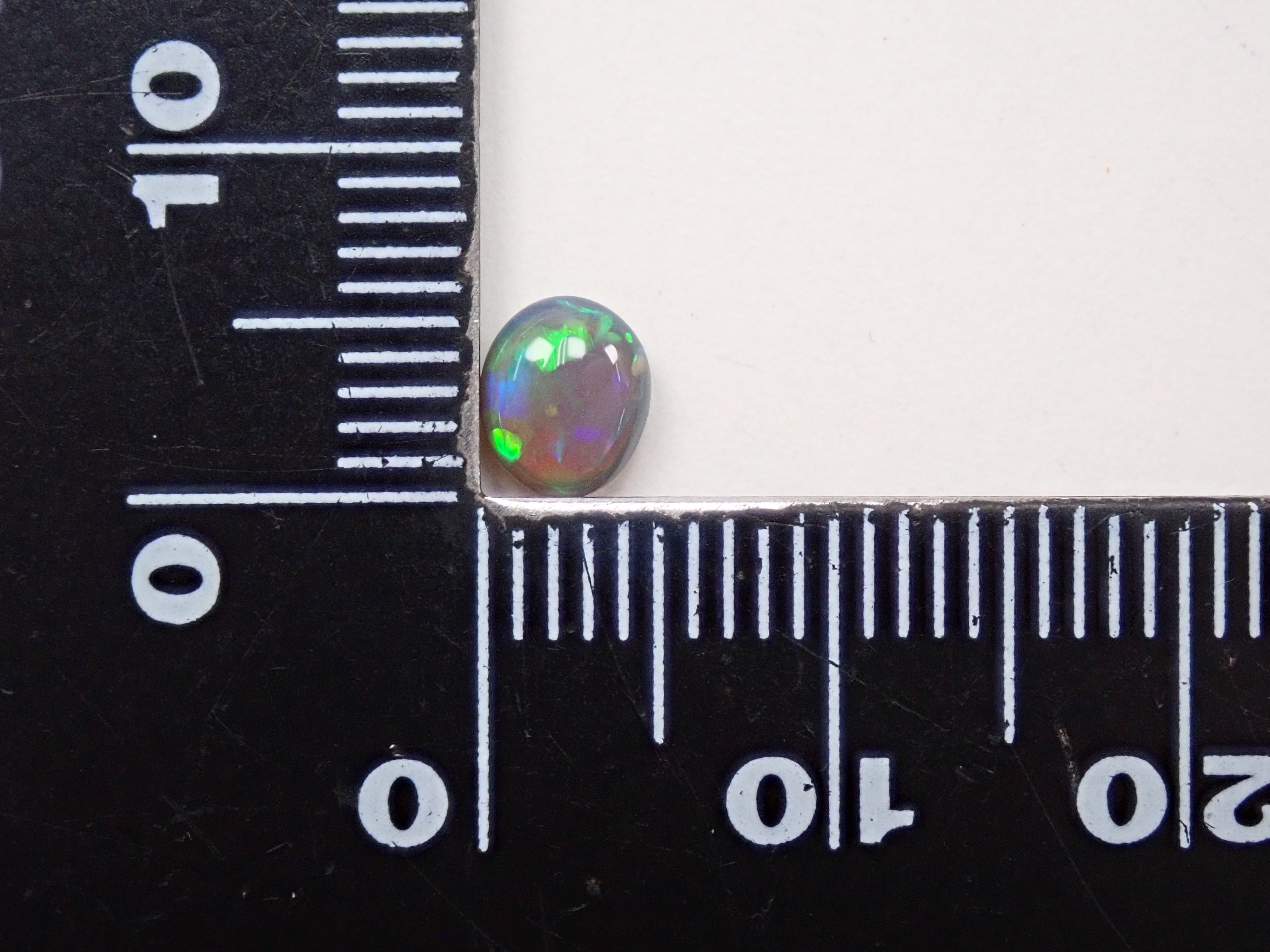 蛋白石是一種閃爍著彩虹色光芒的寶石。蛋白石有好幾種類型,但其中,黑蛋白石漆黑的黑暗中搖曳的紅色火焰美得讓人無法移開目光。底色包括黑色、藍色和灰色。照片是使用筆燈拍攝的。產自澳洲閃電嶺的 0.407 克拉黑蛋白石。