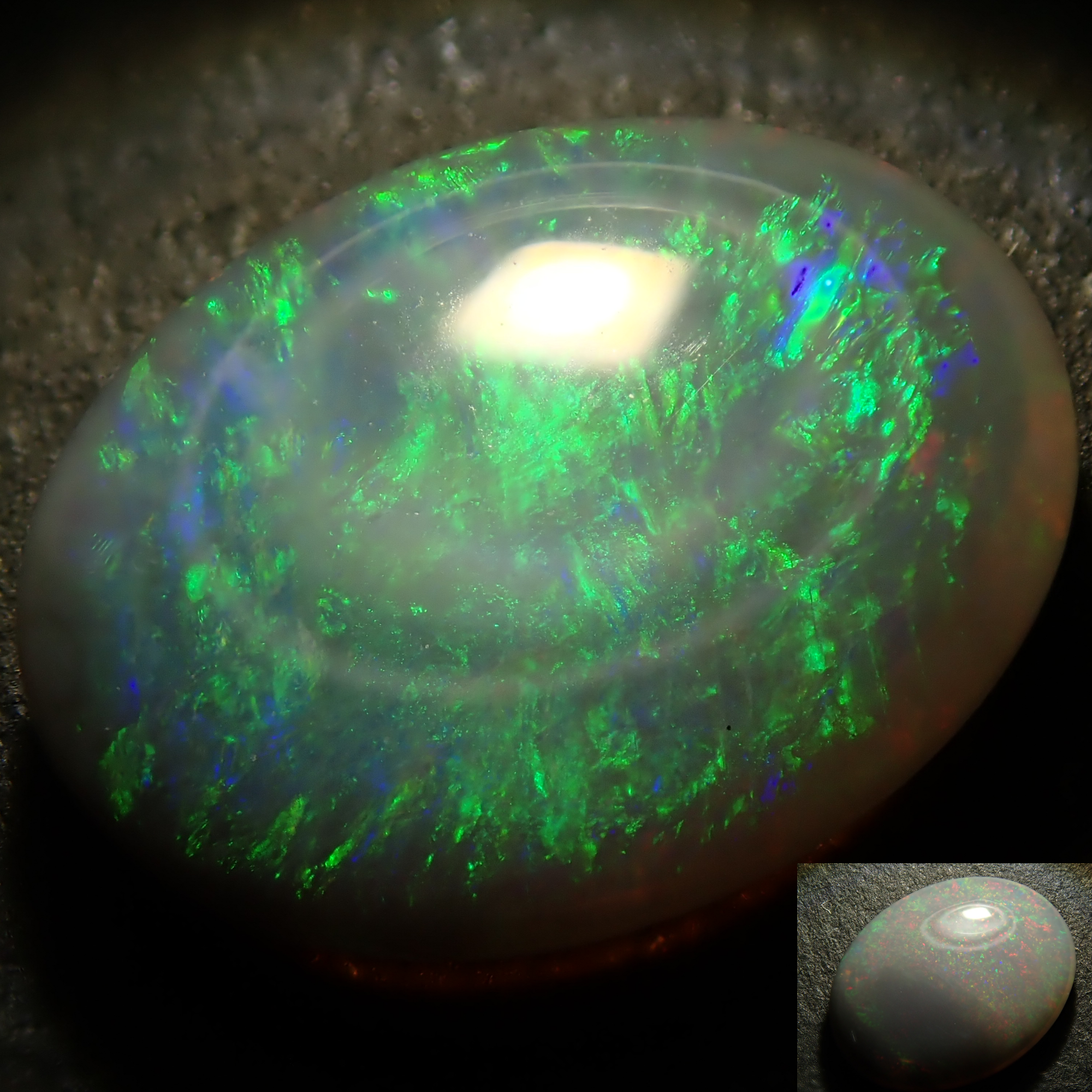 蛋白石是一種閃爍著彩虹色光芒的寶石。蛋白石有好幾種類型,但其中,黑蛋白石漆黑的黑暗中搖曳的紅色火焰美得讓人無法移開目光。底色包括黑色、藍色和灰色。照片是使用筆燈拍攝的。產自澳洲閃電嶺的 1.107 克拉黑蛋白石。