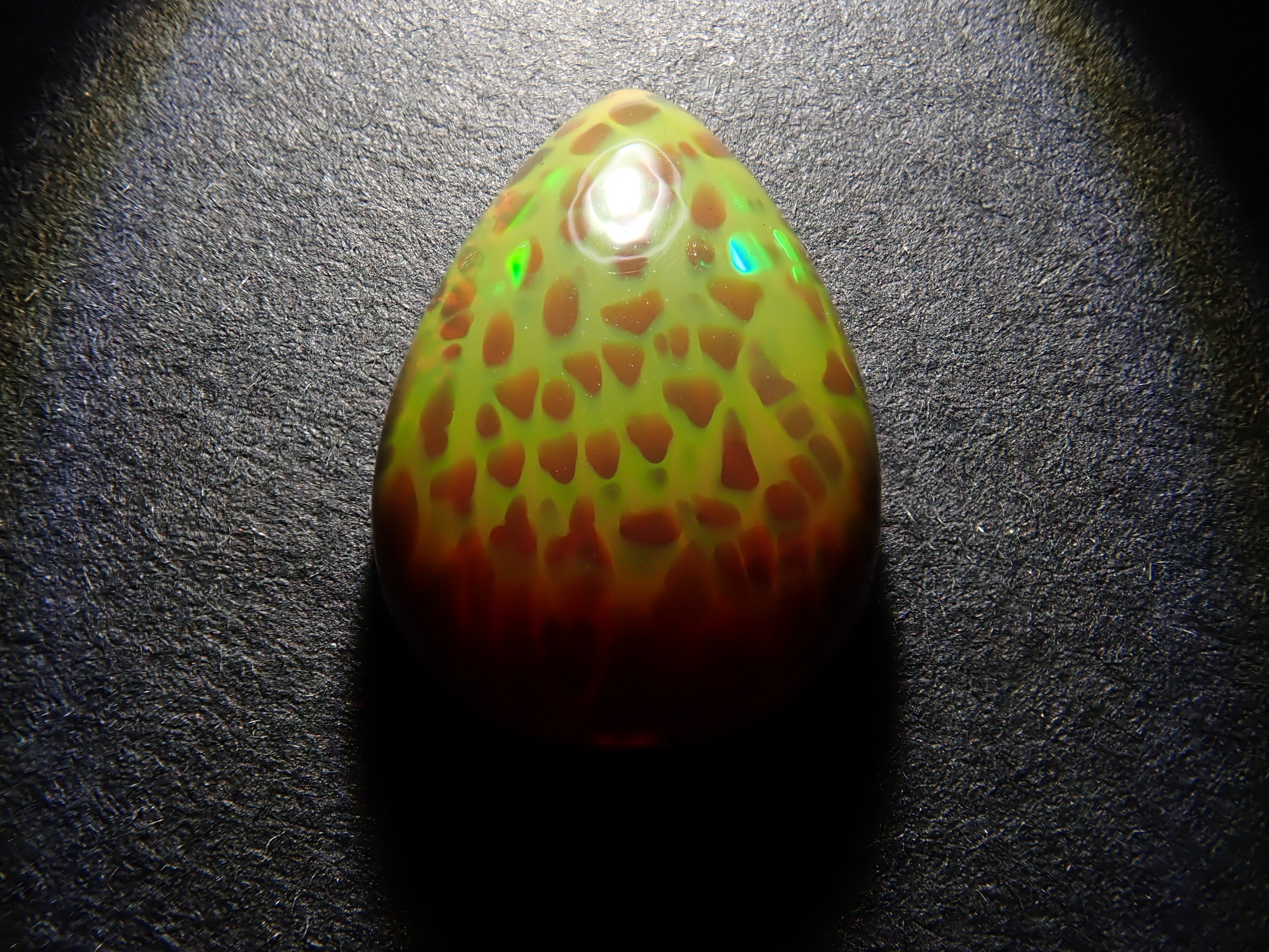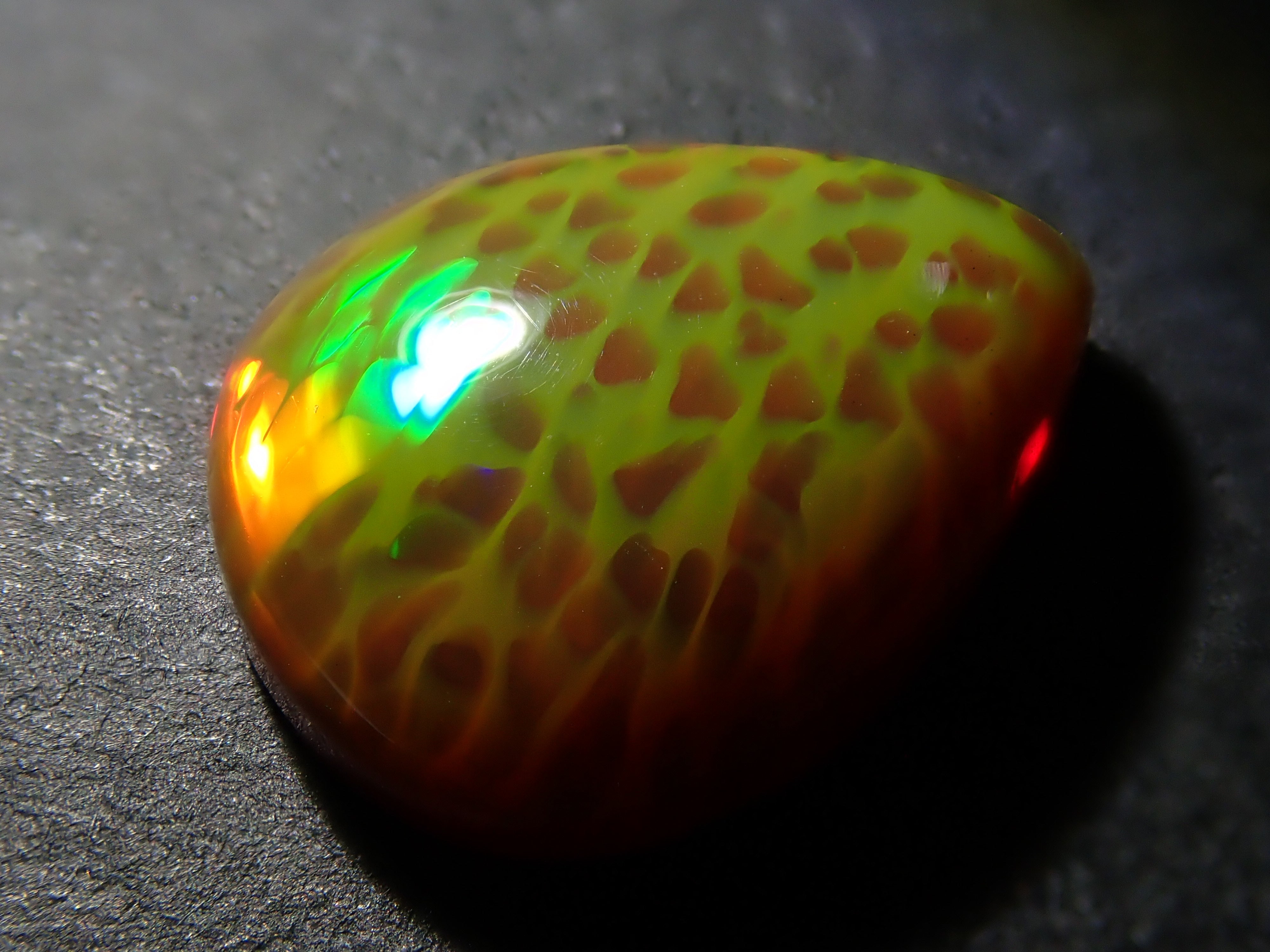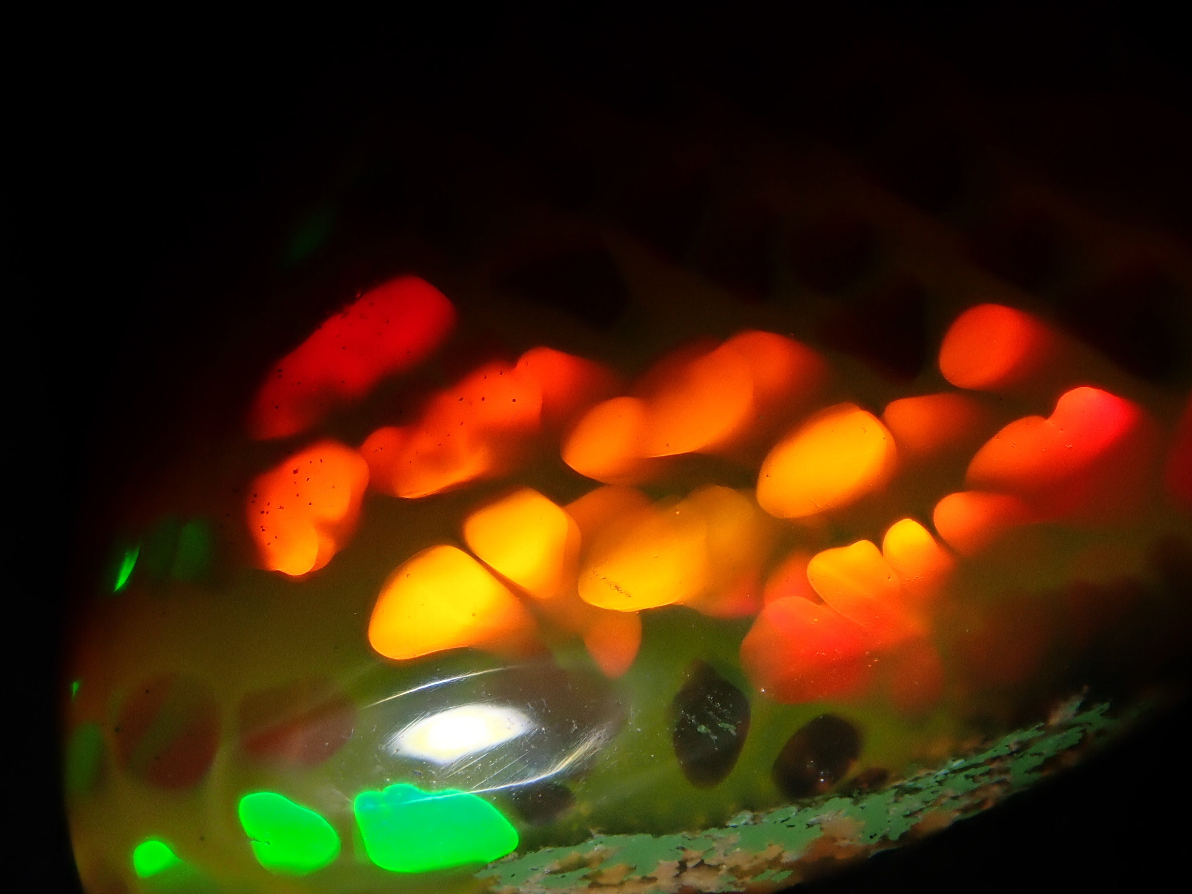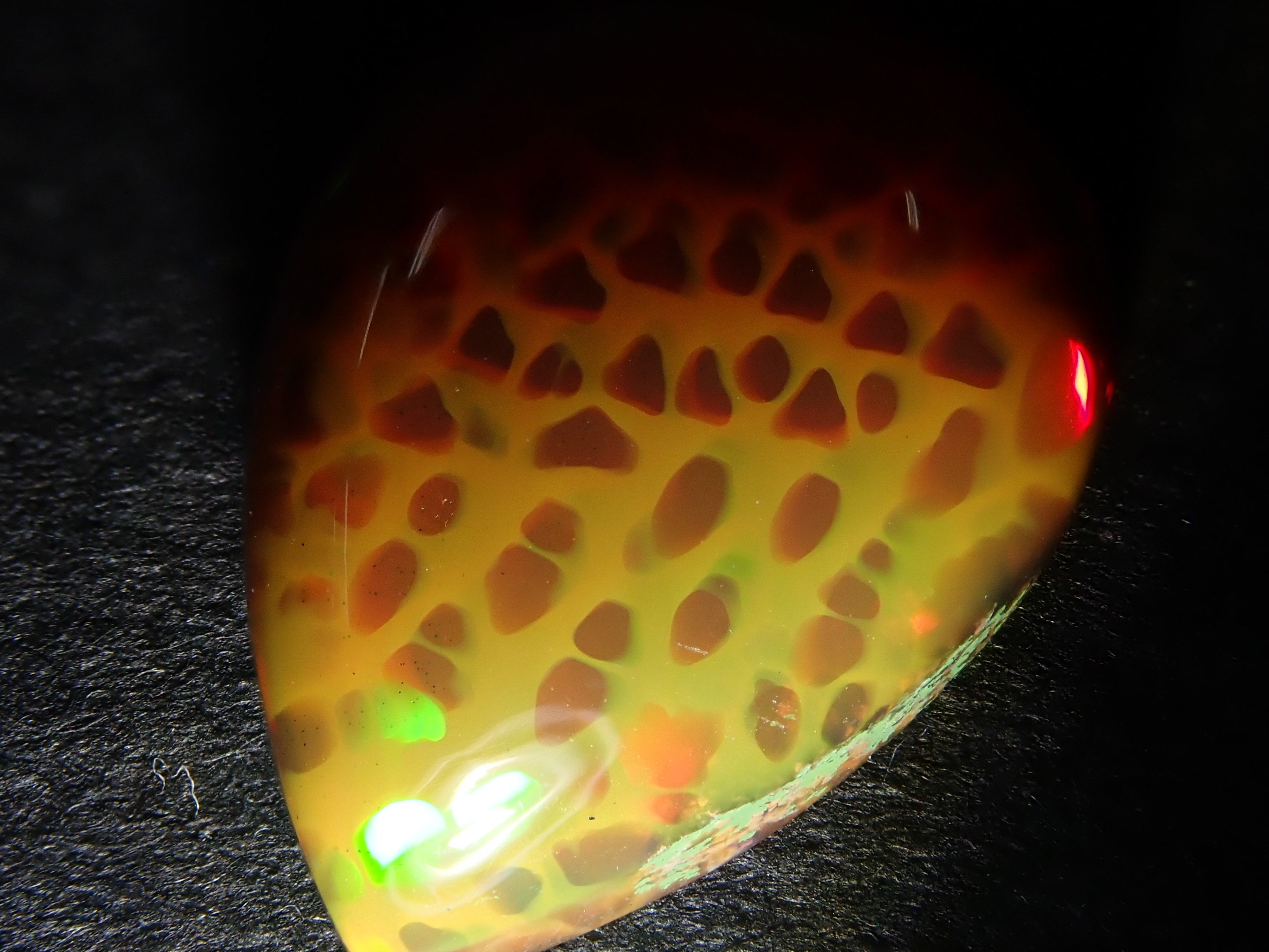蛋白石是一種閃爍著彩虹色光芒的寶石。其中,蜂窩蛋白石是具有類似蜂窩狀浮紋的蛋白石。儘管是一塊石頭,但這塊石頭卻給人一種生命活力的感覺。在所有蛋白石中,產出蜂窩蛋白石的機率很小。照片是使用筆燈拍攝的。這是一種高品質的散裝蜂窩蛋白石,具有特別美麗的圖案。