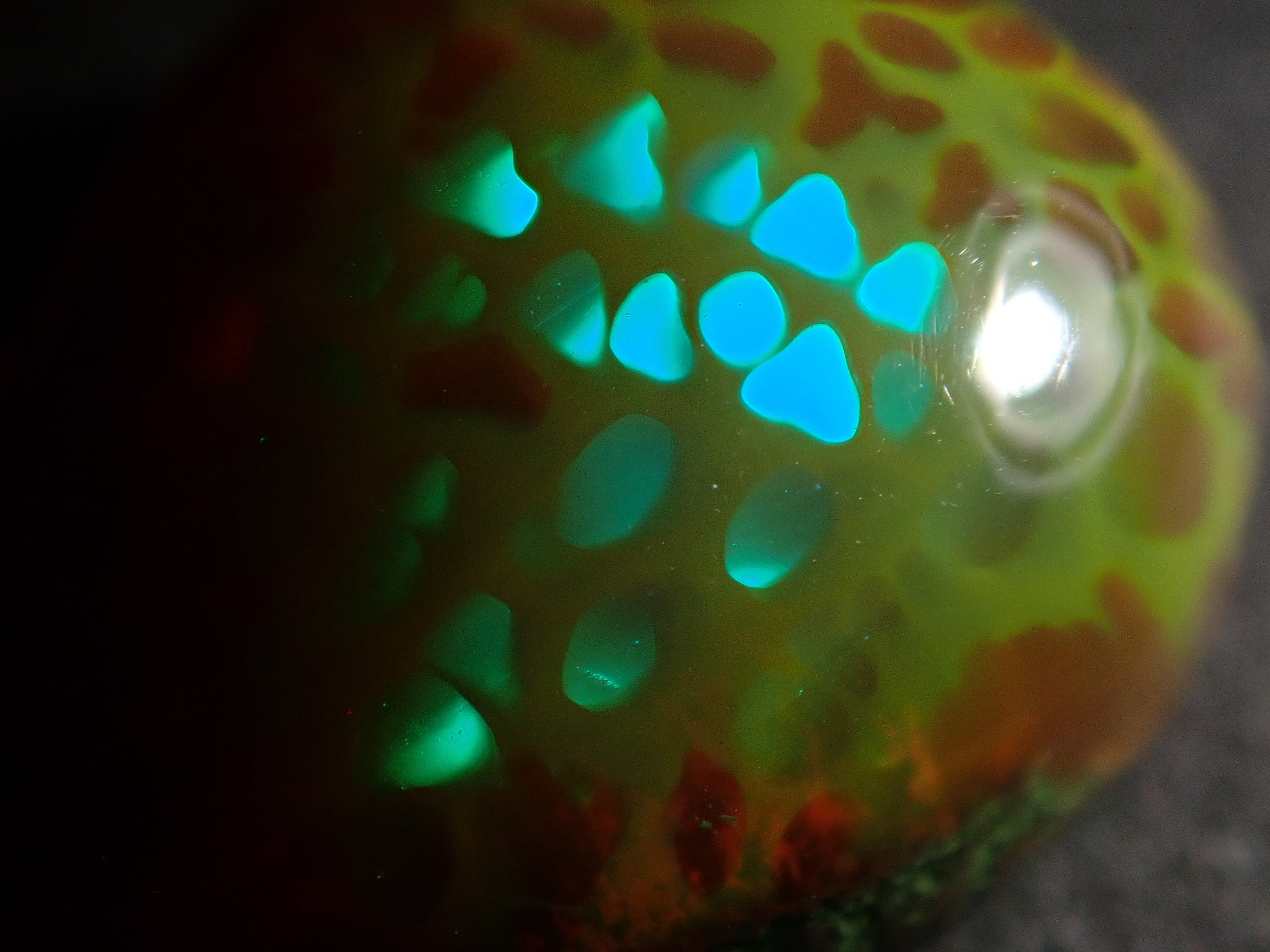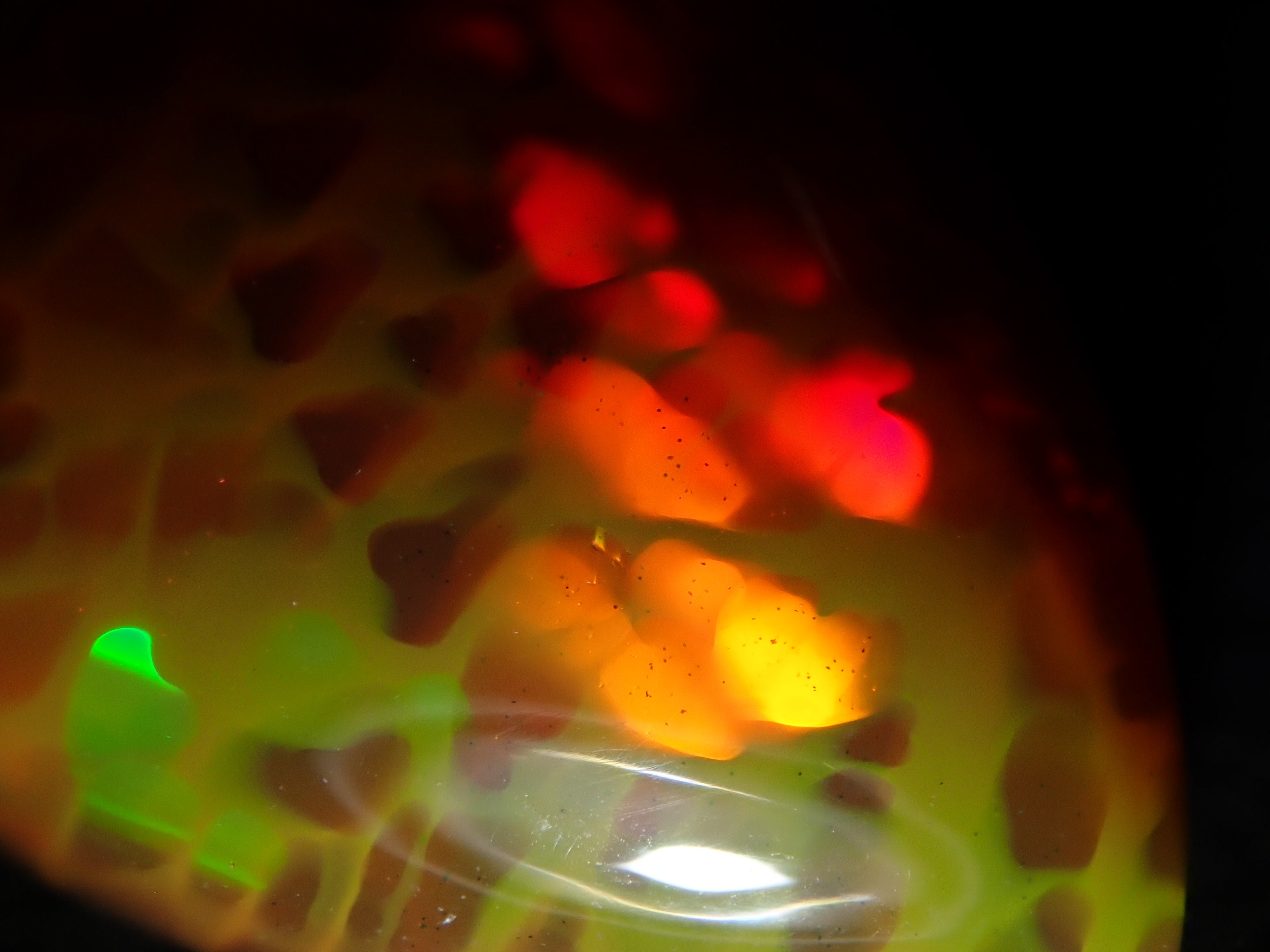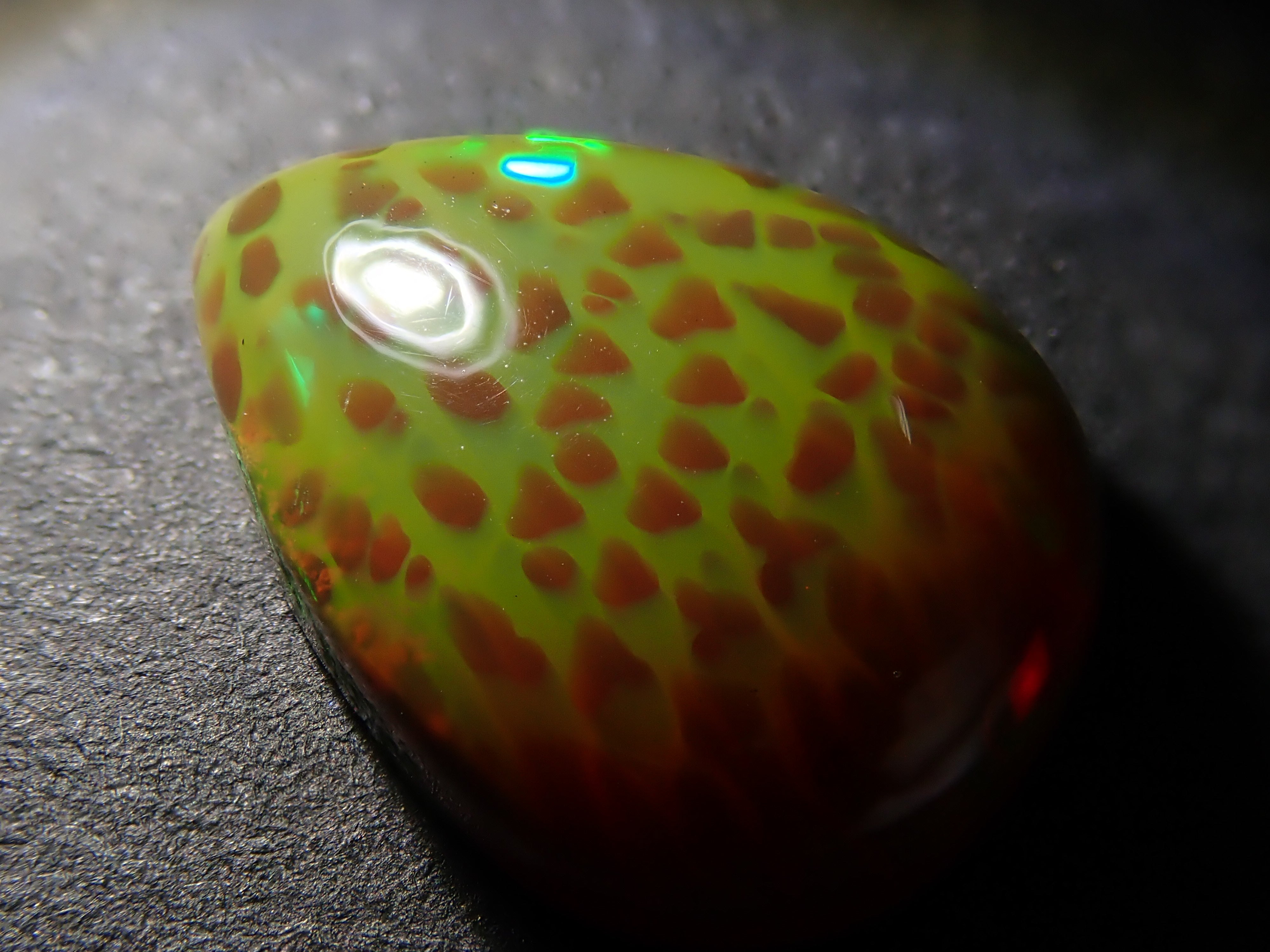 蛋白石是一種閃爍著彩虹色光芒的寶石。其中,蜂窩蛋白石是具有類似蜂窩狀浮紋的蛋白石。儘管是一塊石頭,但這塊石頭卻給人一種生命活力的感覺。在所有蛋白石中,產出蜂窩蛋白石的機率很小。照片是使用筆燈拍攝的。這是一種高品質的散裝蜂窩蛋白石,具有特別美麗的圖案。