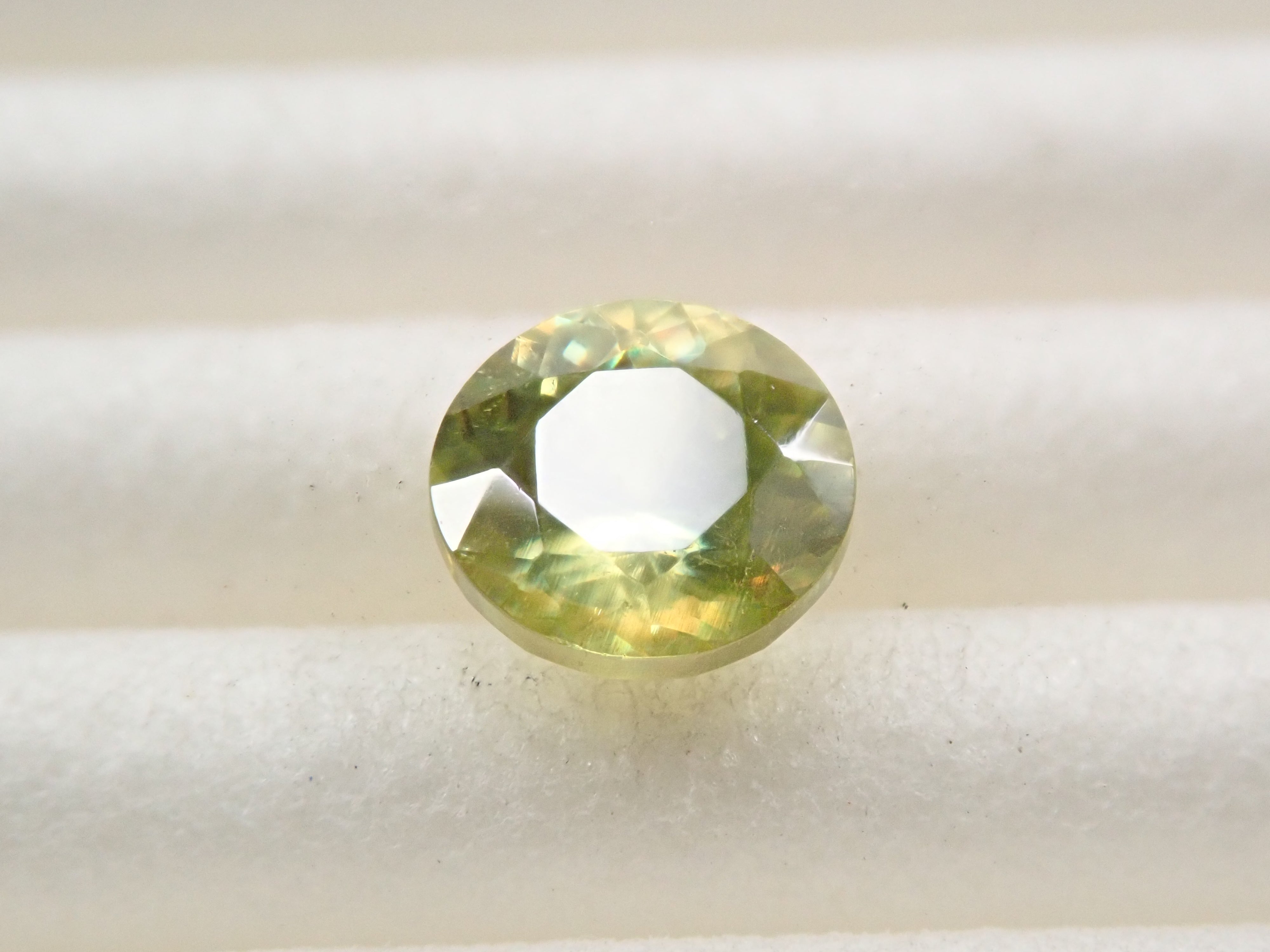 呈現出金色光芒和奢華火焰的榍石。它作為一種有吸引力的寶石而受到收藏家的歡迎,它散發出比鑽石更強大的火彩。輝度隨角度而快速變化的榍石。請在陽光下在手中滾動並觀察。請注意,有些照片是使用筆燈拍攝的。 圓形切割 4.9 毫米高品質馬達加斯加榧石 0.569 克拉,透明度高。還可以享受營火的樂趣。