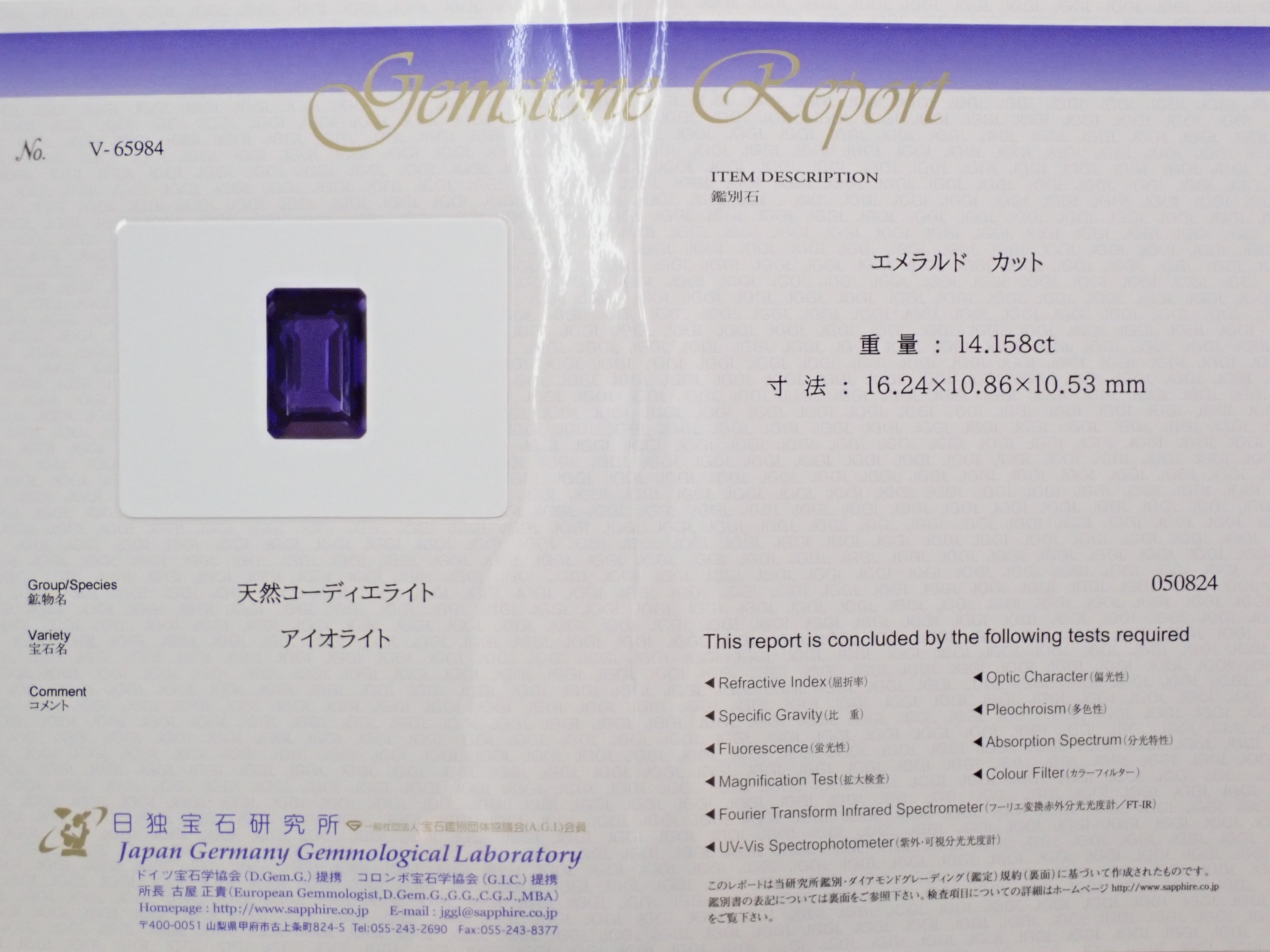 它是一顆 14 克拉大小的大型寶石級堇青石。此堇青石透明度高,品質優良,粒徑大,分佈量小。