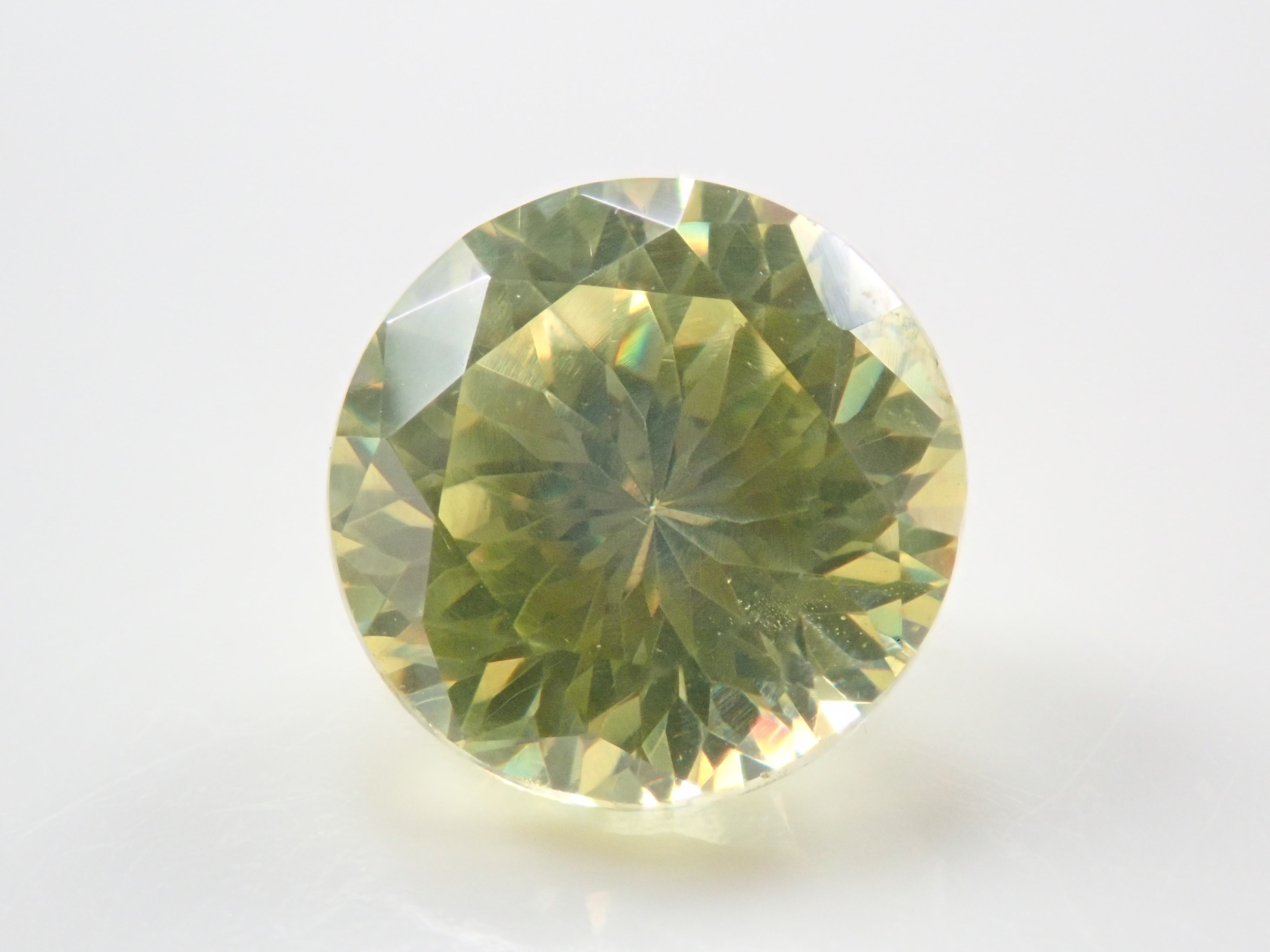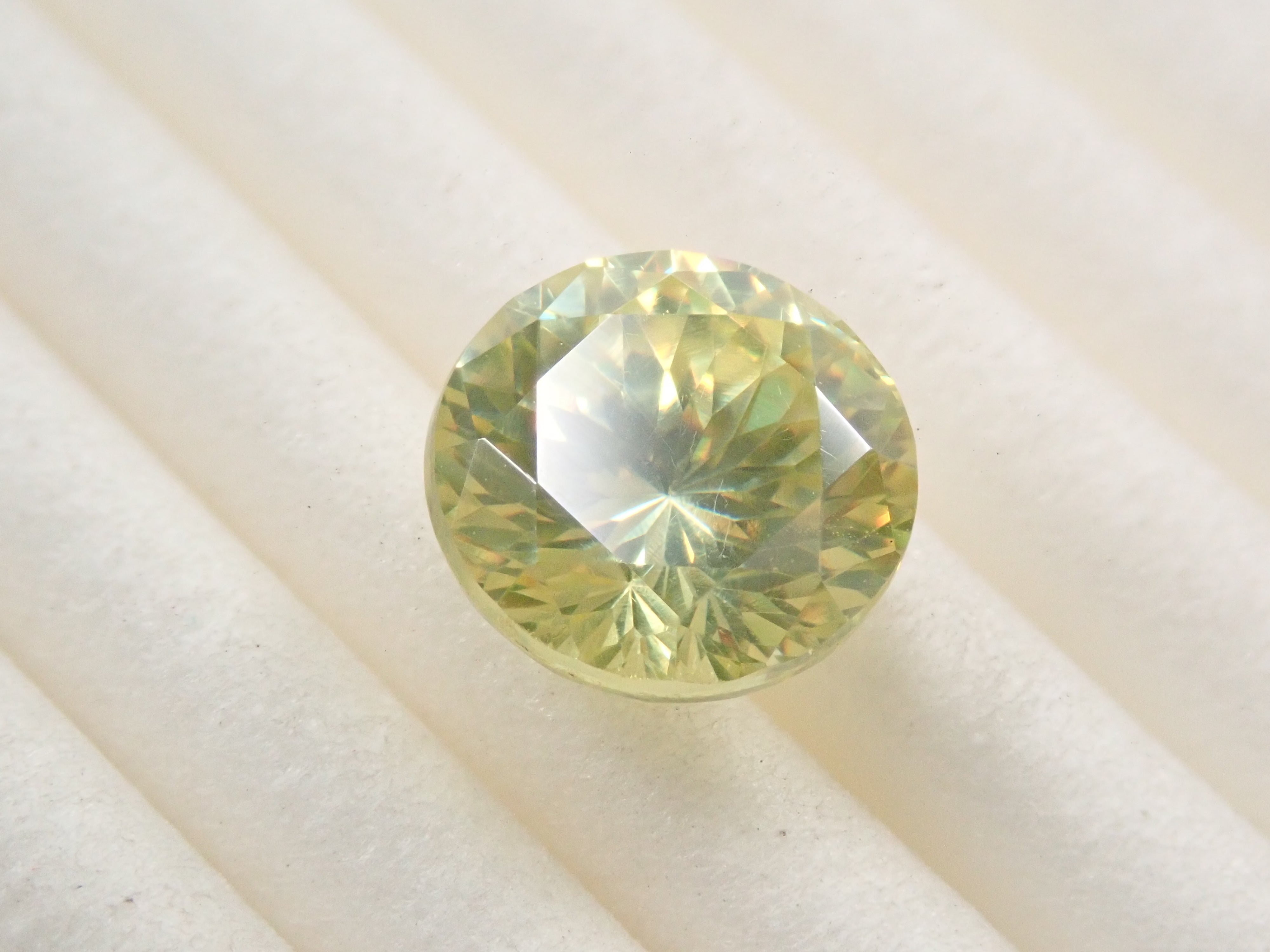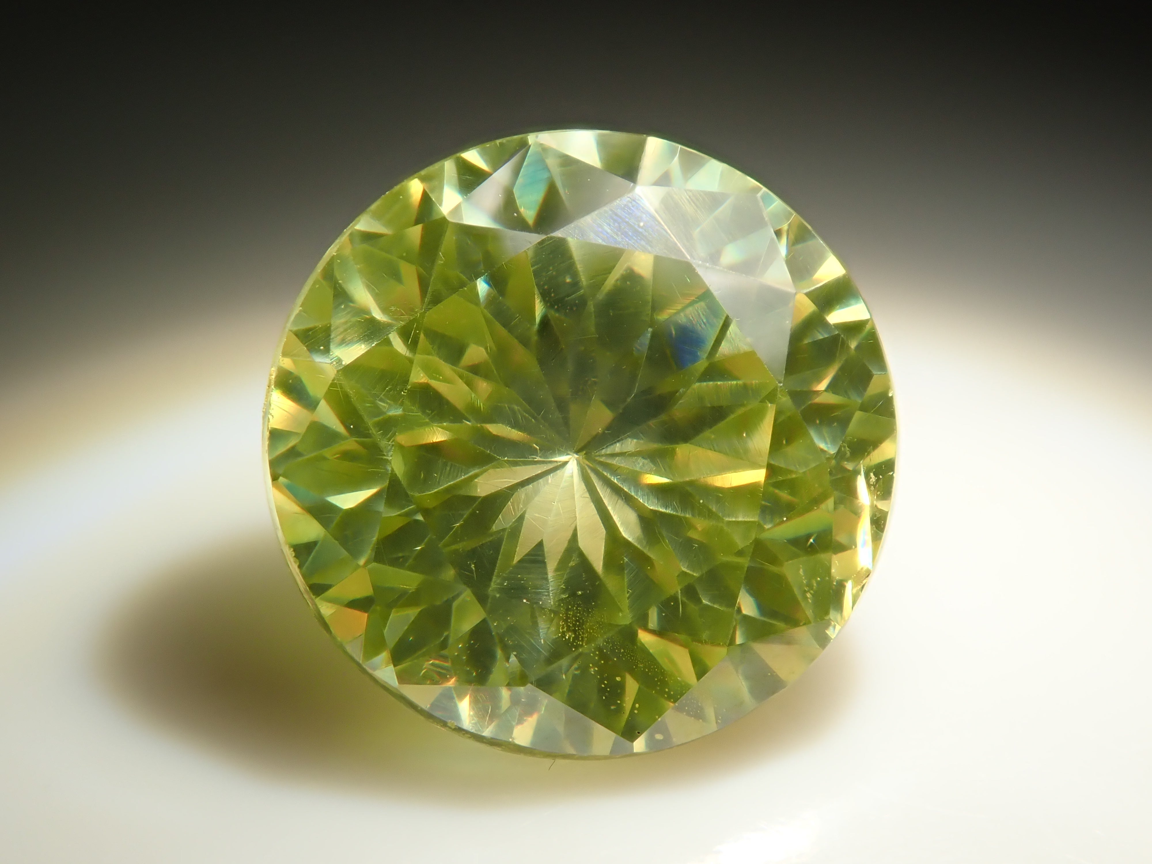閃鋅礦的色散率接近鑽石的四倍,並呈現出絢麗的火光。據說是流通量很小、市場上數量不多的稀有寶石之一。底色有黃、橙、綠等,在火中可以欣賞到黃、棕、橙、紅、綠等各種顏色。 來自西班牙的圓形切割閃鋅礦 7.6 毫米/2.374 克拉裸石。這是一種優質的綠黃色閃鋅礦。