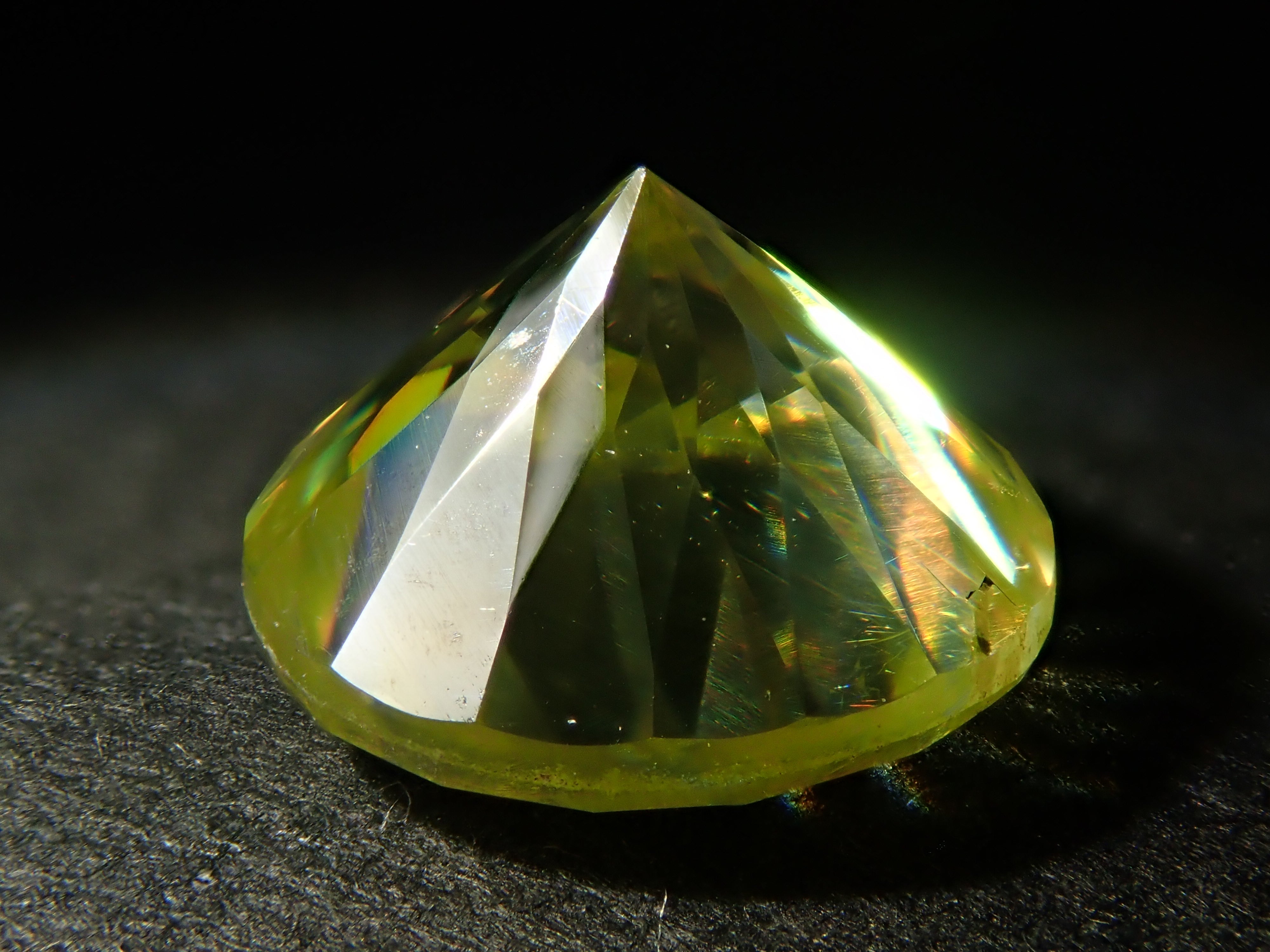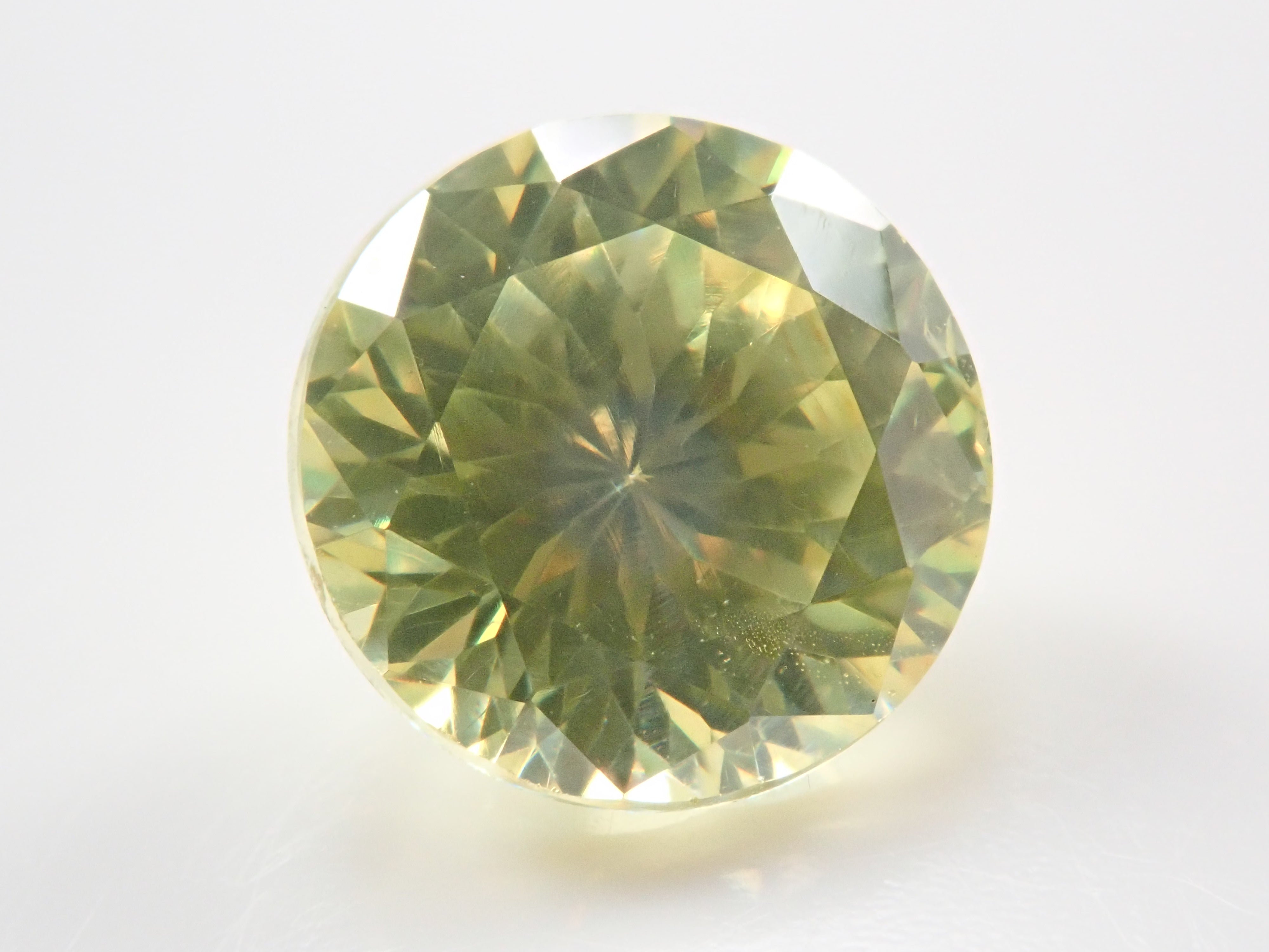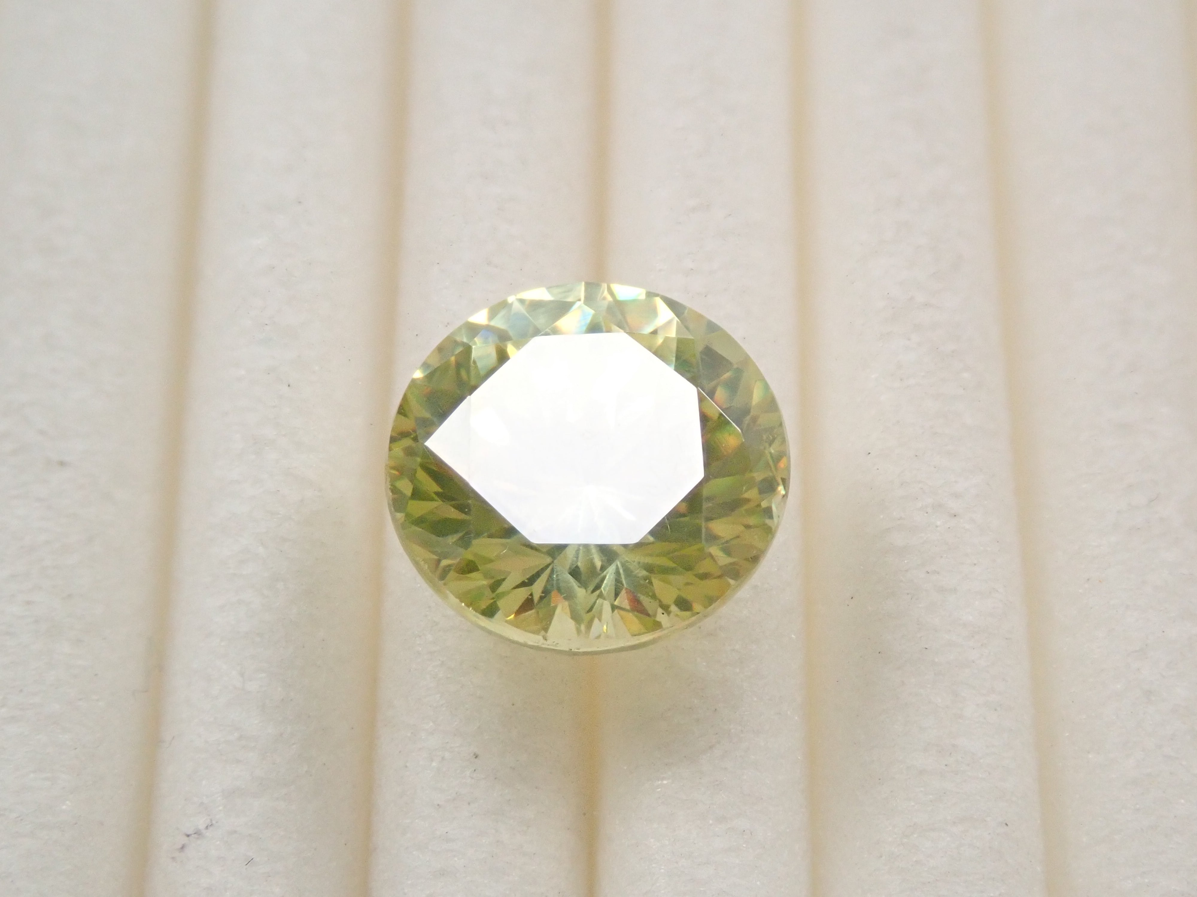 閃鋅礦的色散率接近鑽石的四倍,並呈現出絢麗的火光。據說是流通量很小、市場上數量不多的稀有寶石之一。底色有黃、橙、綠等,在火中可以欣賞到黃、棕、橙、紅、綠等各種顏色。 來自西班牙的圓形切割閃鋅礦 7.6 毫米/2.374 克拉裸石。這是一種優質的綠黃色閃鋅礦。