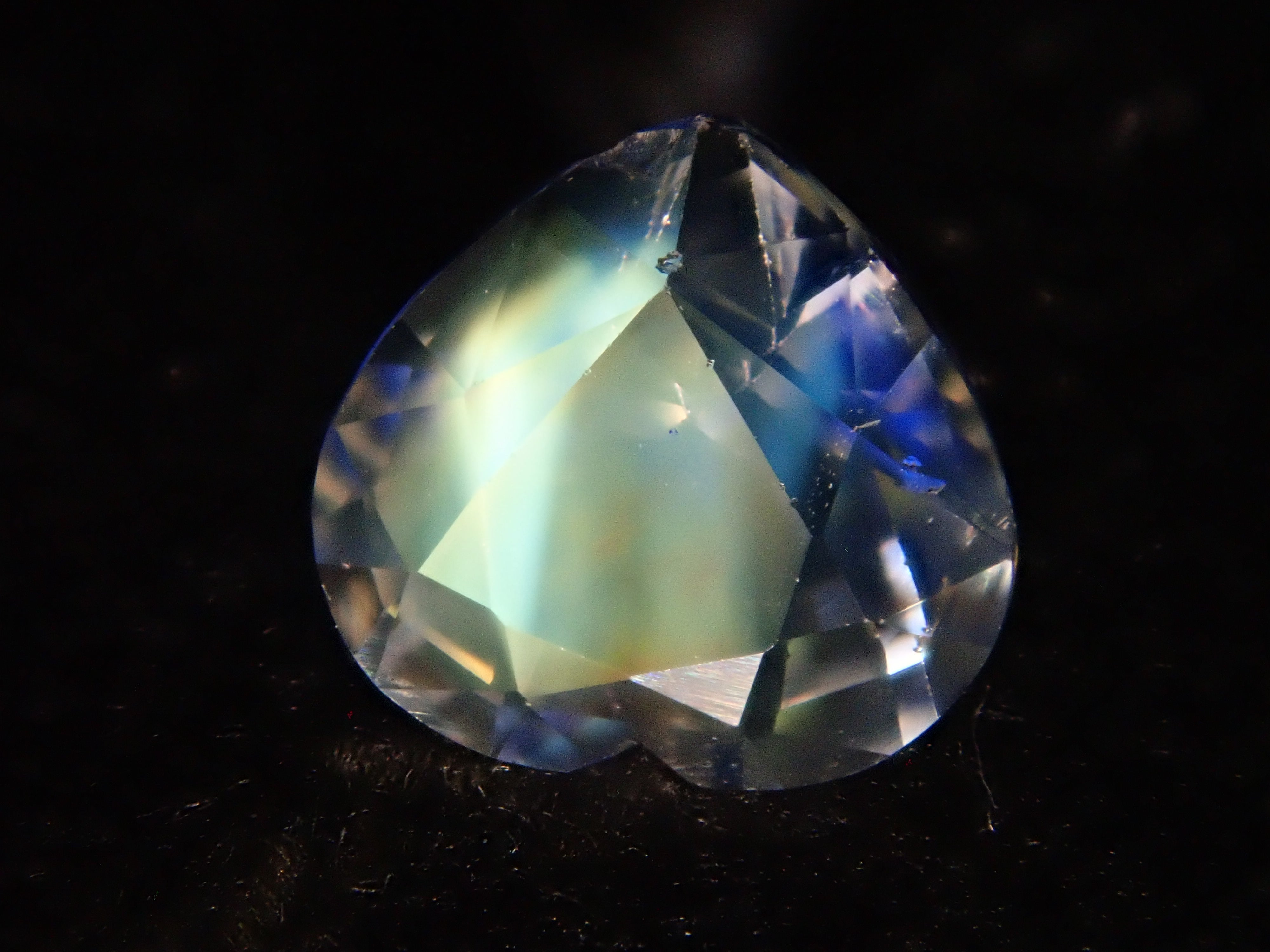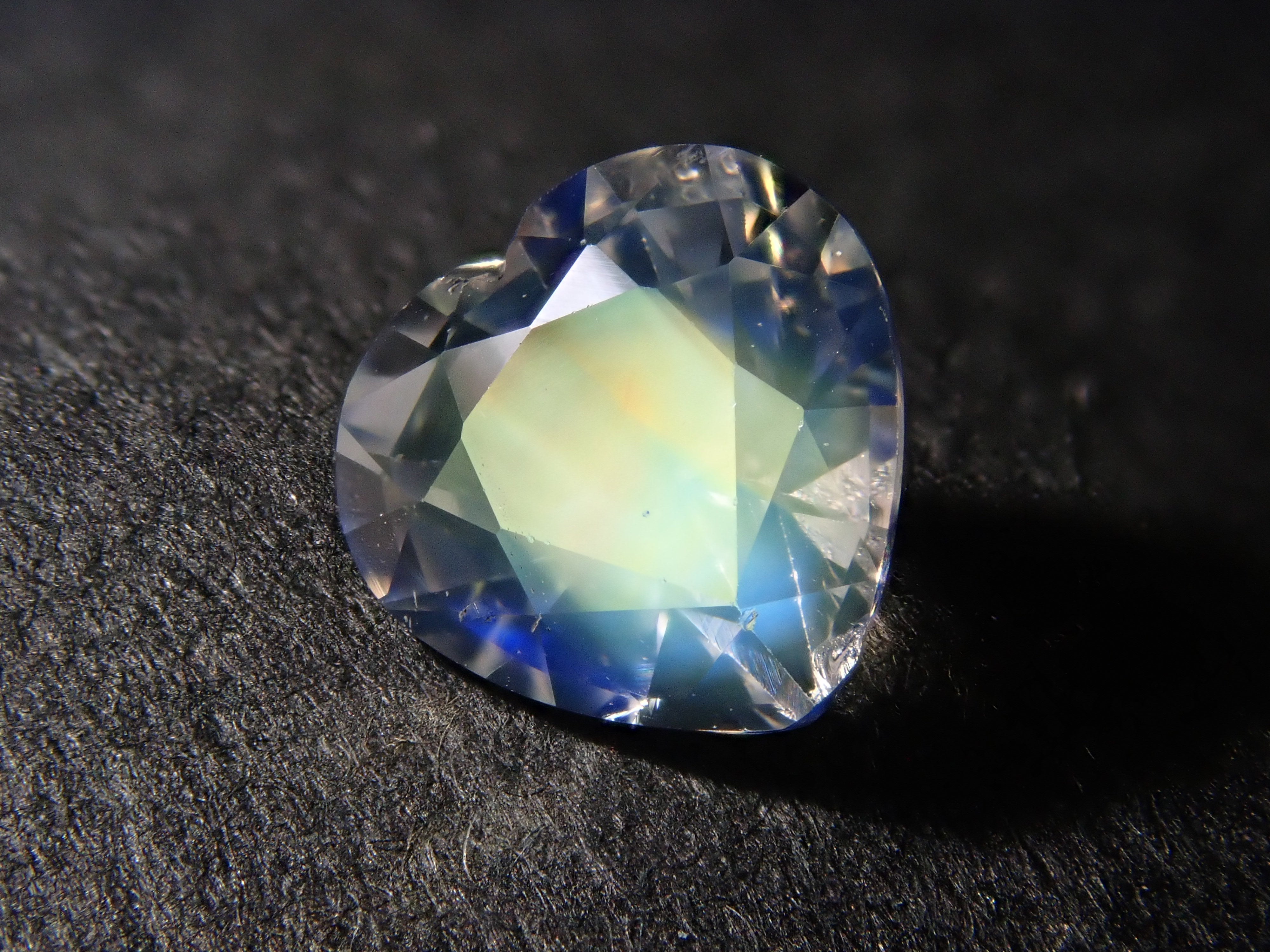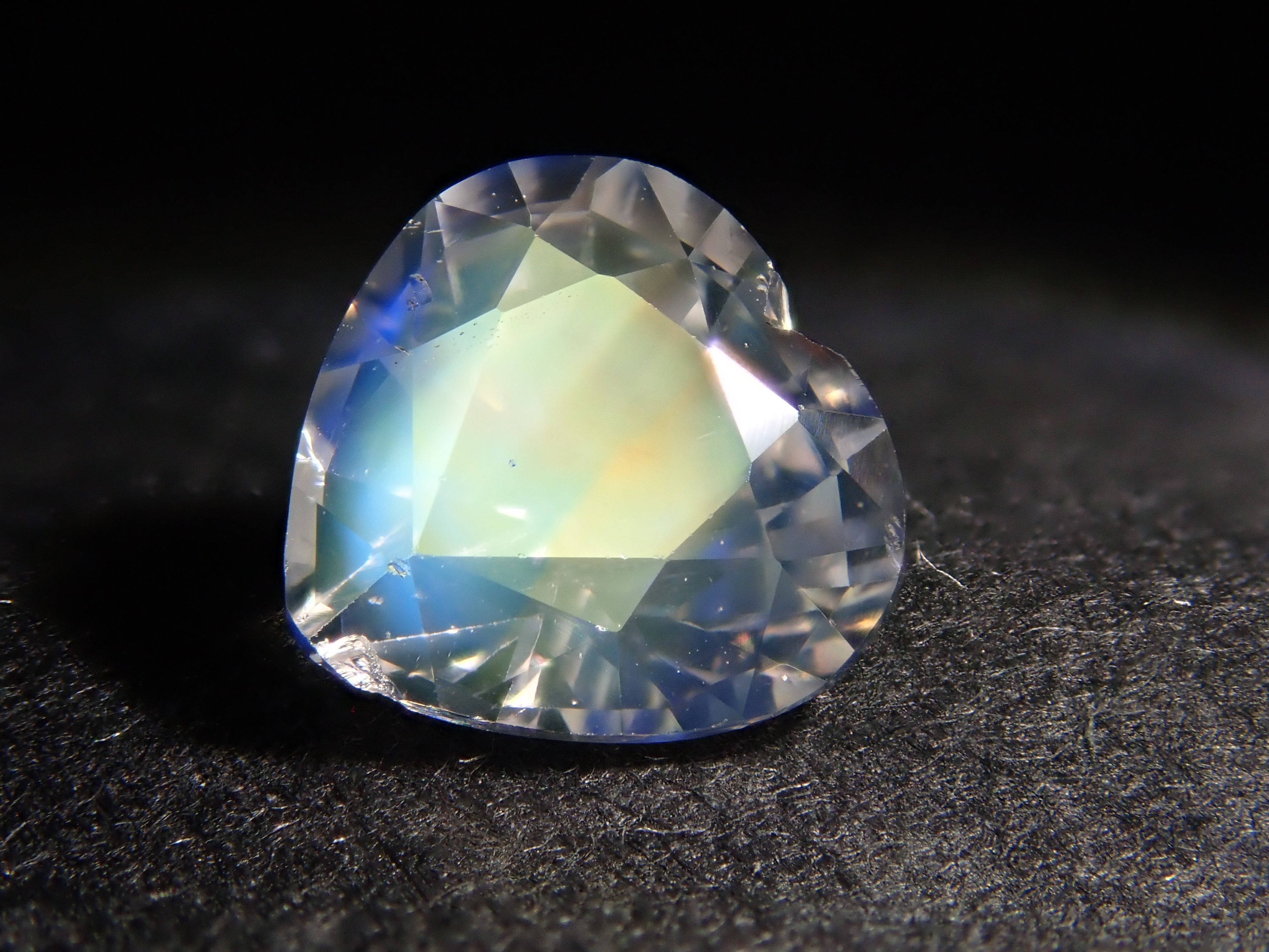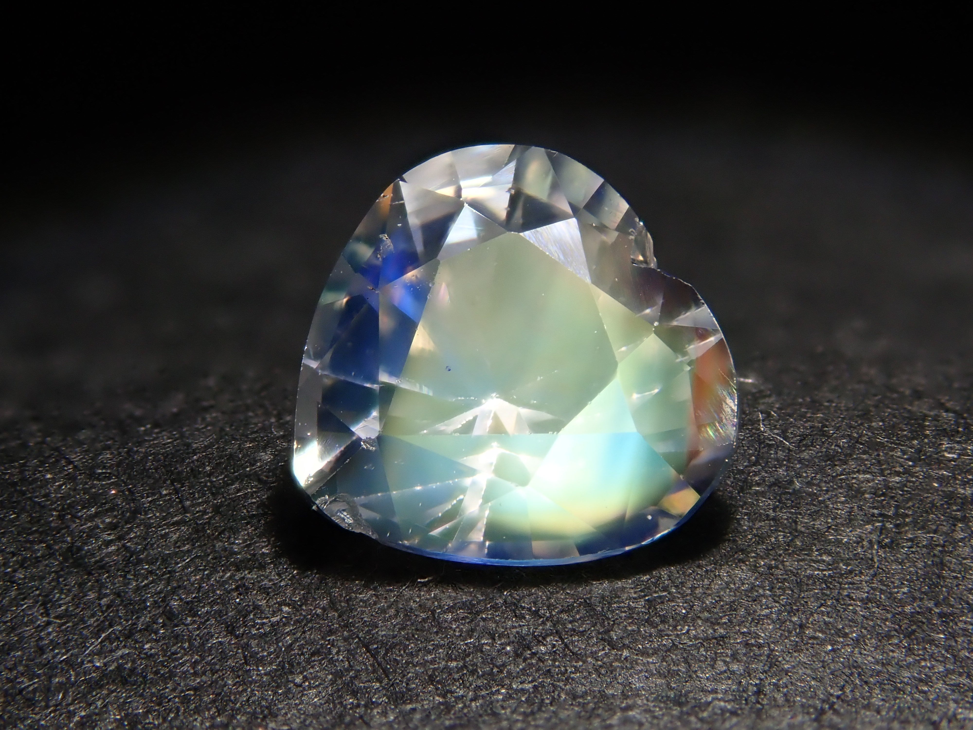 它是一種位於中長石和拉長石之間的寶石,它們屬於同一斜長石族。閃閃發光的彩虹色光學效果是如此神秘,讓您想永遠看著它。產自馬達加斯加的心形安山長石拉長石(俗稱彩虹月光石),裸石 0.585 克拉,在這裡您可以充分享受席勒效應。