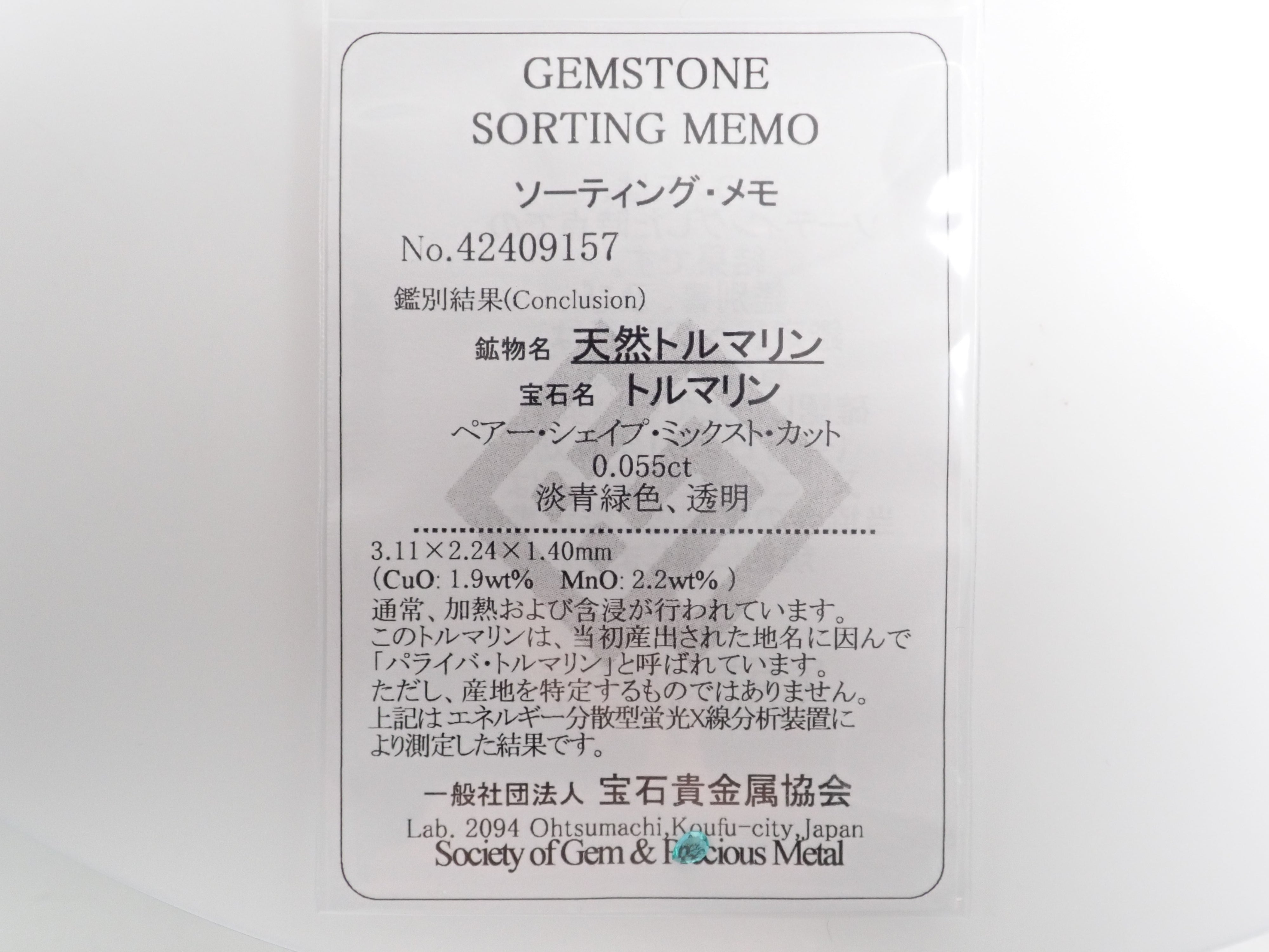 這是優質未經加熱的巴西帕拉伊巴碧璽,透明度高,色彩鮮豔。來自巴西的帕拉伊巴碧璽,含 CuO:1.9%,MnO:2.2%。包括日本珠寶和貴金屬協會的分類資訊。國內鑑定機構無法對該顏色的帕拉伊巴碧璽出具非加熱報告,因此在分選過程中通常將其列為加熱的。