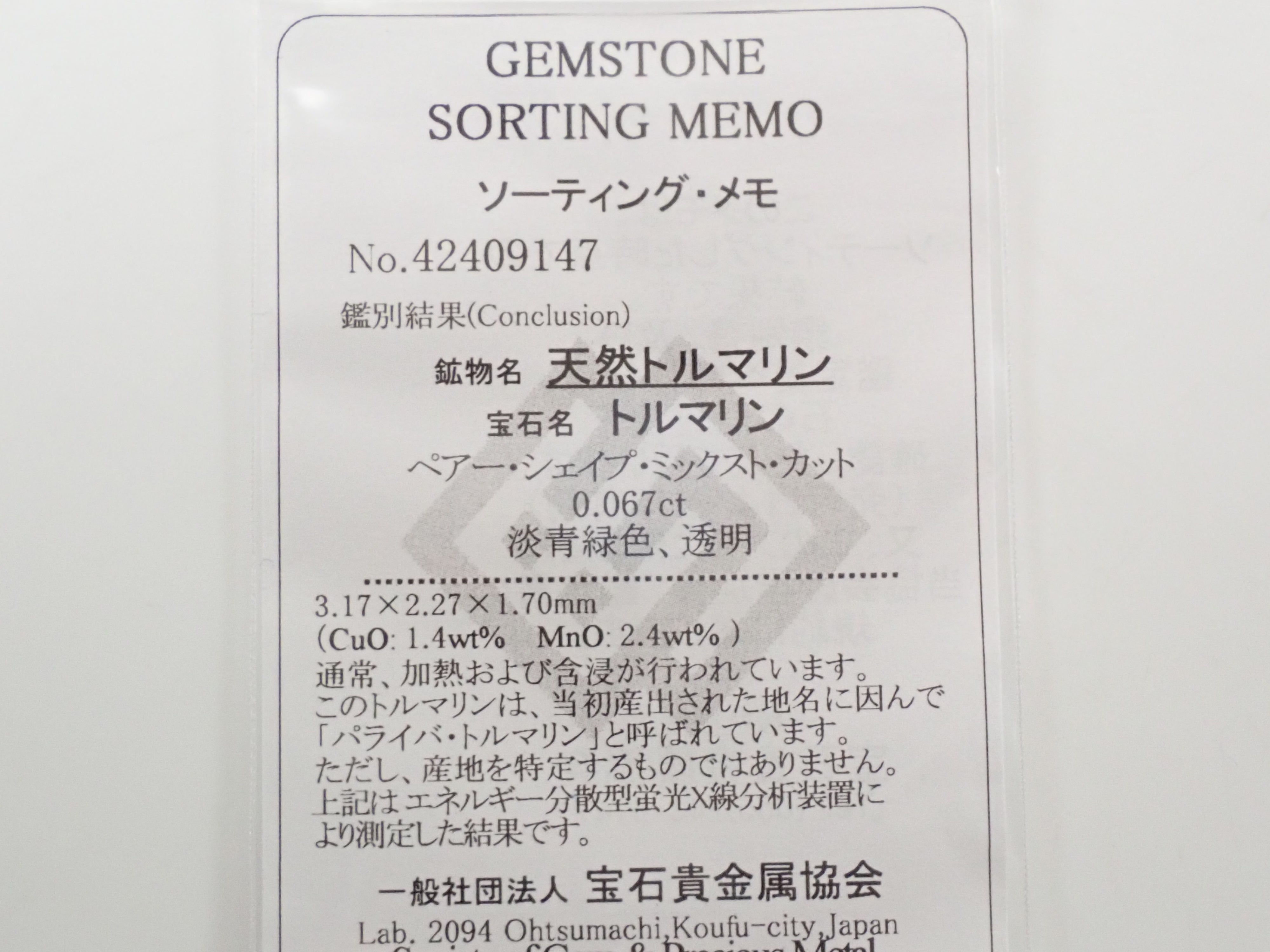 這是優質未經加熱的巴西帕拉伊巴碧璽,透明度高,色彩鮮豔。來自巴西的帕拉伊巴碧璽,含 CuO:1.4%,MnO:2.4%。包括來自珠寶和貴金屬協會的分類資訊。國內鑑定機構無法對該顏色的帕拉伊巴碧璽出具非加熱報告,因此在分選過程中通常將其列為加熱的。