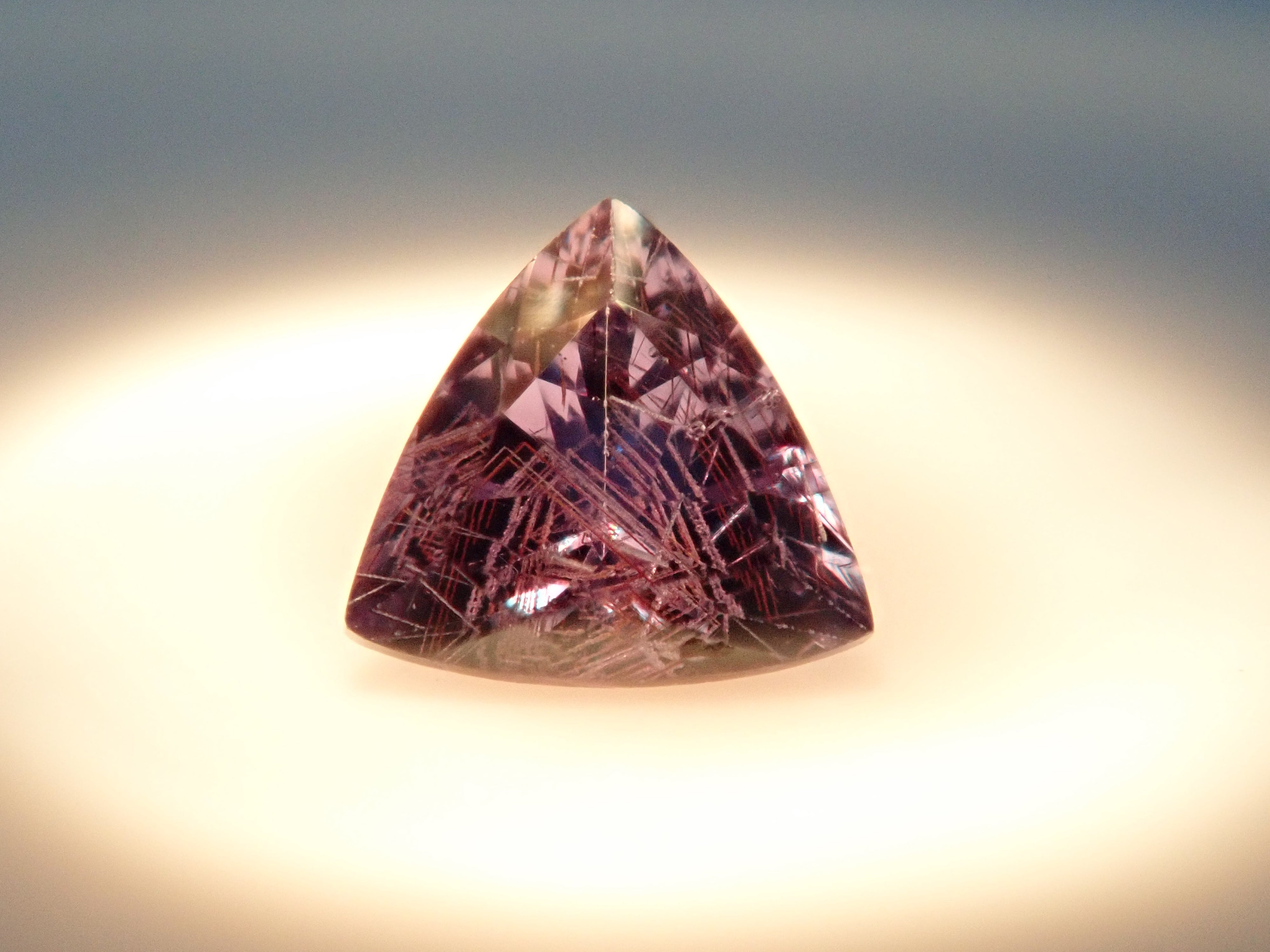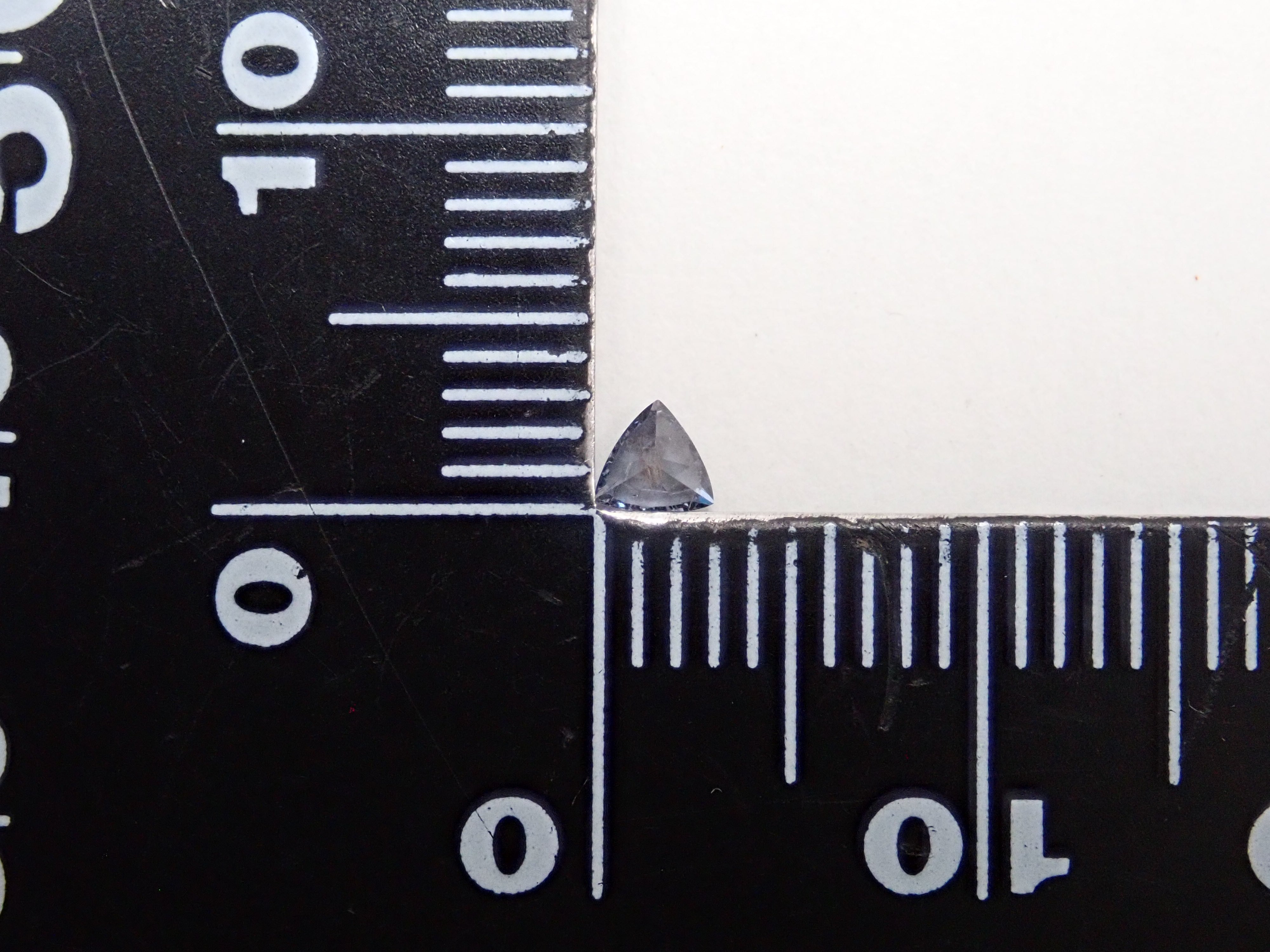 石榴石以一月生日石而聞名。它是標準寶石之一。不過這種會變色的石榴石在市場上並不常見,所以很多人可能都以為石榴石是可以變色的。這是一種相對罕見的石榴石,稱為貝基利藍石榴石,呈現藍色。請使用紅色變色筆燈欣賞變色效果。貝基利藍石榴石(變色石榴石)0.106 克拉裸石,您可以欣賞到貝基利藍石榴石特有的針狀內含物。