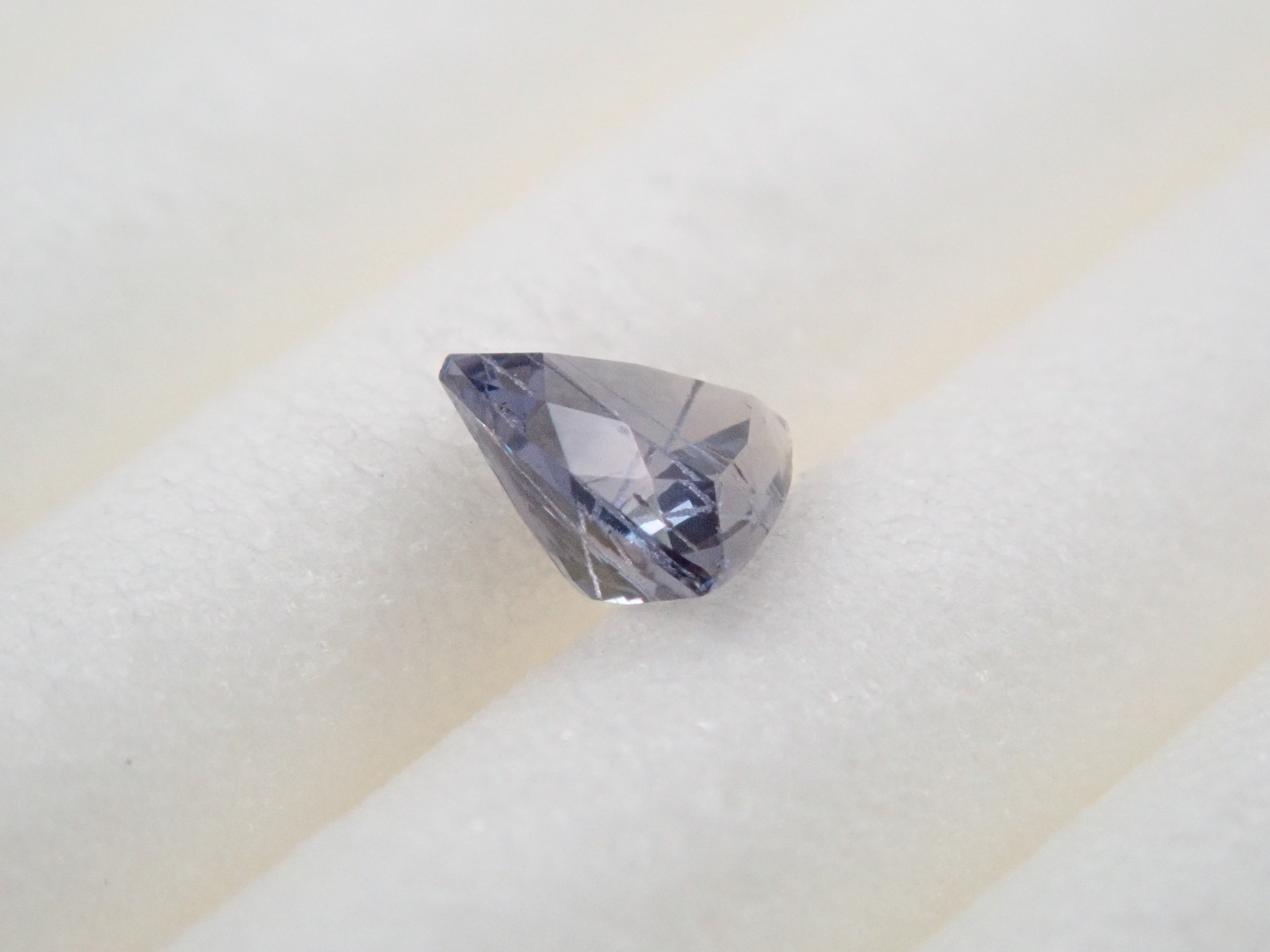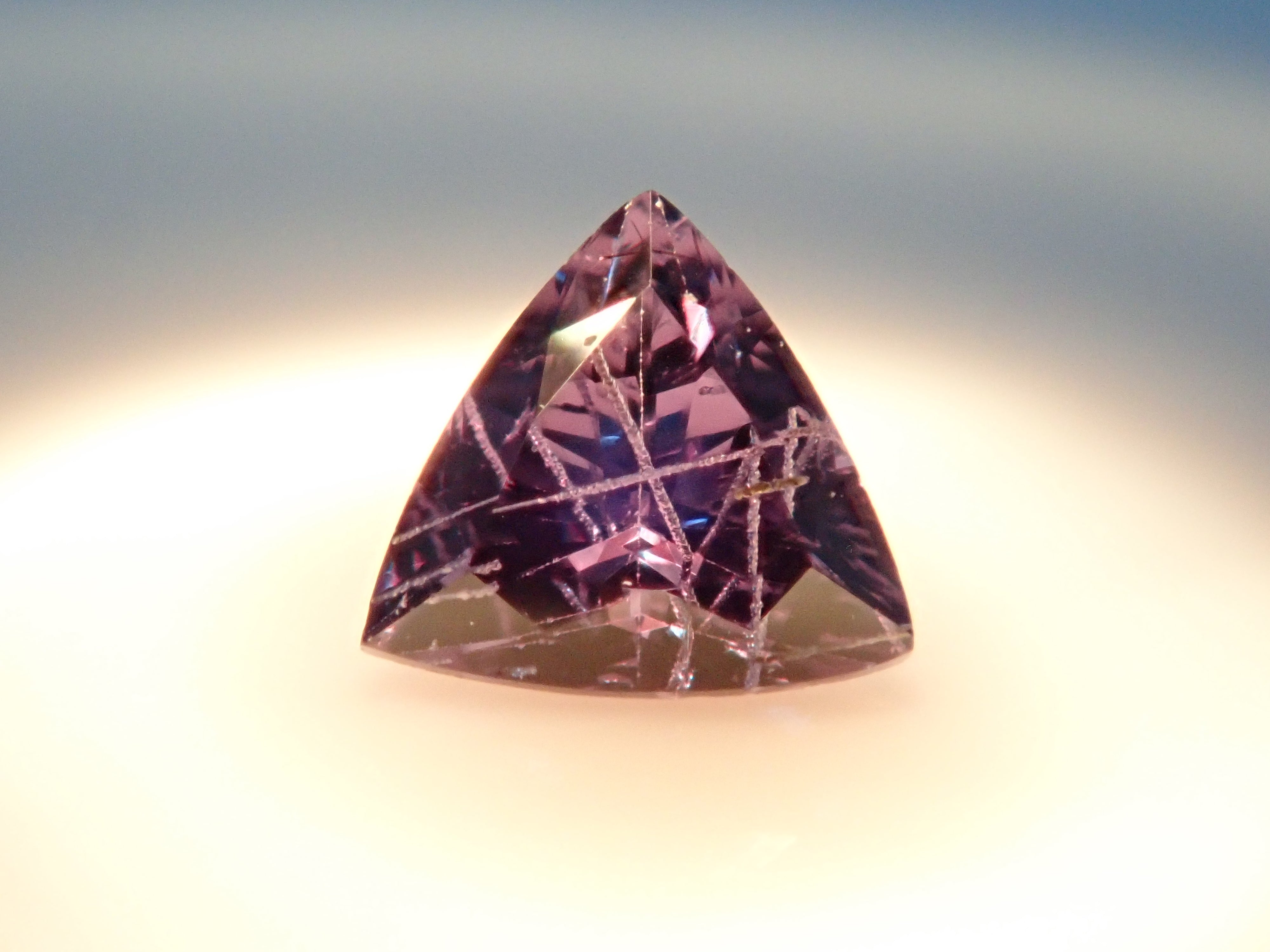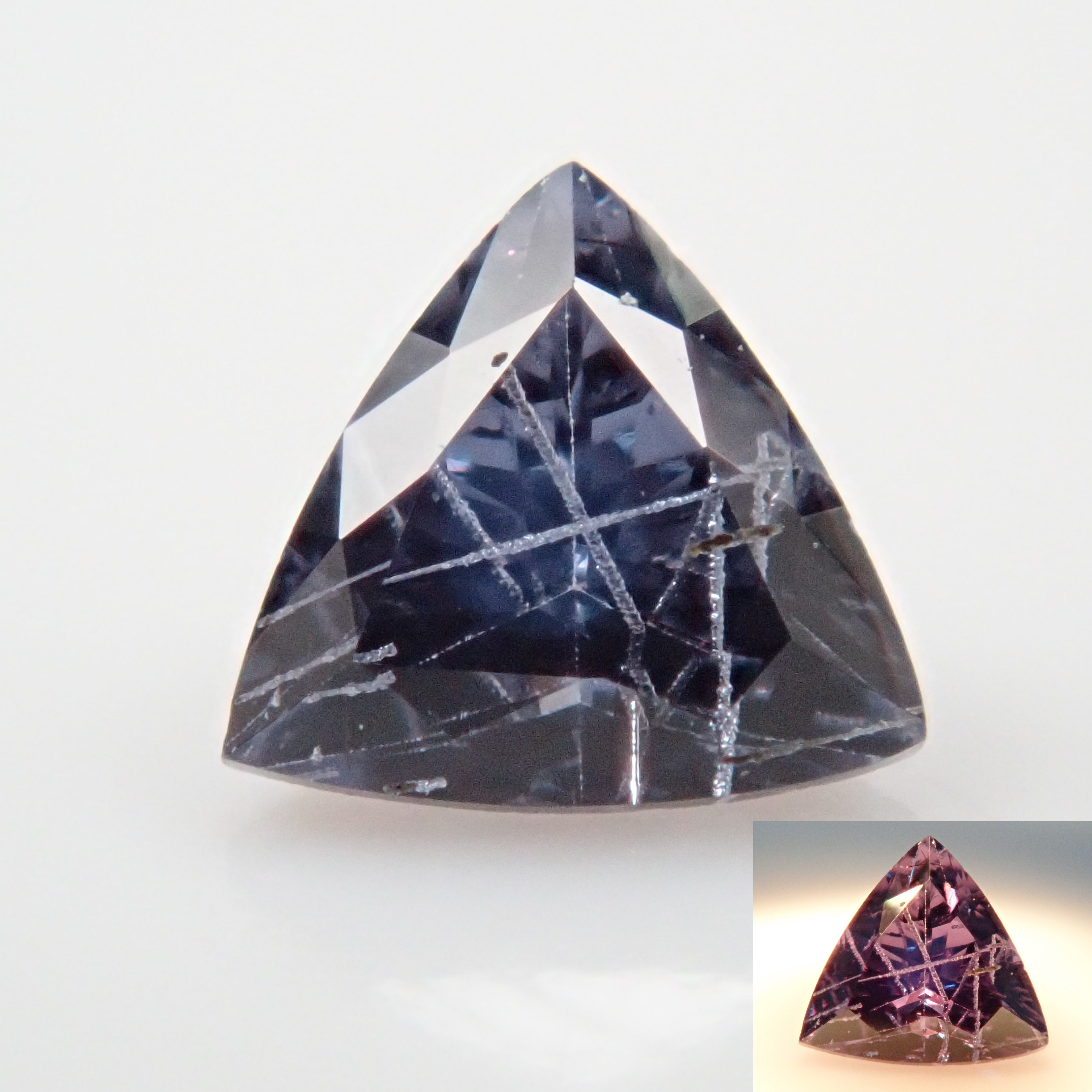 石榴石以一月生日石而聞名。它是標準寶石之一。不過這種會變色的石榴石在市場上並不常見,所以很多人可能都以為石榴石是可以變色的。這是一種相對罕見的石榴石,稱為貝基利藍石榴石,呈現藍色。請使用紅色變色筆燈欣賞變色效果。貝基利藍石榴石(變色石榴石)0.114 克拉裸石,您可以欣賞到貝基利藍石榴石特有的針狀內含物。
