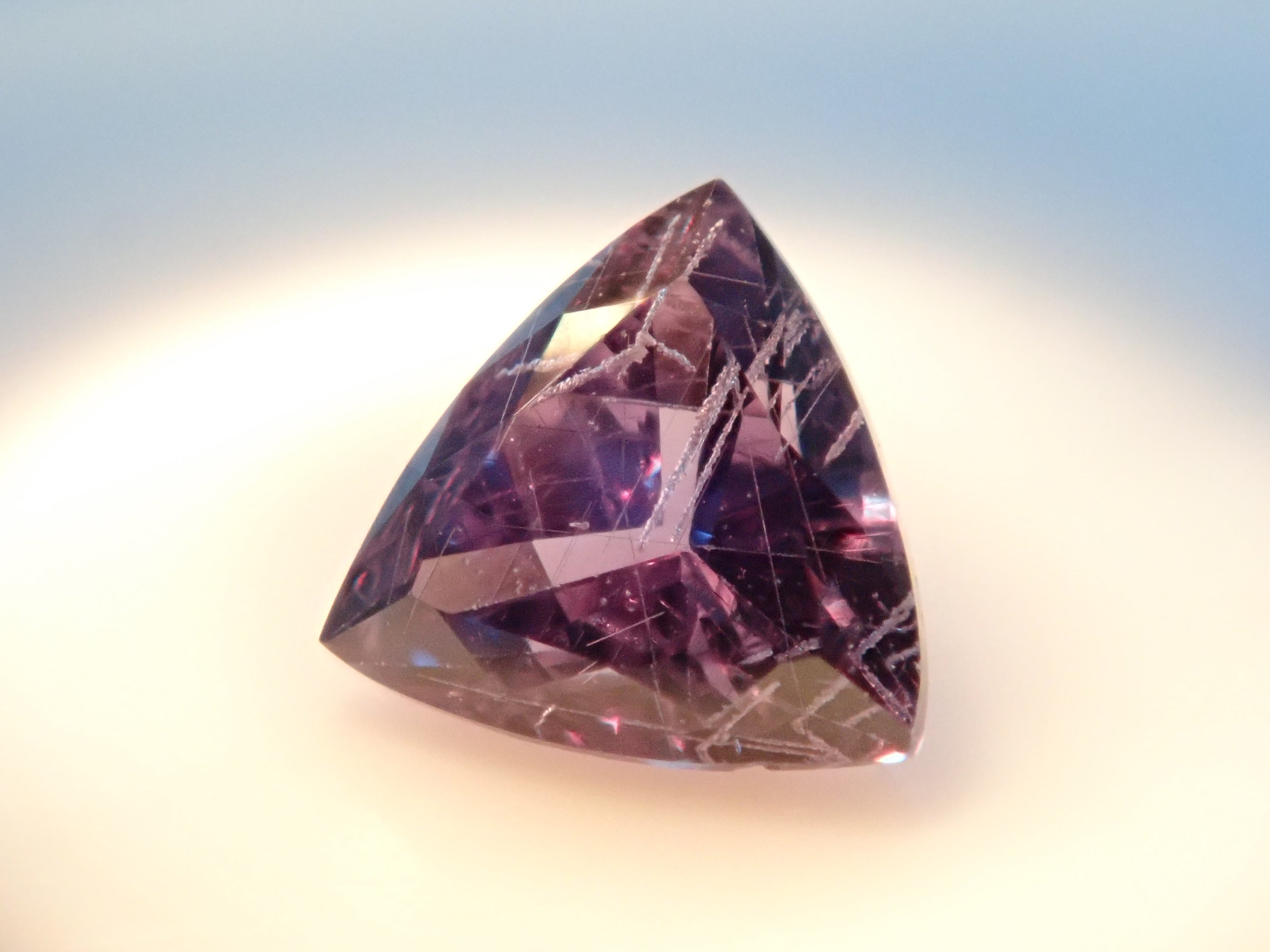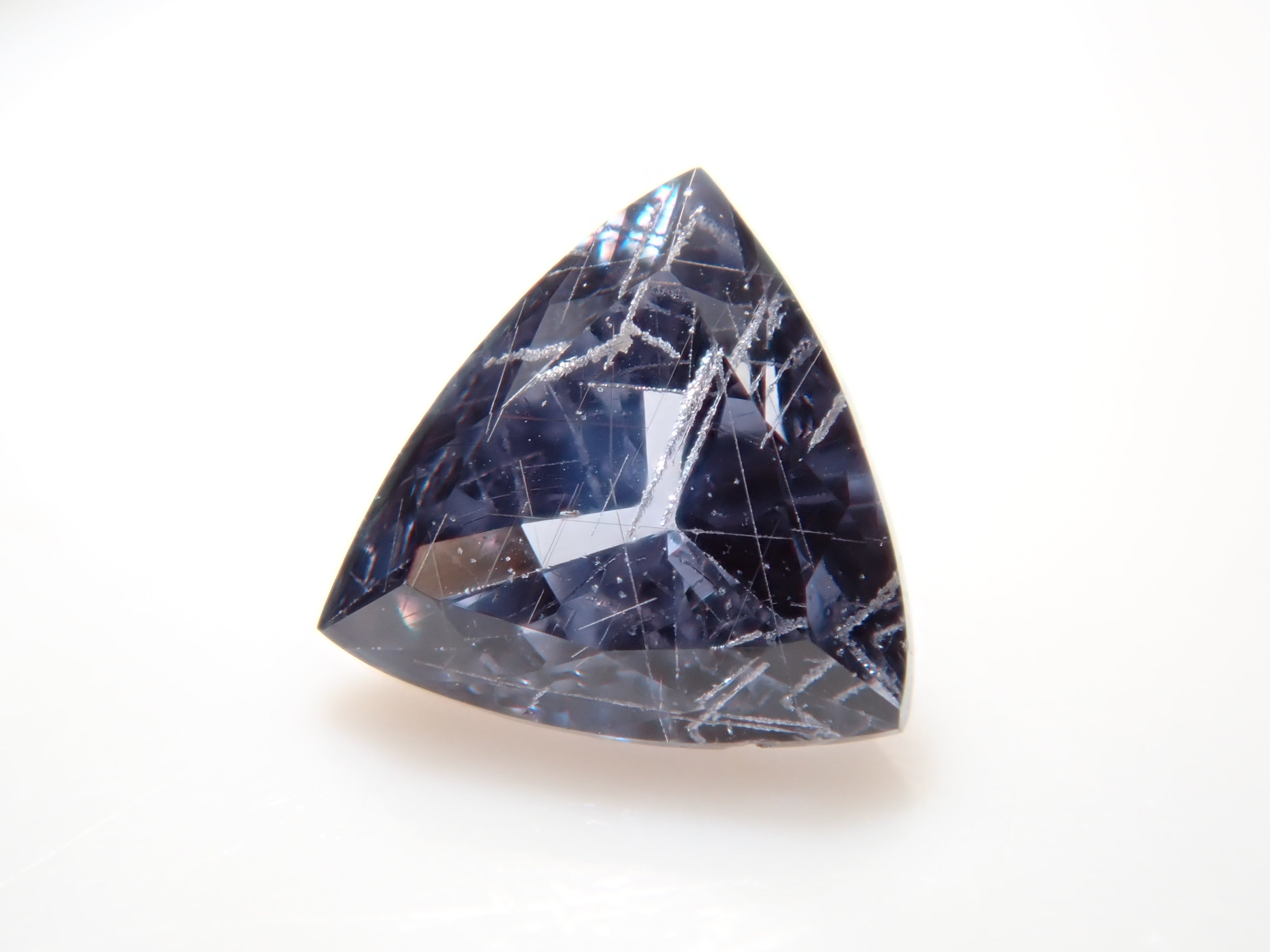 石榴石以一月生日石而聞名。它是標準寶石之一。不過這種會變色的石榴石在市場上並不常見,所以很多人可能都以為石榴石是可以變色的。這是一種相對罕見的石榴石,稱為貝基利藍石榴石,呈現藍色。請使用紅色變色筆燈欣賞變色效果。一塊鬆散的石榴石,帶有貝基利藍石榴石特有的針狀內含物。