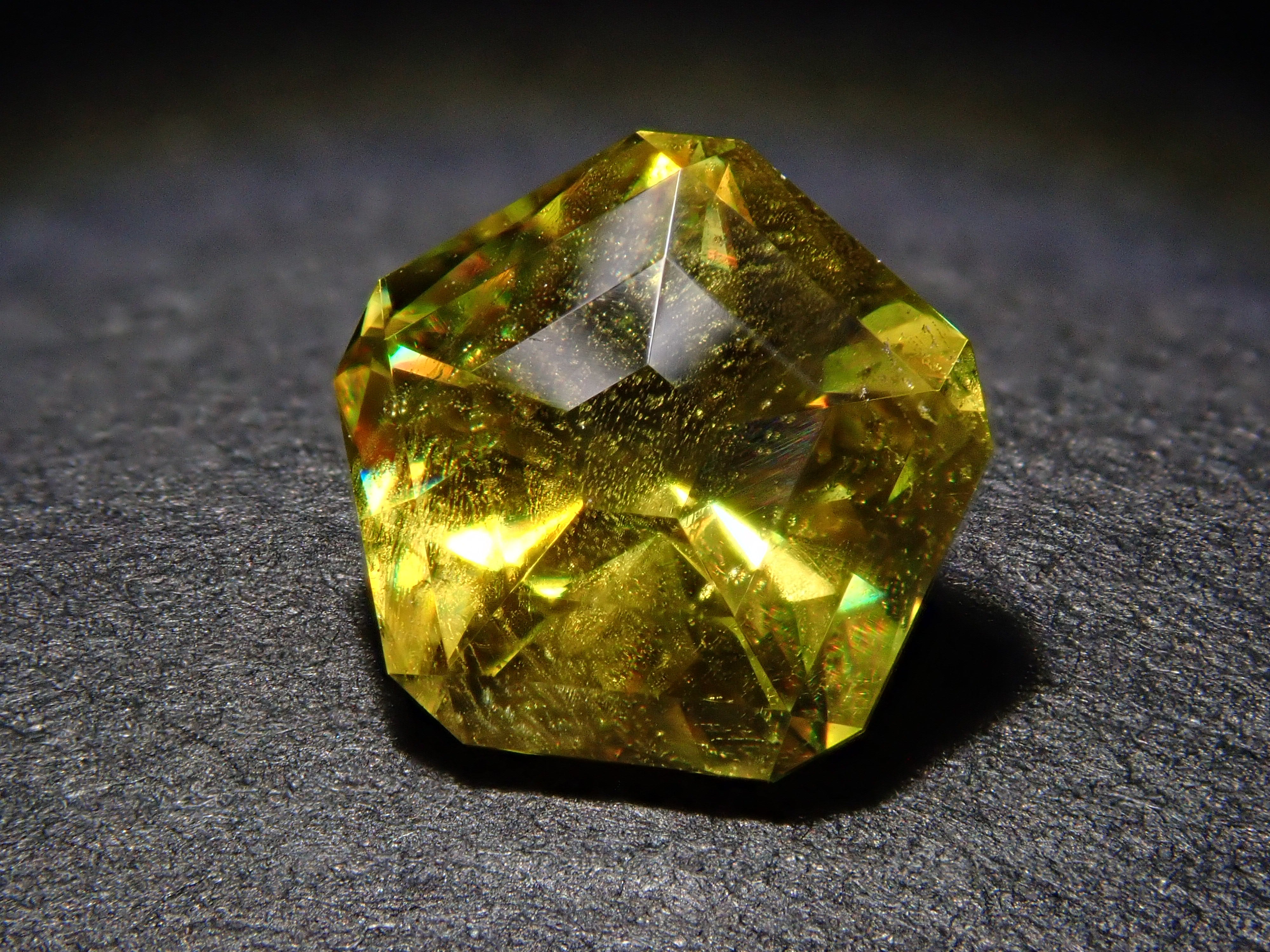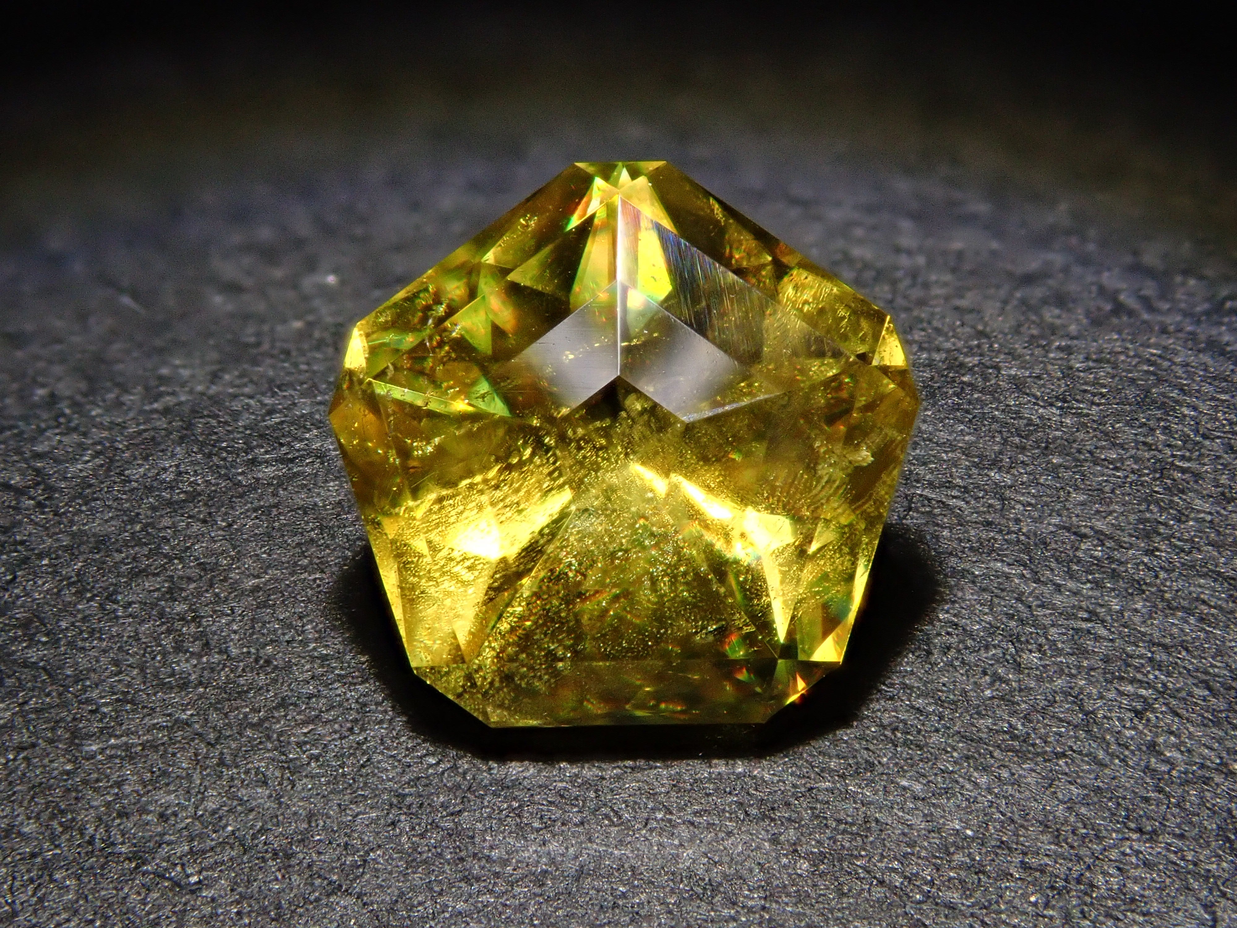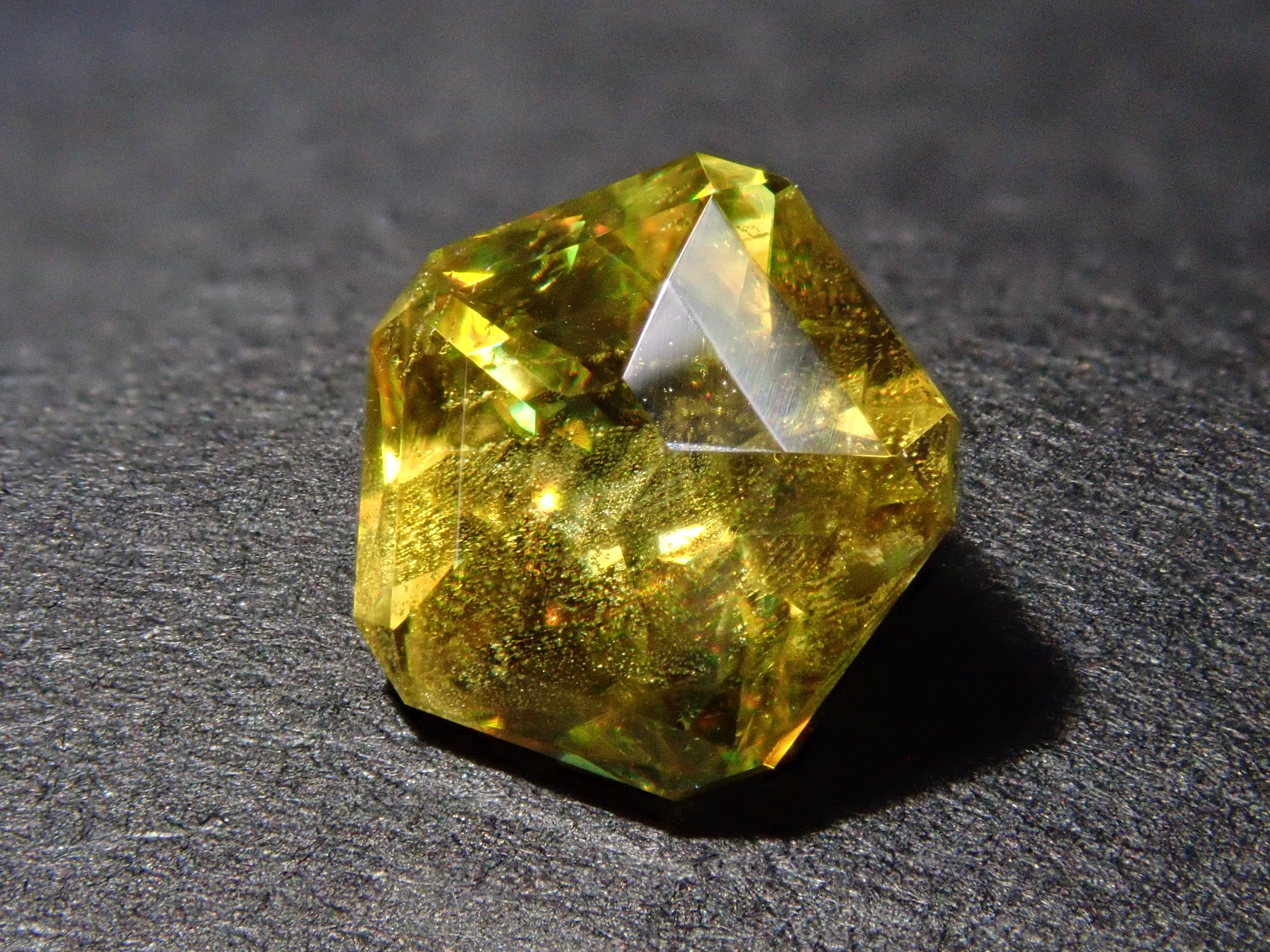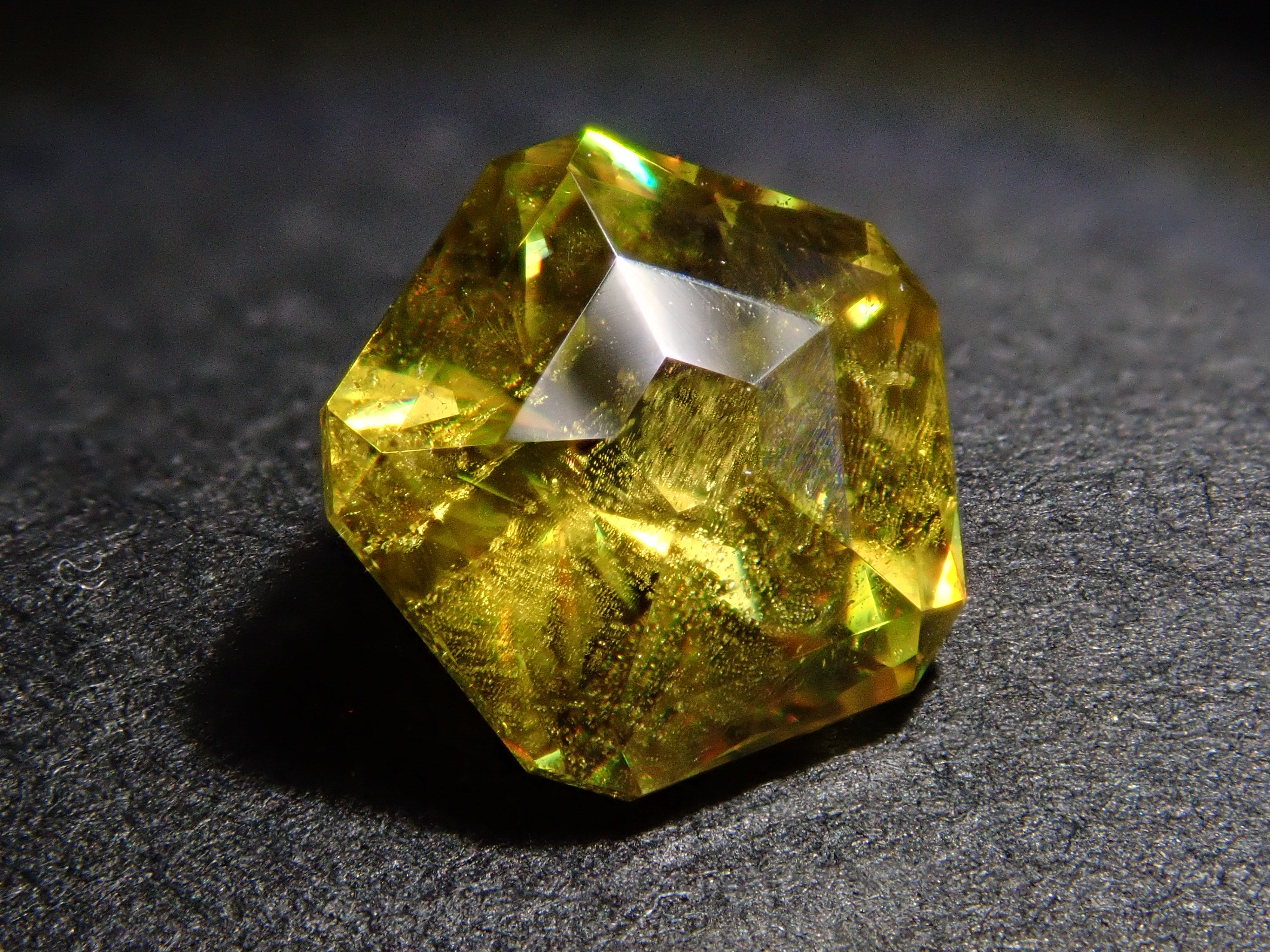 榍石散發著金色的光芒和絢麗的火彩。它是一種魅力十足的寶石,其火彩比鑽石更濃烈,越來越受到收藏家的青睞。榍石的光芒會隨著角度的變化而產生巨大的變化。不妨試試在陽光下用手掌滾動榍石,仔細觀察它。部分照片是用筆型手電筒拍攝的。