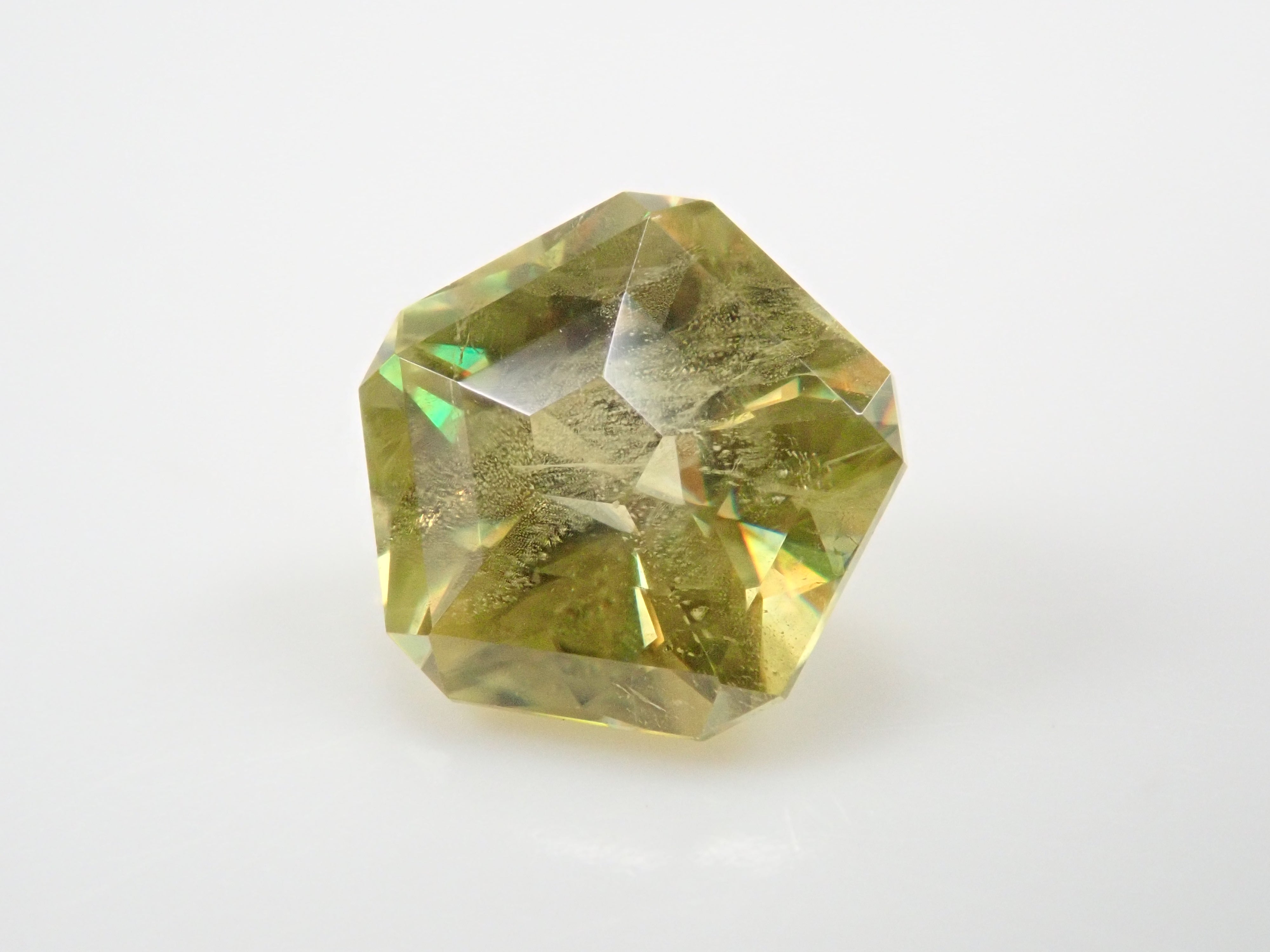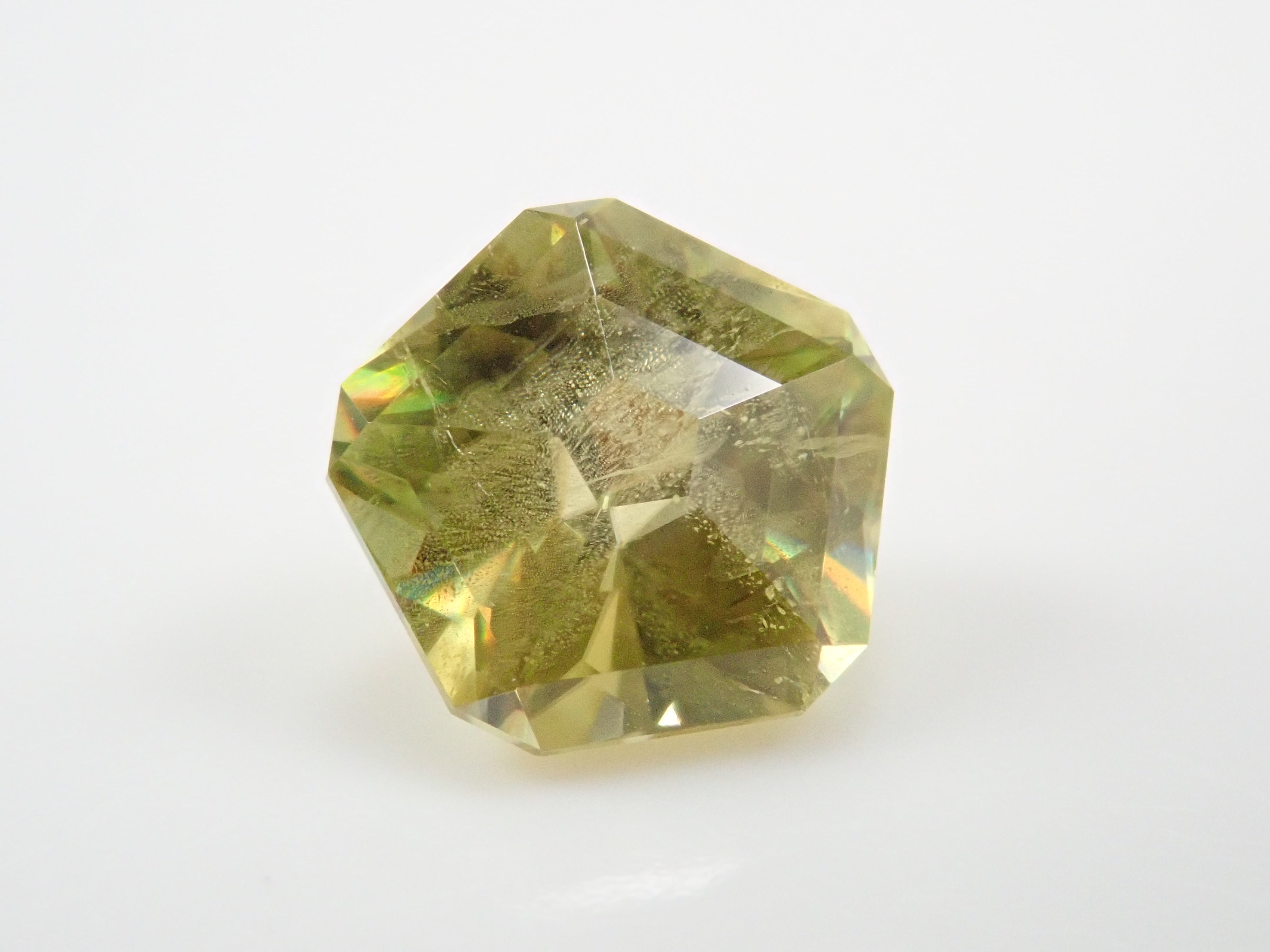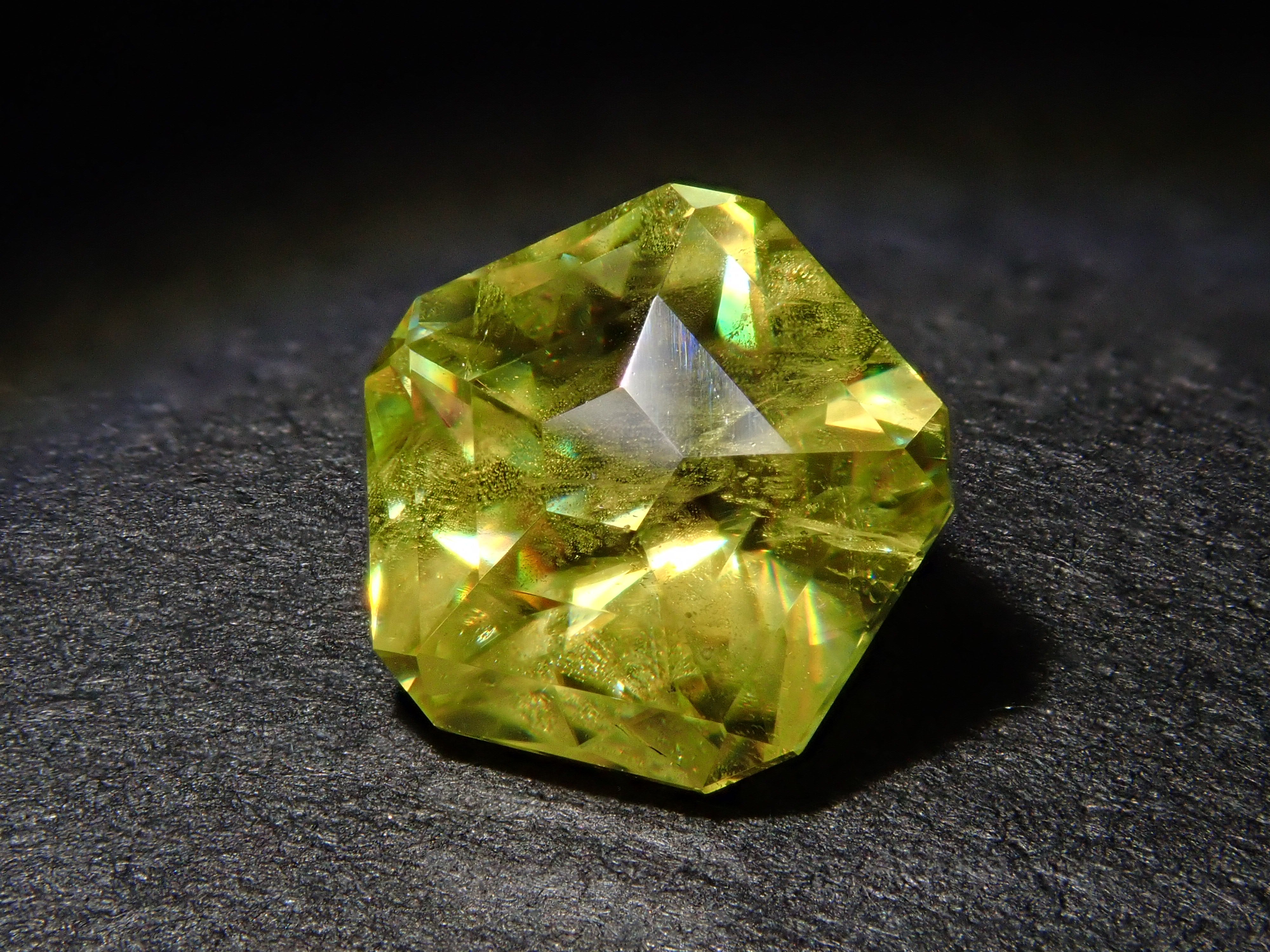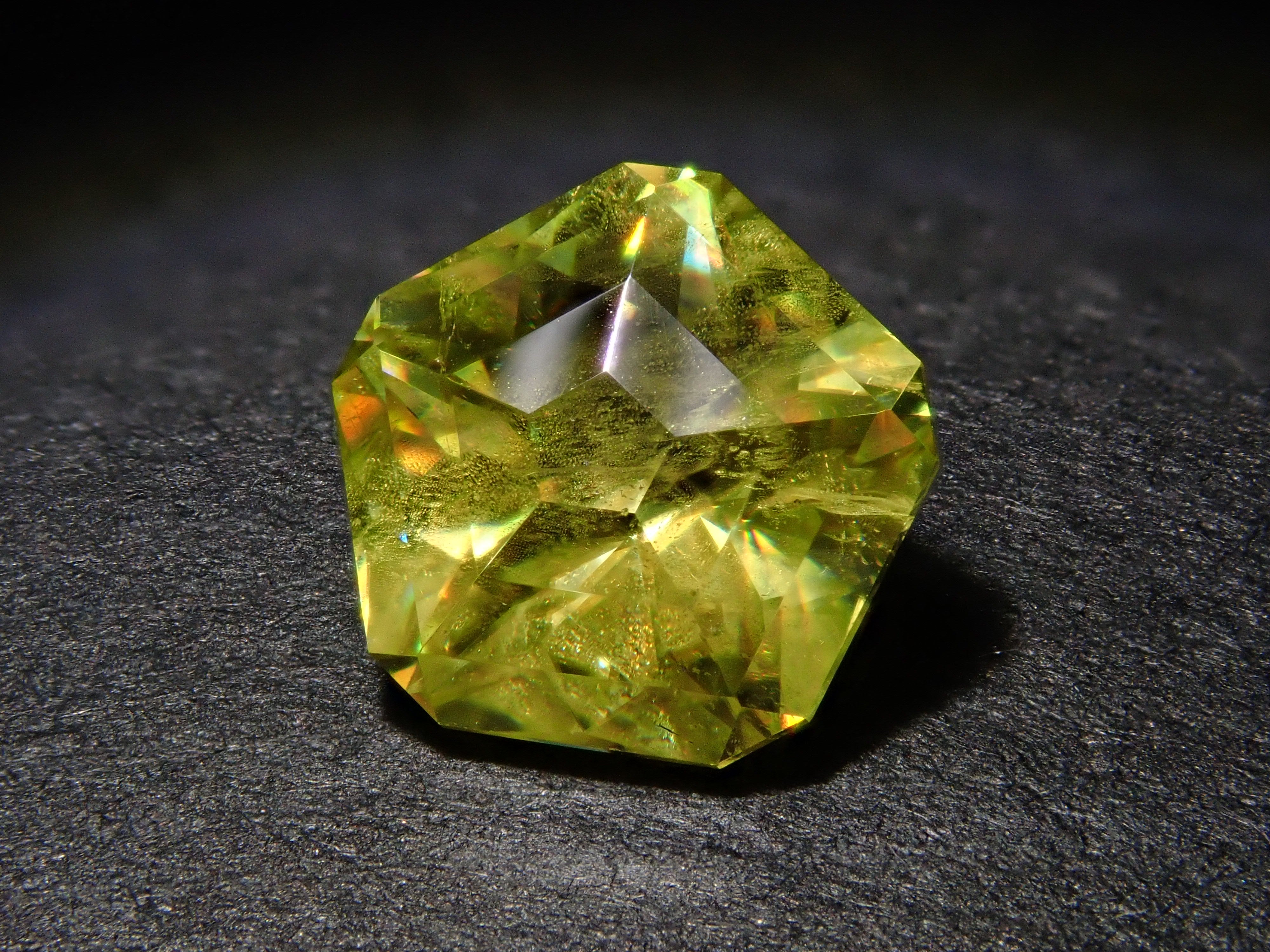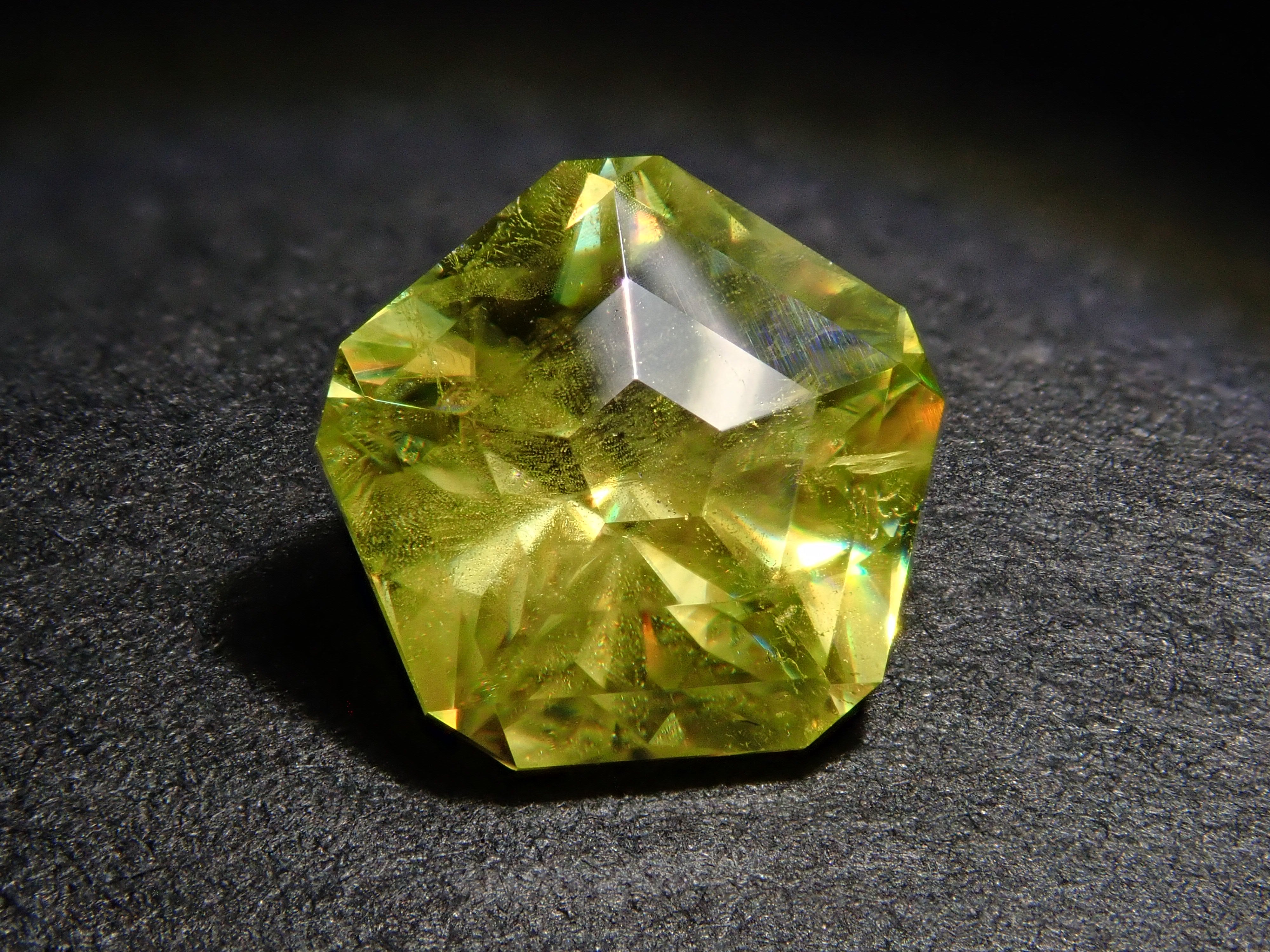 榍石散發著金色的光芒和絢麗的火彩。它是一種魅力十足的寶石,其火彩比鑽石更濃烈,越來越受到收藏家的青睞。榍石的光芒會隨著角度的變化而產生巨大的變化。不妨試試在陽光下用手掌滾動榍石,仔細觀察它。部分照片是用筆型手電筒拍攝的。