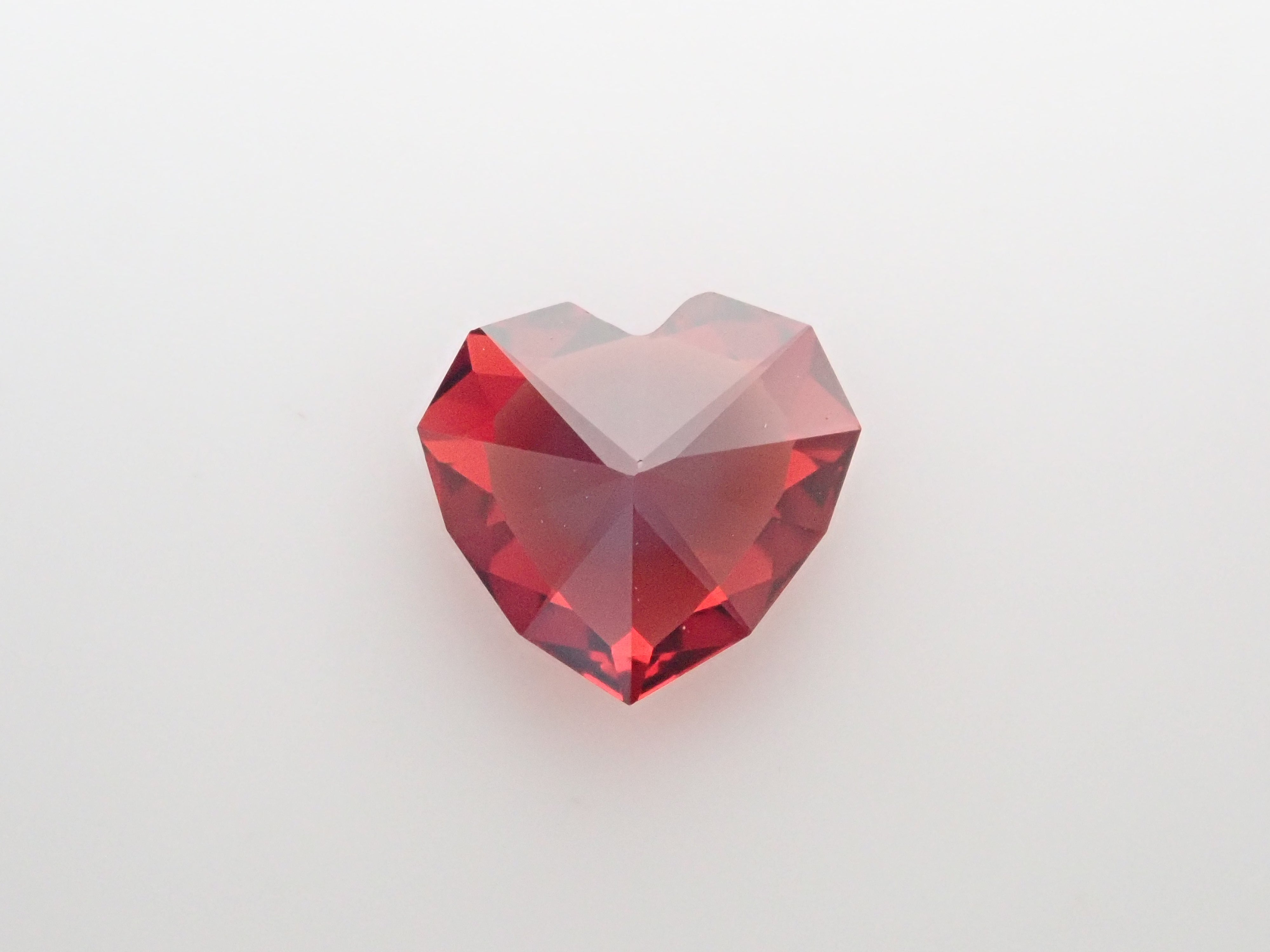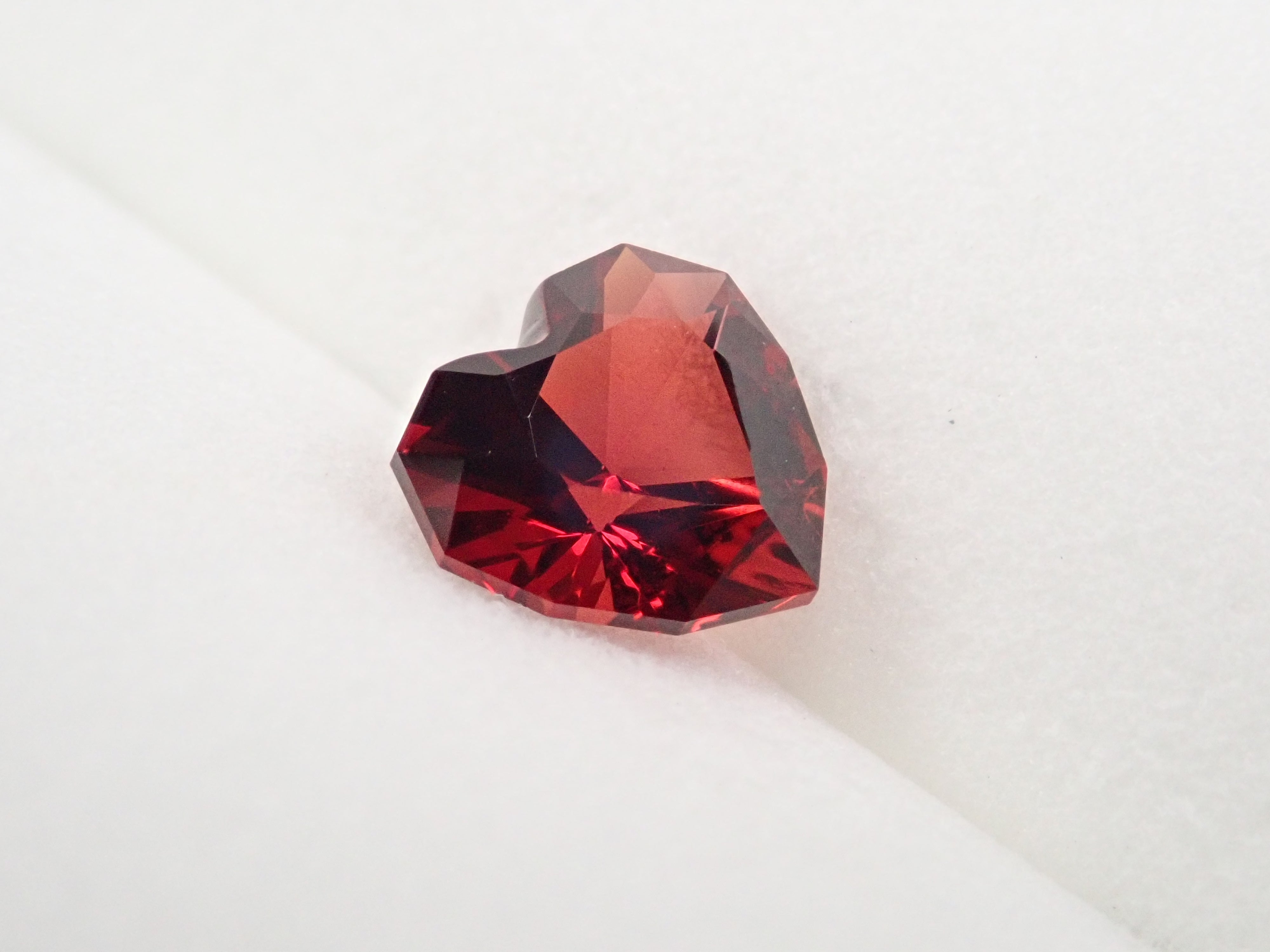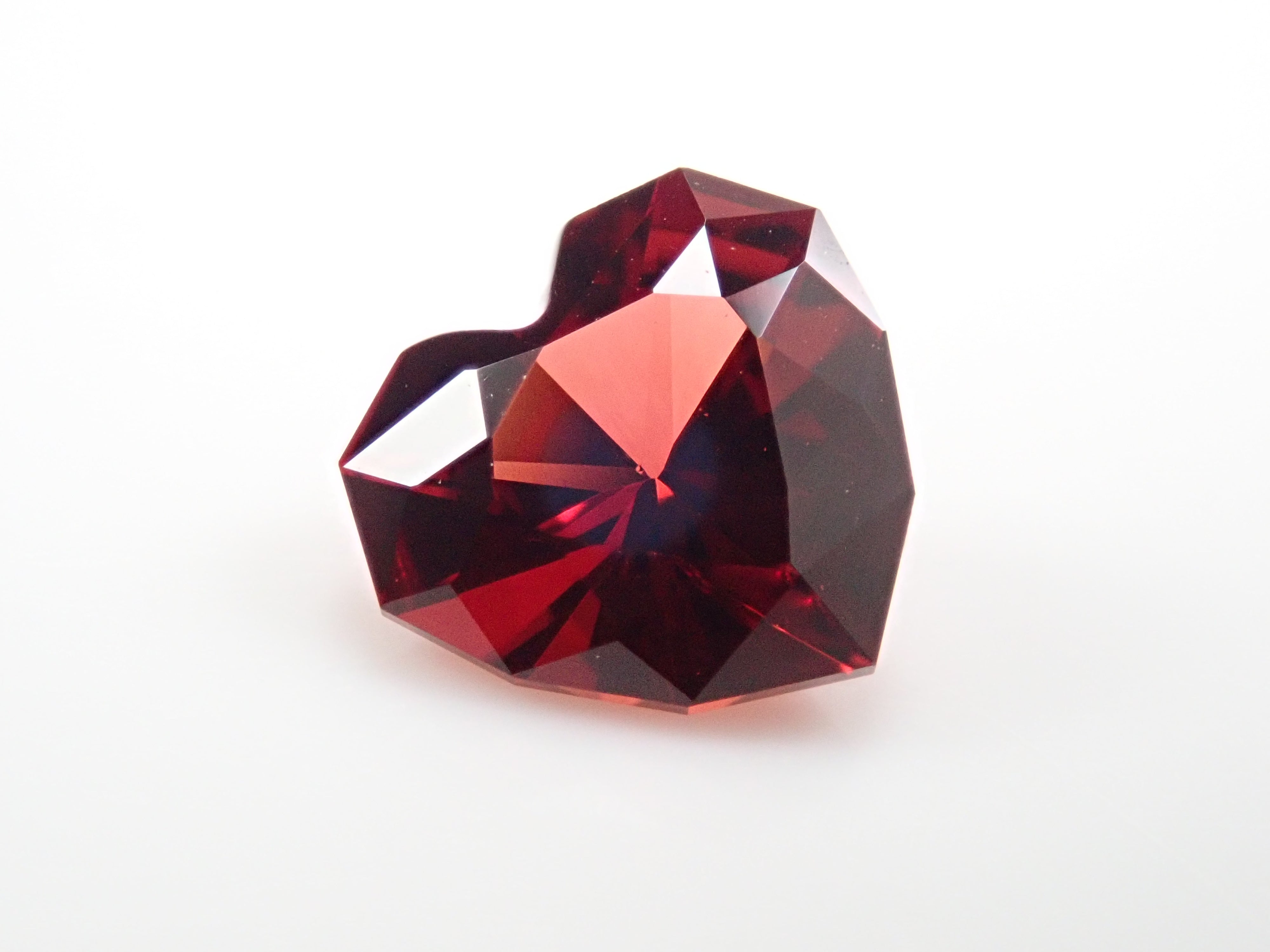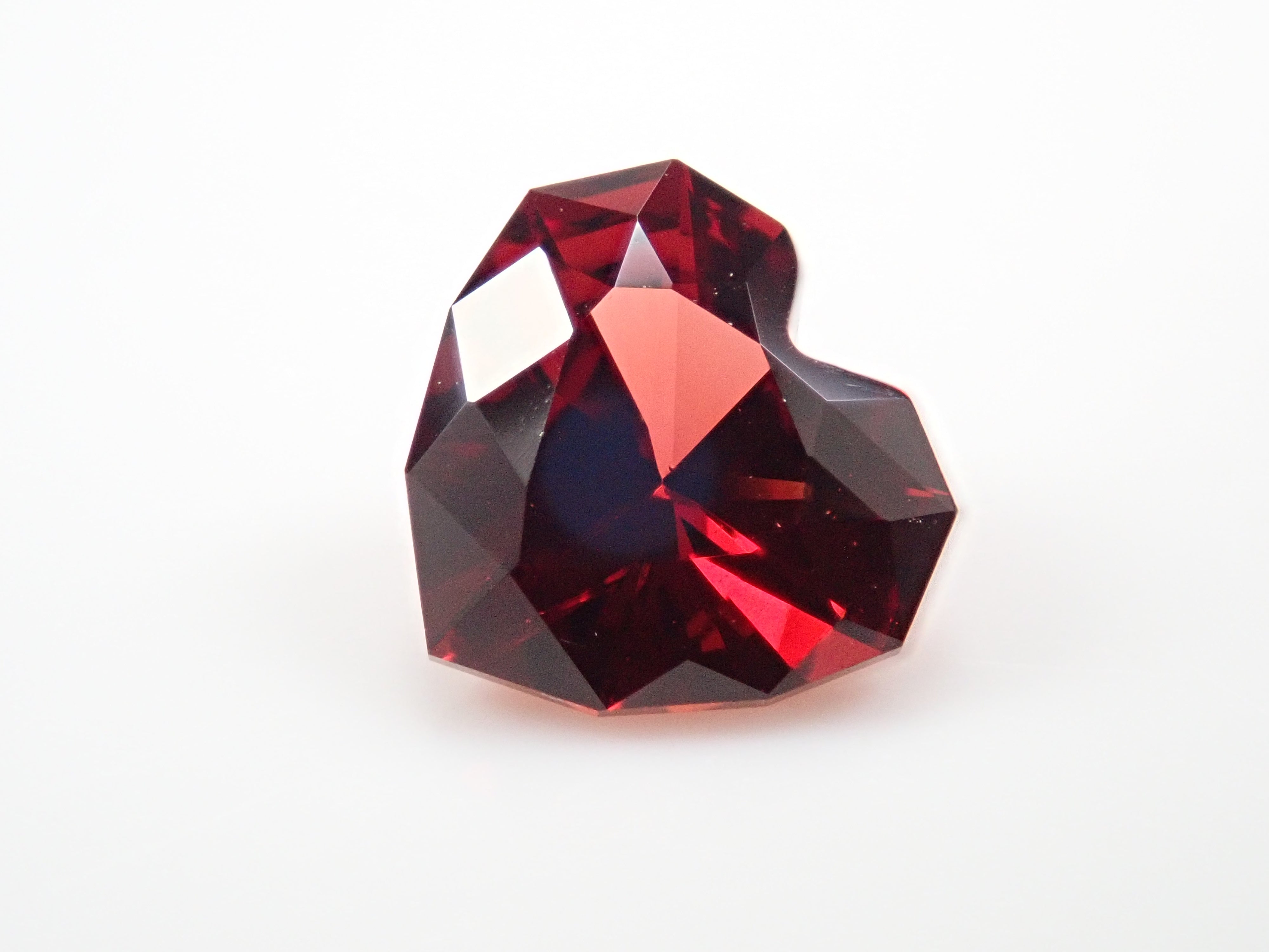 石榴石是著名的一月誕生石。事實上,它的顏色多種多樣,包括紅色、黃色、橙色和綠色。其中最受歡迎的紅色石榴石是「鐵鋁榴石」。它的特徵是深紅色。這顆心形切割的鐵鋁榴石比普通的石榴石擁有更多的刻面。它是一種高品質的裸石,透明度高,顏色較深。