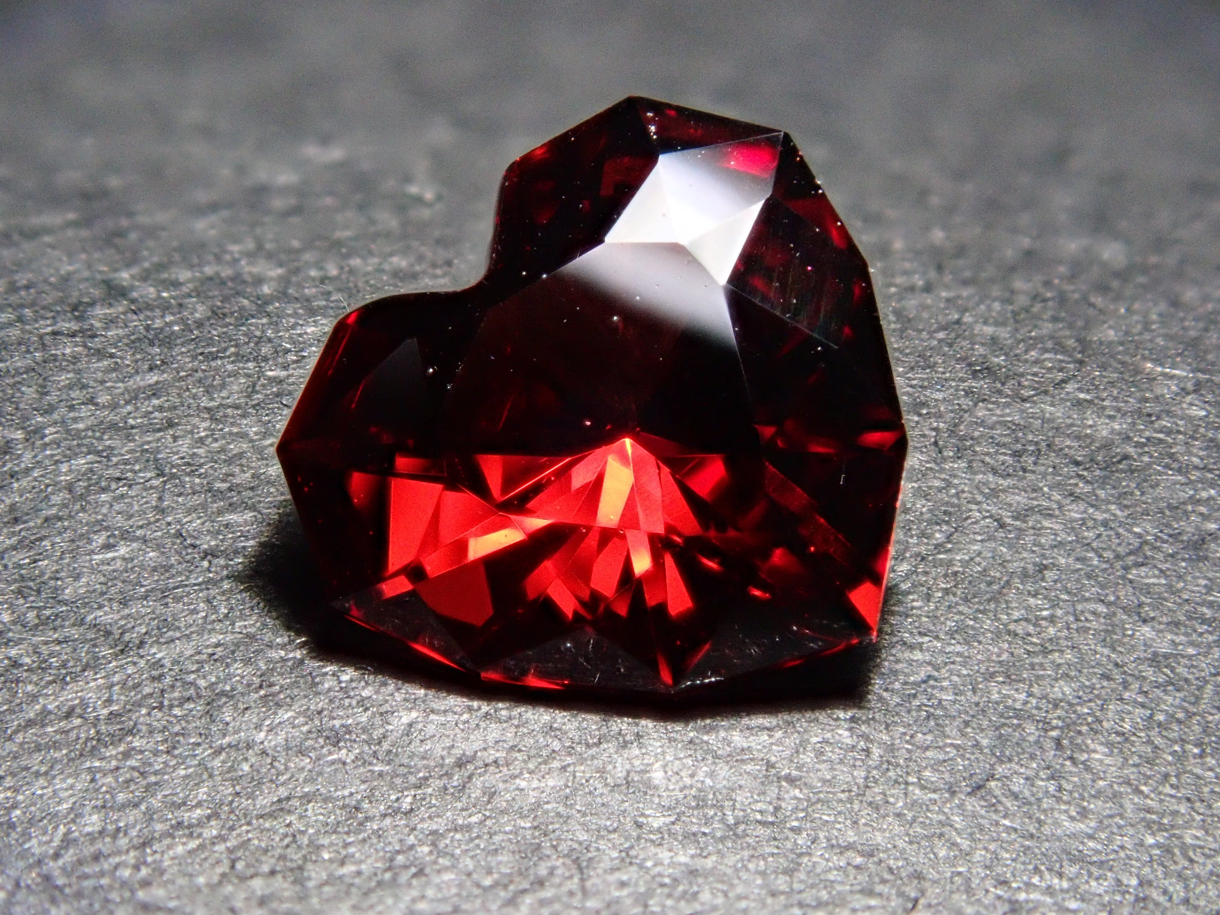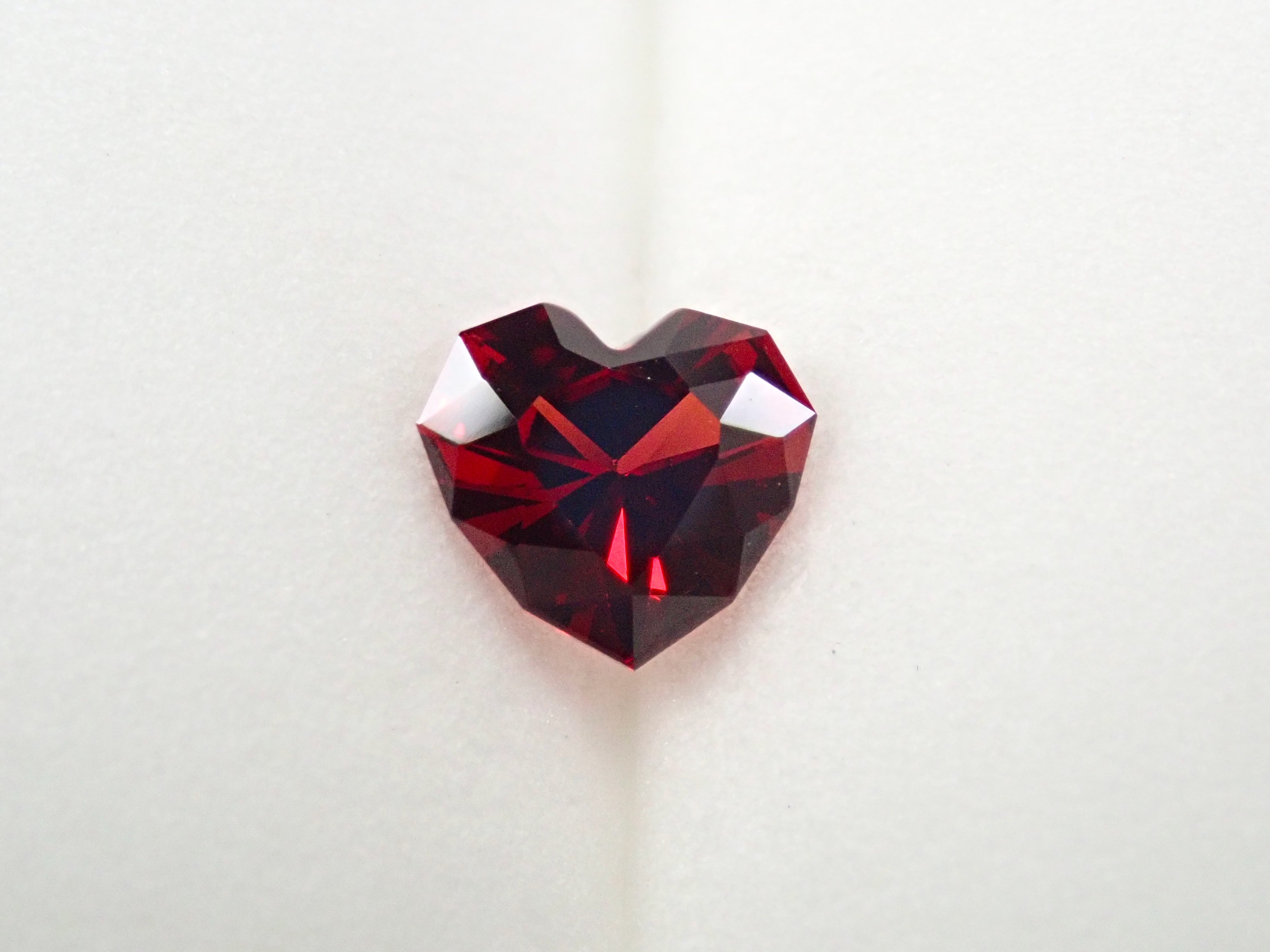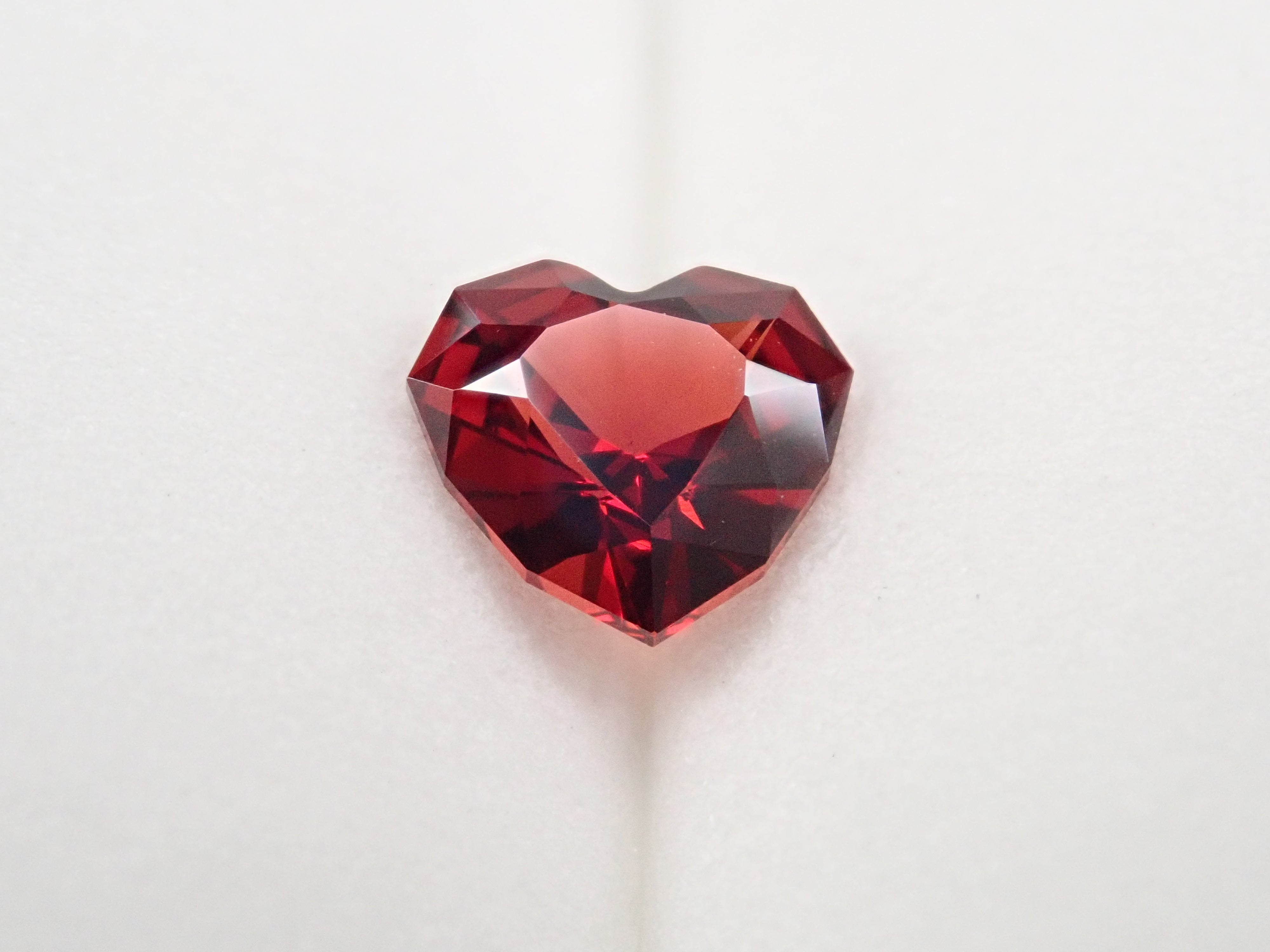 石榴石是著名的一月誕生石。事實上,它的顏色多種多樣,包括紅色、黃色、橙色和綠色。其中最受歡迎的紅色石榴石是「鐵鋁榴石」。它的特徵是深紅色。這顆心形切割的鐵鋁榴石比普通的石榴石擁有更多的刻面。它是一種高品質的裸石,透明度高,顏色較深。