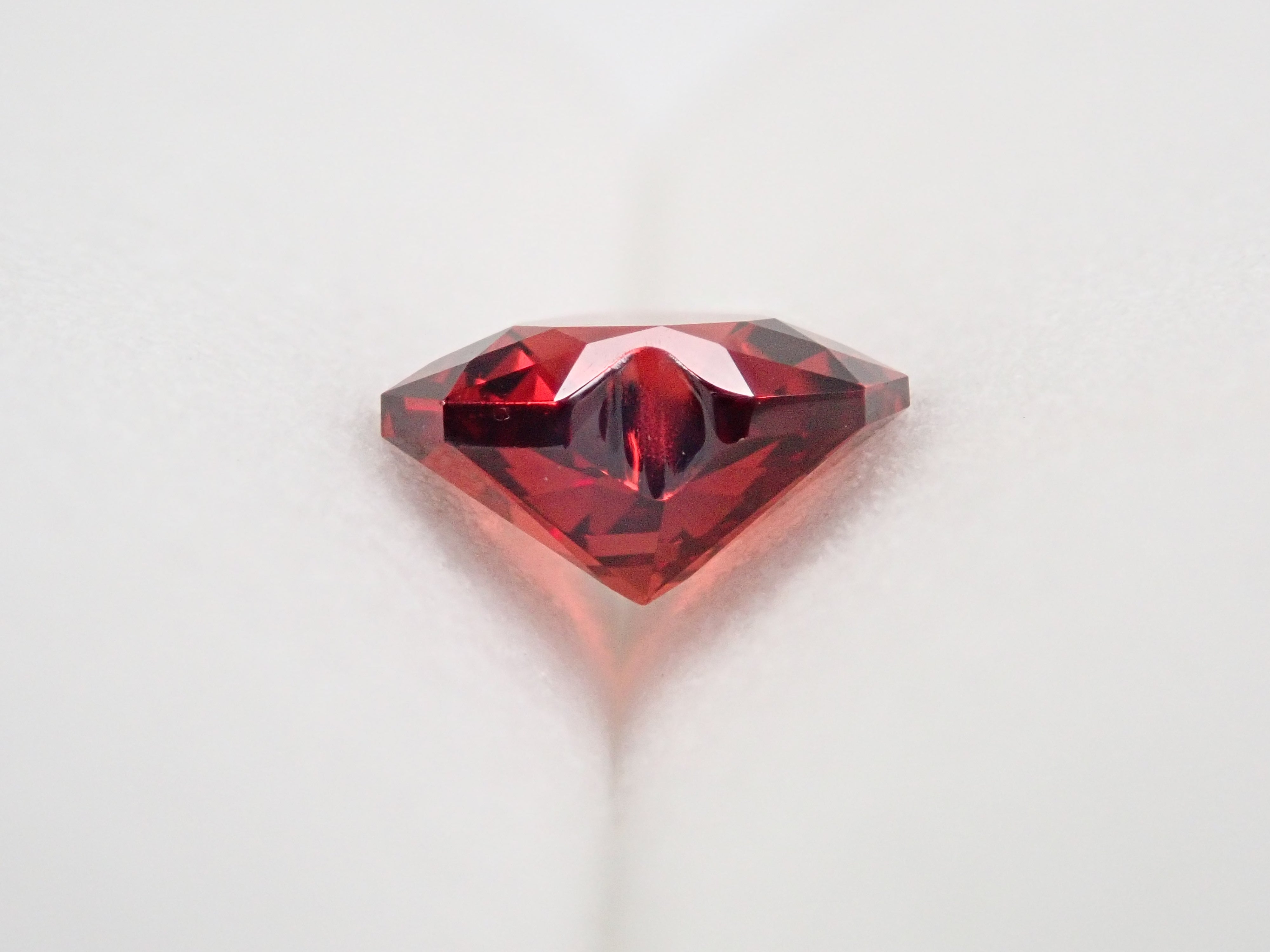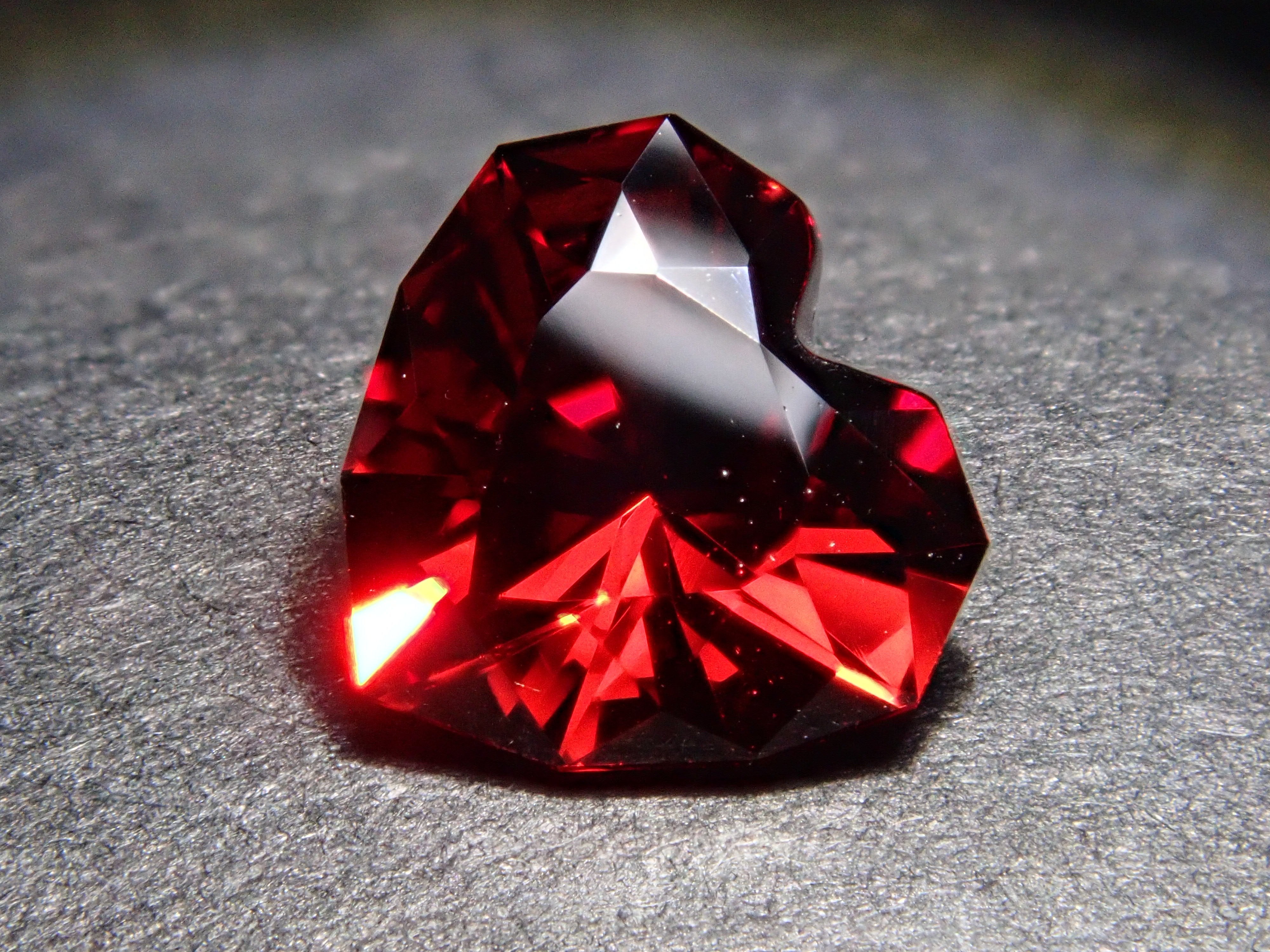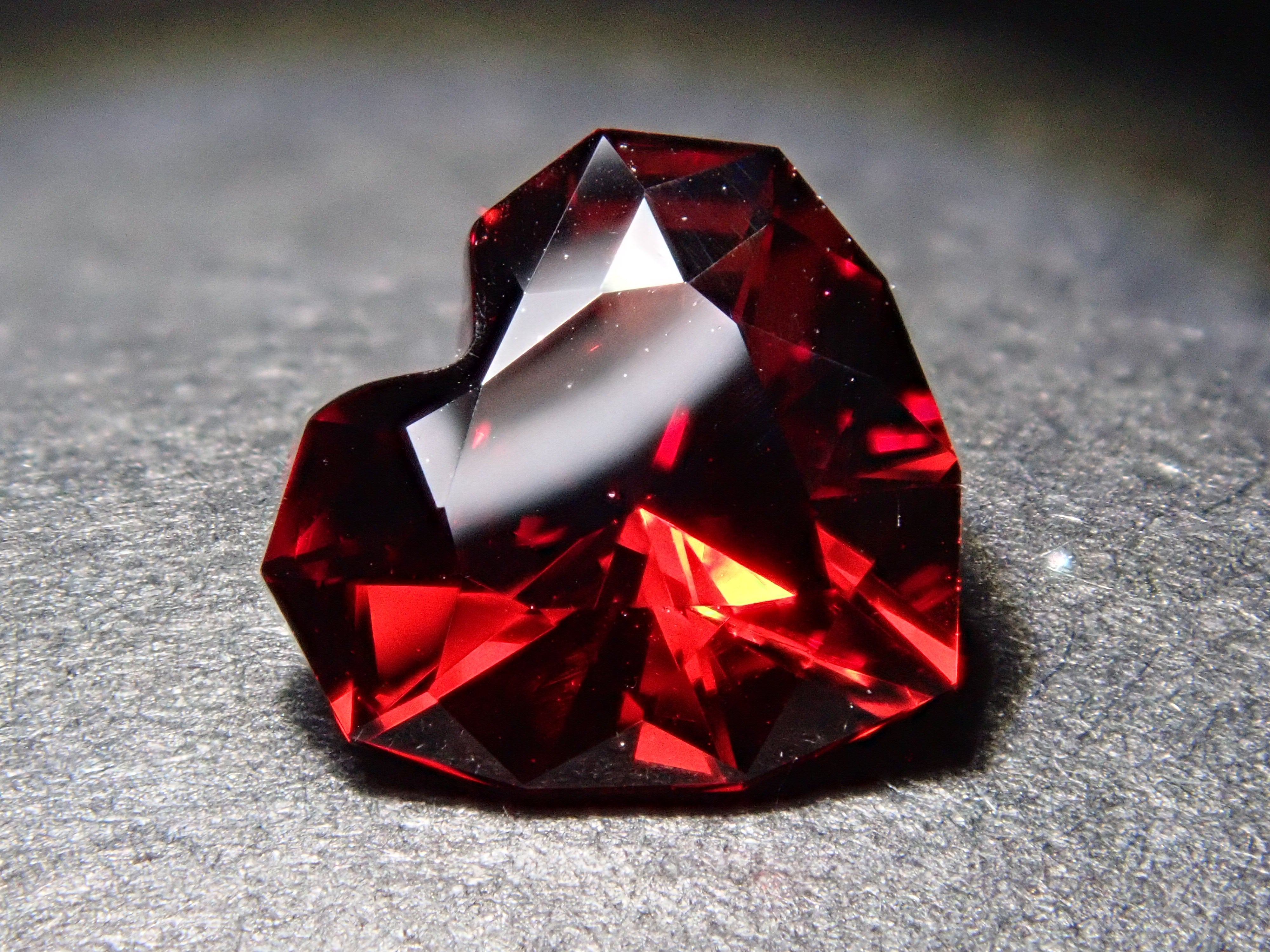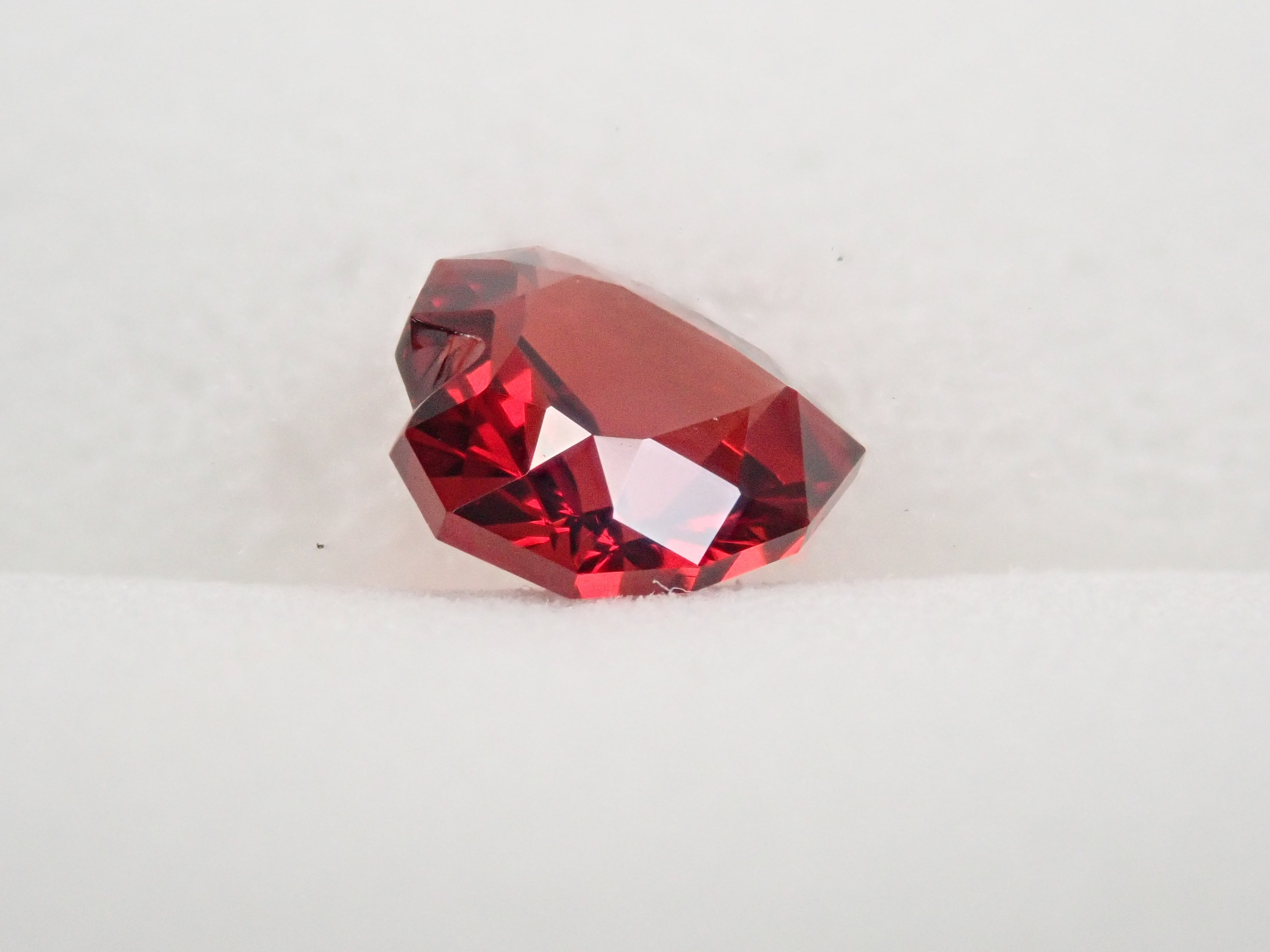 石榴石是著名的一月誕生石。事實上,它的顏色多種多樣,包括紅色、黃色、橙色和綠色。其中最受歡迎的紅色石榴石是「鐵鋁榴石」。它的特徵是深紅色。這顆心形切割的鐵鋁榴石比普通的石榴石擁有更多的刻面。它是一種高品質的裸石,透明度高,顏色較深。