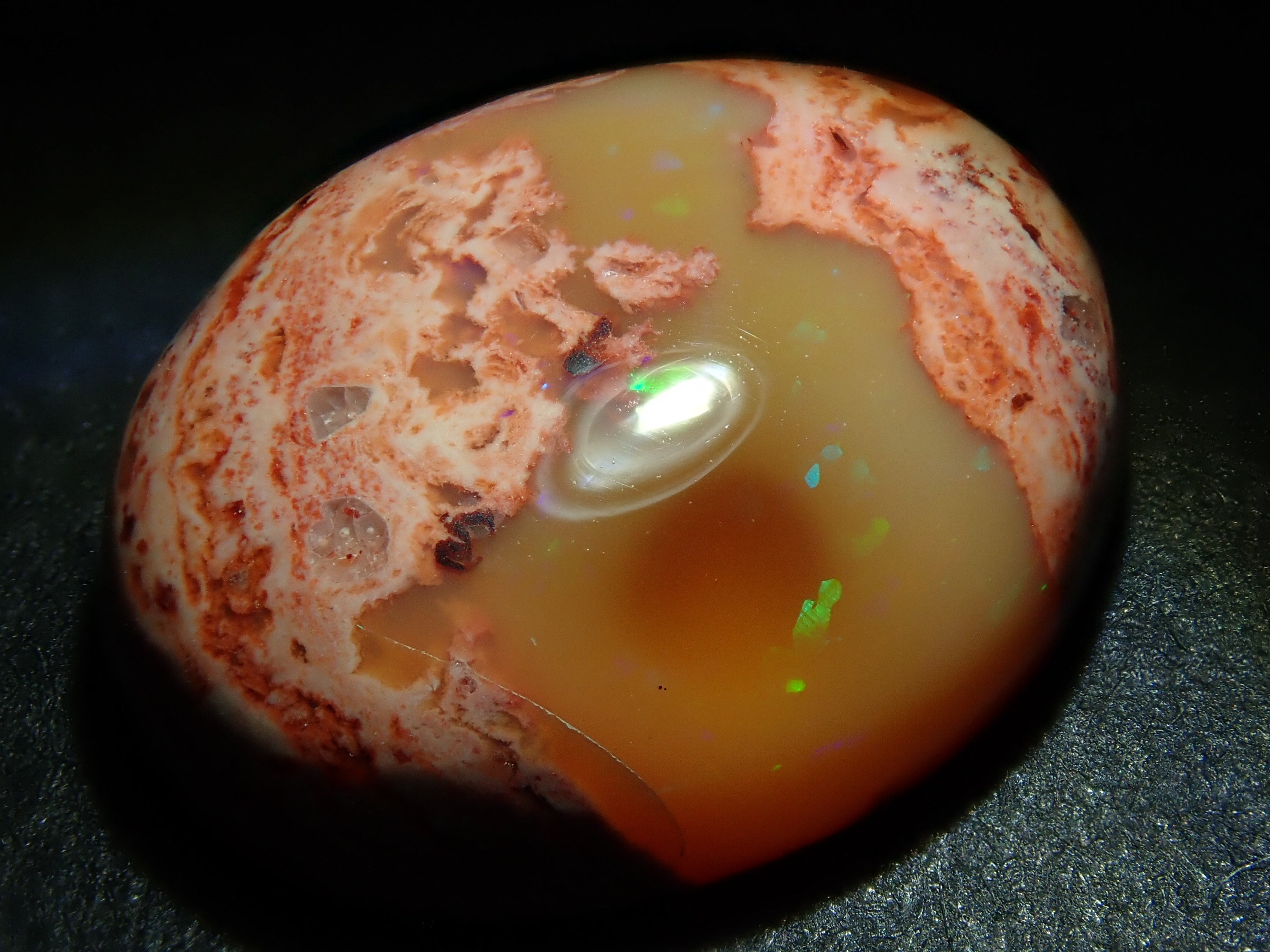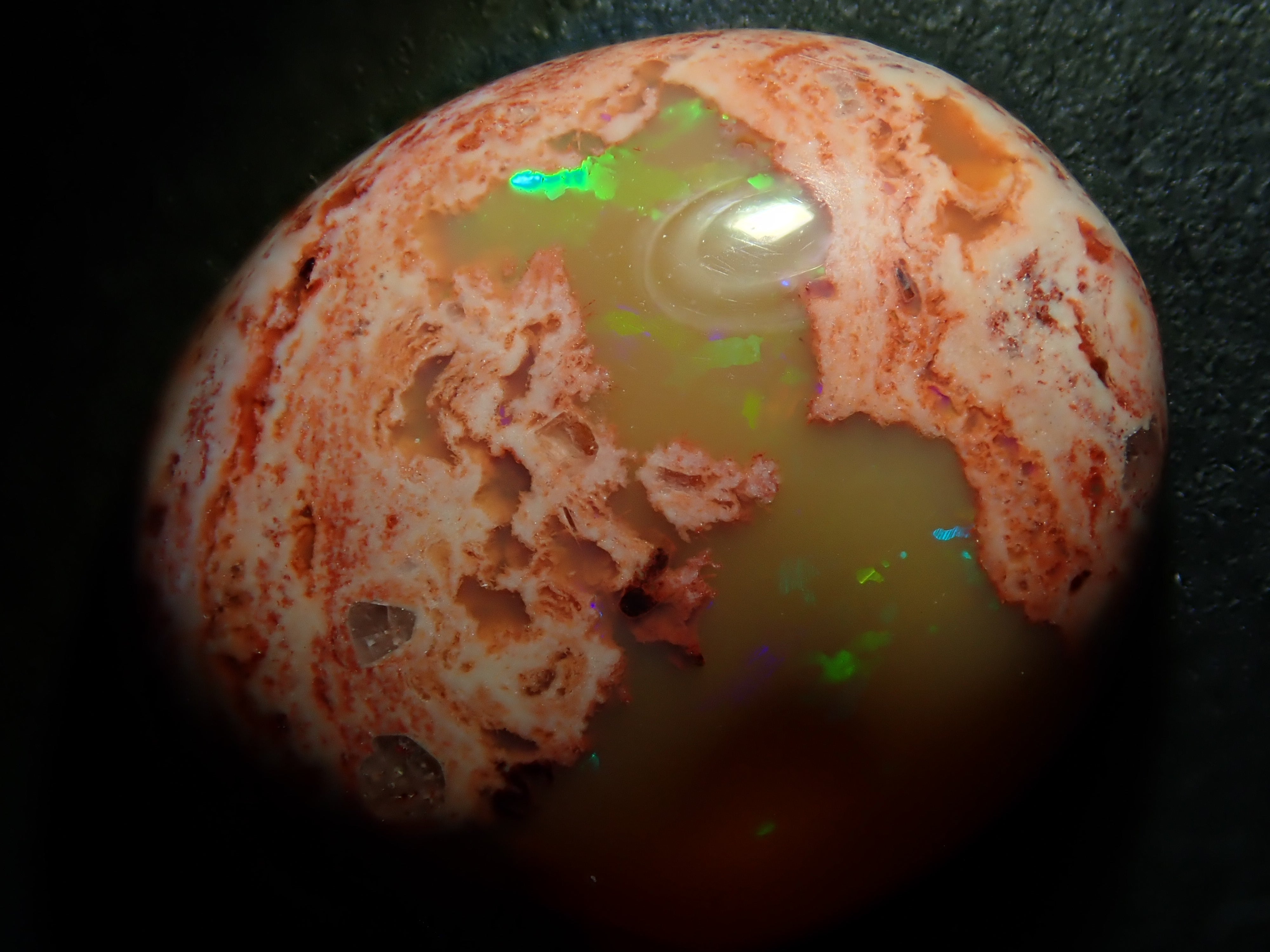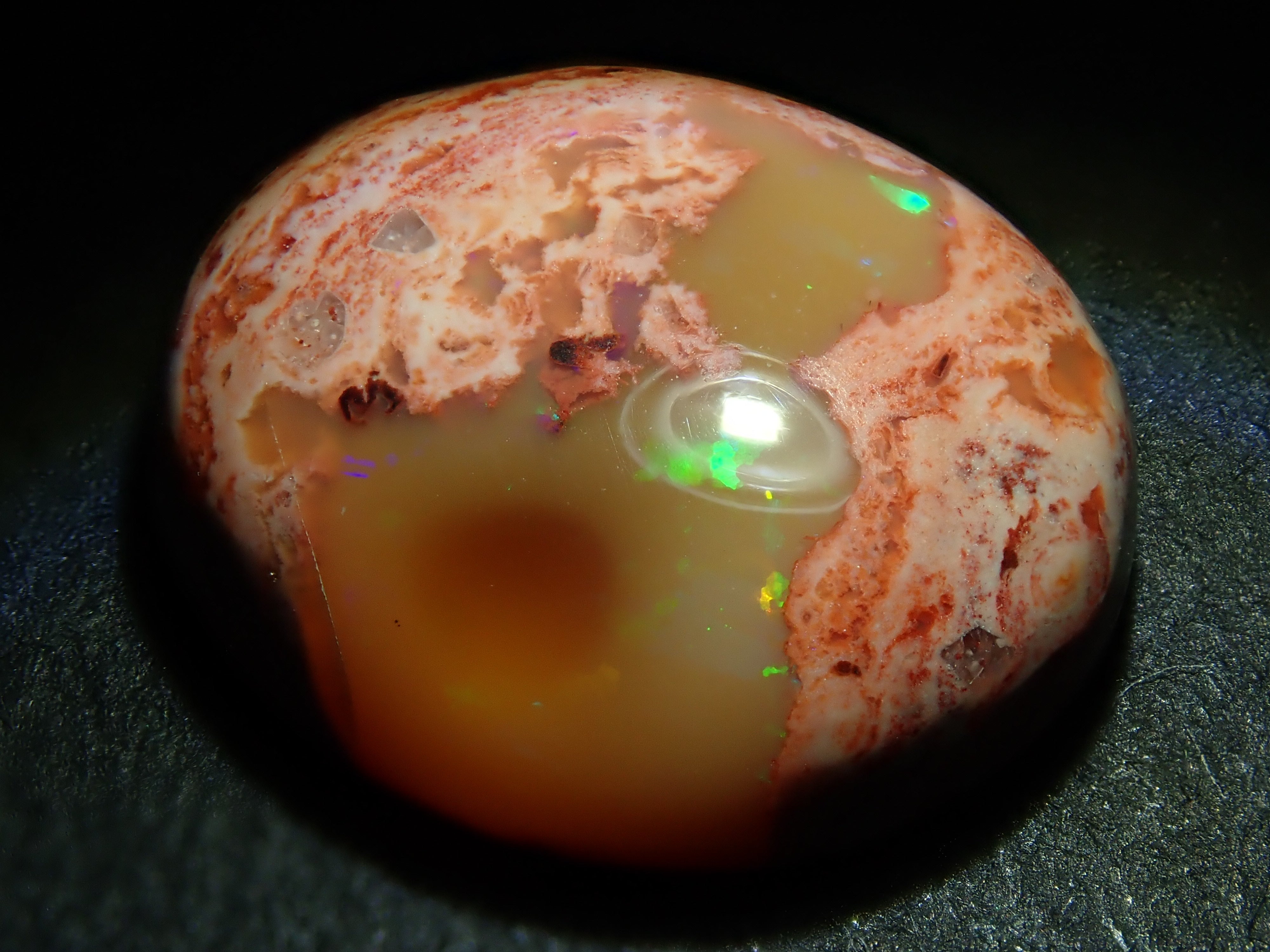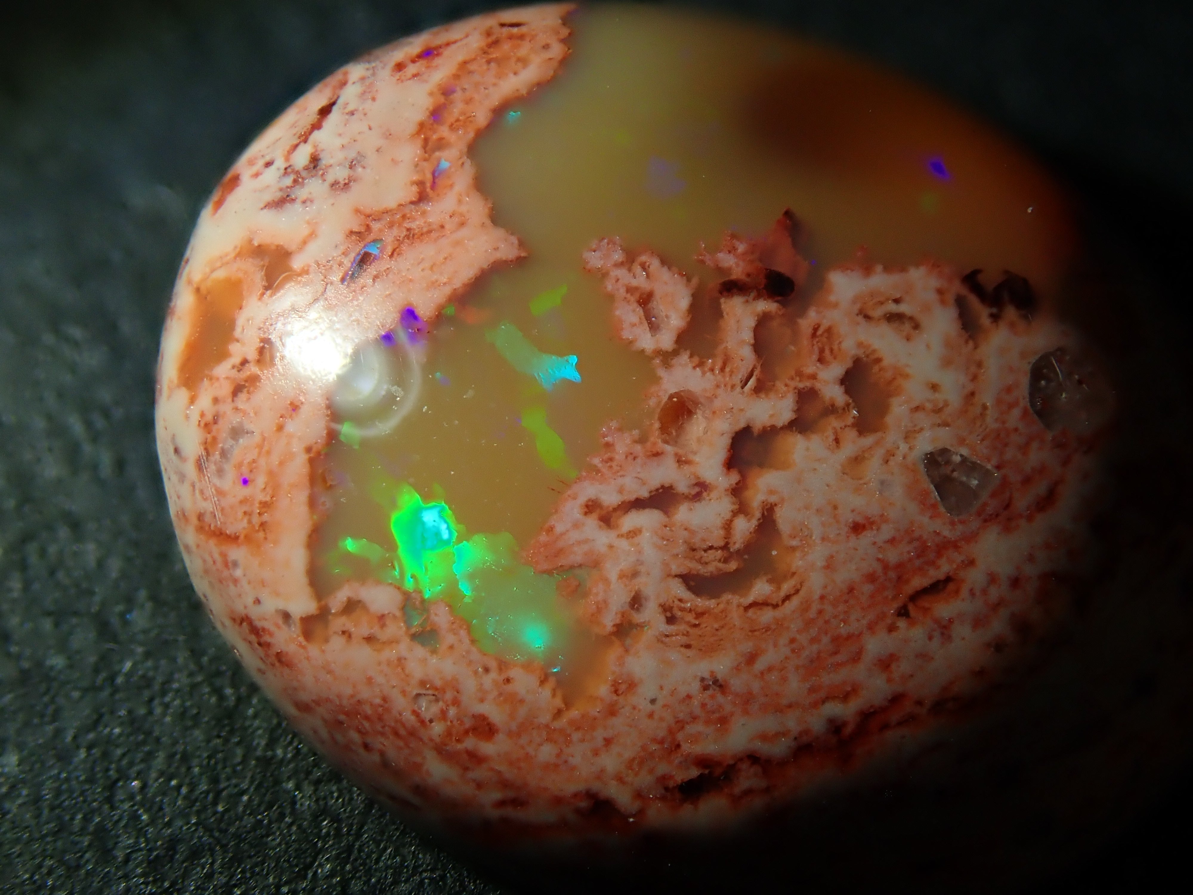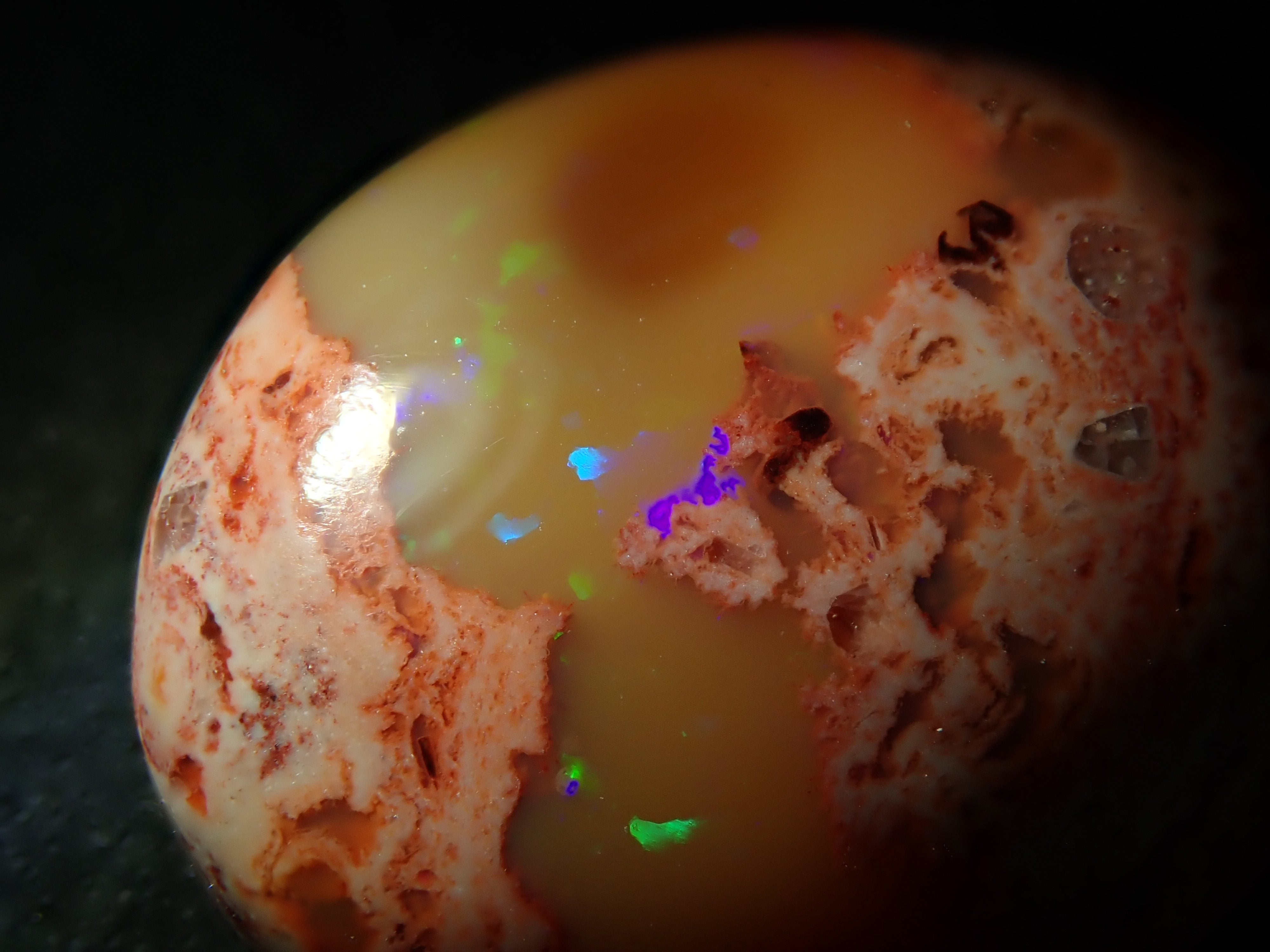 Cantera 蛋白石原本是一種有許多環的寶石。照片是使用筆燈拍攝的。
