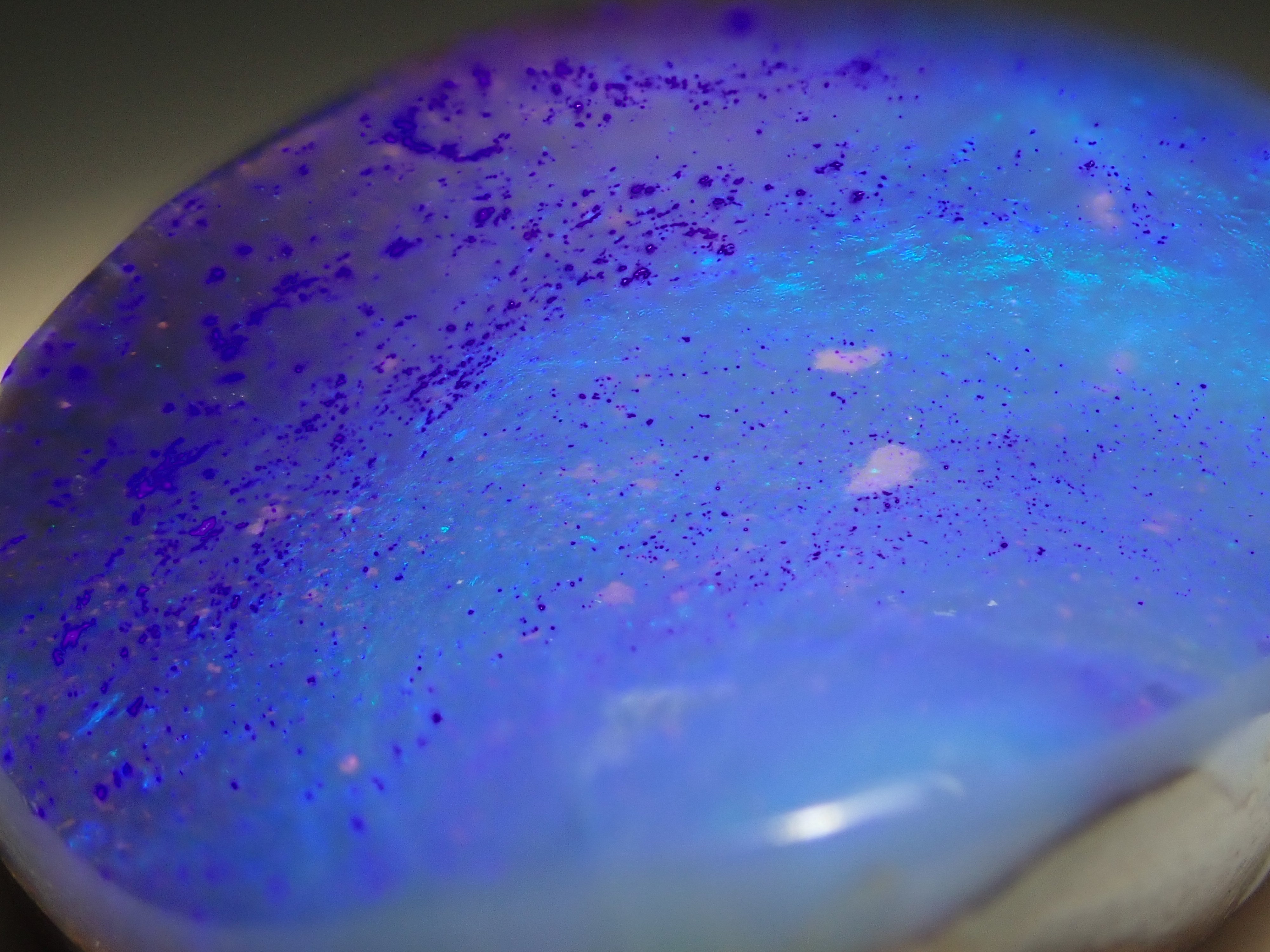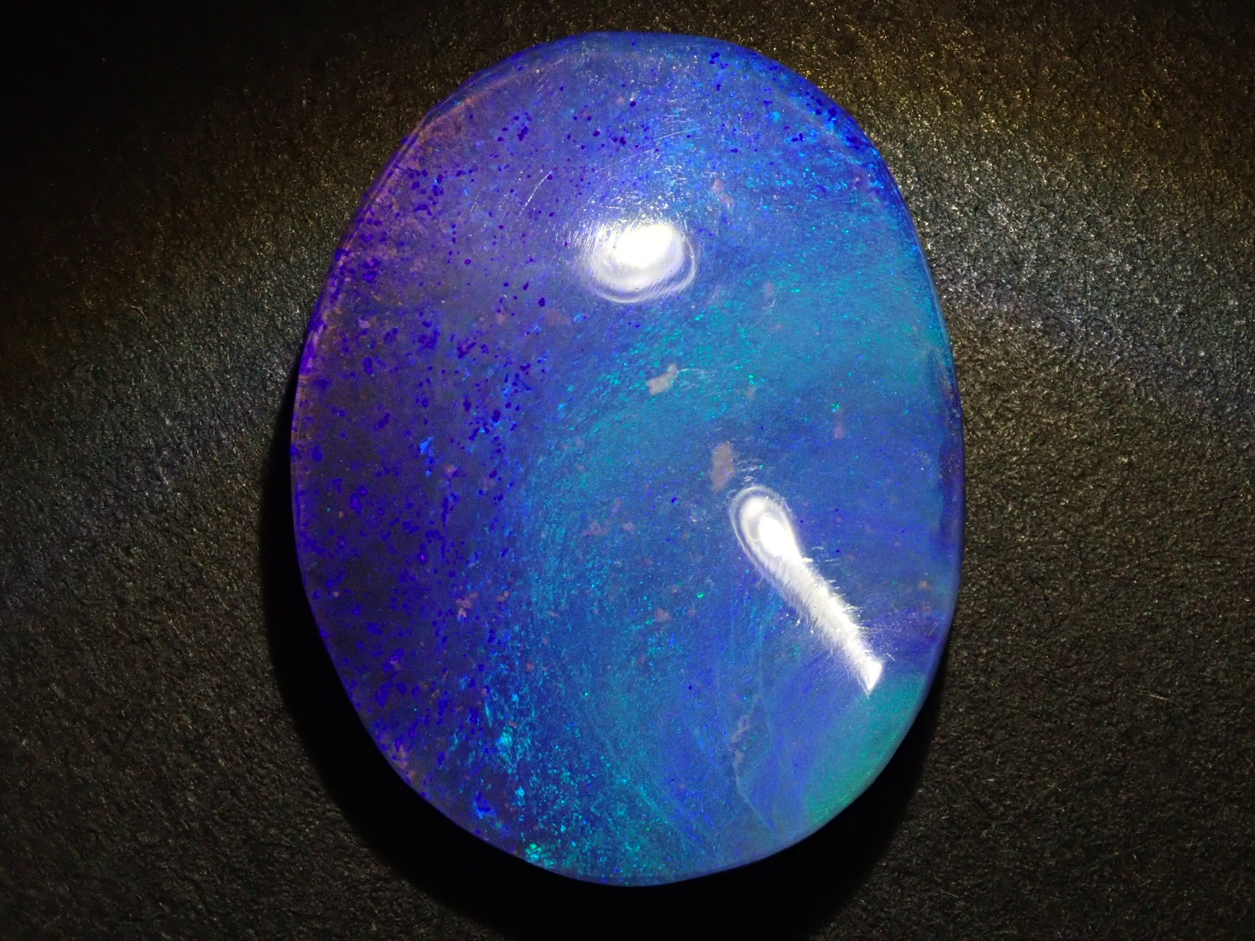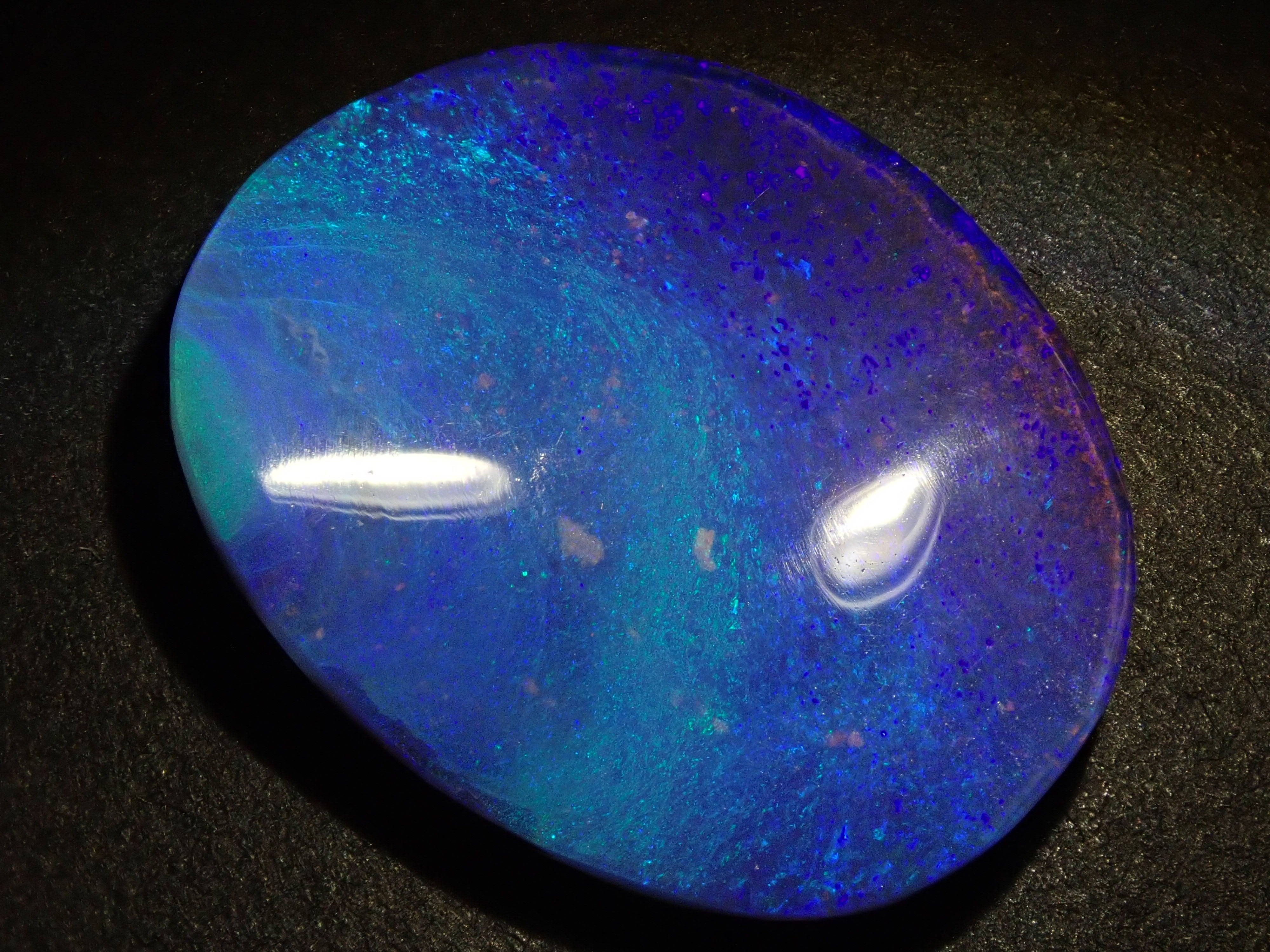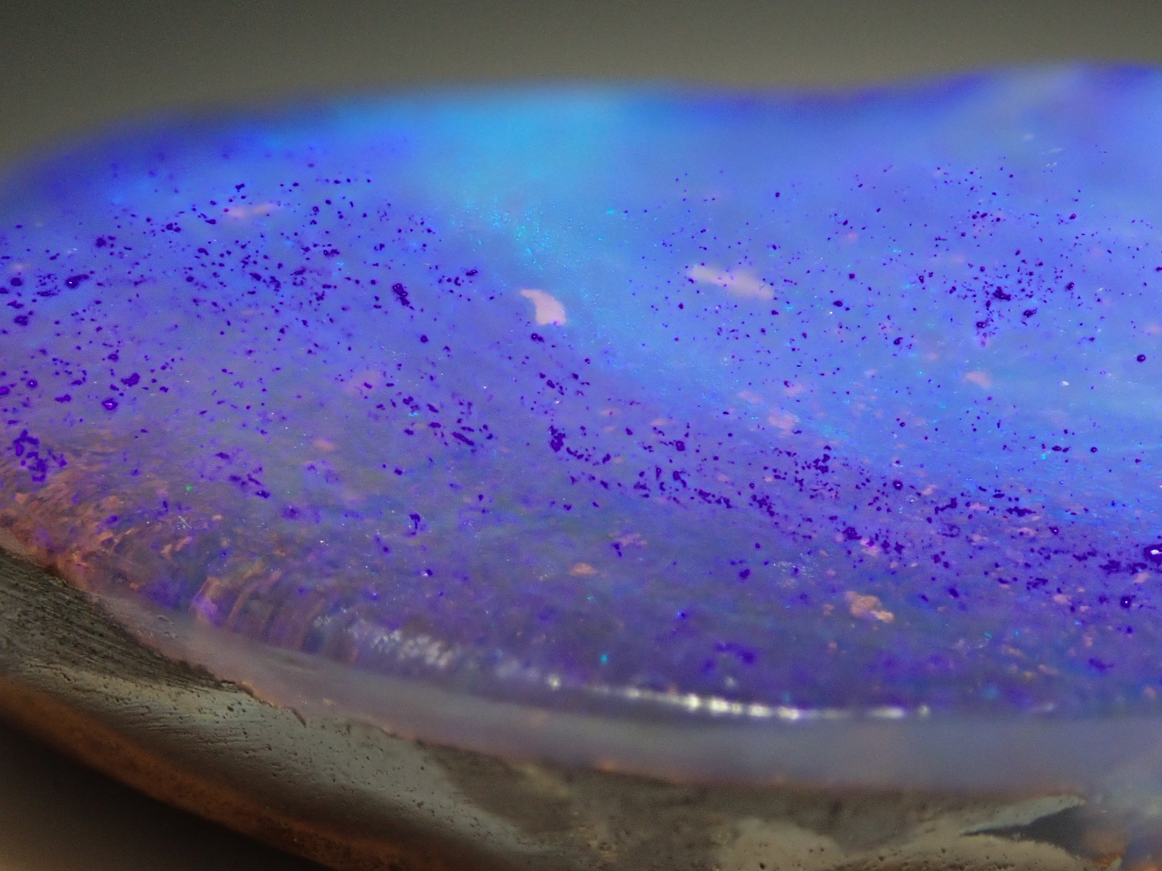 蛋白石是一種閃爍著彩虹色光芒的寶石。蛋白石有多種類型,其中,礫石蛋白石是指仍附著主岩的蛋白石。有些照片是用筆燈拍攝的。這是一顆高品質 23 克拉澳大利亞礫石蛋白石,具有美麗的藍色底色。