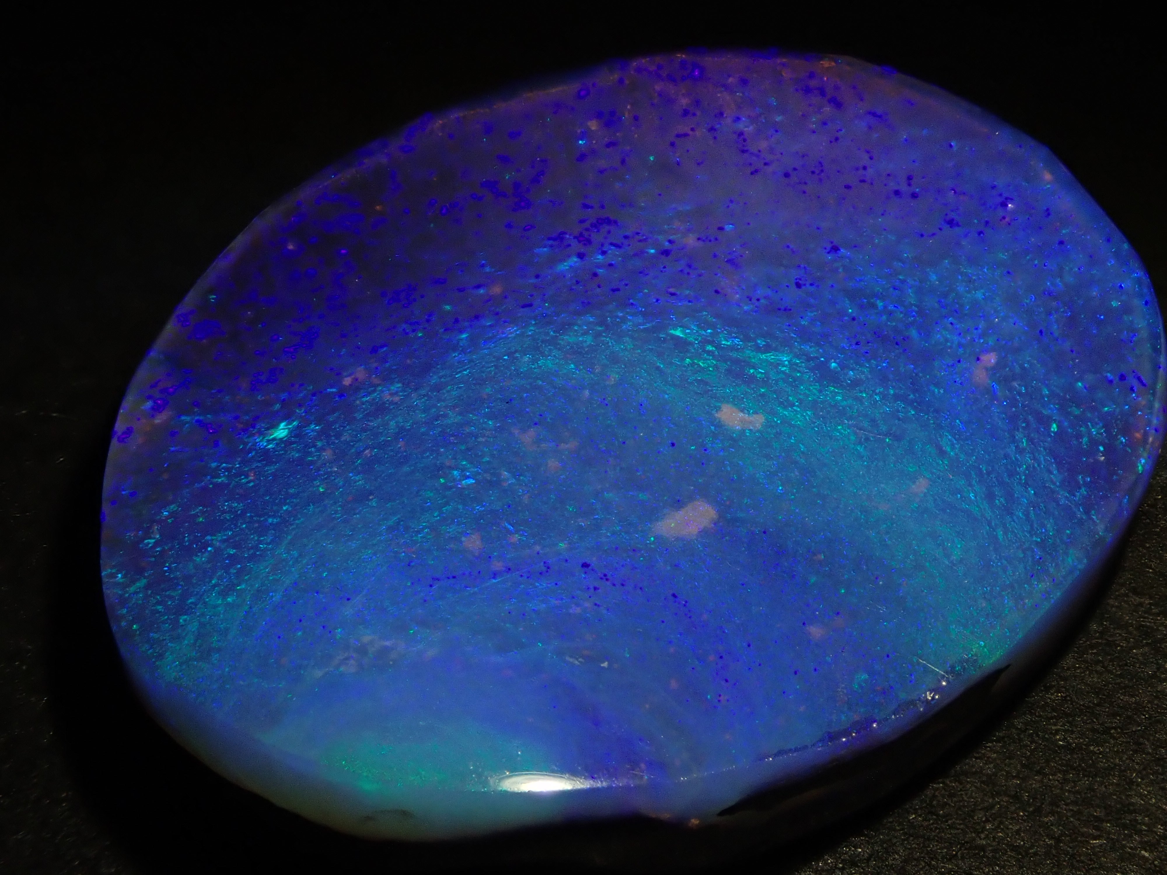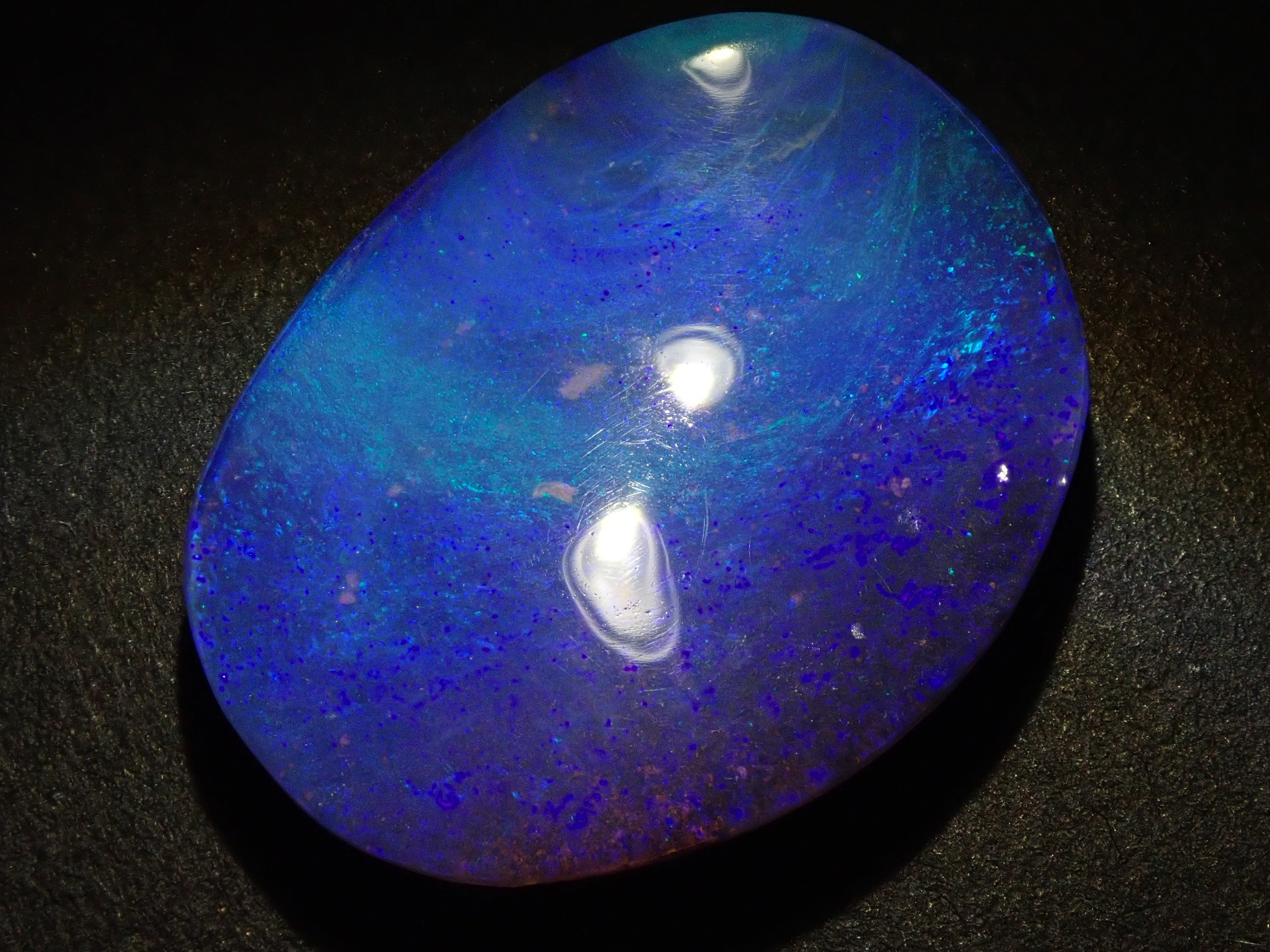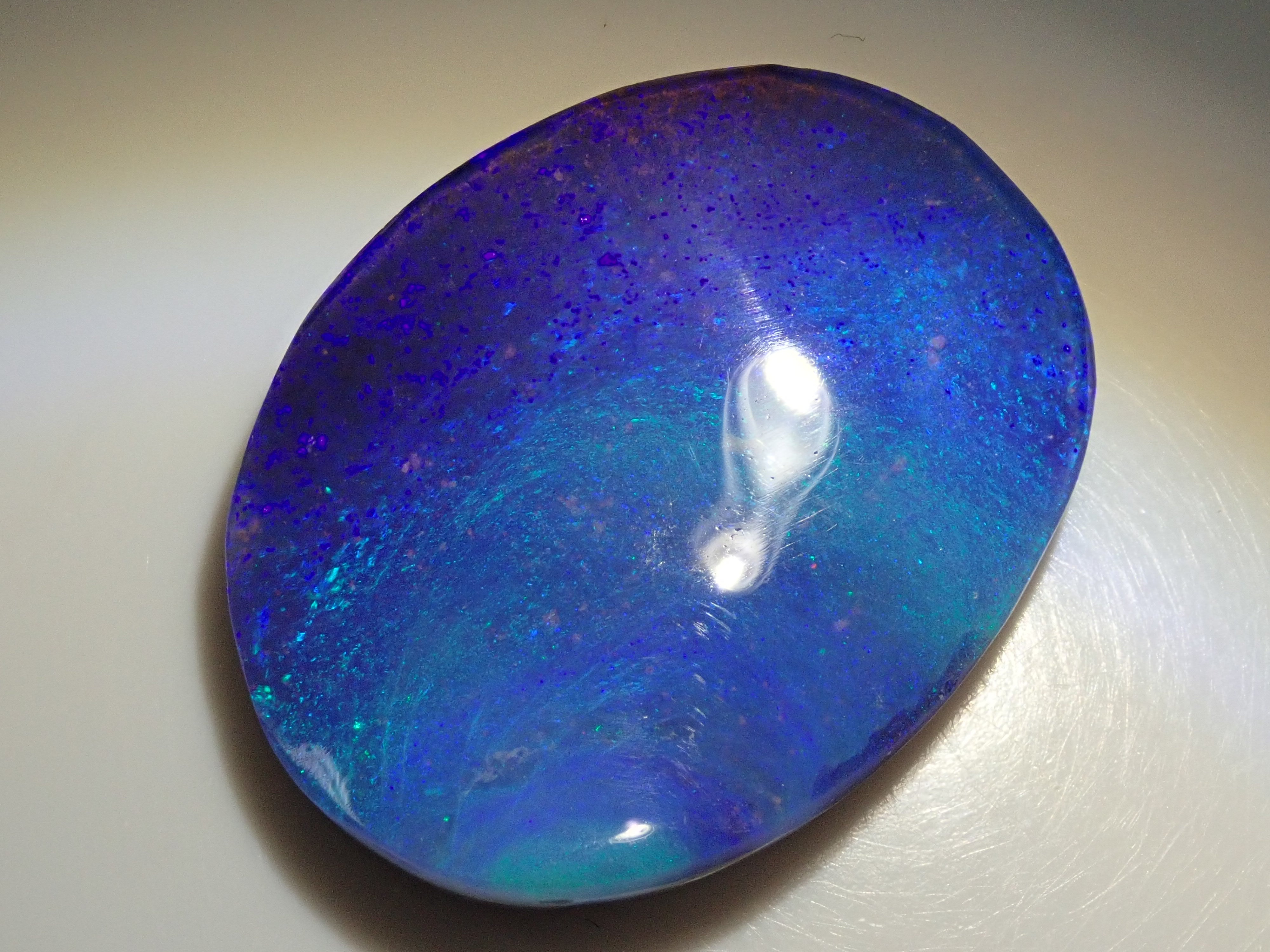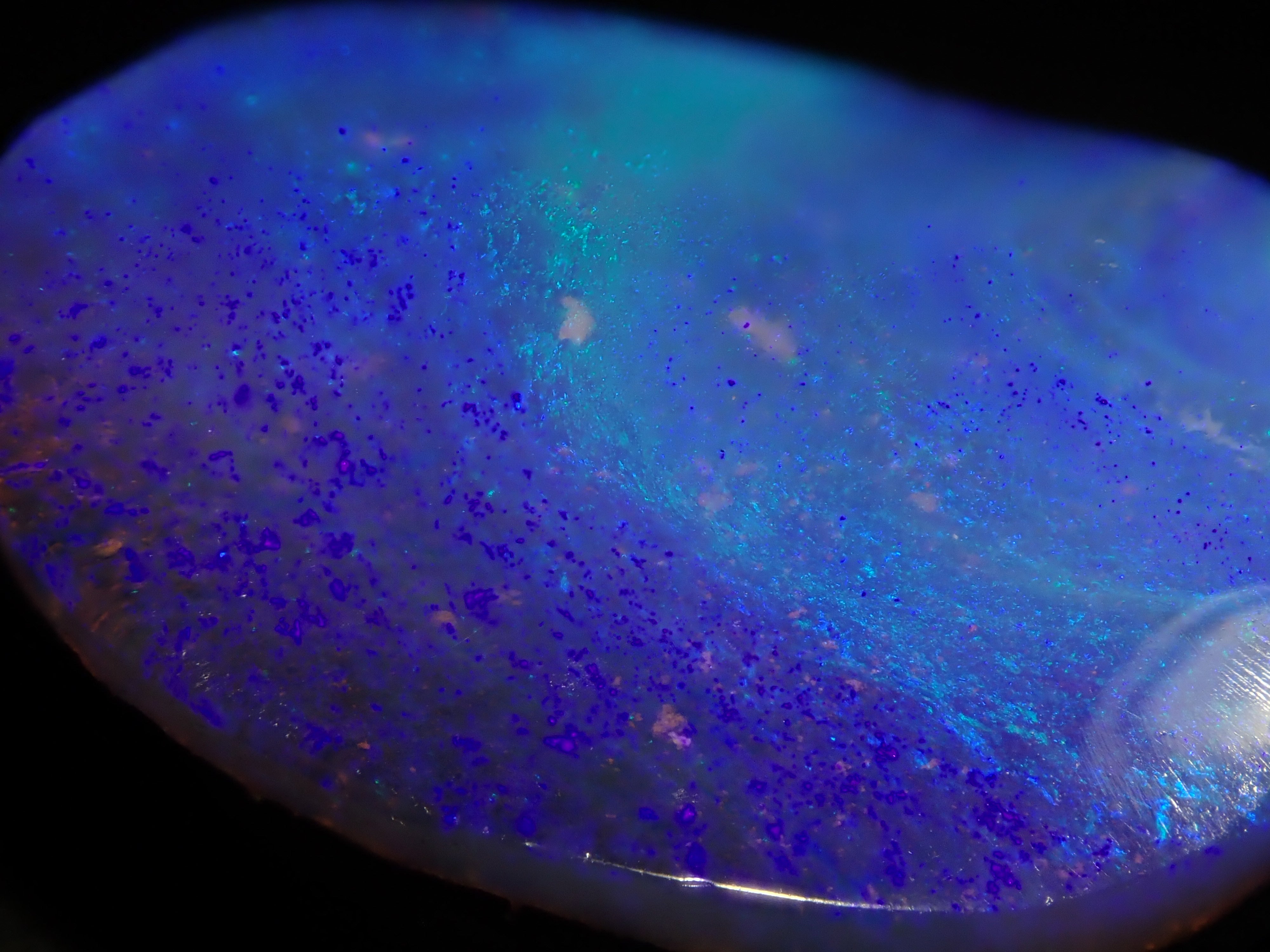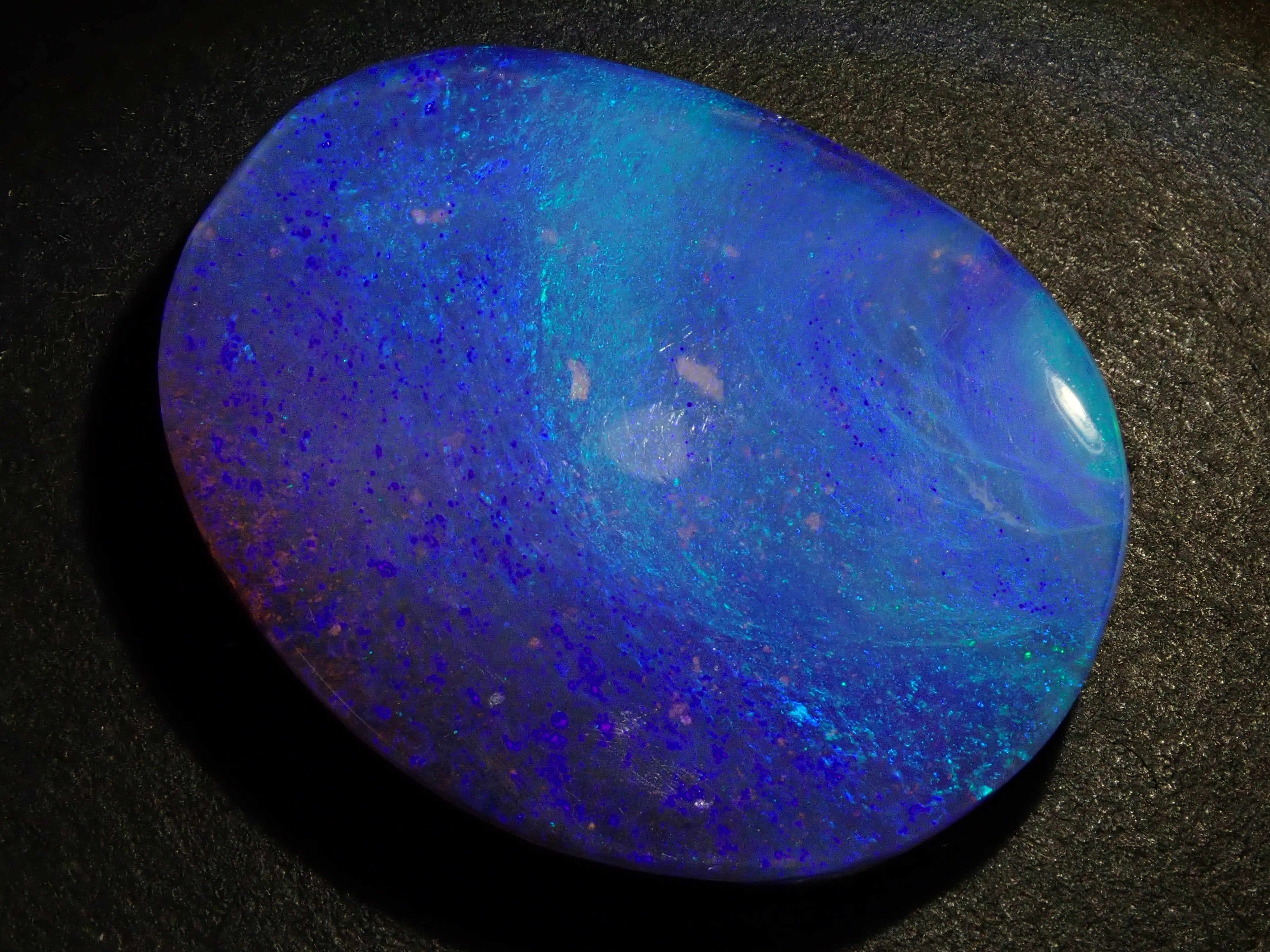 蛋白石是一種閃爍著彩虹色光芒的寶石。蛋白石有多種類型,其中,礫石蛋白石是指仍附著主岩的蛋白石。有些照片是用筆燈拍攝的。這是一顆高品質 23 克拉澳大利亞礫石蛋白石,具有美麗的藍色底色。