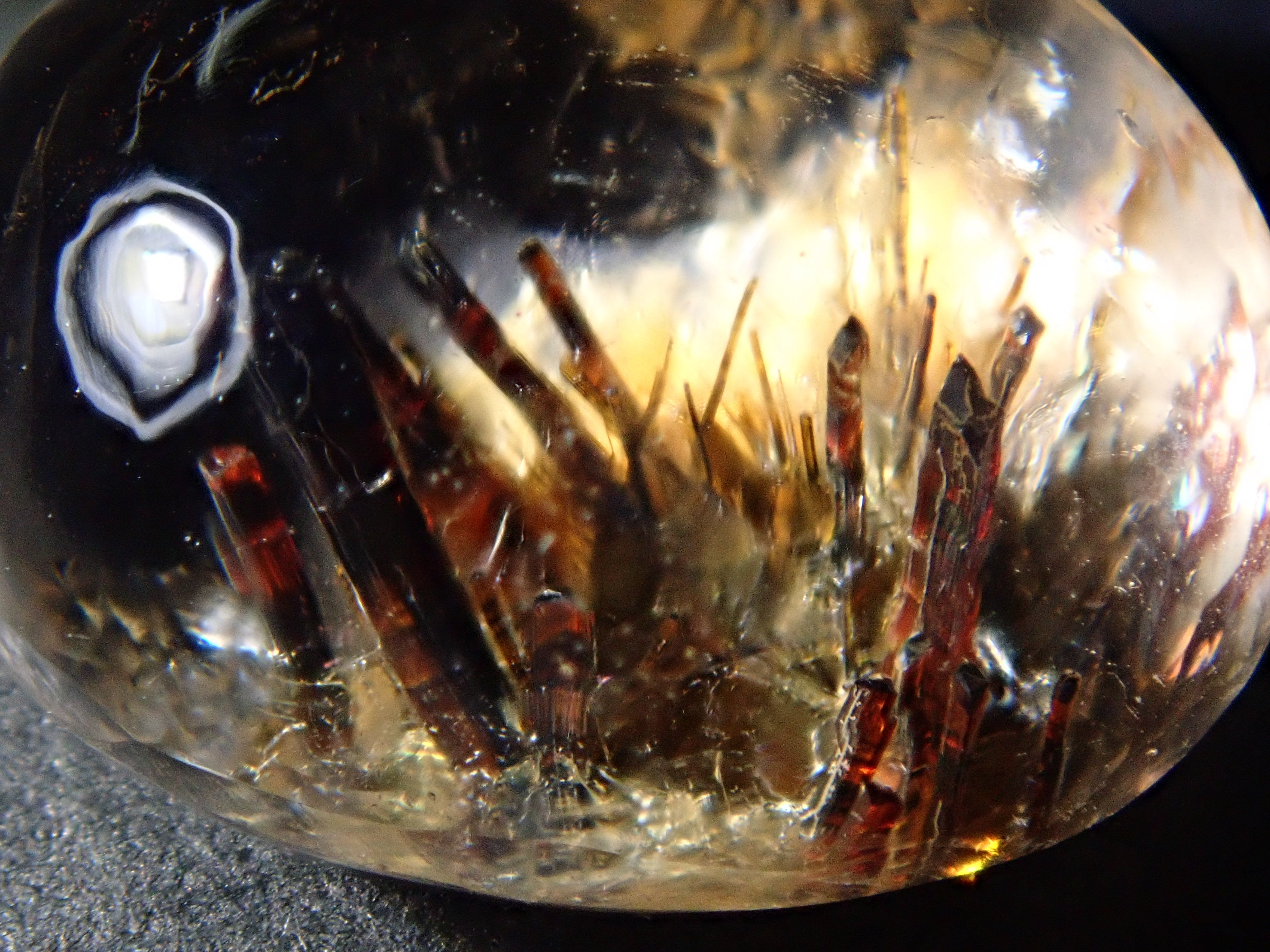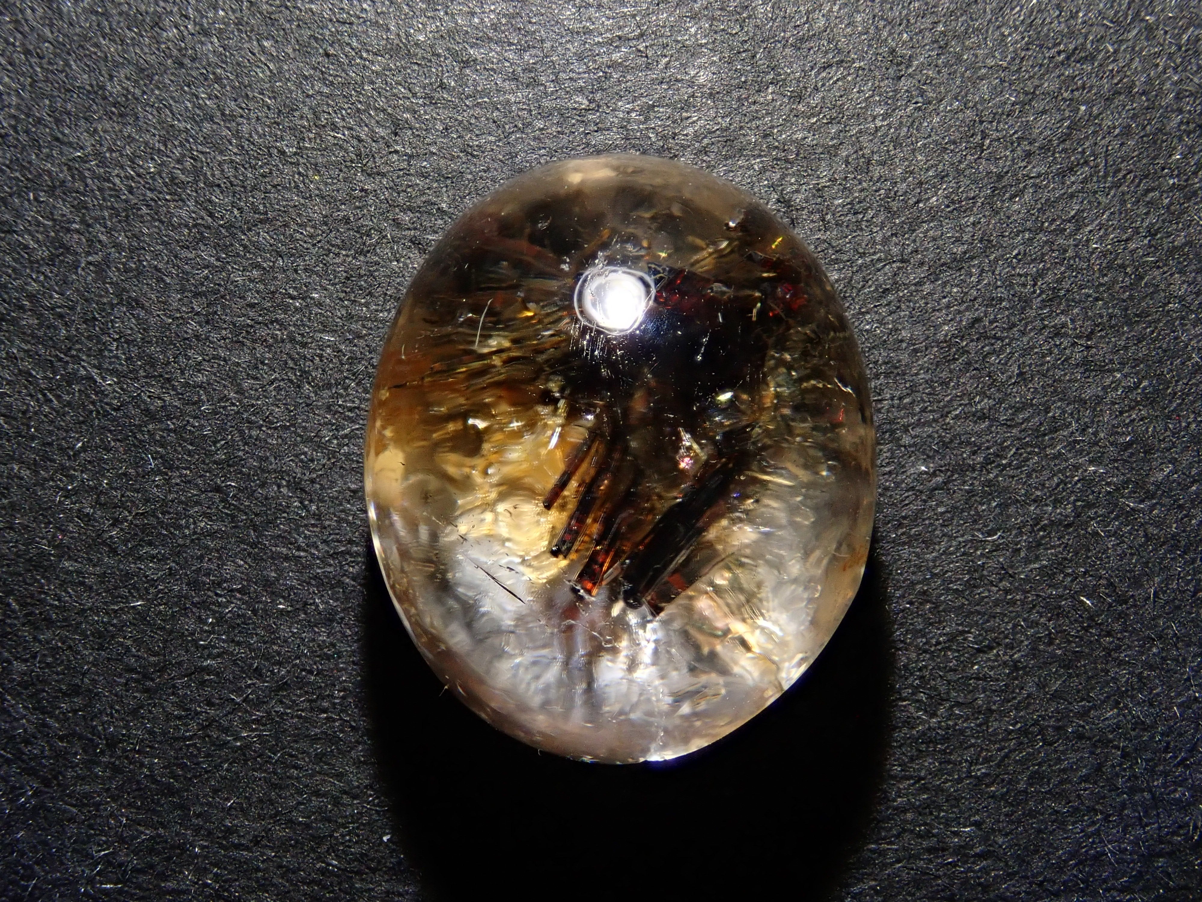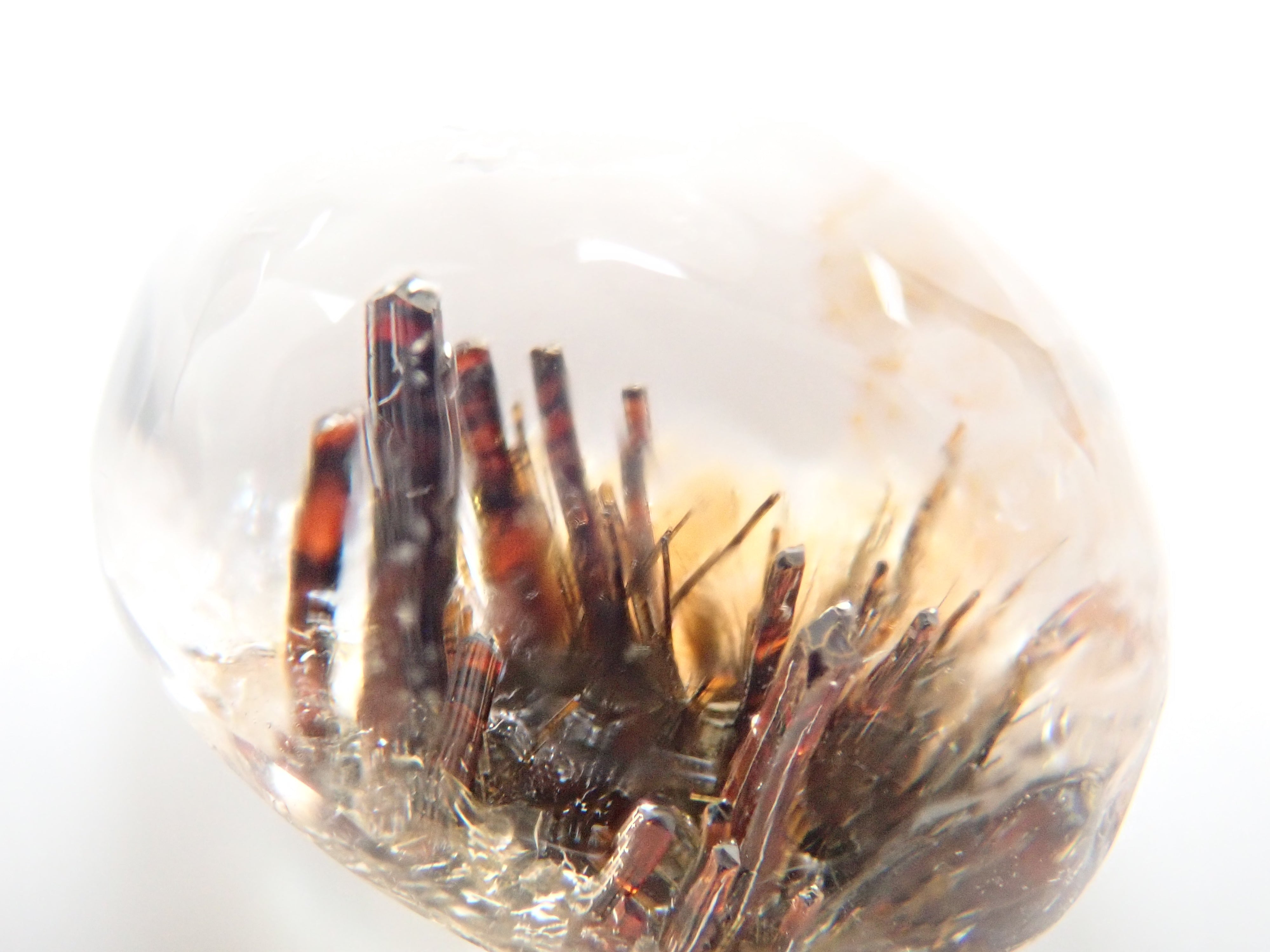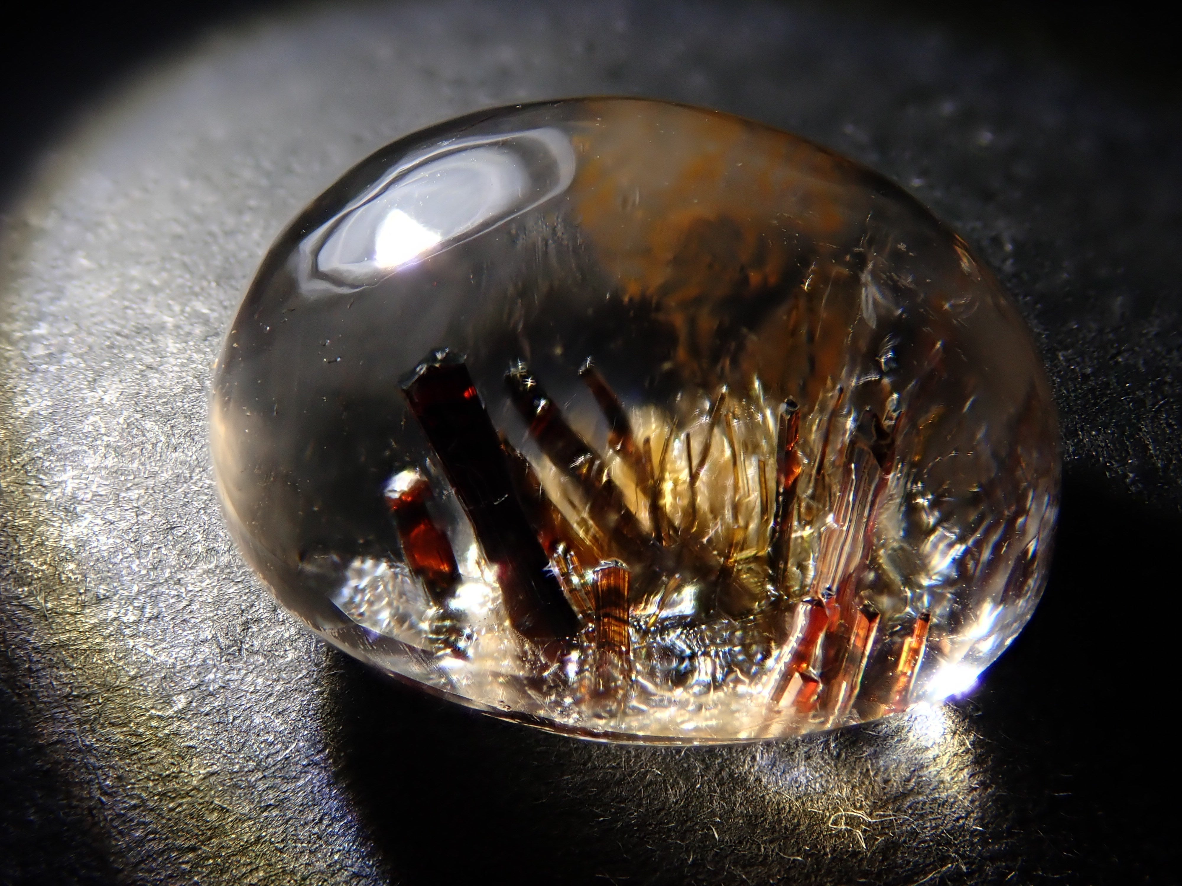 金紅石石英具有美麗的金色光澤。將一根由金紅石製成的「金針」插入晶體中。日本名字是“Kinkoishi”。又稱「金髮晶」、「發晶石」、「發晶石」等。攝影時使用筆形燈捕捉內含物的美麗光芒。