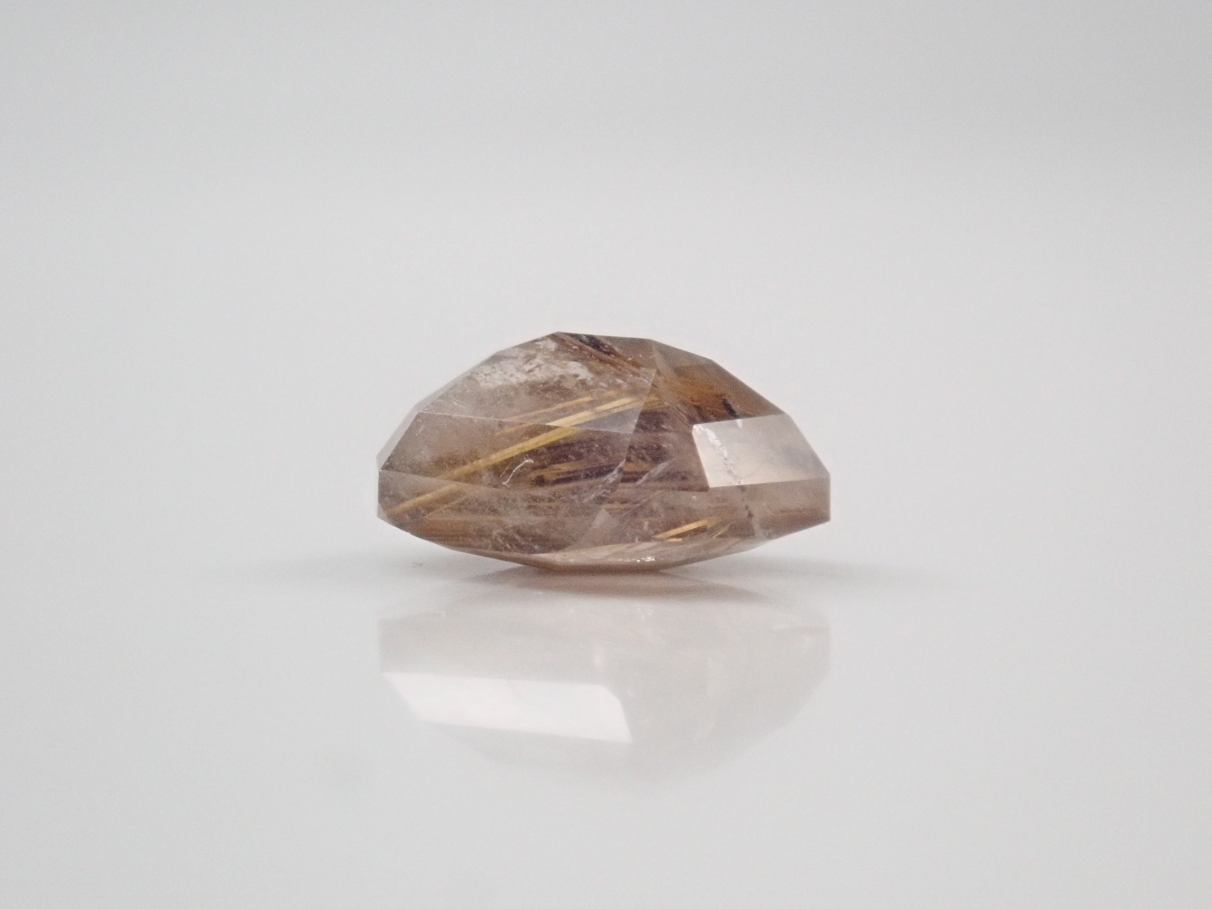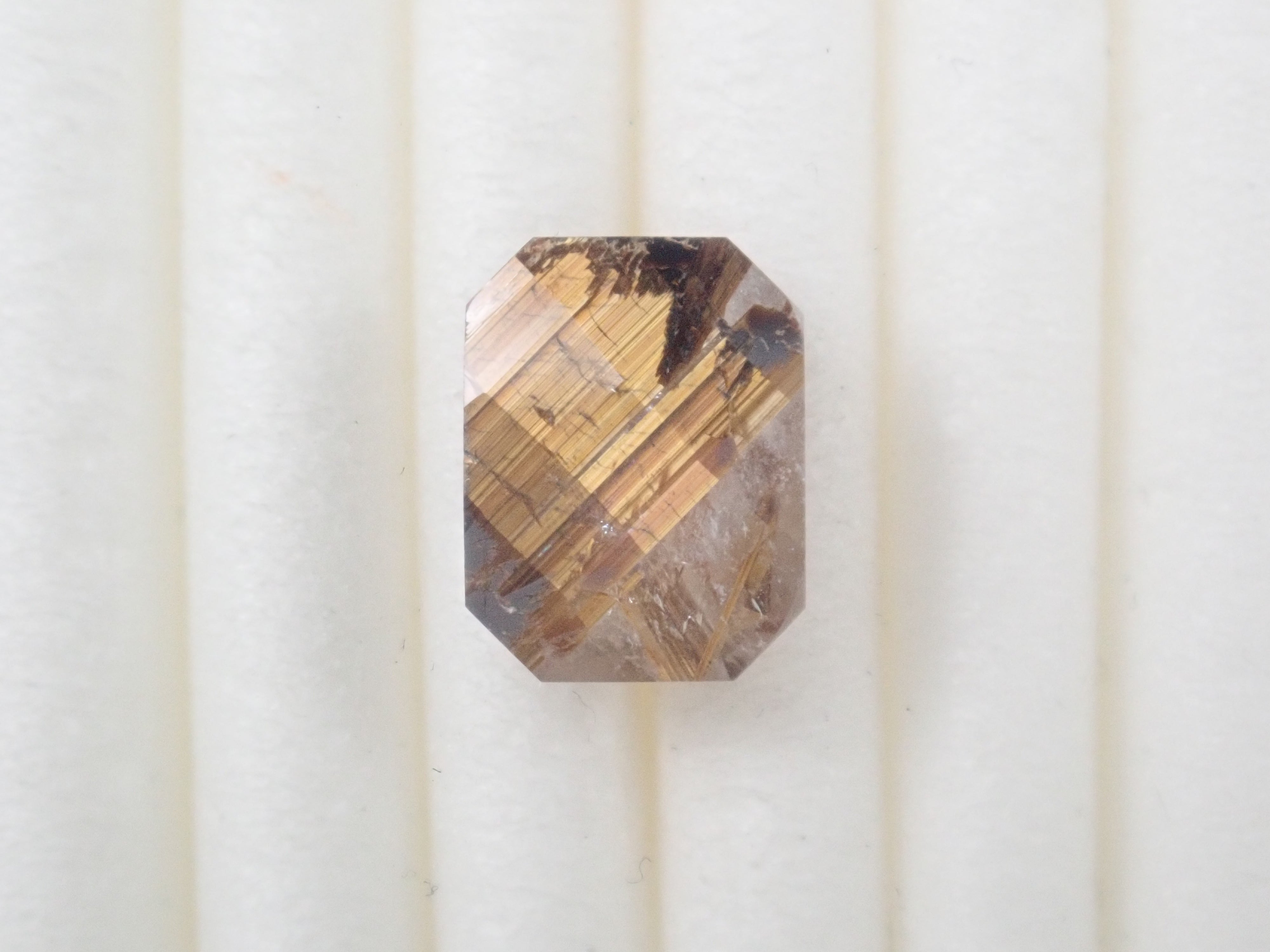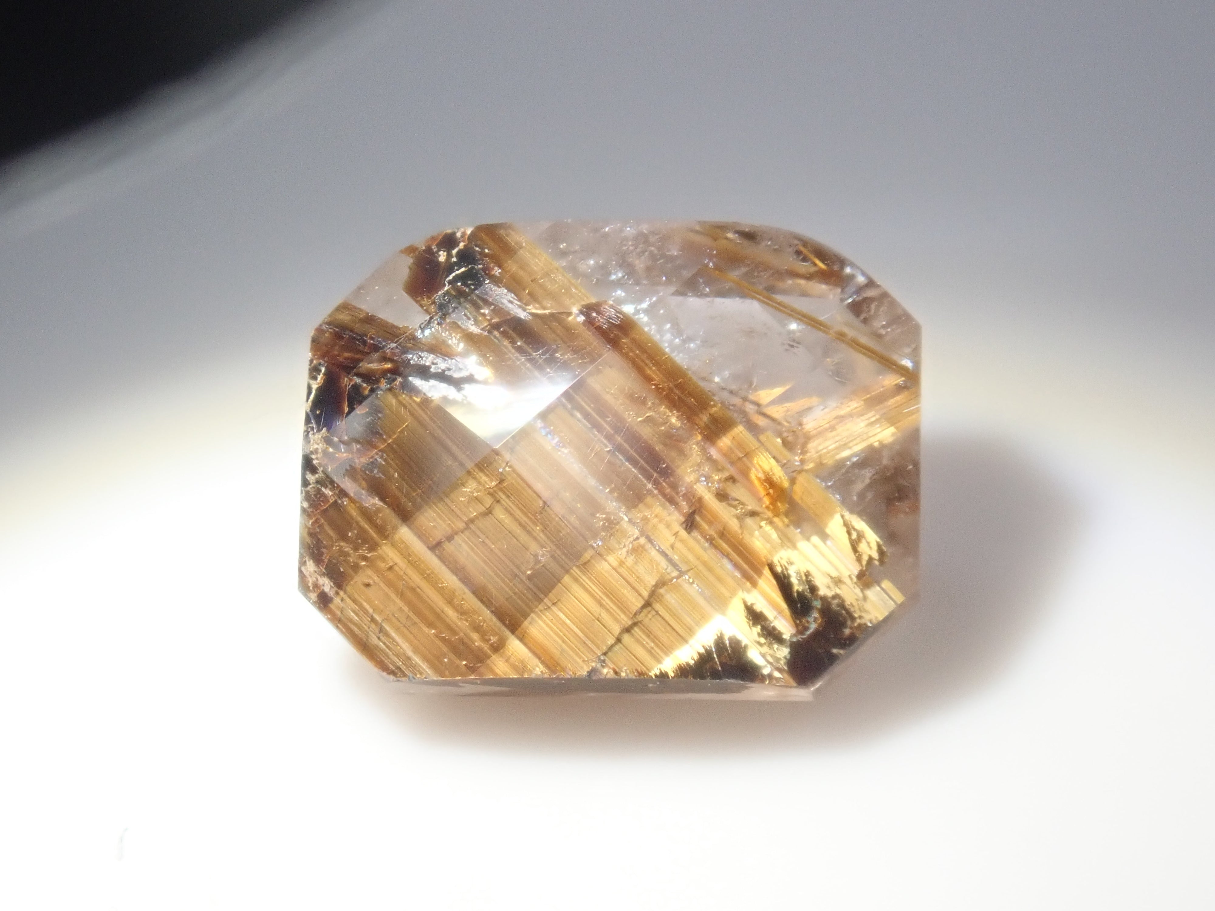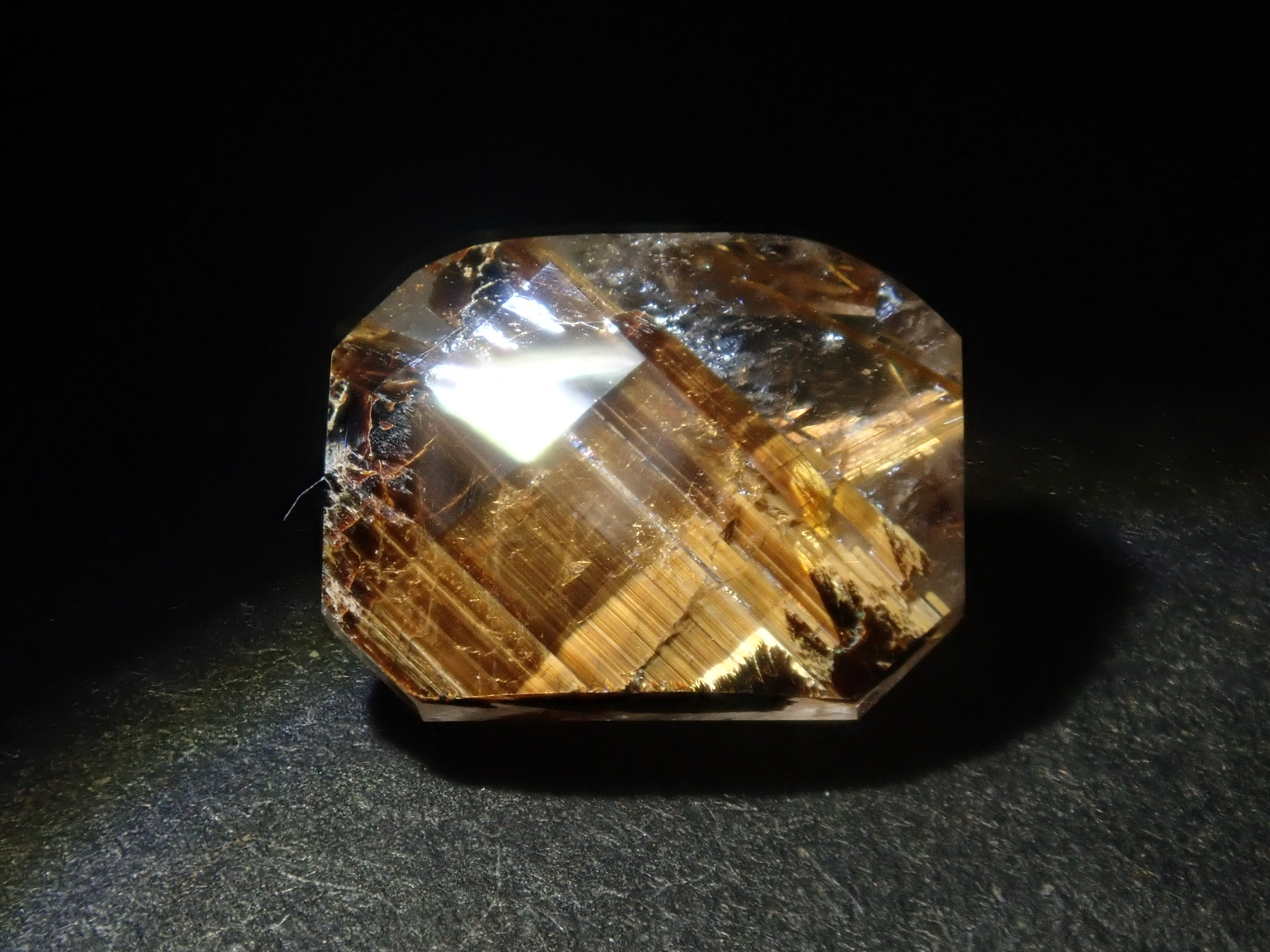 金紅石石英散發著美麗的金色光澤。晶體中鑲嵌著由金紅石製成的「金針」。日文名稱為「金流石」。這是一種被稱為銅金紅石的石英。照片中使用了筆型手電筒來捕捉內含物的美麗光澤。
