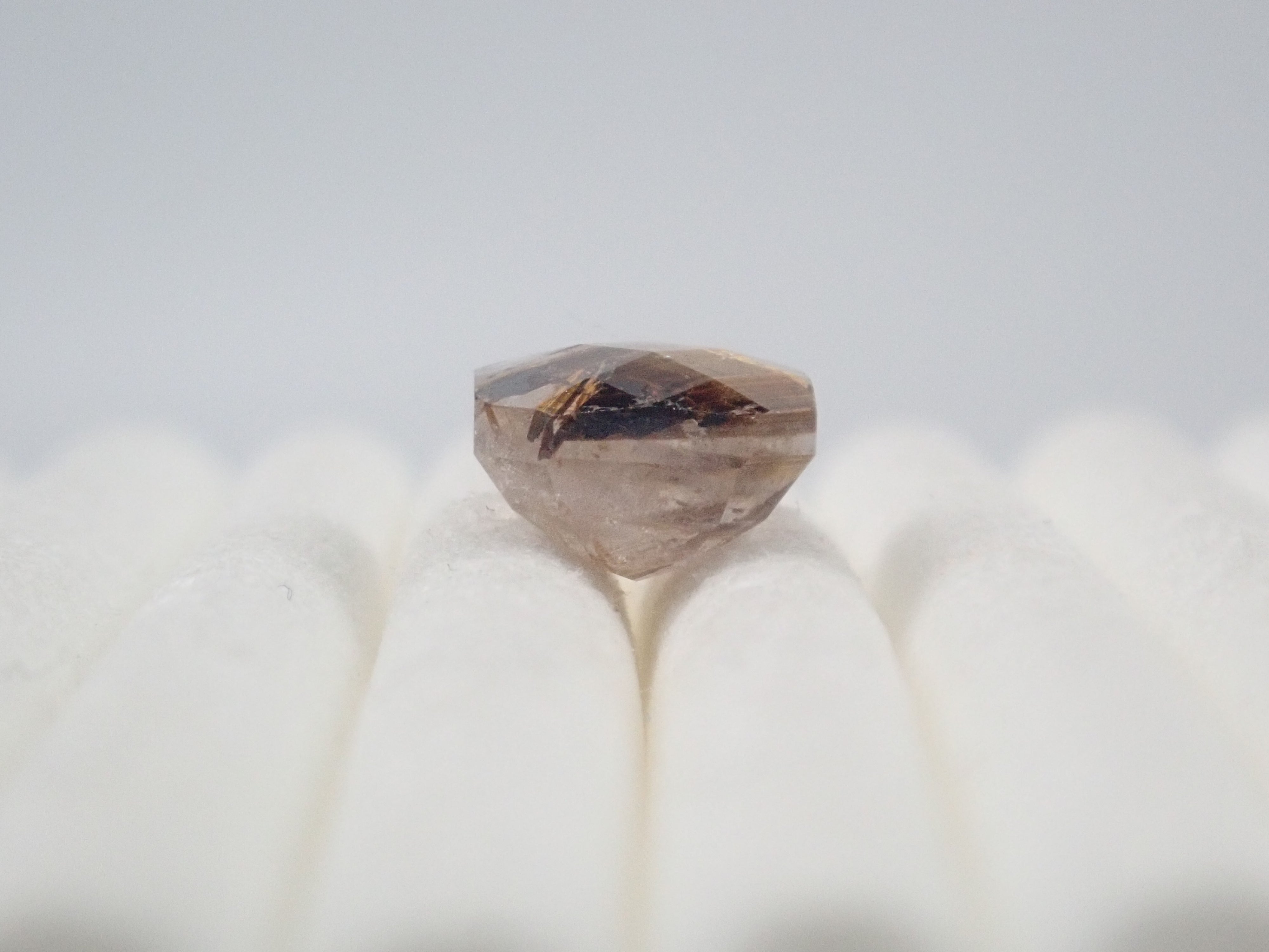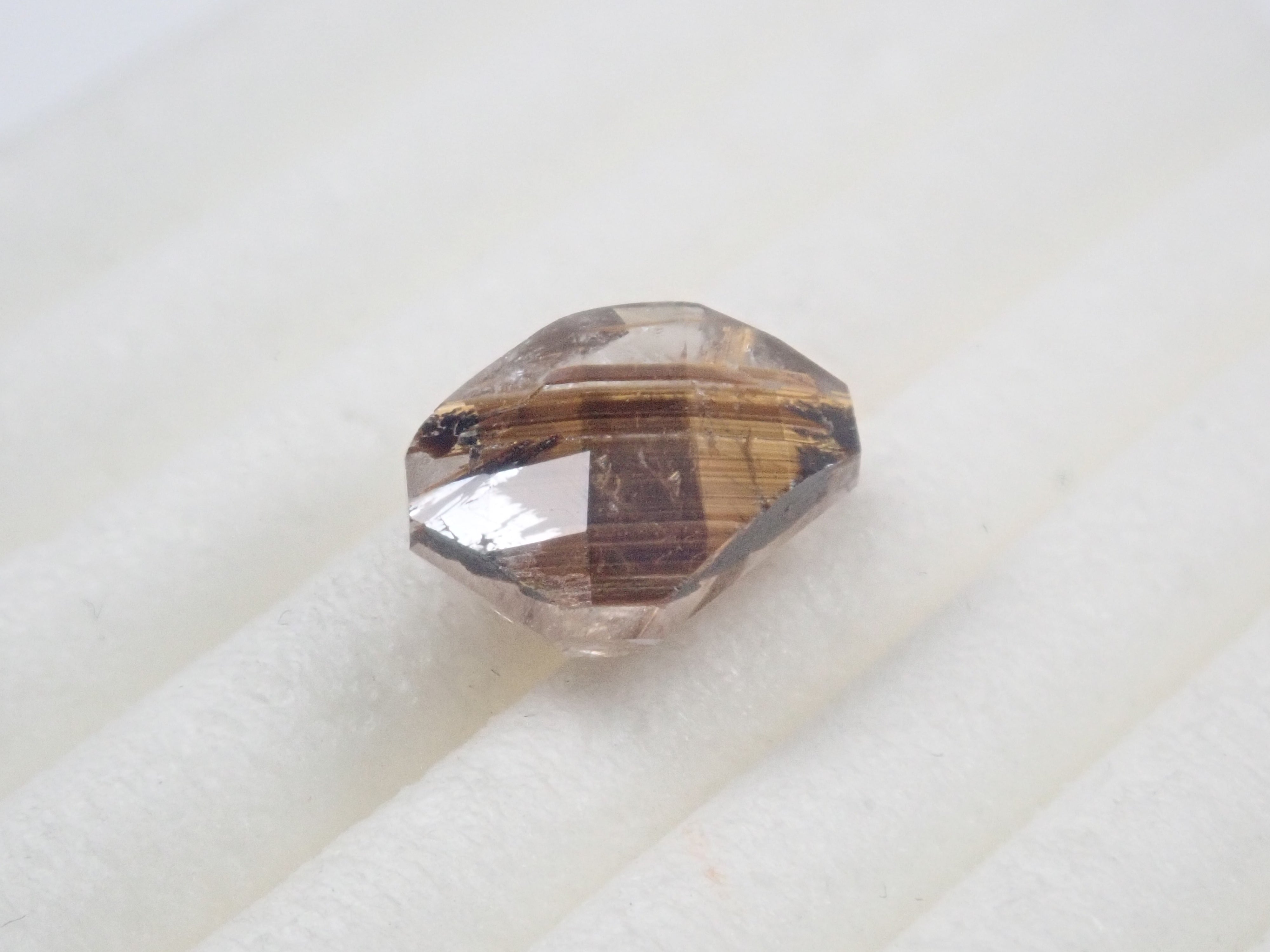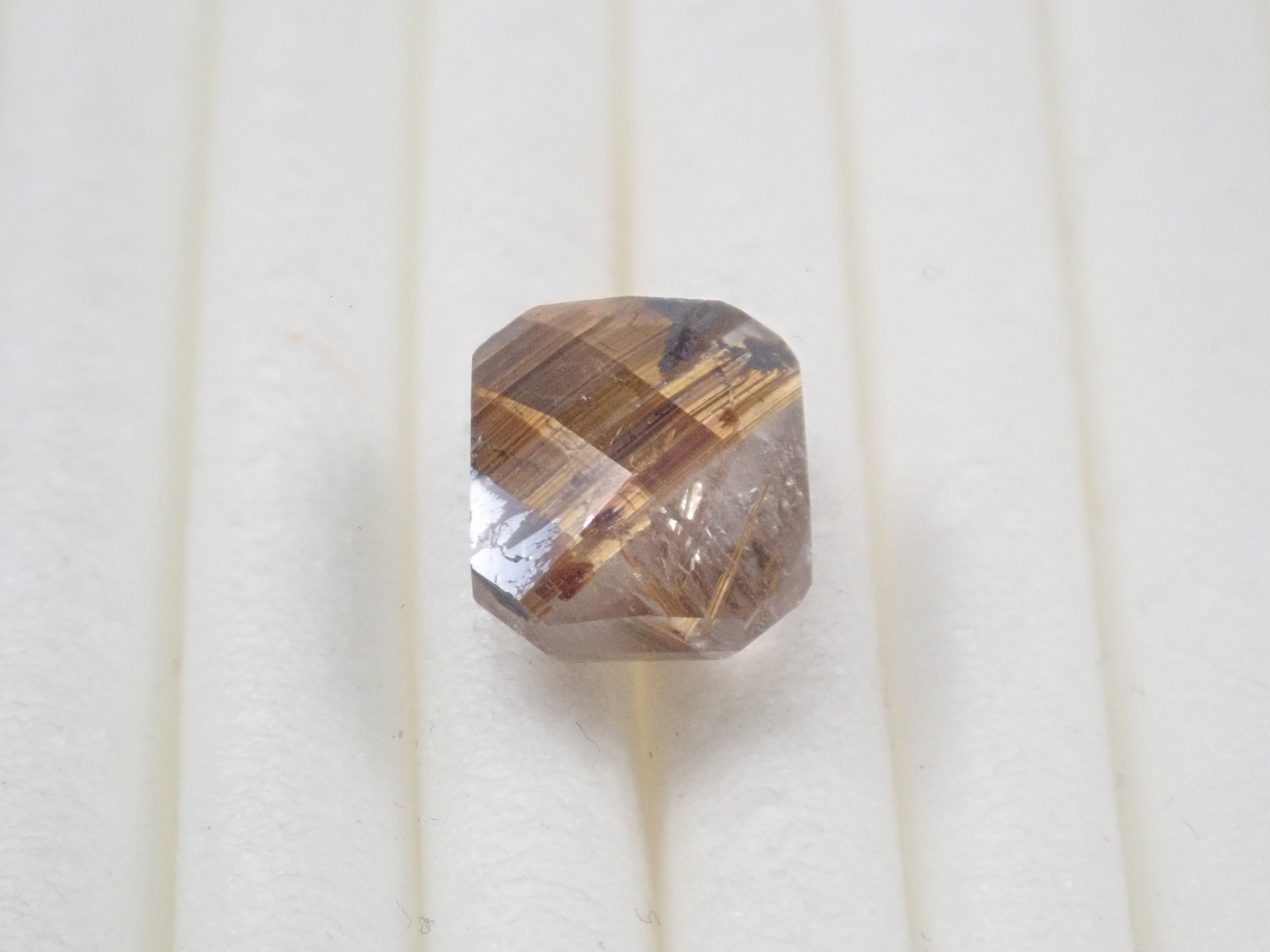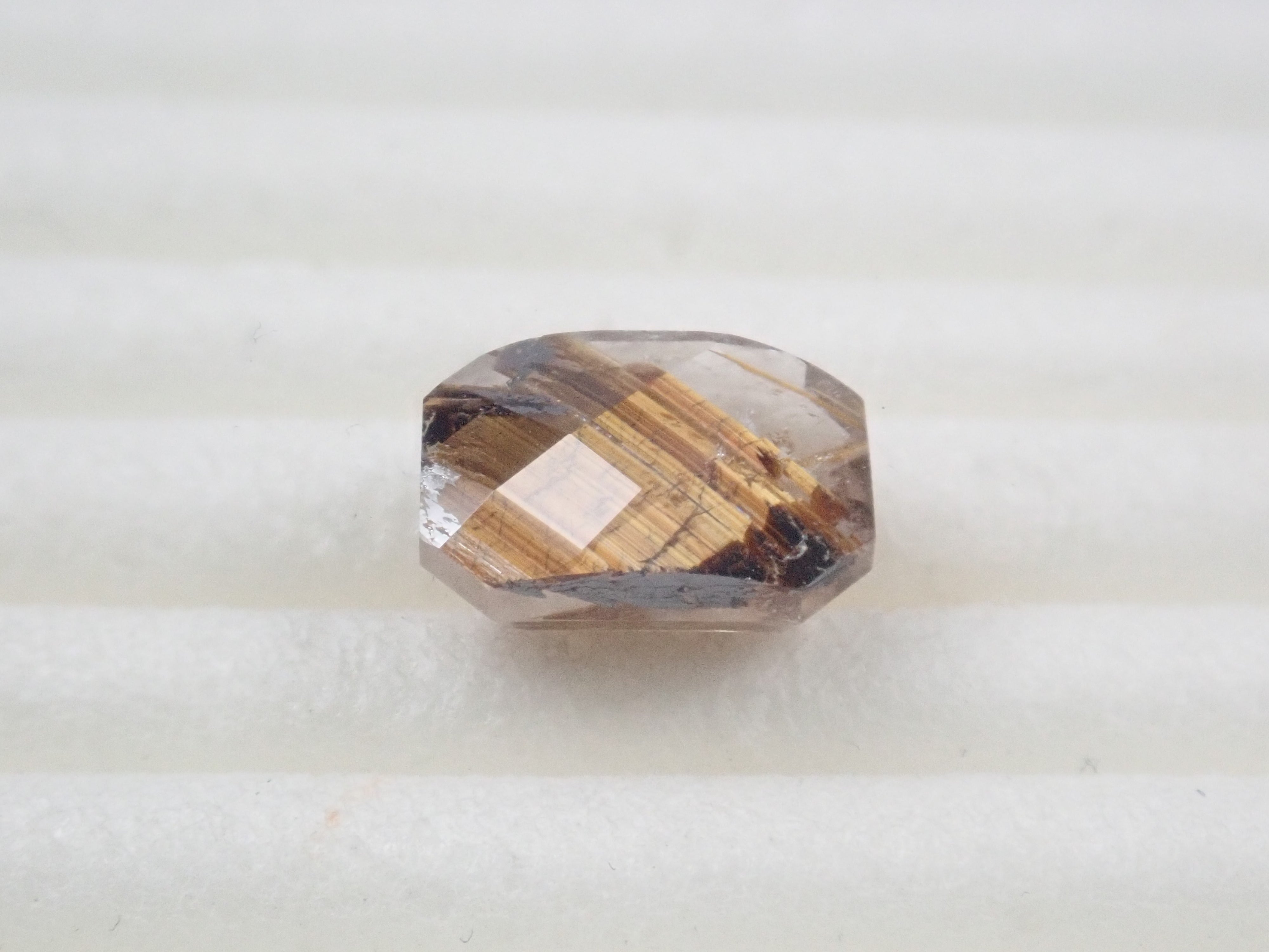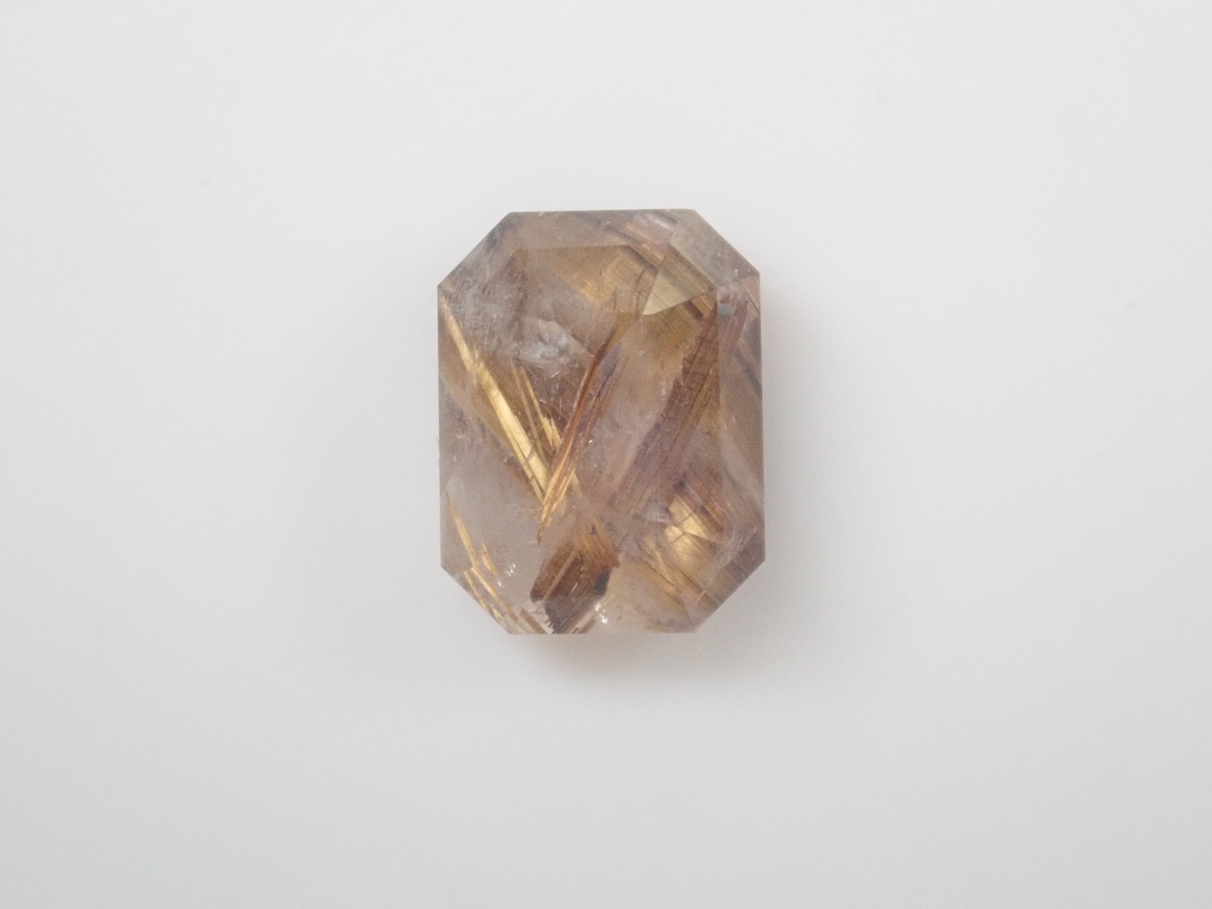 金紅石石英散發著美麗的金色光澤。晶體中鑲嵌著由金紅石製成的「金針」。日文名稱為「金流石」。這是一種被稱為銅金紅石的石英。照片中使用了筆型手電筒來捕捉內含物的美麗光澤。