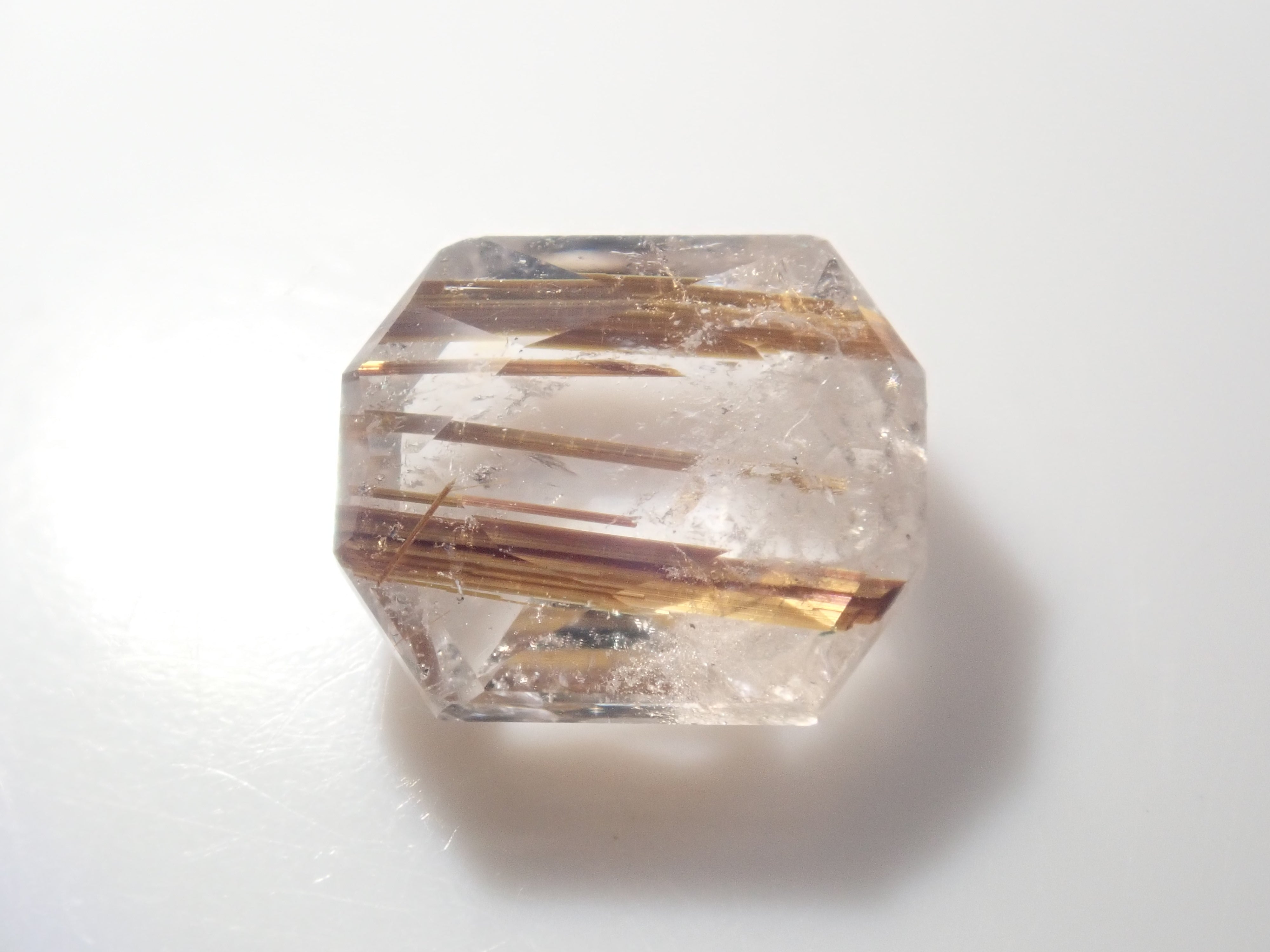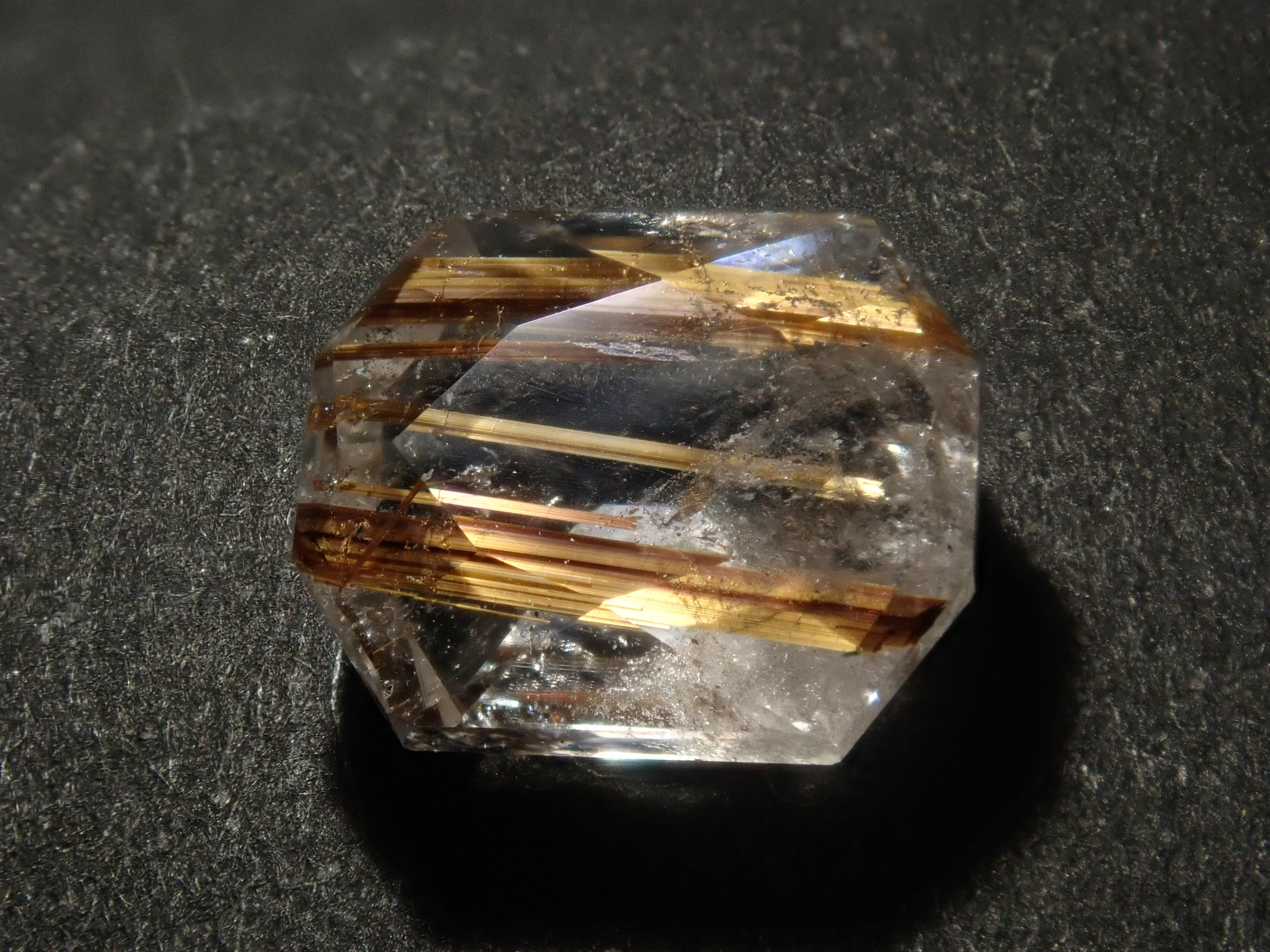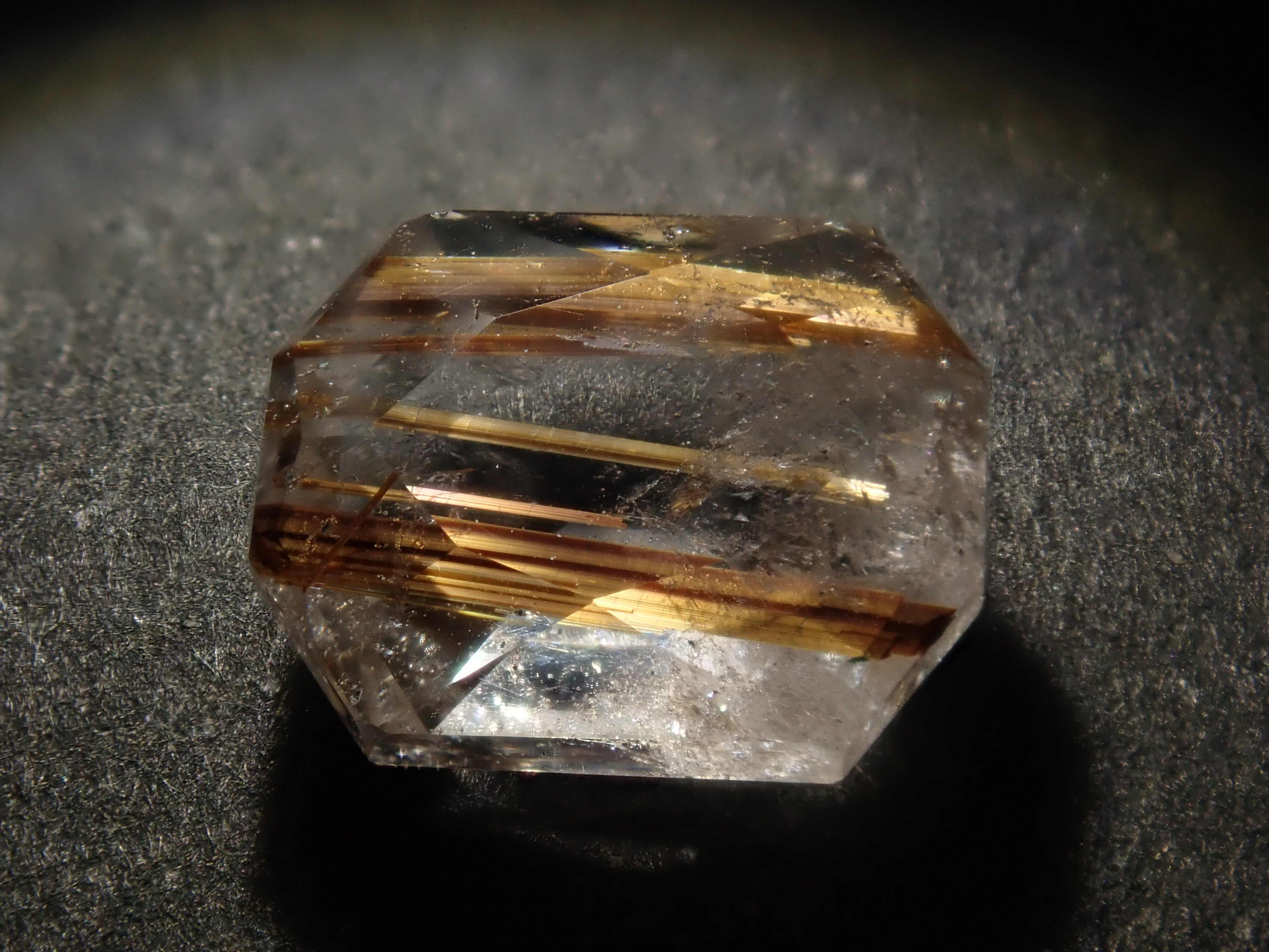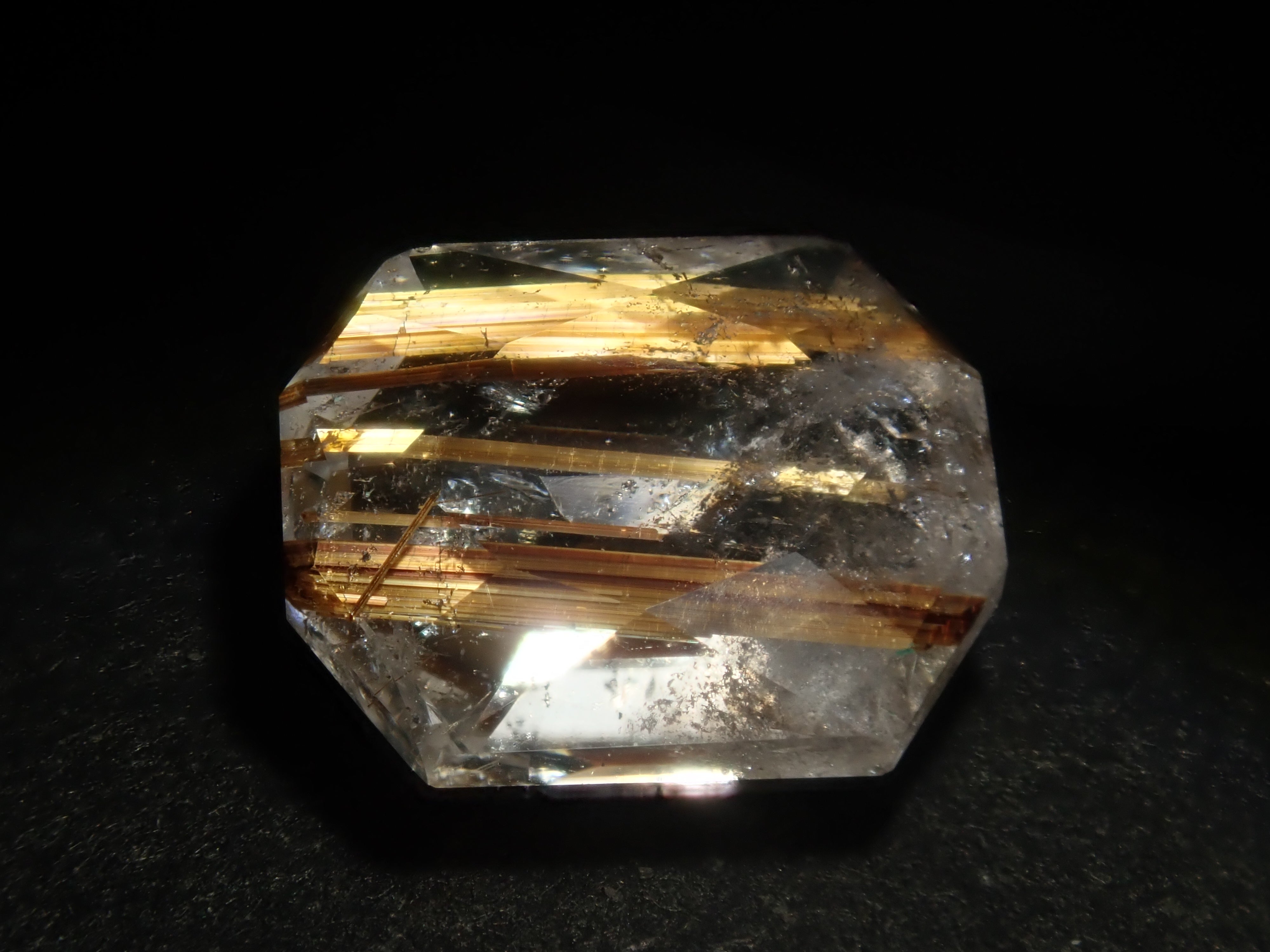 金紅石石英散發著美麗的金色光澤。晶體中鑲嵌著由金紅石製成的「金針」。日文名稱為「金流石」。這是一種被稱為銅金紅石的石英。照片中使用了筆型手電筒來捕捉內含物的美麗光澤。