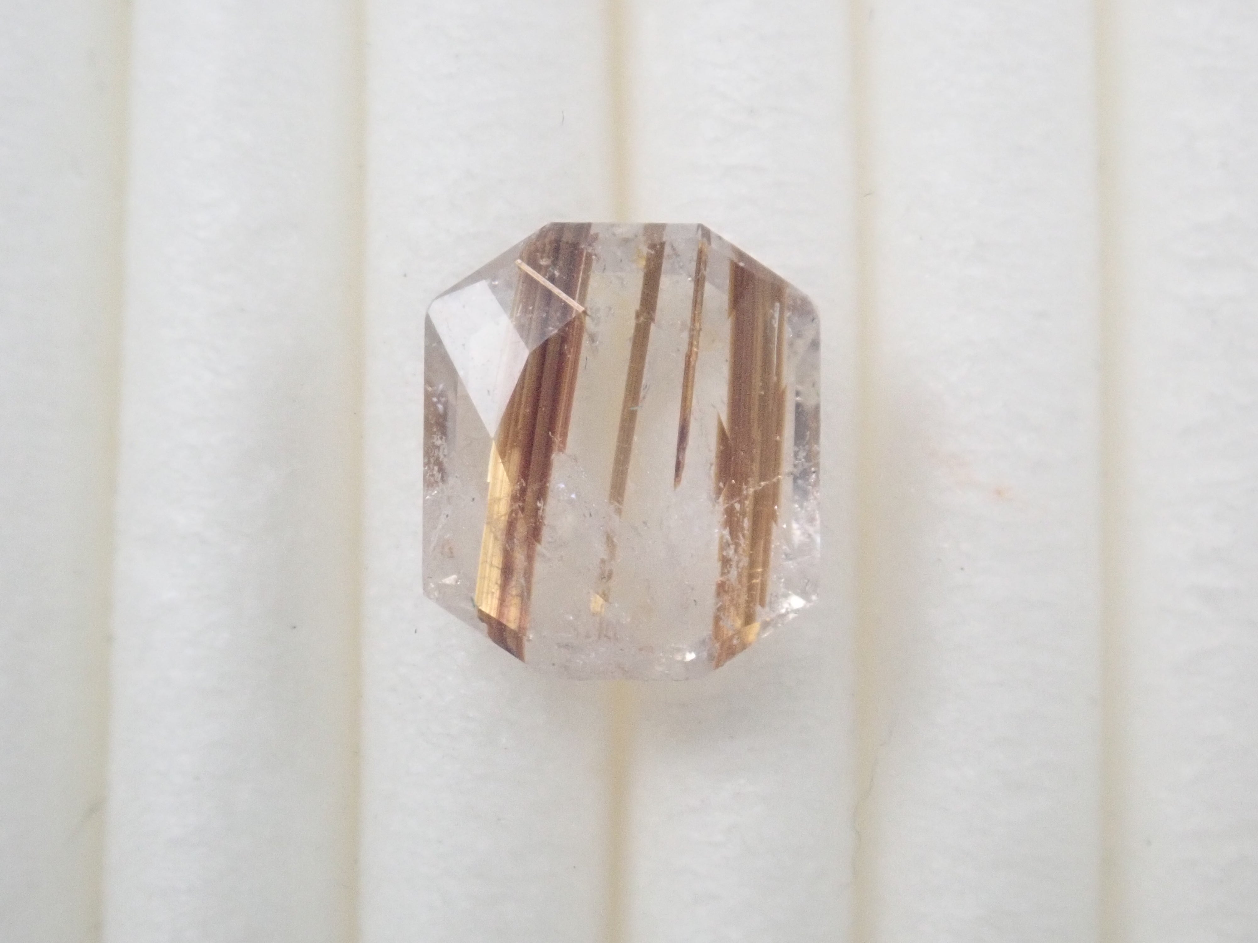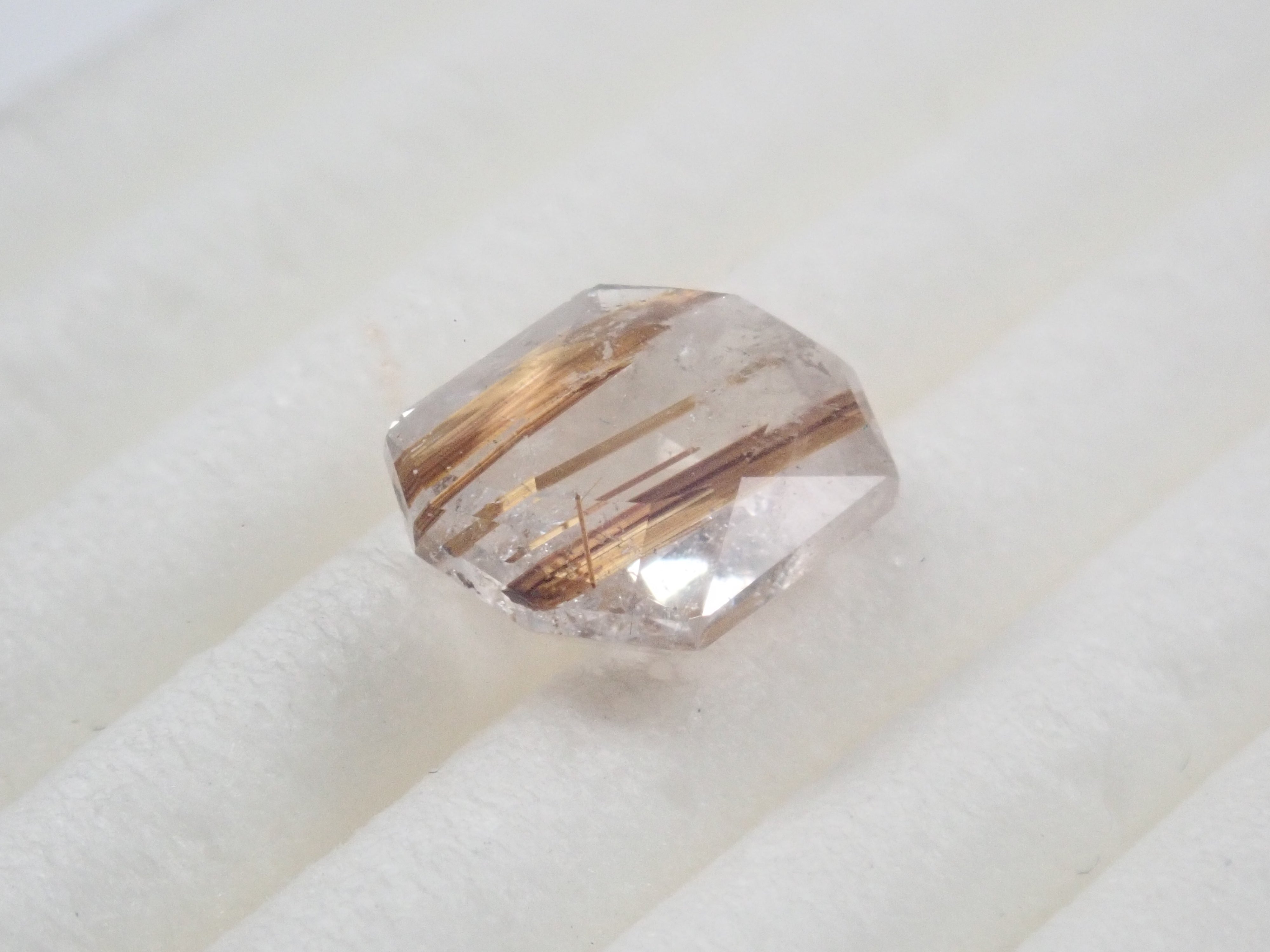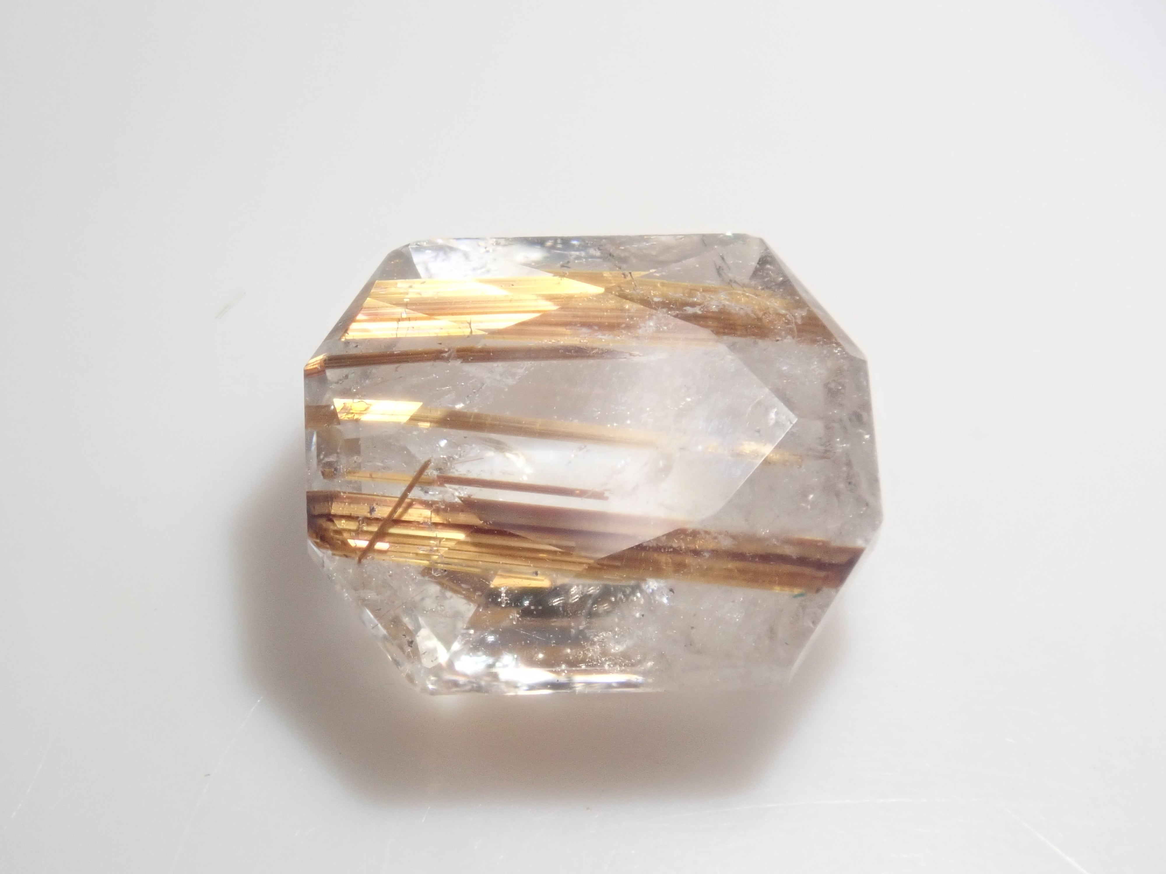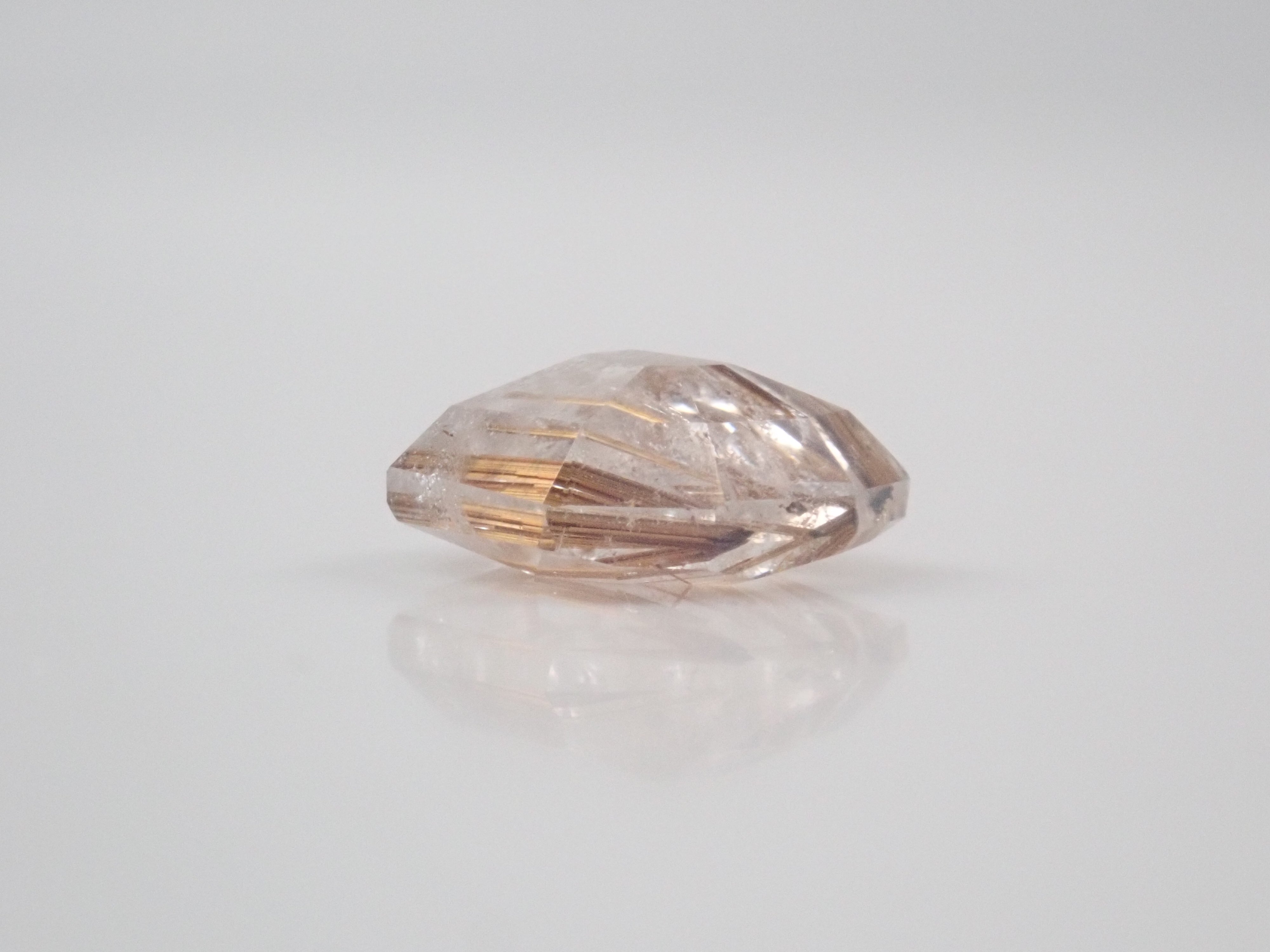 金紅石石英散發著美麗的金色光澤。晶體中鑲嵌著由金紅石製成的「金針」。日文名稱為「金流石」。這是一種被稱為銅金紅石的石英。照片中使用了筆型手電筒來捕捉內含物的美麗光澤。