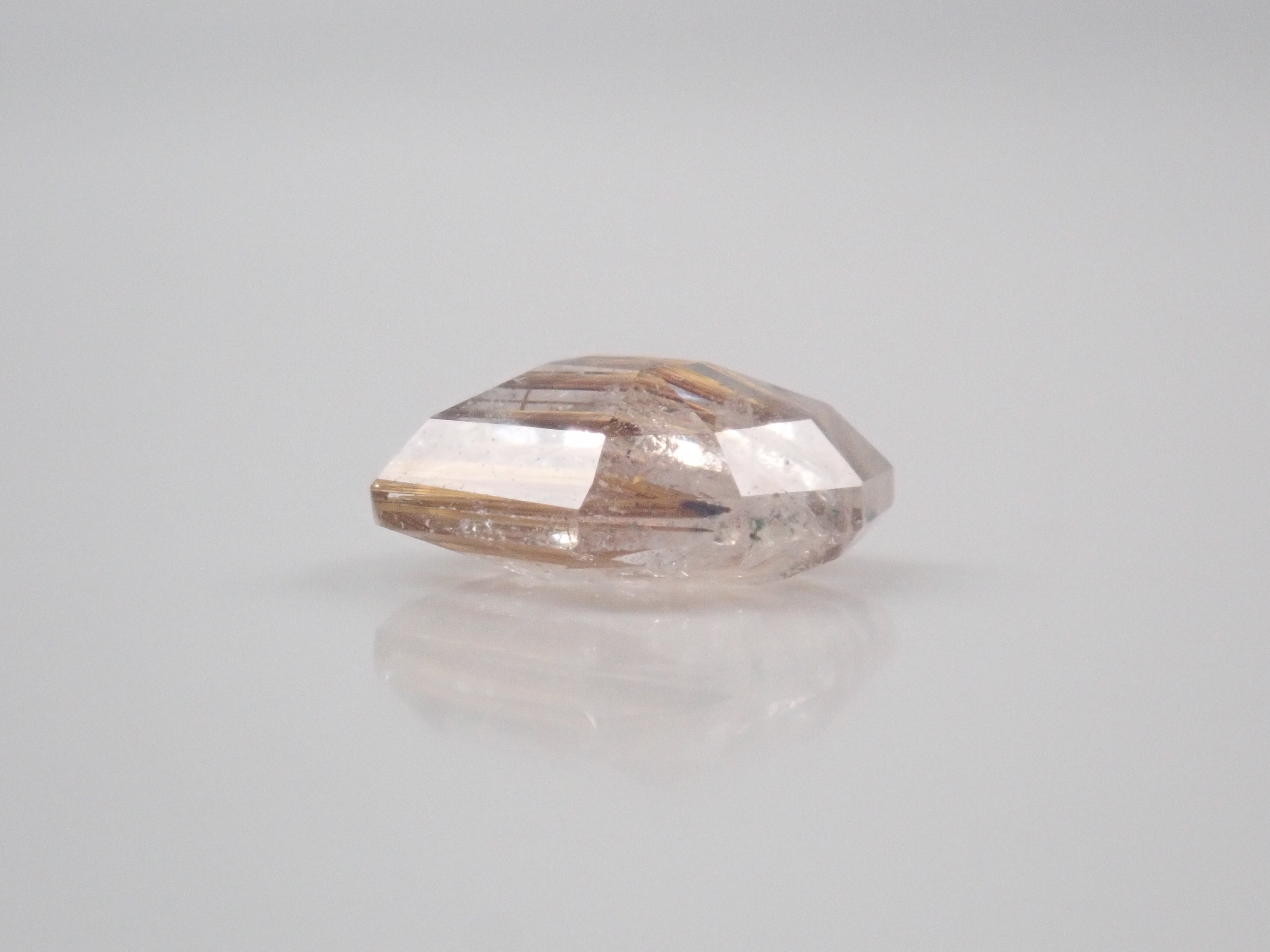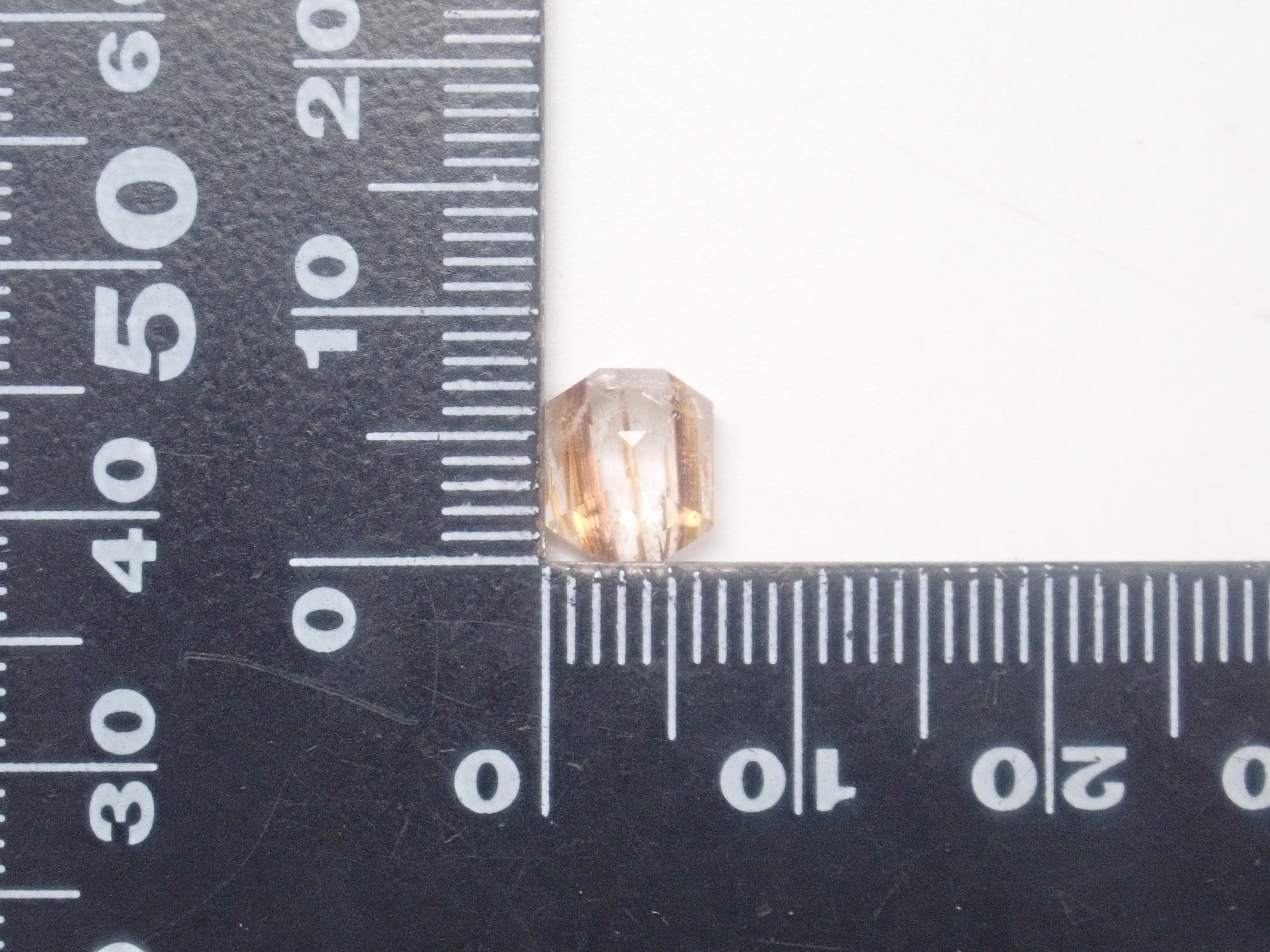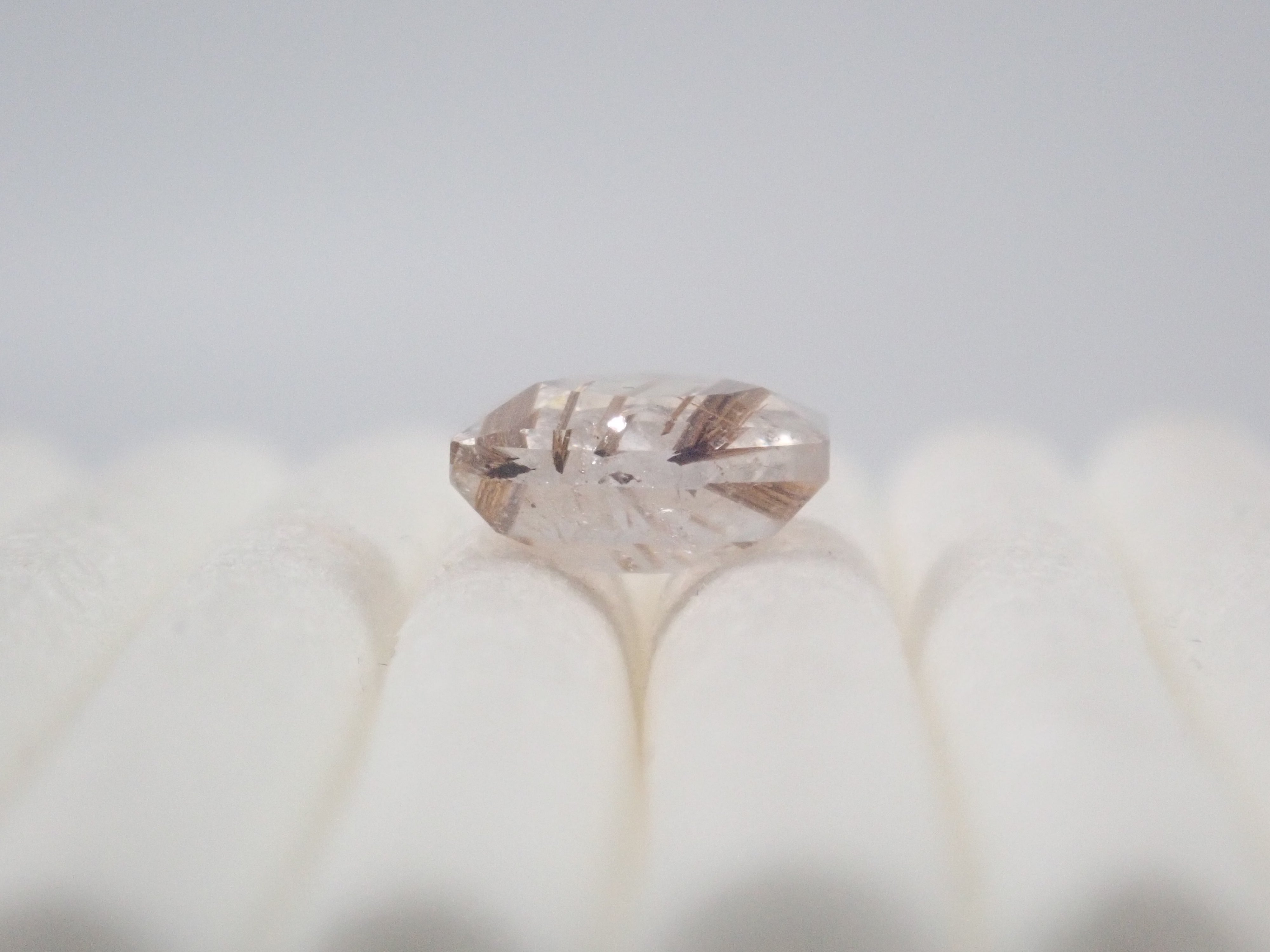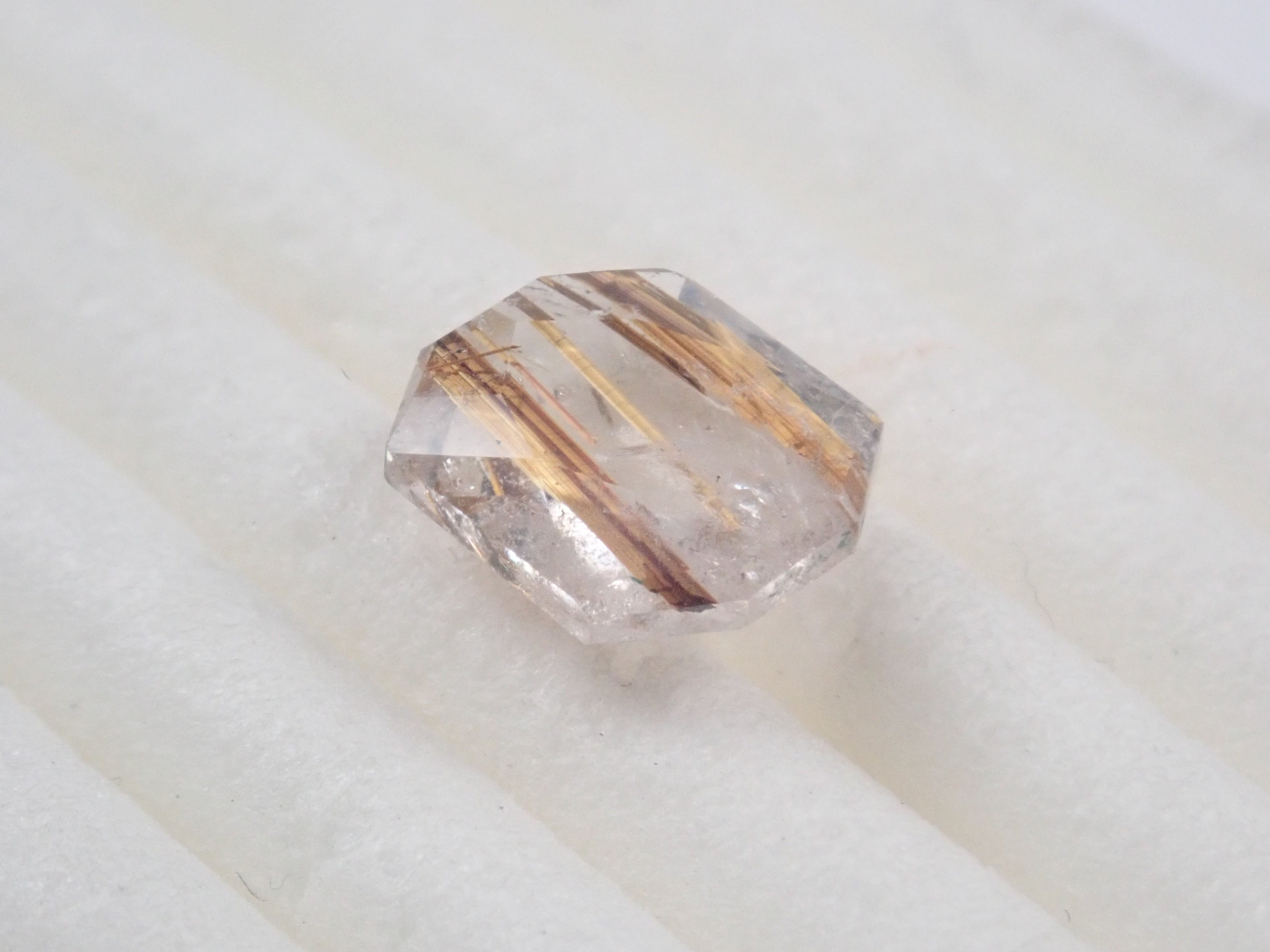 金紅石石英散發著美麗的金色光澤。晶體中鑲嵌著由金紅石製成的「金針」。日文名稱為「金流石」。這是一種被稱為銅金紅石的石英。照片中使用了筆型手電筒來捕捉內含物的美麗光澤。