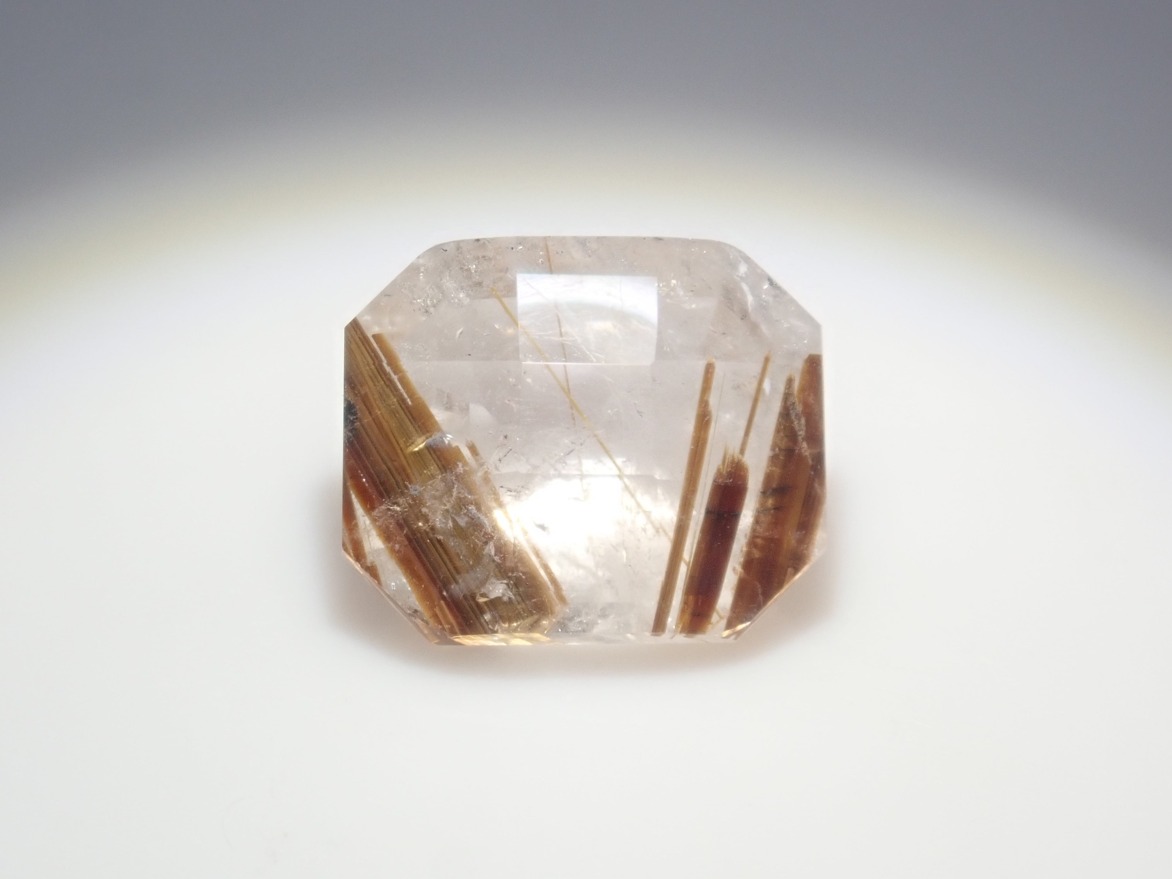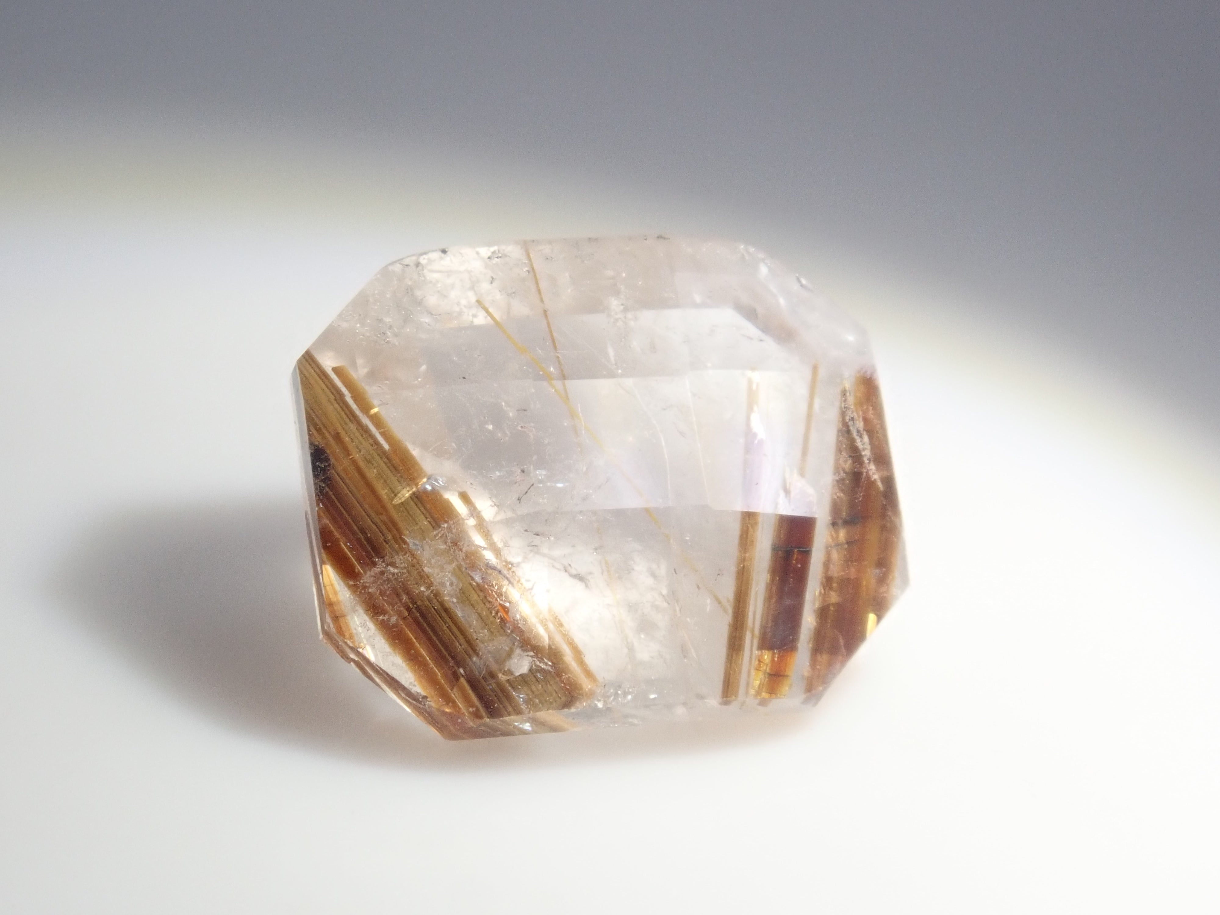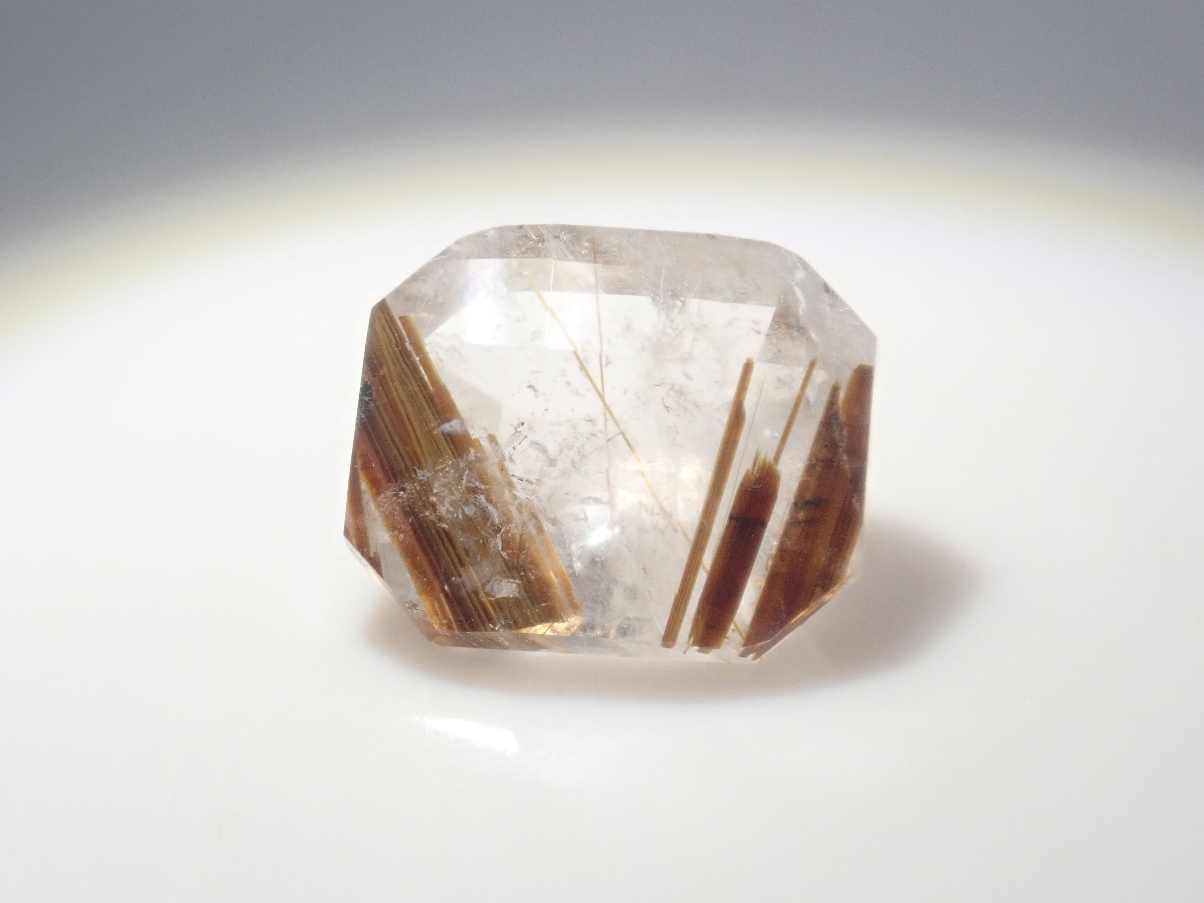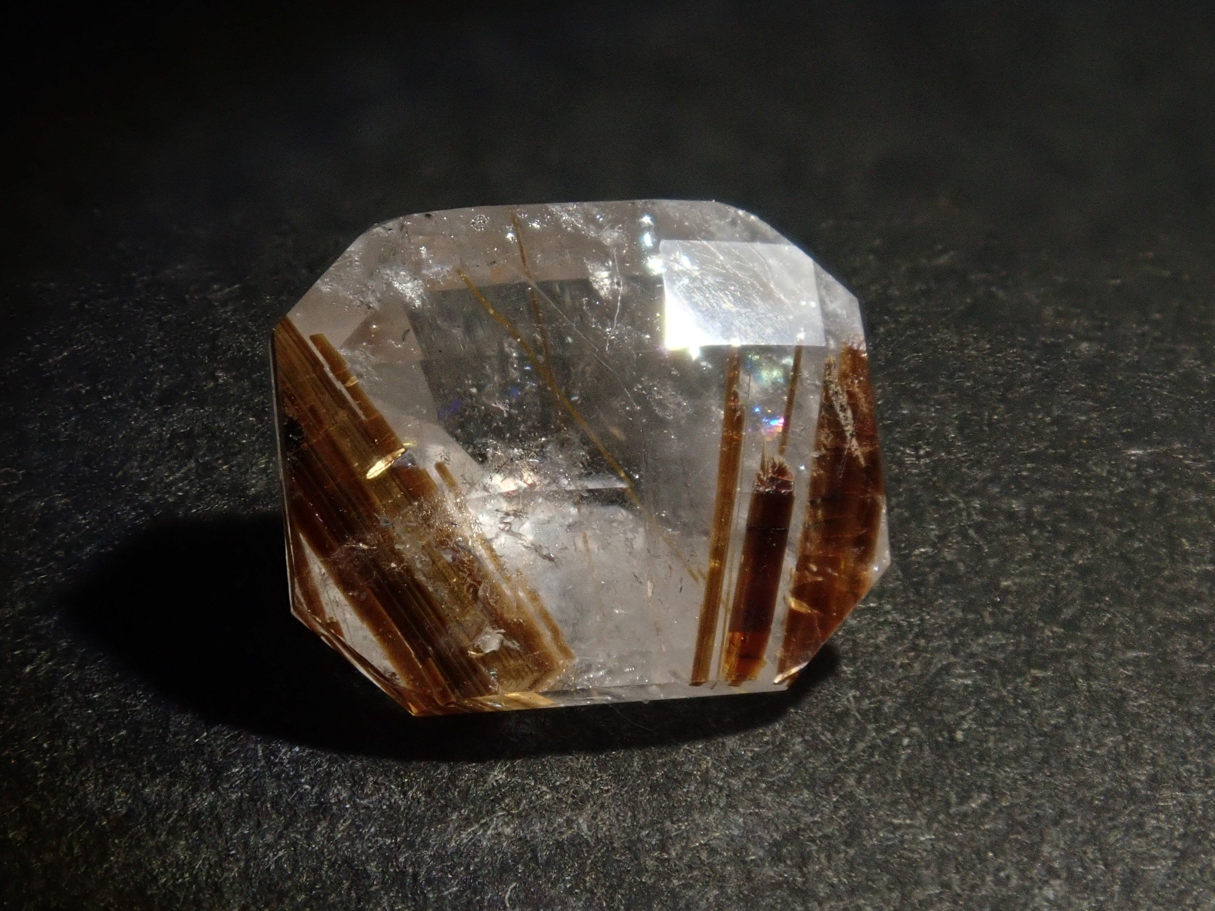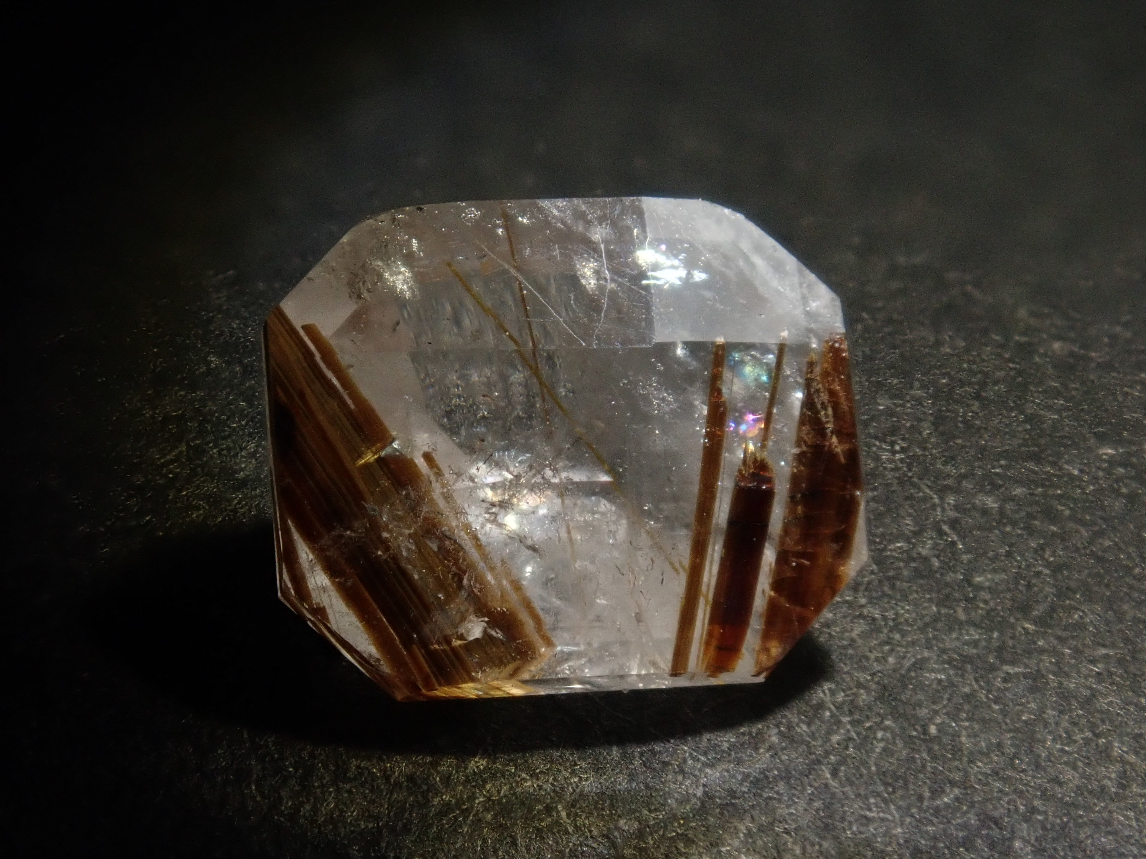 金紅石石英散發著美麗的金色光澤。晶體中鑲嵌著由金紅石製成的「金針」。日文名稱為「金流石」。這是一種被稱為銅金紅石的石英。照片中使用了筆型手電筒來捕捉內含物的美麗光澤。