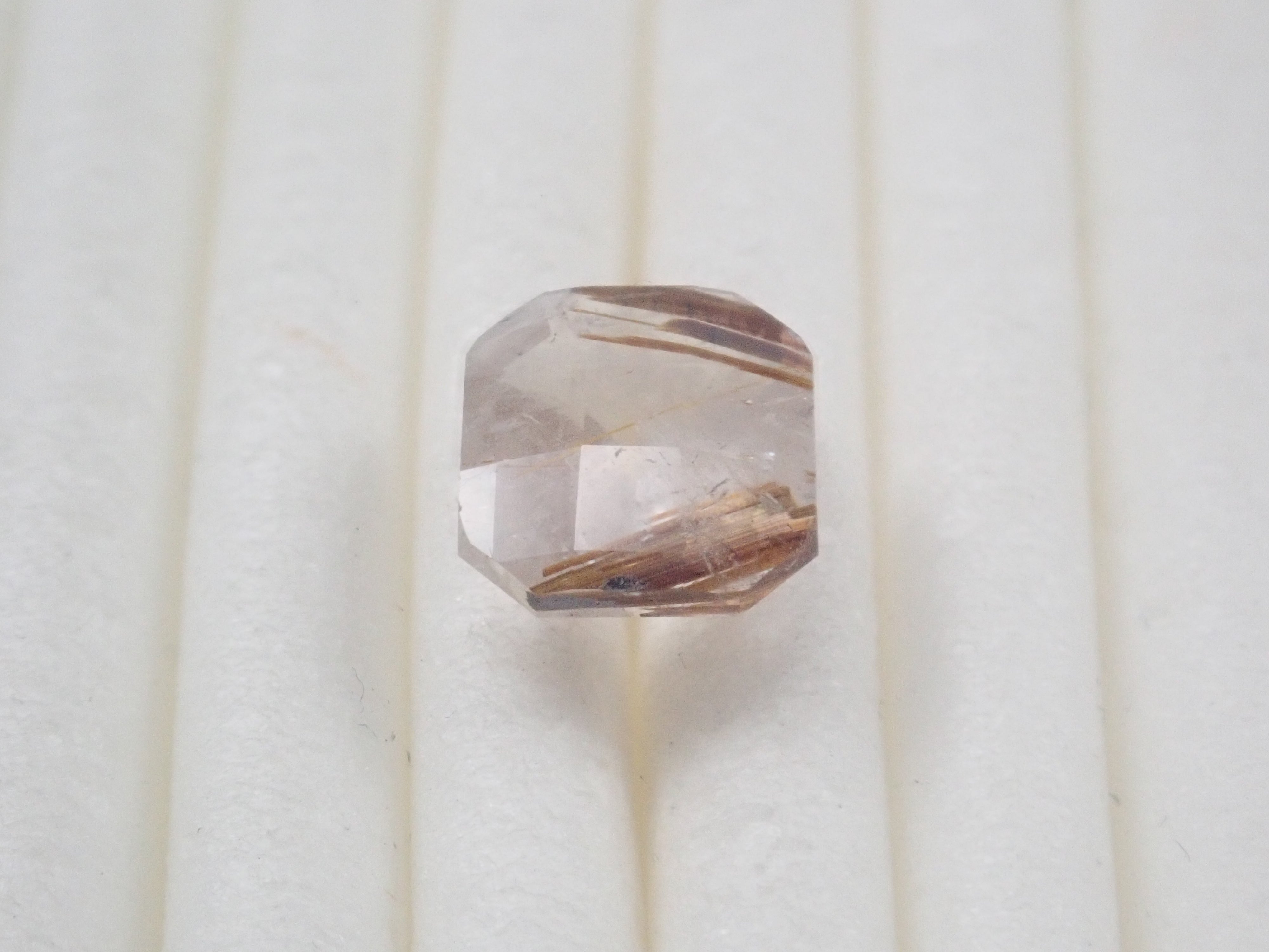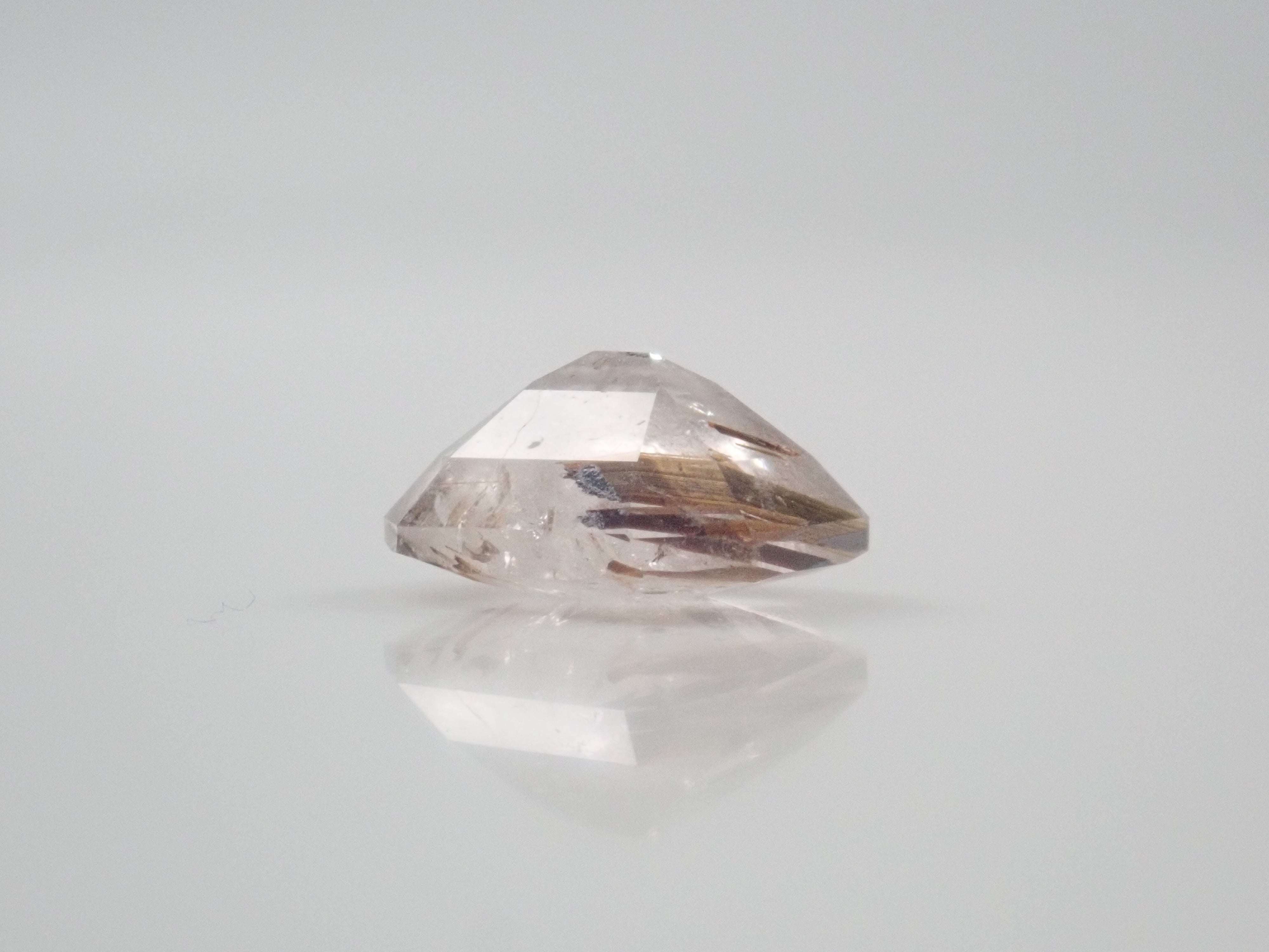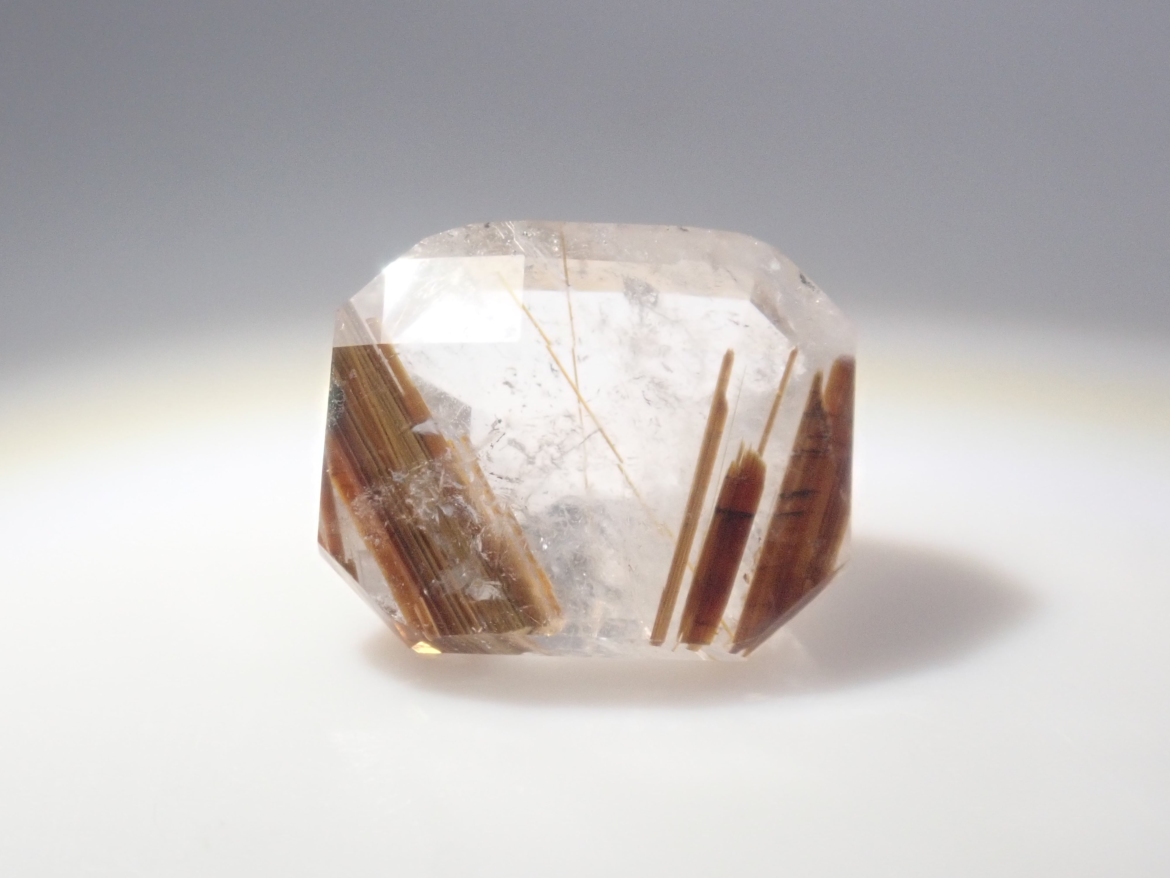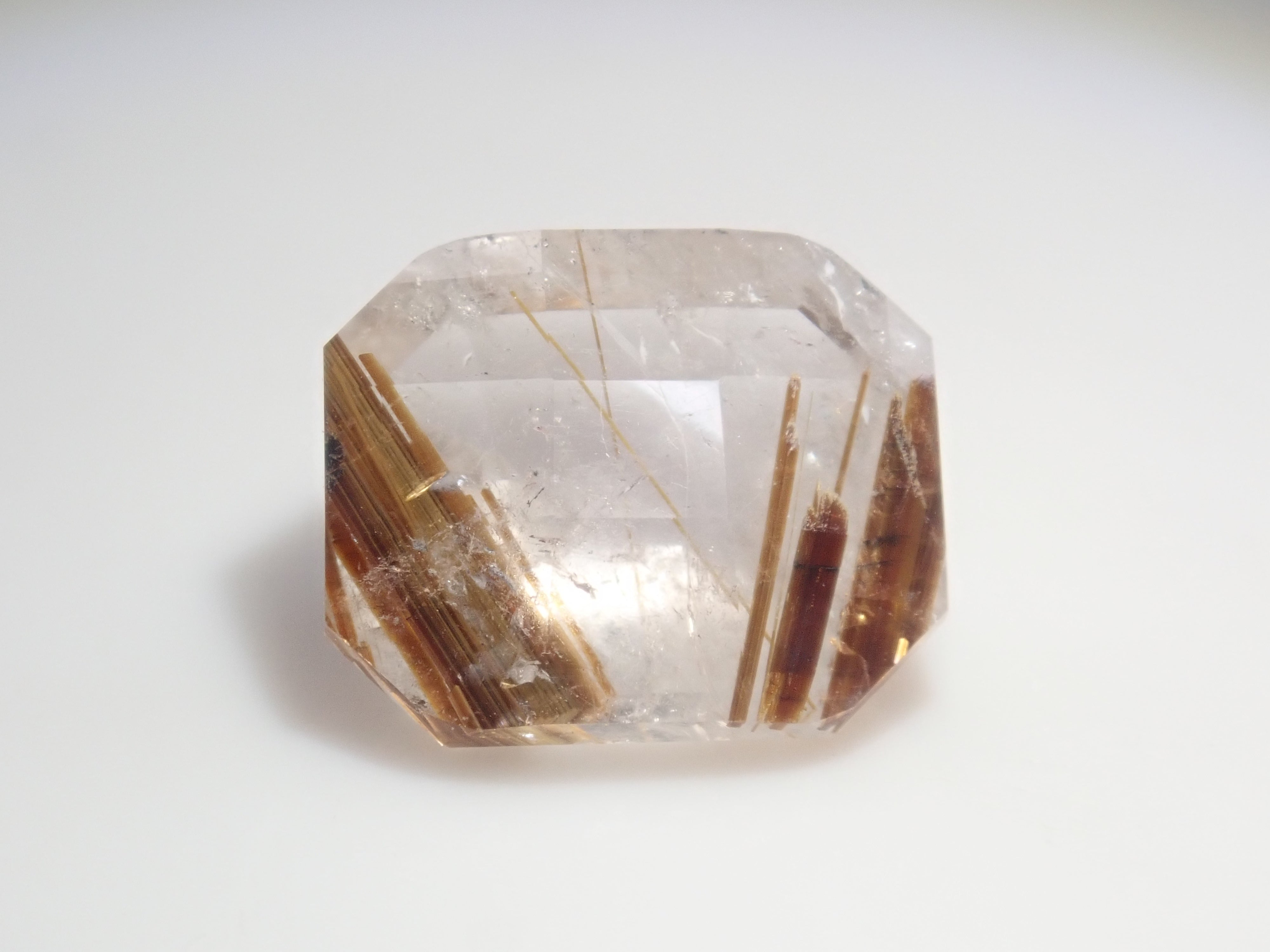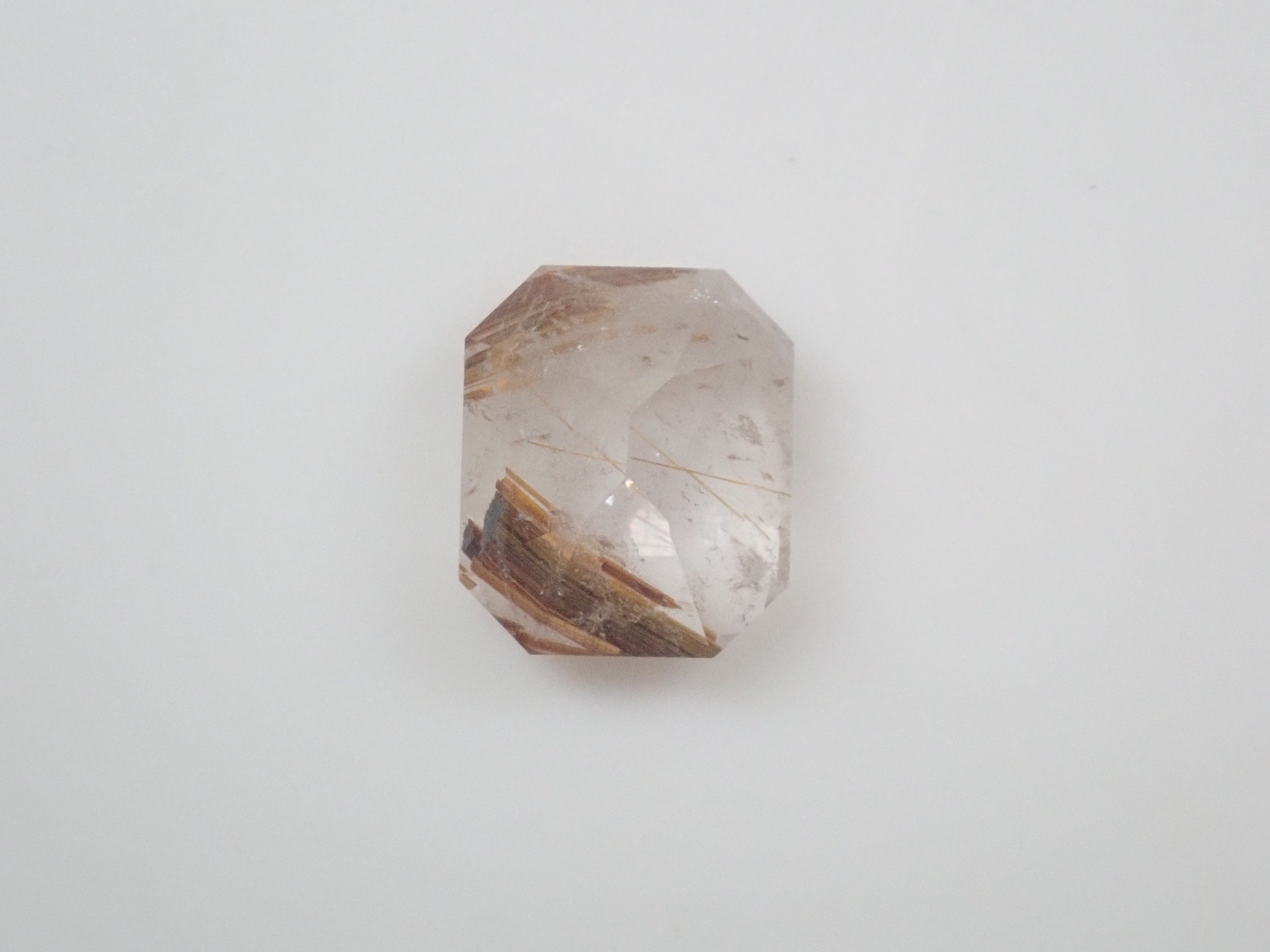 金紅石石英散發著美麗的金色光澤。晶體中鑲嵌著由金紅石製成的「金針」。日文名稱為「金流石」。這是一種被稱為銅金紅石的石英。照片中使用了筆型手電筒來捕捉內含物的美麗光澤。