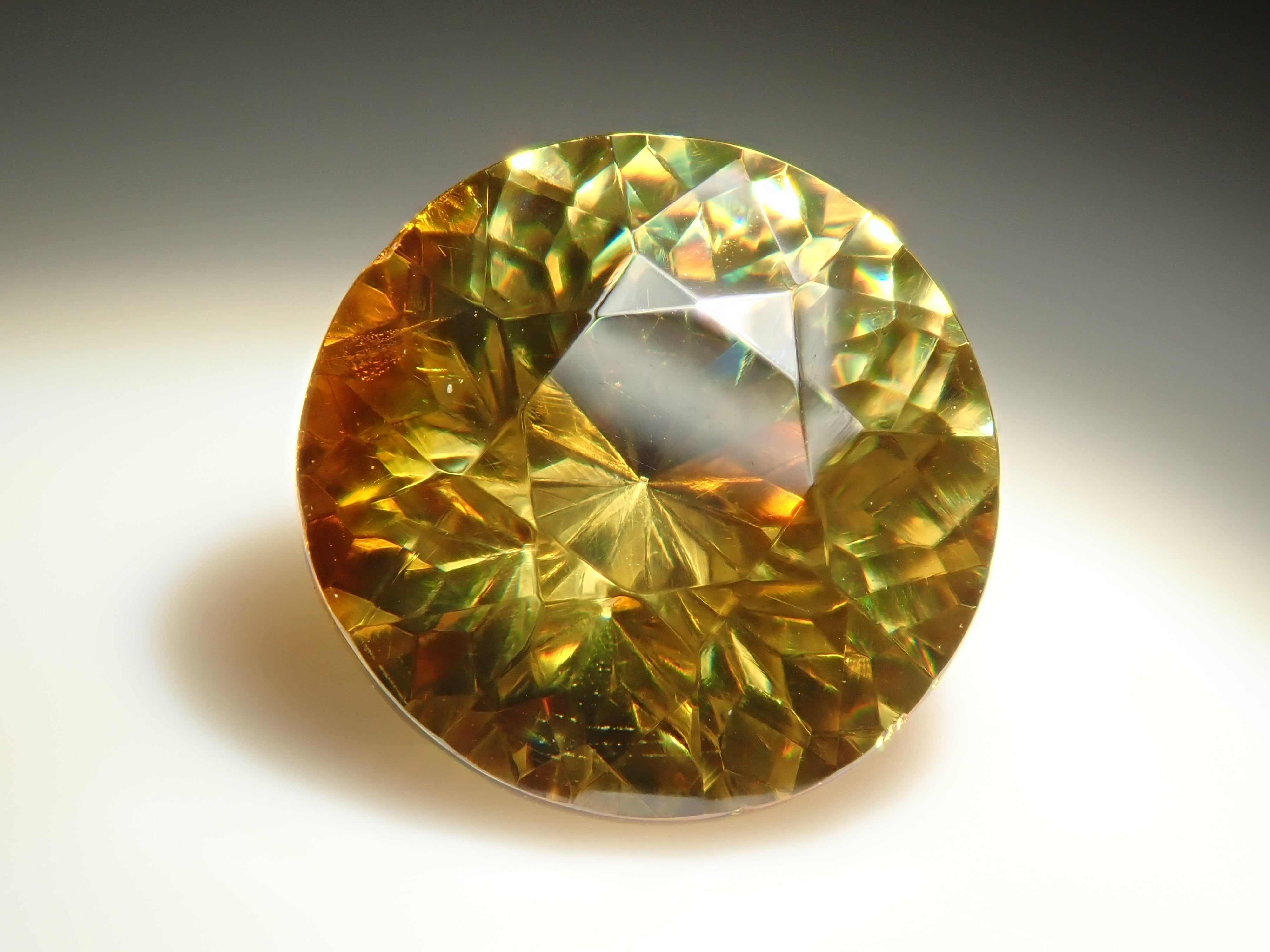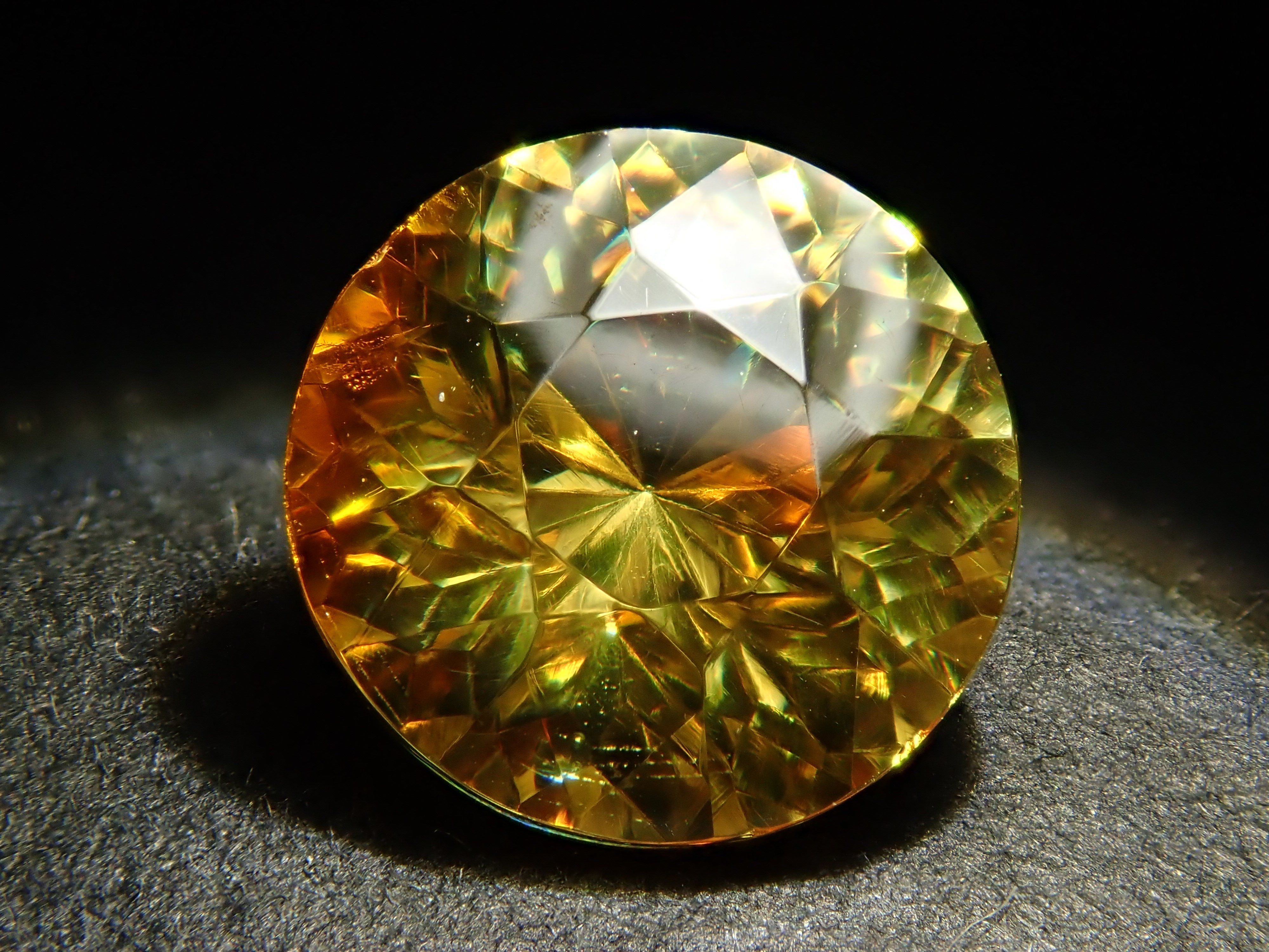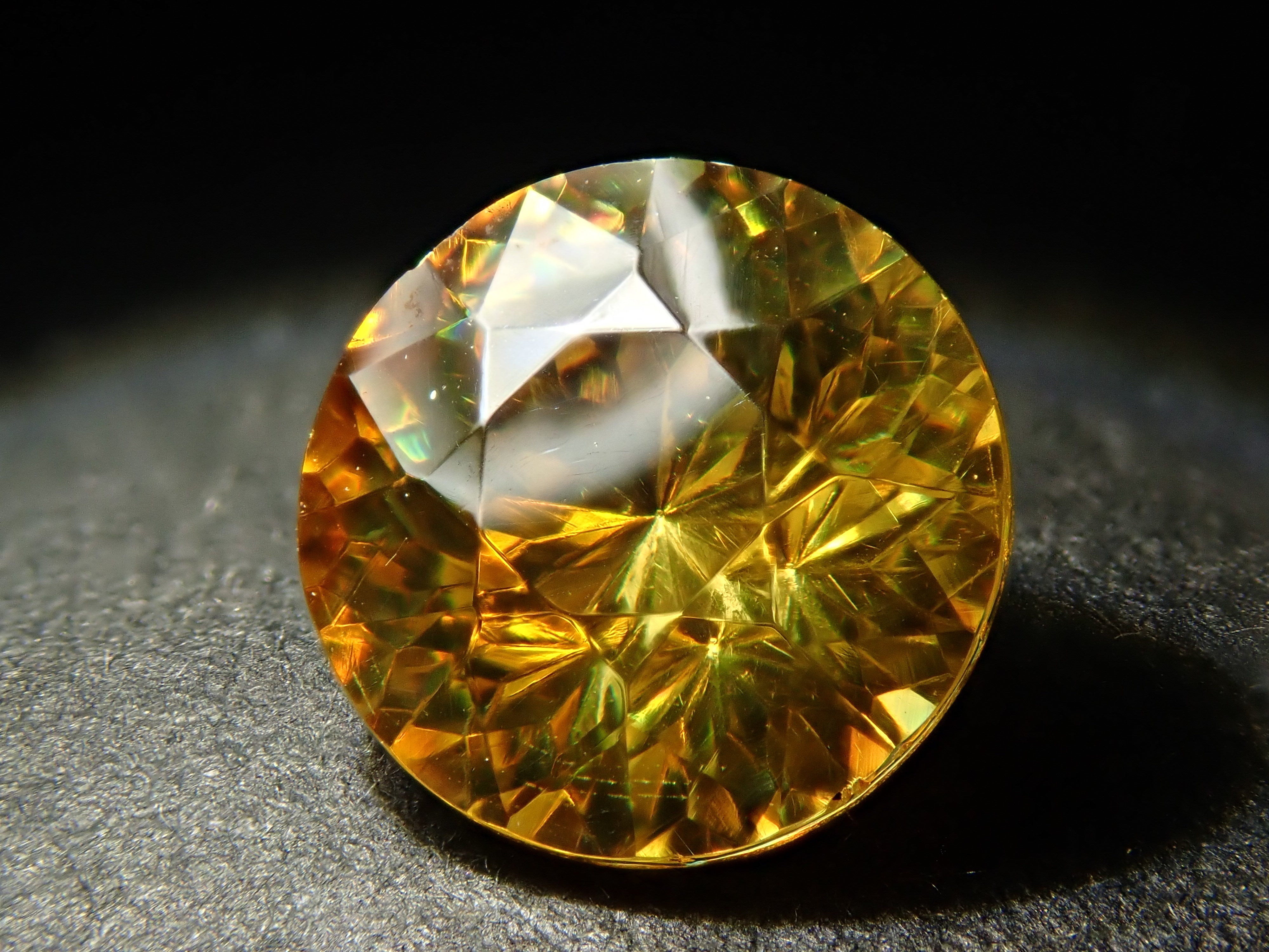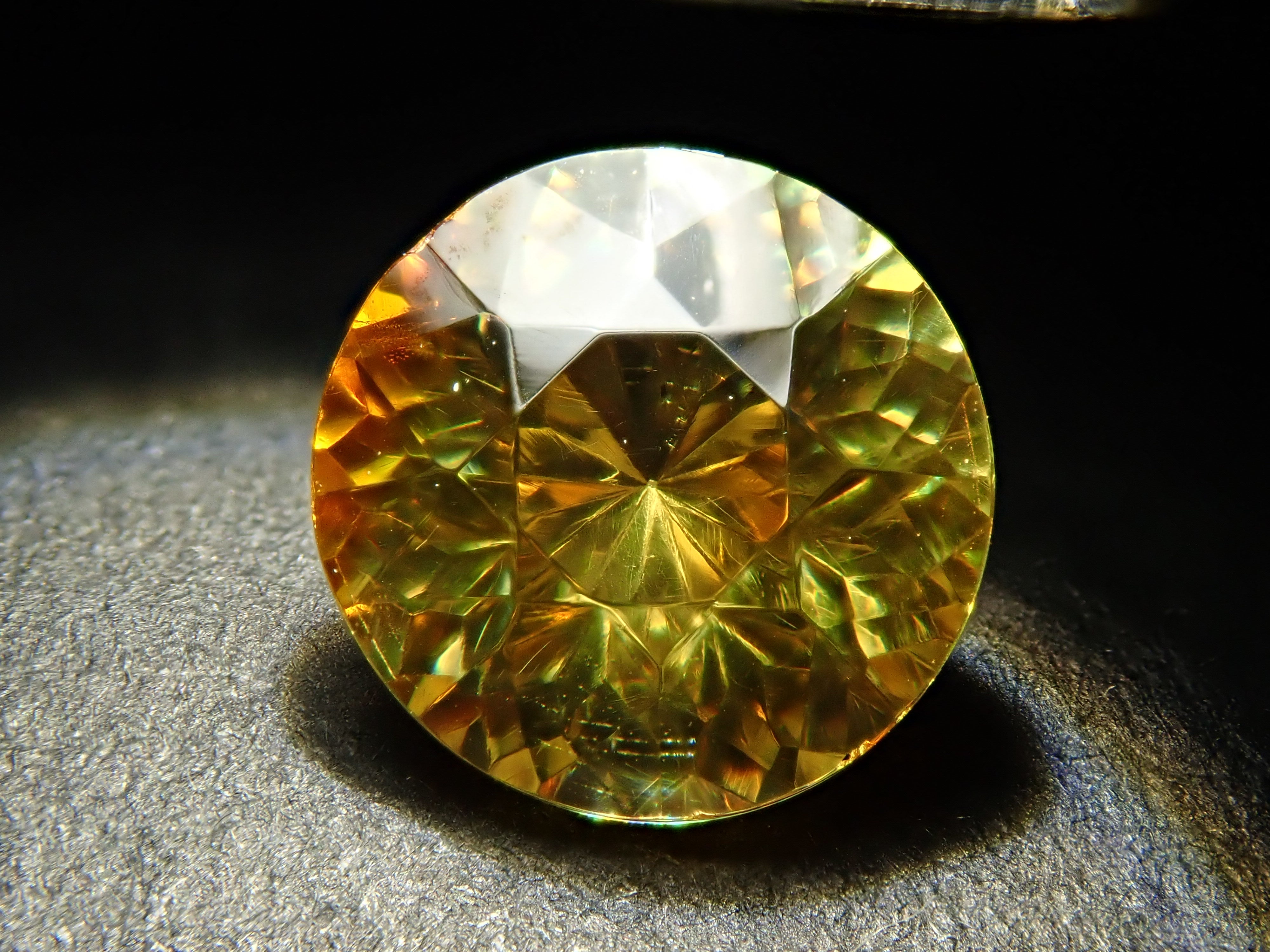 閃鋅礦的色散率接近鑽石的四倍,並呈現出絢麗的火彩。據說是流通量很小、市場上數量不多的稀有寶石之一。底色有黃、橙、綠等,在火中可以欣賞到黃、棕、橙、紅、綠等各種顏色。閃鋅礦 7.0 毫米/1.753 克拉,產自西班牙,在這裡您可以欣賞到黃色和橙色的色調。