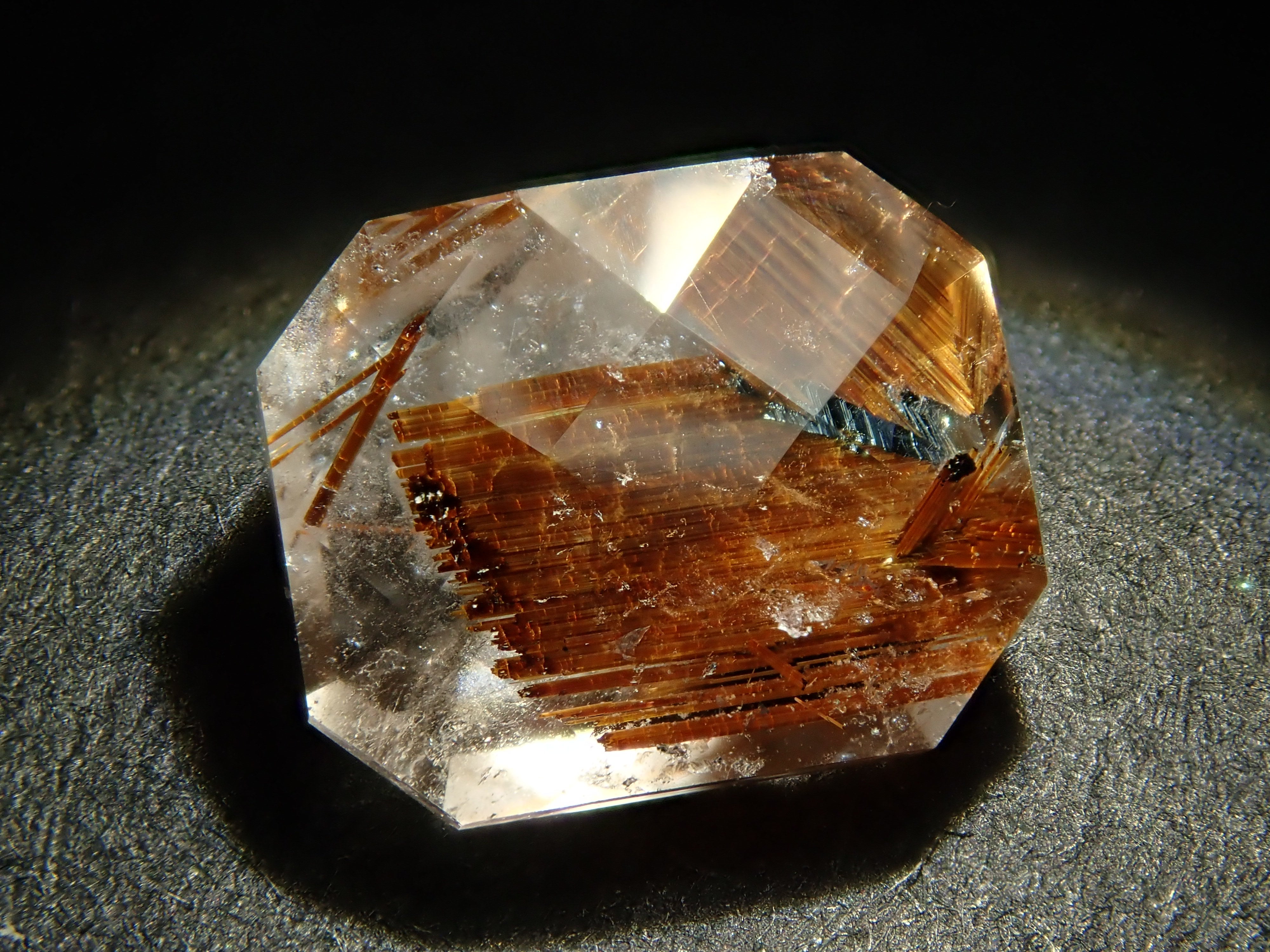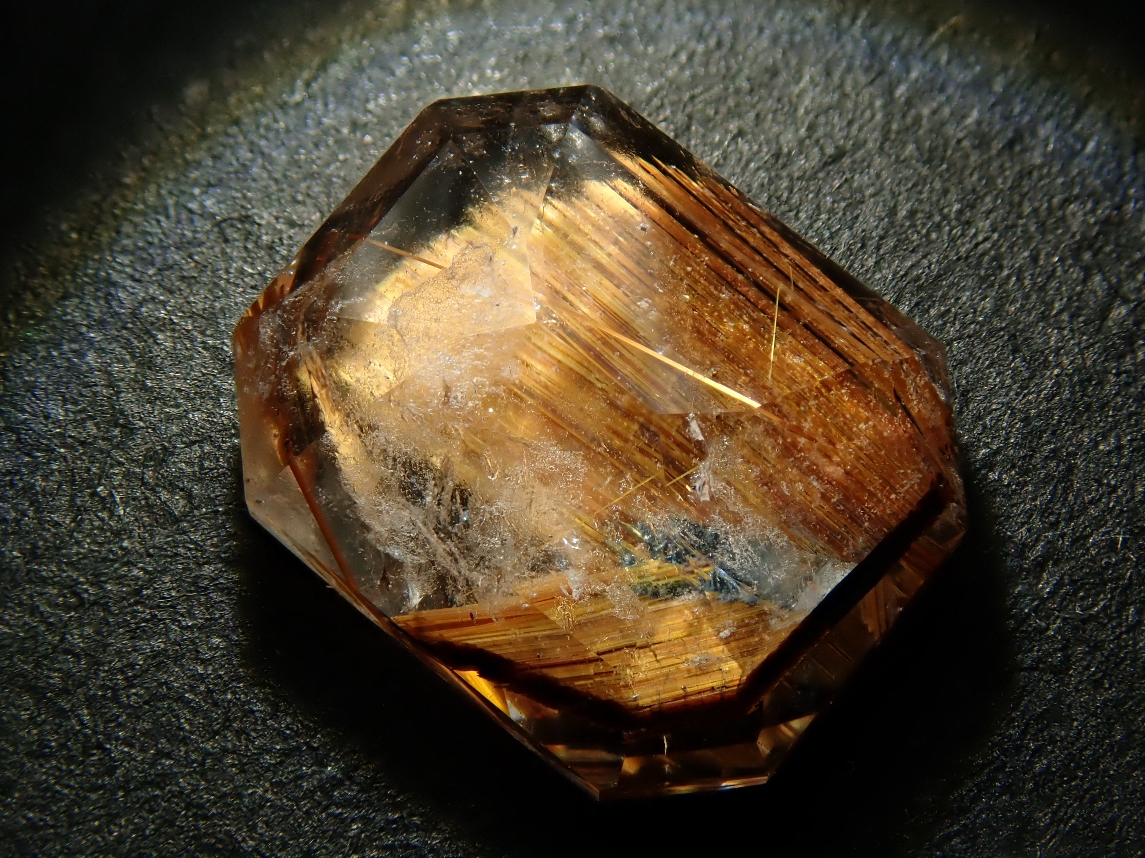 金紅石石英具有美麗的金色光澤。將一根由金紅石製成的「金針」插入晶體中。日本名字是“Kinkoishi”。這是稱為銅金紅石的石英。攝影時使用筆形燈捕捉內含物的美麗光芒。