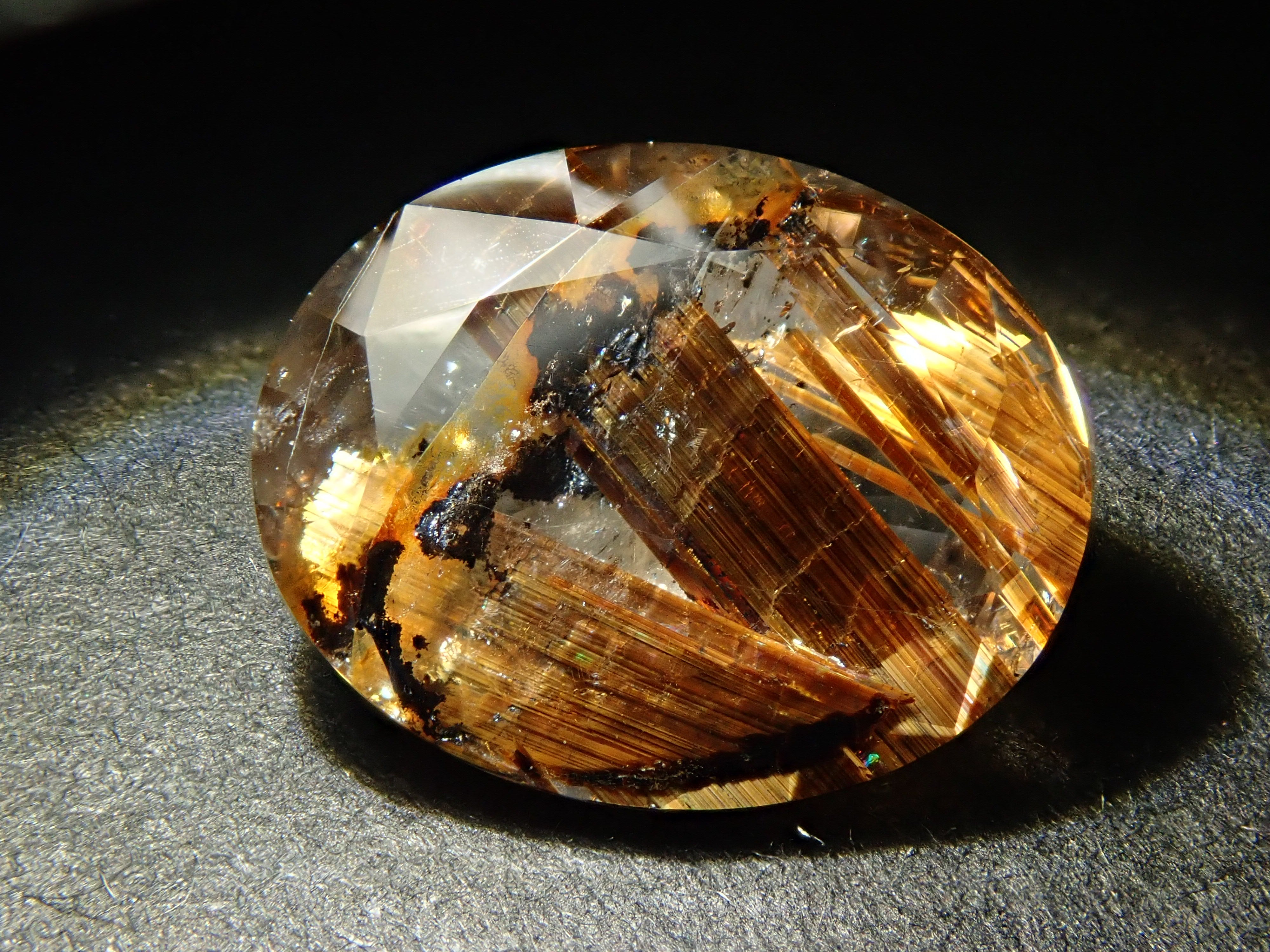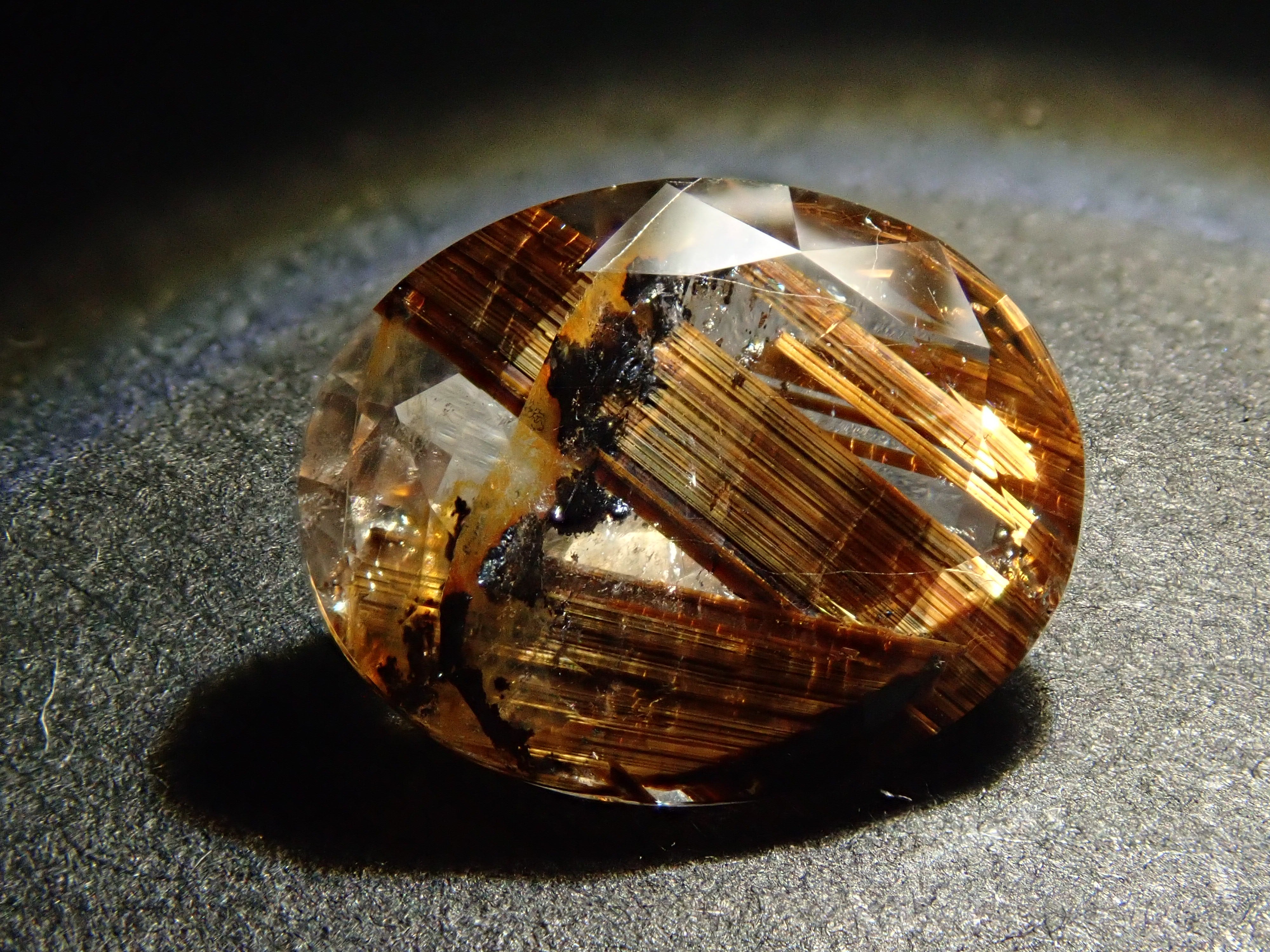 金紅石石英具有美麗的金色光澤。將一根由金紅石製成的「金針」插入晶體中。日本名字是“Kinkoishi”。這是稱為銅金紅石的石英。攝影時使用筆形燈捕捉內含物的美麗光芒。