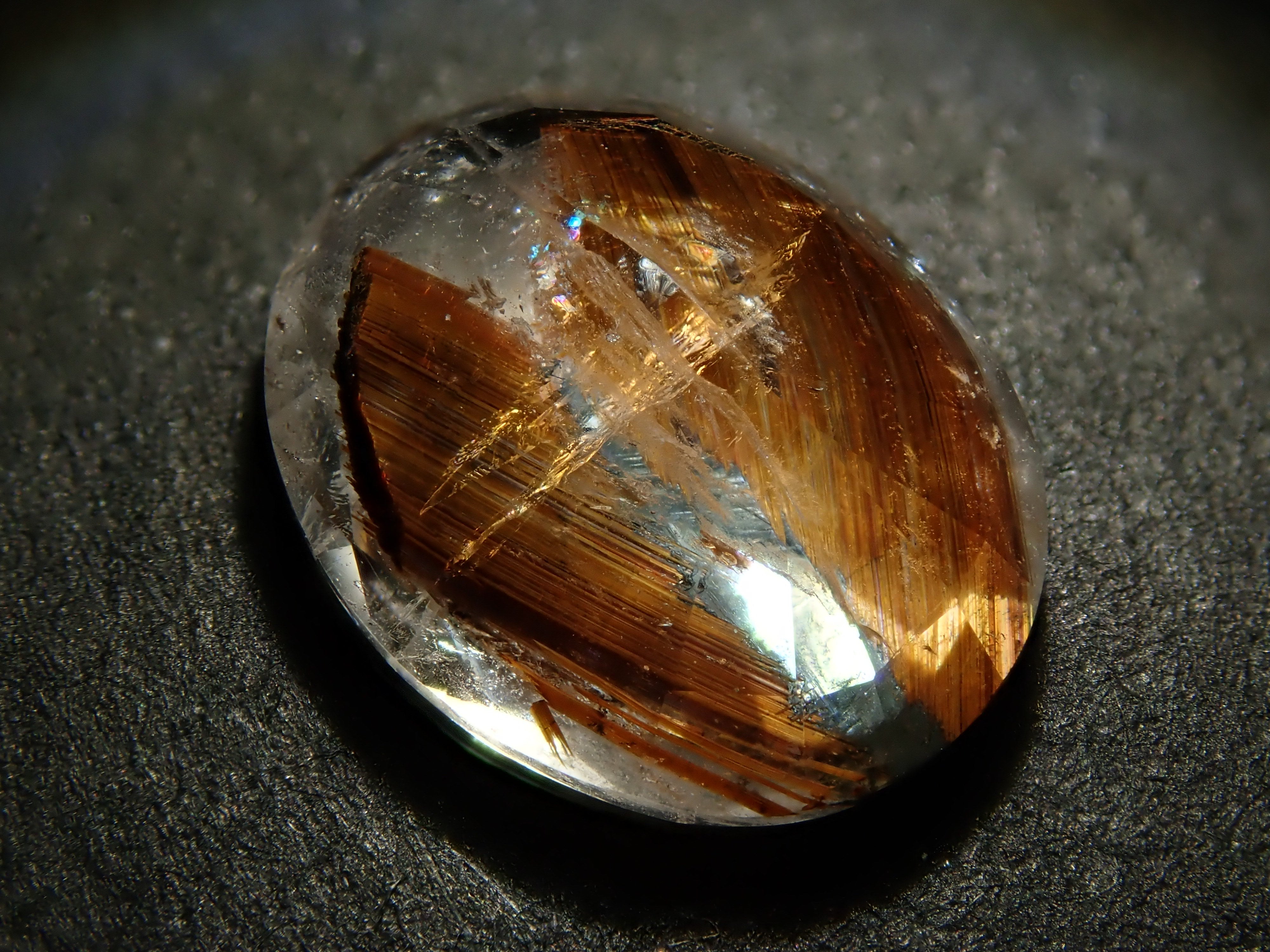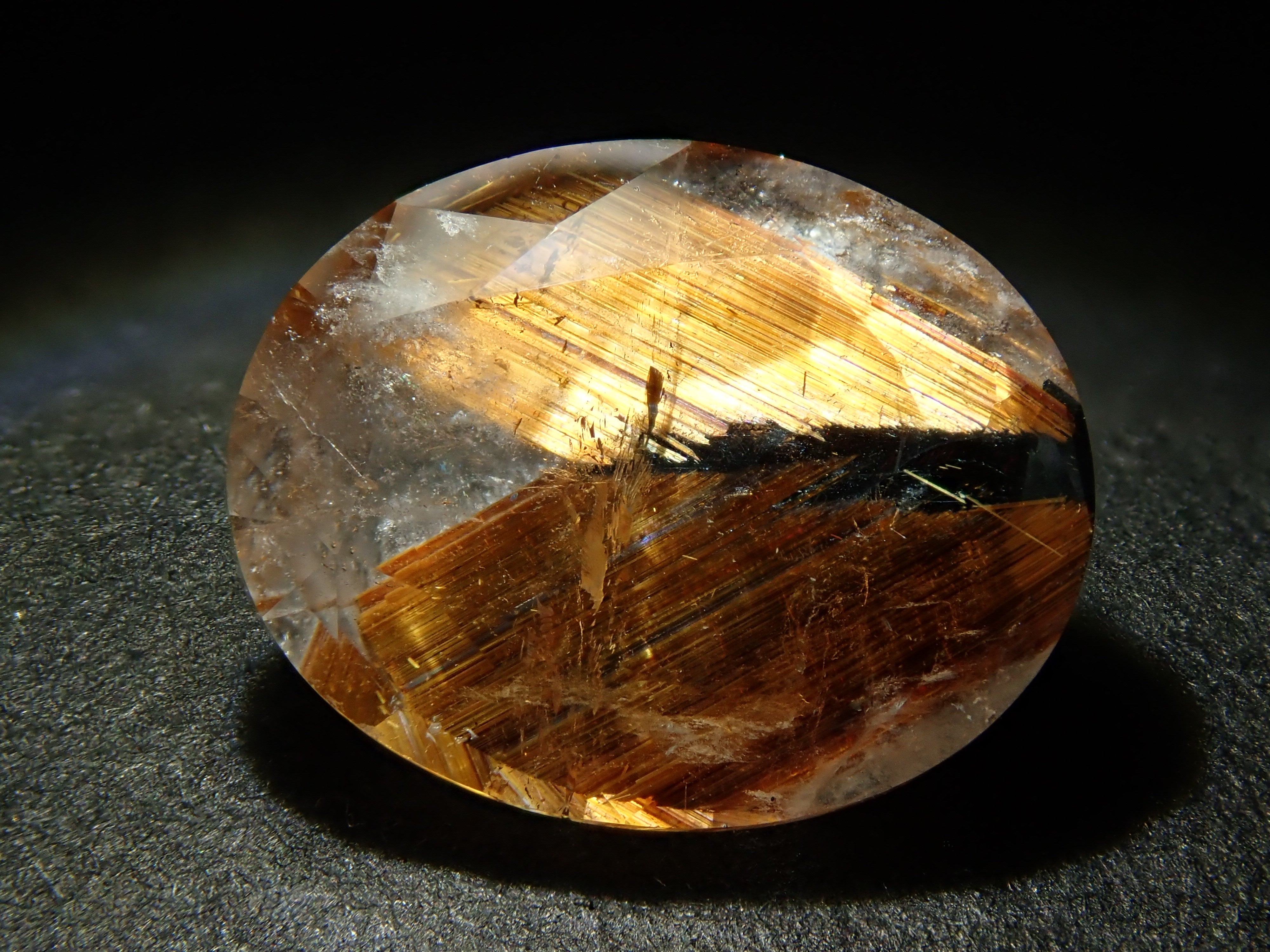 金紅石石英具有美麗的金色光澤。將一根由金紅石製成的「金針」插入晶體中。日本名字是“Kinkoishi”。這是稱為銅金紅石的石英。攝影時使用筆形燈捕捉內含物的美麗光芒。