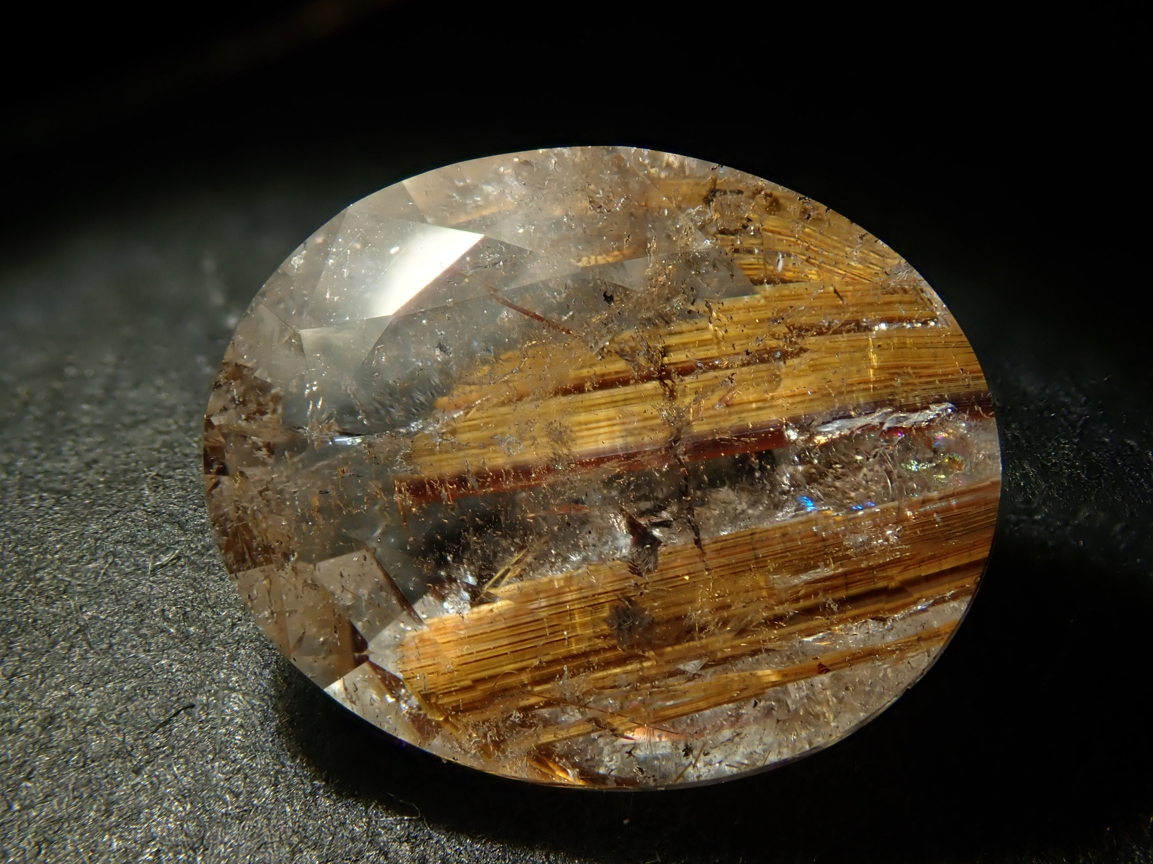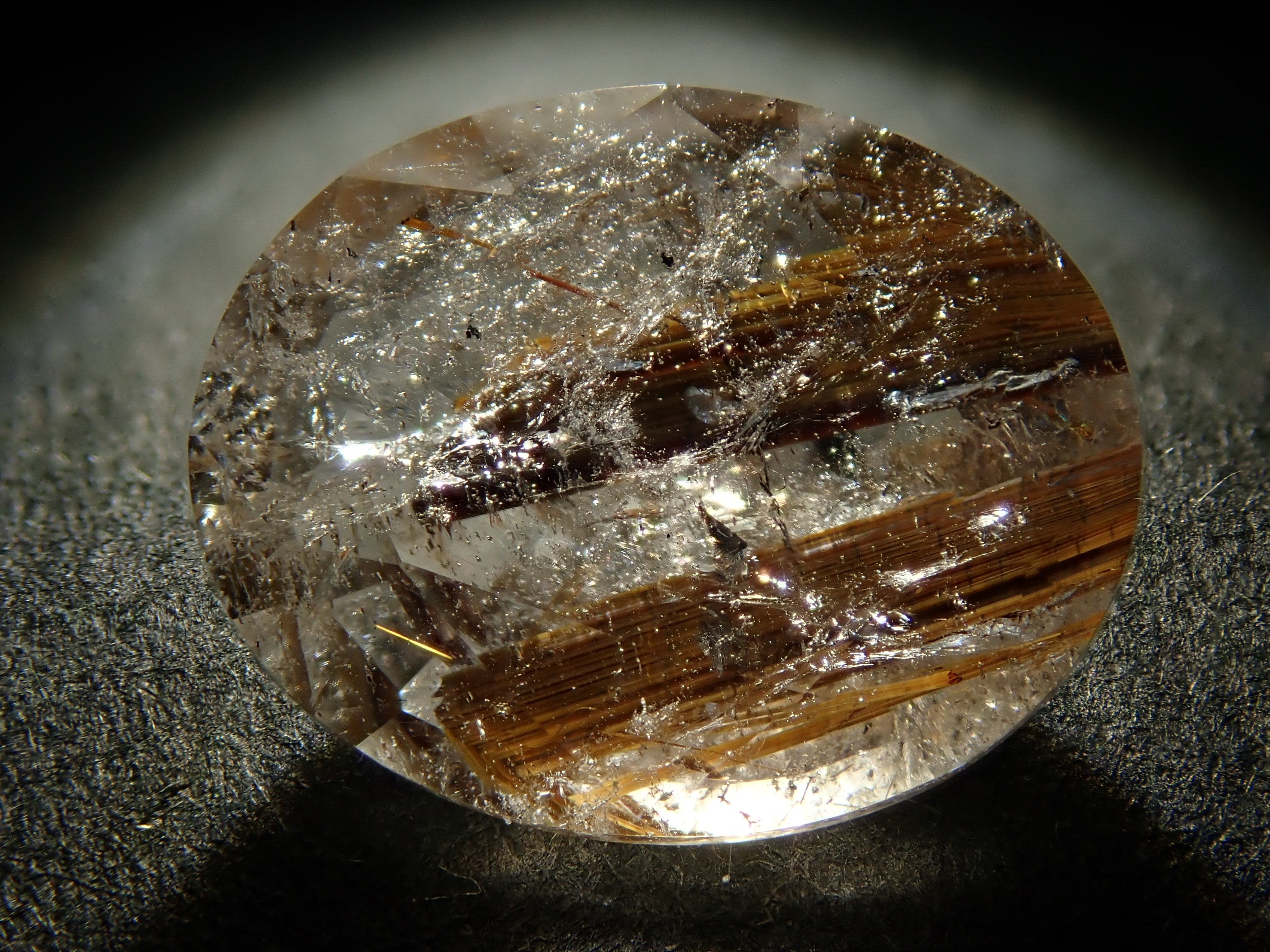 金紅石石英具有美麗的金色光澤。將一根由金紅石製成的「金針」插入晶體中。日本名字是“Kinkoishi”。這是稱為銅金紅石的石英。攝影時使用筆形燈捕捉內含物的美麗光芒。